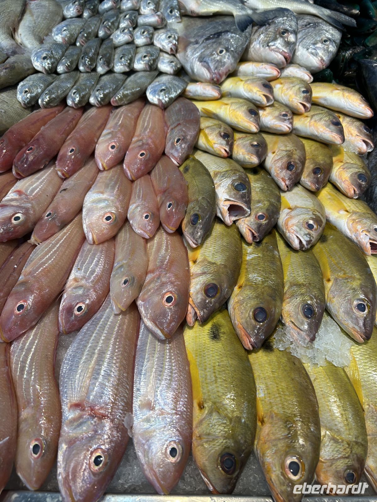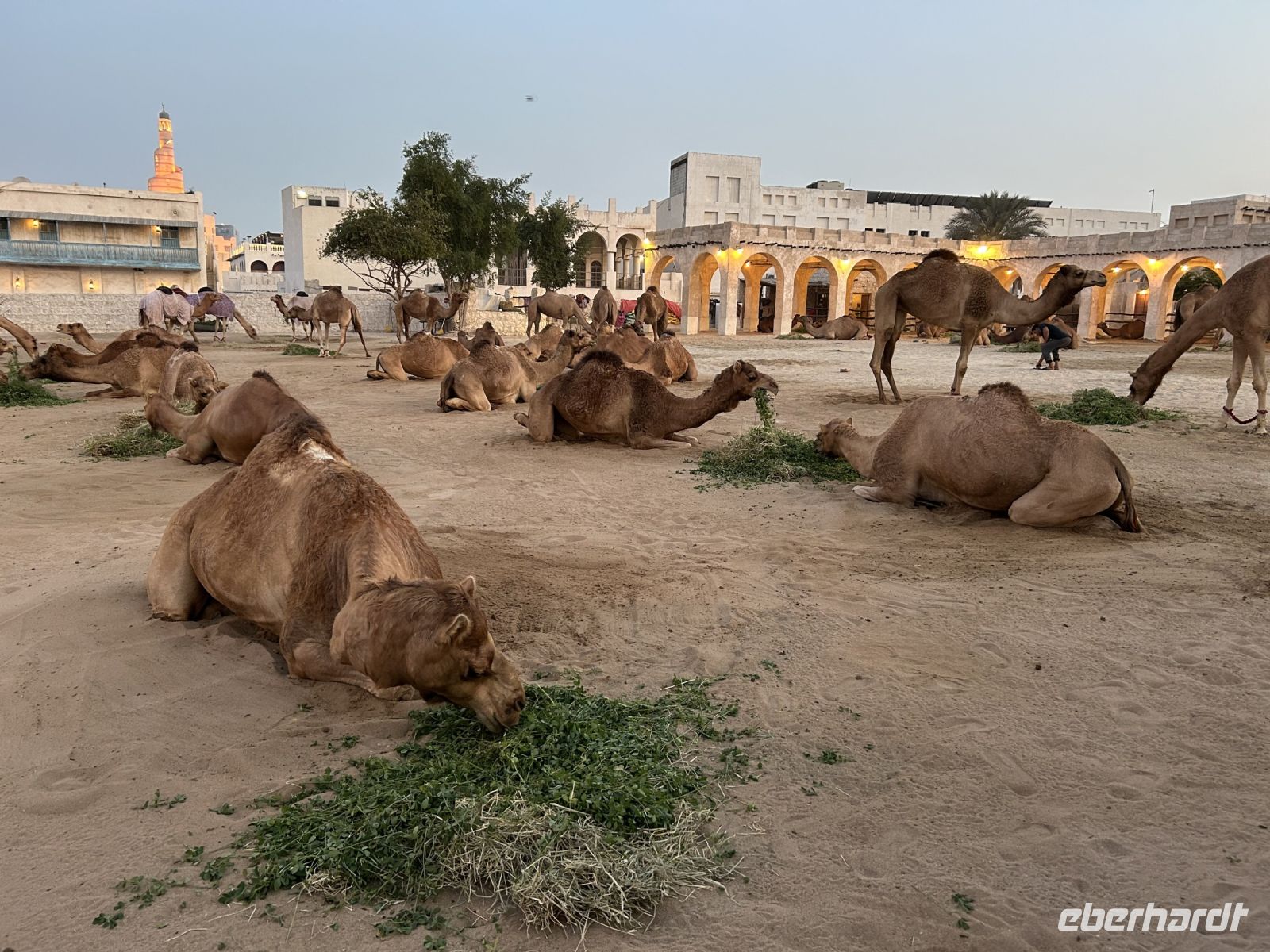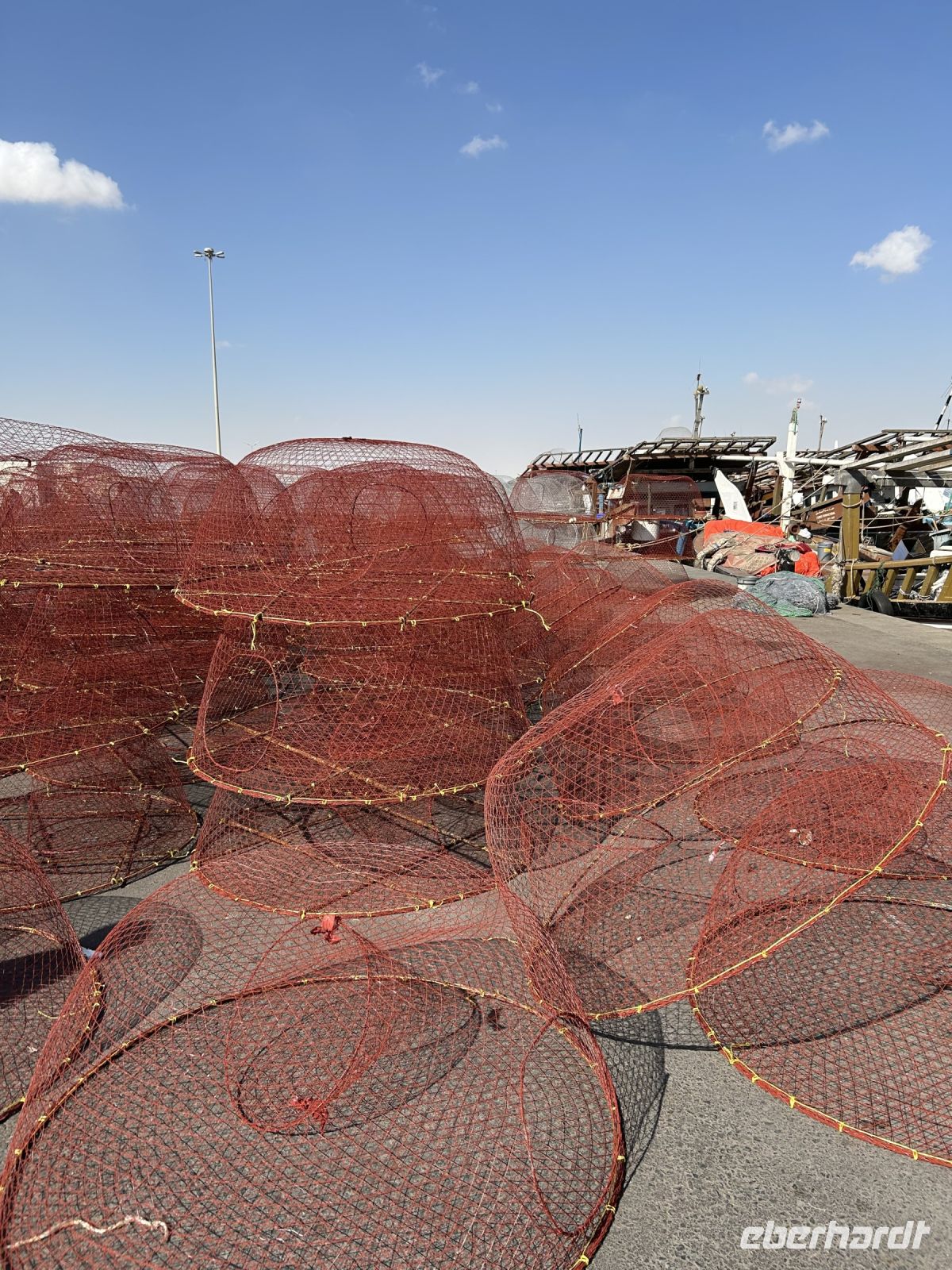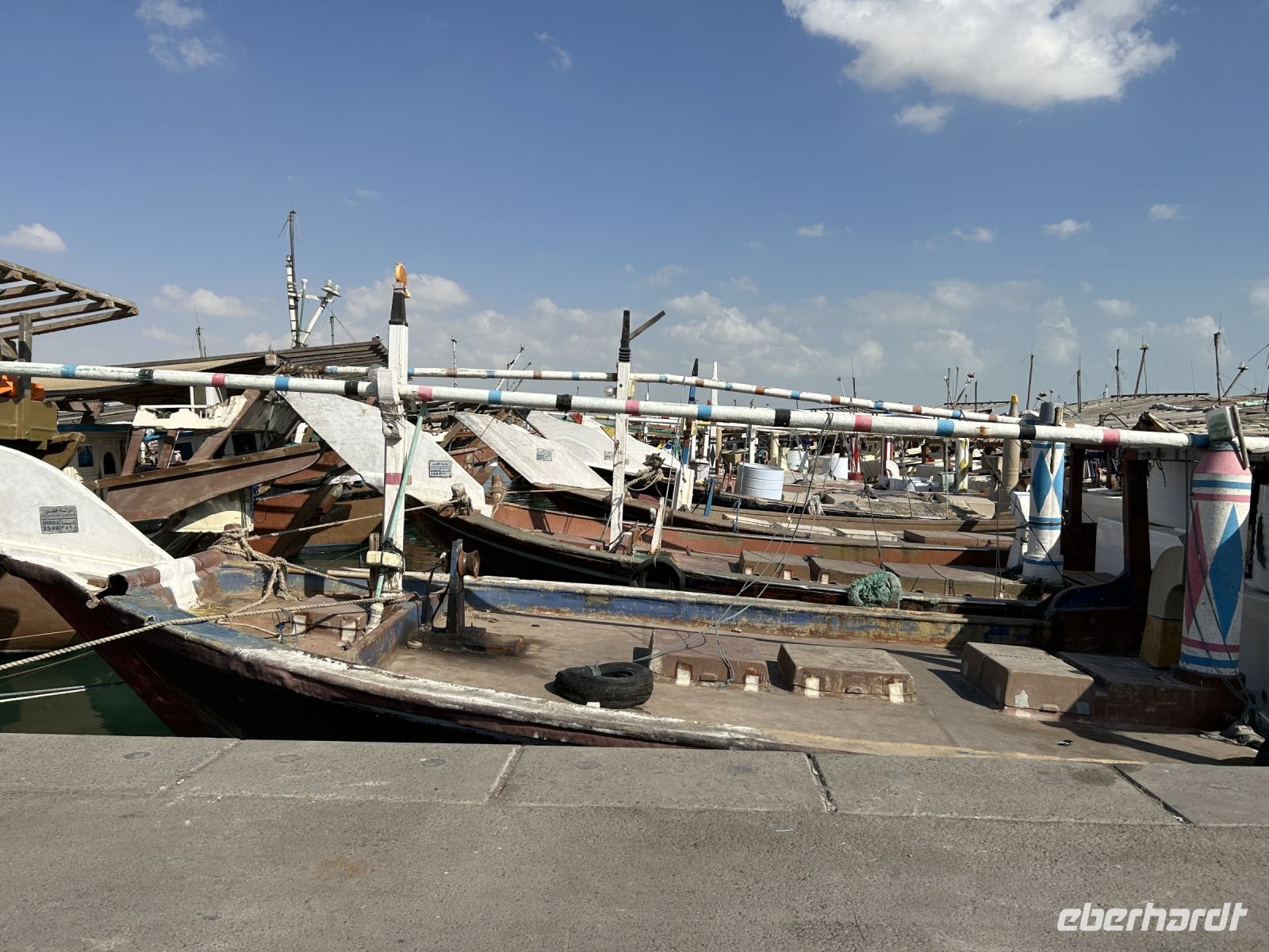 Die kleine Hafenstadt Al Khor ist nicht weit entfernt und so statten wir dem Hafen einen Besuch ab. Hunderte traditionelle Dhau-Boote ankern hier. Die Fischer sind alle schon wieder mit ihrem frischen Fang zurück, den wir in der hiesigen Fischhalle bewundern können. Die Schätze des Meeres liegen akkurat und unter besten hygienischen Voraussetzungen in den Auslagen und werden stolz angepriesen.