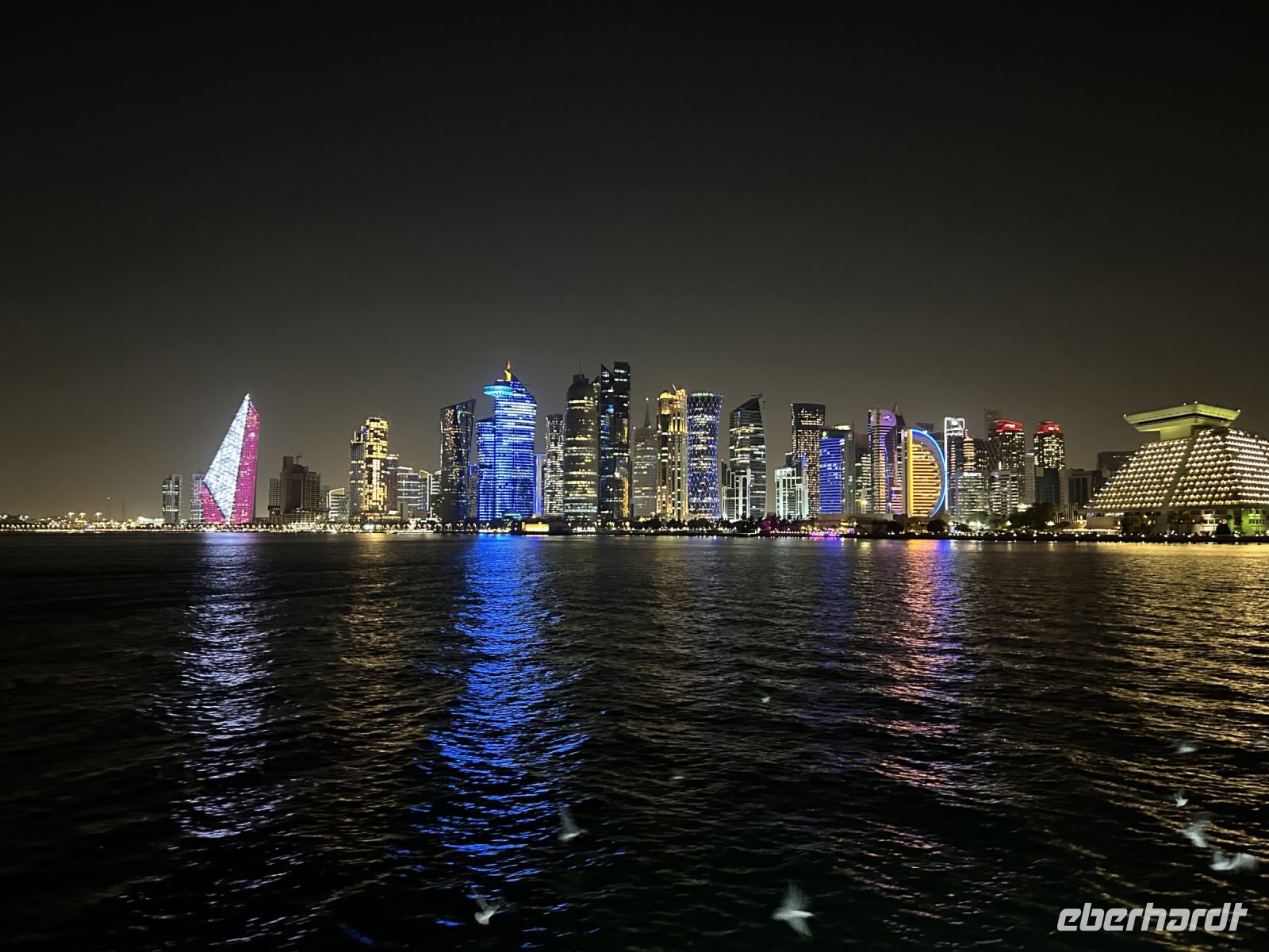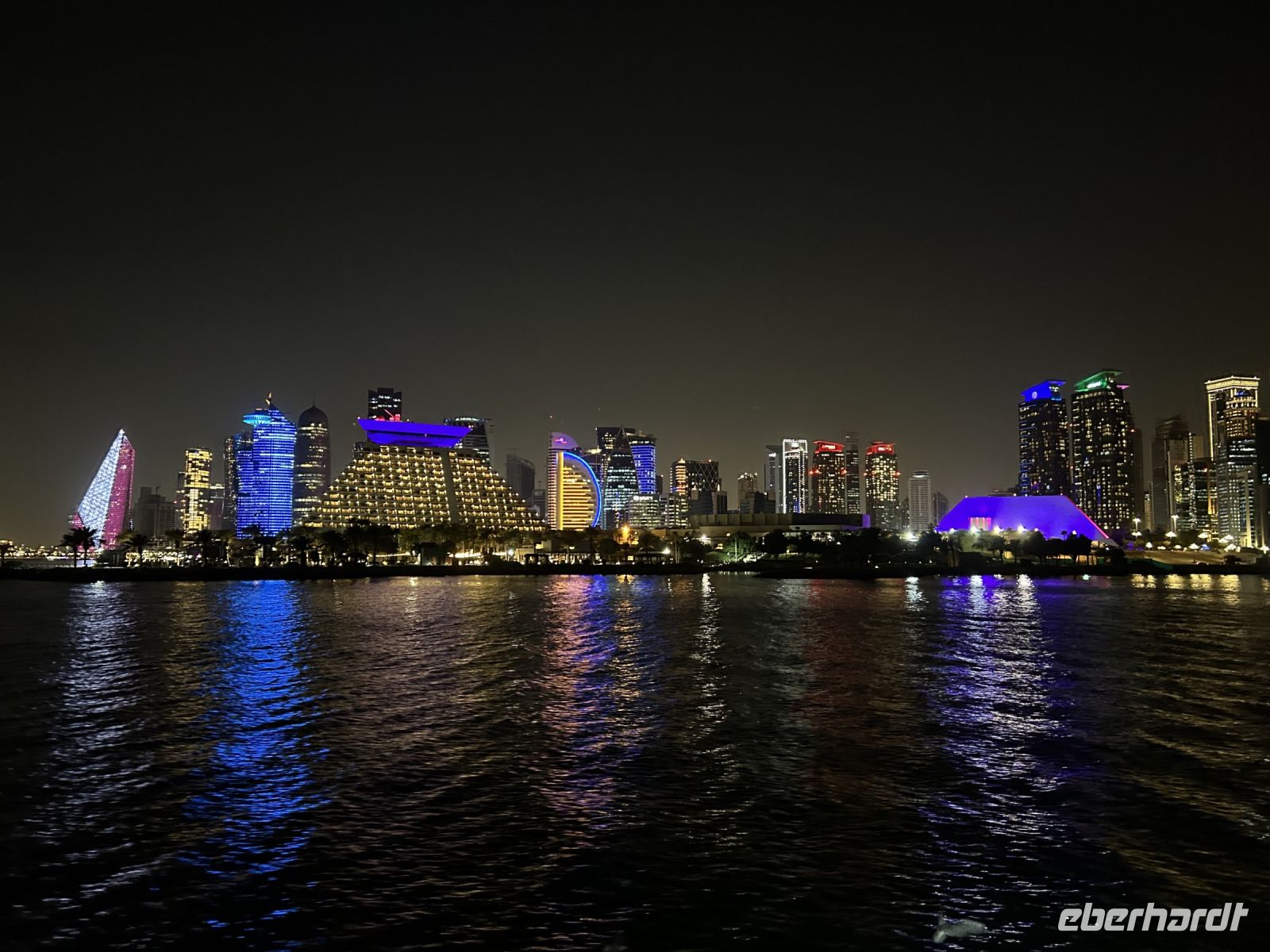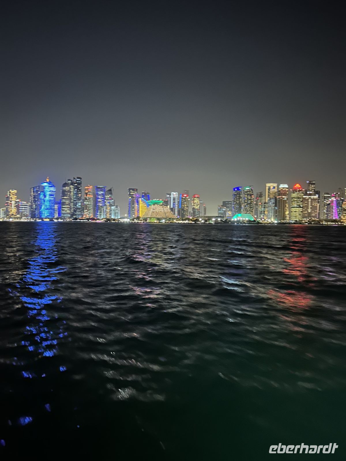 Im Box-Park, ein neu gestaltetes Freizeit- und Erholungsgebiet mit einem Yachthafen und Geschäften, Cafés und Büros aus Cargo-Containern gehen wird an Bord einer traditionellen Dhau. Mit dieser schippern wir entlang der atemberaubenden Skyline Dohas, die in der Dunkelheit funkelt und glitzert. Der Wind pfeift uns um die Nase und bei einem leckeren BBQ lassen wir die Skyline an uns vorüberziehen.