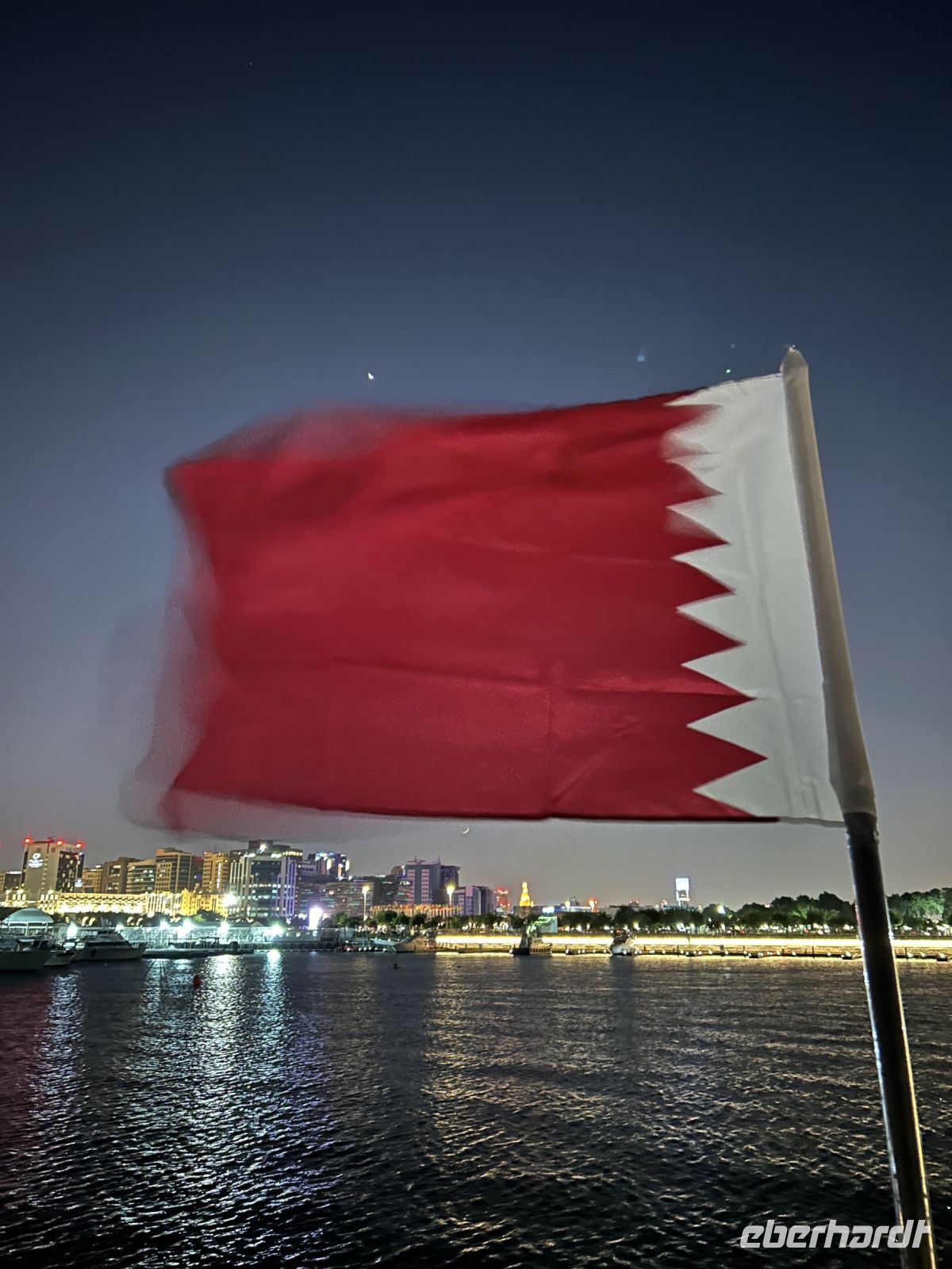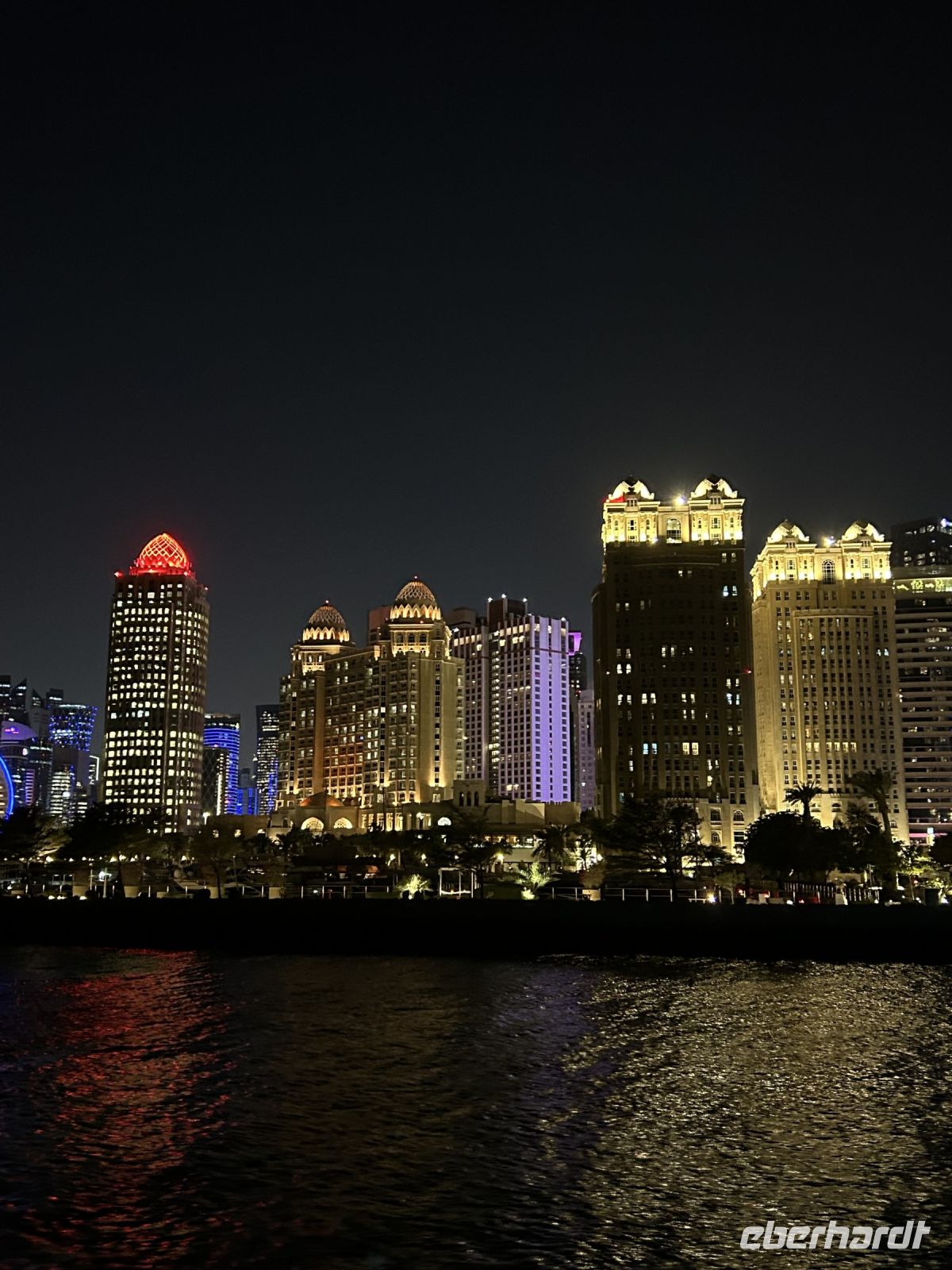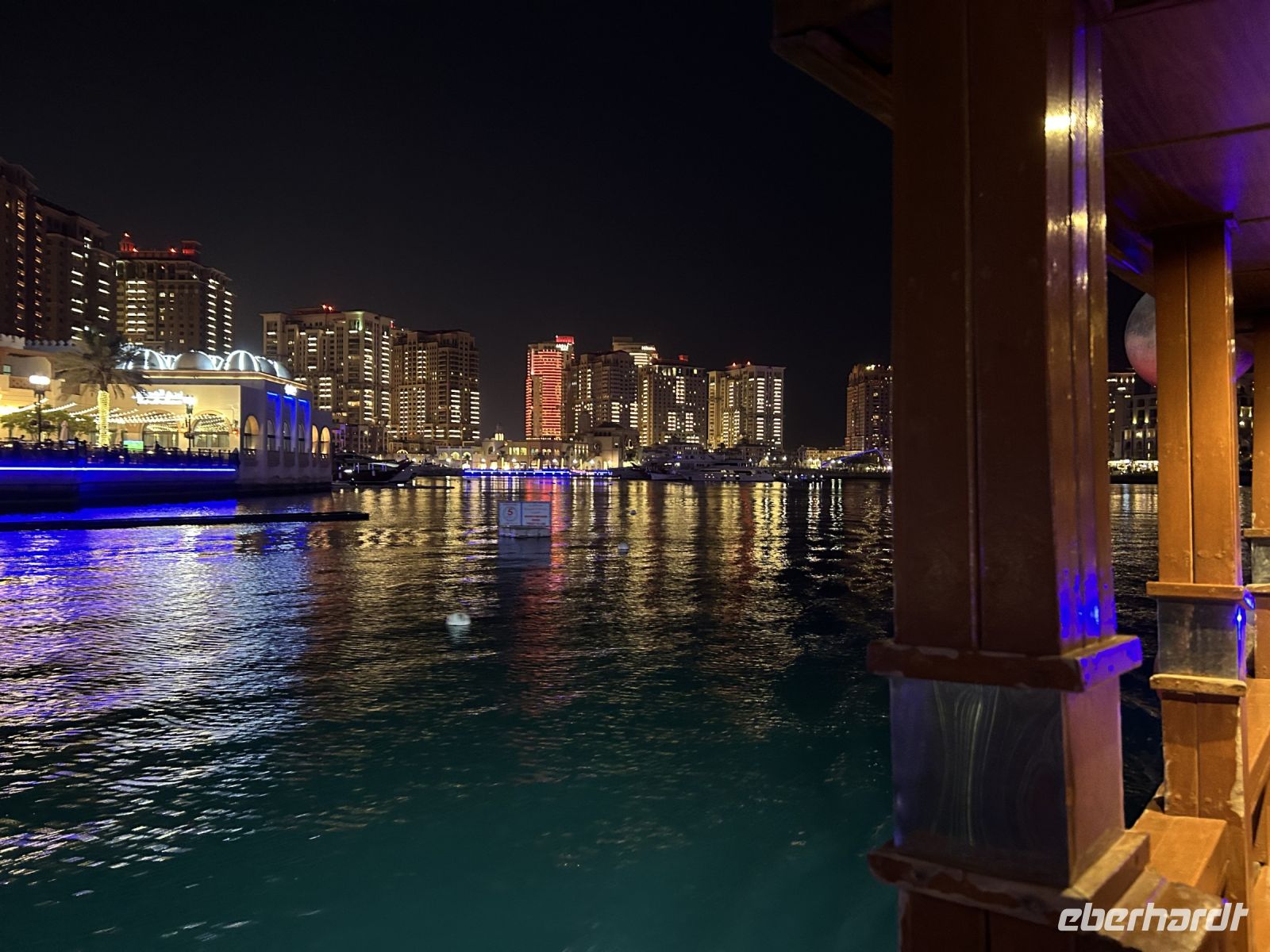 Im Box-Park, ein neu gestaltetes Freizeit- und Erholungsgebiet mit einem Yachthafen und Geschäften, Cafés und Büros aus Cargo-Containern gehen wird an Bord einer traditionellen Dhau. Mit dieser schippern wir entlang der atemberaubenden Skyline Dohas, die in der Dunkelheit funkelt und glitzert. Der Wind pfeift uns um die Nase und bei einem leckeren BBQ lassen wir die Skyline an uns vorüberziehen.