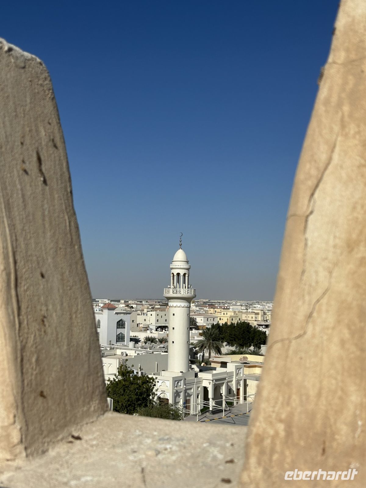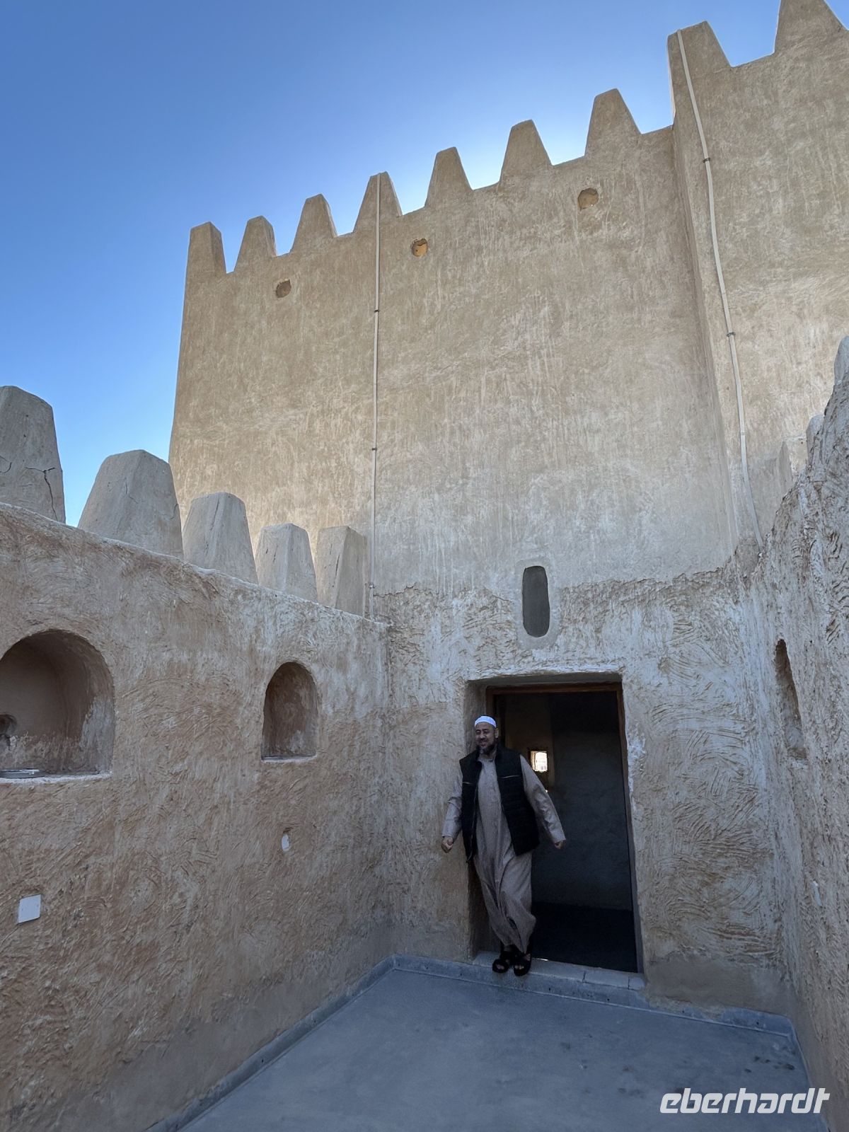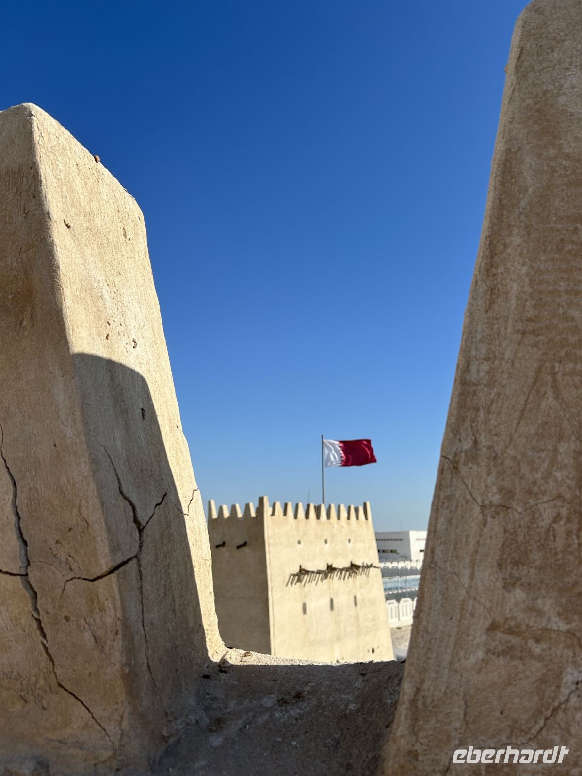 Einmal quer über die katarische Halbinsel bringt uns der Bus bis nach Al Zubara an der Westküste. Diese typisch arabische Festung gehört heute zum UNESCO-Welterbe und war früher Mittelpunkt einer geschäftigen Perlenfischer- und Handelsstadt. Die Ruinen dieser Stadt erblicken wir vom Turm der Festung, ein Besuch der Ausgrabungen ist leider heute nicht möglich.
