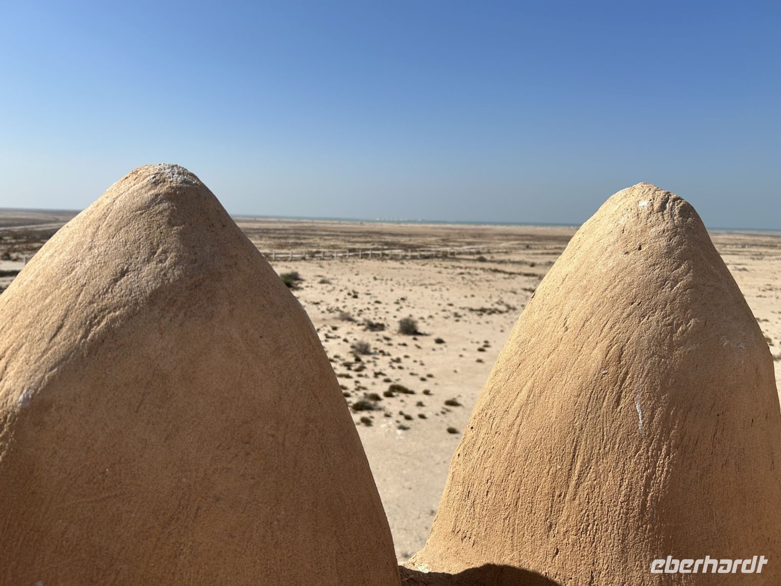 Heute reisen wir in den Norden Katars und somit in die Geschichte dieses kleinen Landes. Die Glitzermetropole Doha lassen wir hinter uns und besuchen zunächst die beiden Barzan-Türme in Umm Salal. Heute stehen sie inmitten eines einfachen Wohngebietes. Die aus Korallenfelsen und Kalkstein erbauten Wachtürme (Bauzeit 1910-1916) halfen, ankommende Schiffe osmanischer Truppen zu erblicken. Weiterhin geht man aber davon aus, dass man sie ebenso als Observatorium nutze. Denn durch die Beobachtung des Mondes bestimmte man die Daten des Sonnenkalenders.