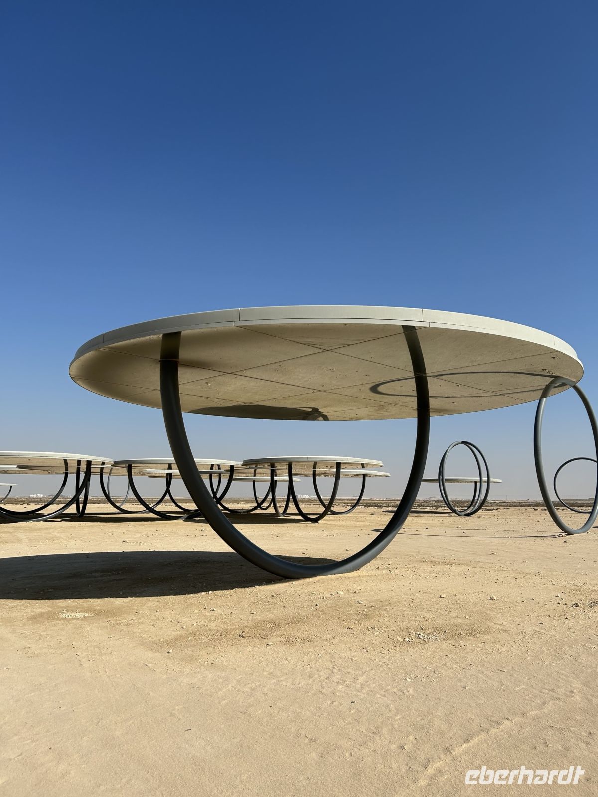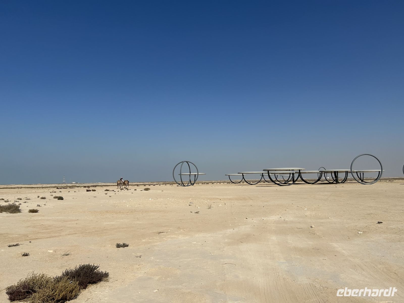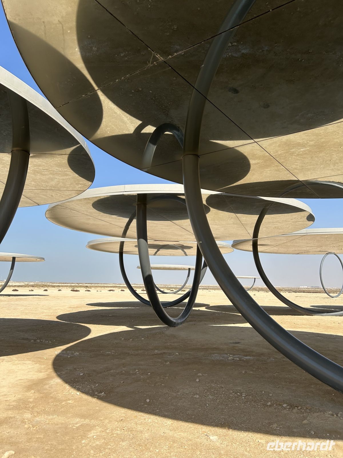 Als Ersatz besuchen wir eine neue Kunst-Installation inmitten der Wüste. Schon allein die Anfahrt über eine Schotter-, Geröll- und Sandpiste ist abenteuerlich. Seit 2022, kurz vor der FIFA-WM, stehen hier überdimensionale, aufrecht stehende Ringe und runde Spiegelplatten in der rauen Subara-Wüste. Der dänisch-isländische Künstler Ólafur Elíasson möchte mit seinem Kunstwerk "Shadows travelling on the sea of the day" ("Schatten, die auf dem Meer des Tages reisen") einen Ort der Begegnung schaffen.