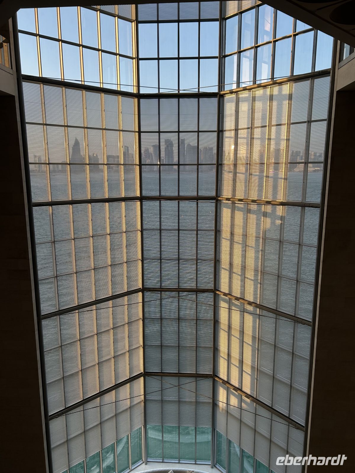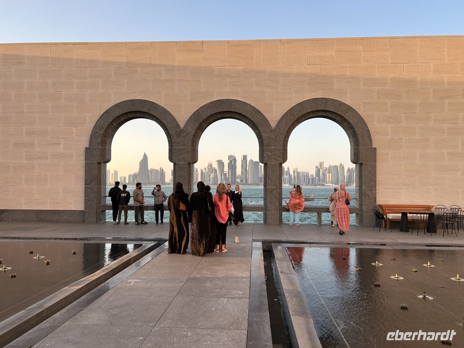 Mit unserem kleinen Coaster-Bus sausen wir wieder zurück nach Doha und holen unseren Fotostopp vom ersten Tag an der Corniche nach. Die Skyline Dohas im Sonnenlicht steht uns gegenüber. Von hier kann man auch schon das neue Museum of Islamic Art sehen, welches wir heute auch noch besuchen werden. Als zusätzlichen Stopp besuchen wir Dohas jüngste Neuentwicklung - den Mina District. Dies ist ein malerisches Viertel mit Kopfsteinpflasterstraßen und pastellfarbenen Gebäuden. Man spricht auch vom „Santorini des Nahen Ostens“. Hier können wir die Kreuzfahrtriesen beobachten, die hier ankern und etwas bummeln.