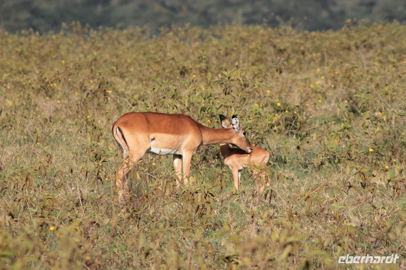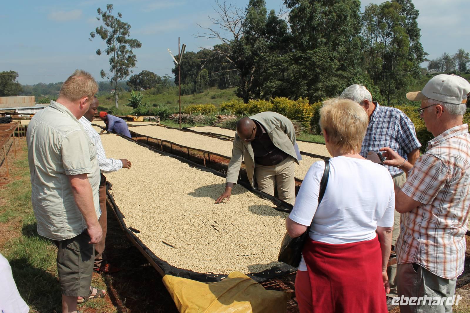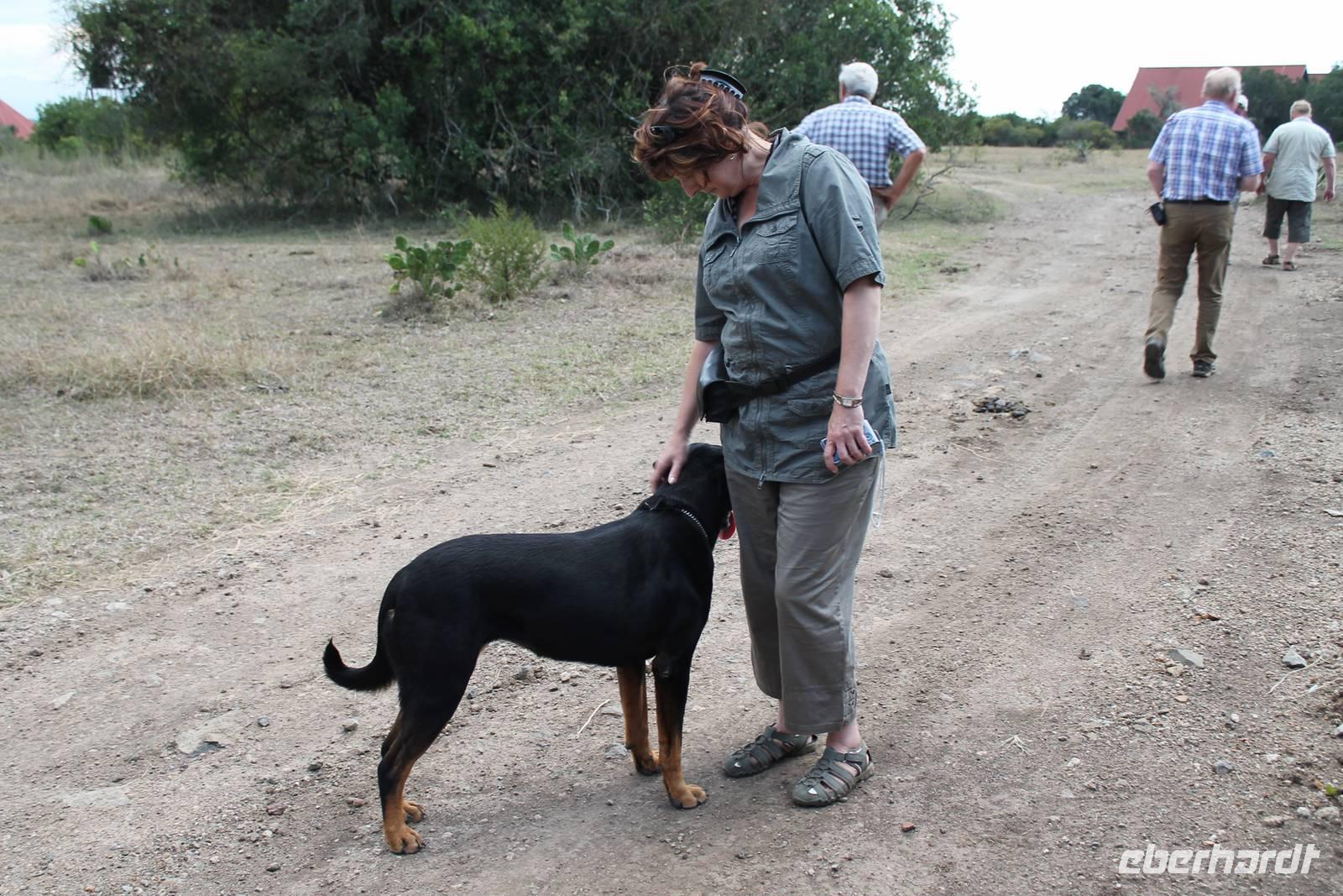 Um acht starteten wir und mussten als erstes mit unseren Chauffeuren Jackson und Caleb die Aufgabe meistern, alle Gepäckstücke in den beiden Jeeps unterzubringen. Es gelang uns und so starteten wir Richtung Norden zur Fairview Kaffeefarm, wo wir nach ca. 1 Stunde Fahrt ankamen. Wir erhielten eine Führung, bei der uns die Wachs- und Reifeprozesse der Kaffeepflanzen erklärt wurde, die Sortierung der Kaffeebohnen und deren Trocknung konnten wir ganz nah sehen. Zum Abschluss wurden uns im Hochzeitsgarten Getränke und kleine Snacks gereicht. Wir konnten auch Kaffee kaufen. Die Röstung und das Mahlen der Kaffeebohnen erfolgt nicht auf dieser Farm. Der kleine Spaziergang hatte uns gut getan und so starteten wir unsere Weiterfahrt Richtung Sandai Ranch - das Ziel unseres heutigen Tages. Unterwegs stärkten wir uns mit frischen Bananen vom Markt und erlebten vor allem auf der letzten Strecke die sogenannten „Massagestraßen". Die Sandai Ranch wird von Petra aus Schwaben geführt, die schon vor 26 Jahren nach Kenia kam. Die Ranch ist von liebevoller Einrichtung und Betreuung geprägt - wir hatten schon bei der Ankunft das Gefühl, dass uns 2 wunderschöne Tage bevor stehen würden. Nun nahmen wir Platz und bekamen ein schmackhaftes Mittagessen mit Pizza und Salat gereicht. Petra zeigte mir die Zimmer und nachdem alle diese bezogen hatten, machten wir uns auf den Weg zu einer kleinen Rundwanderung in der Umgebung. Viele Tiere sahen wir nicht, aber wir genossen die Bewegung und konnten doch nah und fern einige Impalas sowie diverse Vögel entdecken. Auf unserer Tour begleiteten uns 2 Mitarbeiter von Petra sowie 2 Hunde, von denen Oskar diesen Auslauf wohl am meisten genoss . Zurück auf der Ranch genossen wir auf der Terrasse einen leckeren Sundowner und blieben direkt dort sitzen, bis kurz vor acht das Abendessen fertig war. Es war alles zu haben - von Cocktail bis südafrikanischem Wein. Wir genossen den ersten richtigen Abend in Kenia.