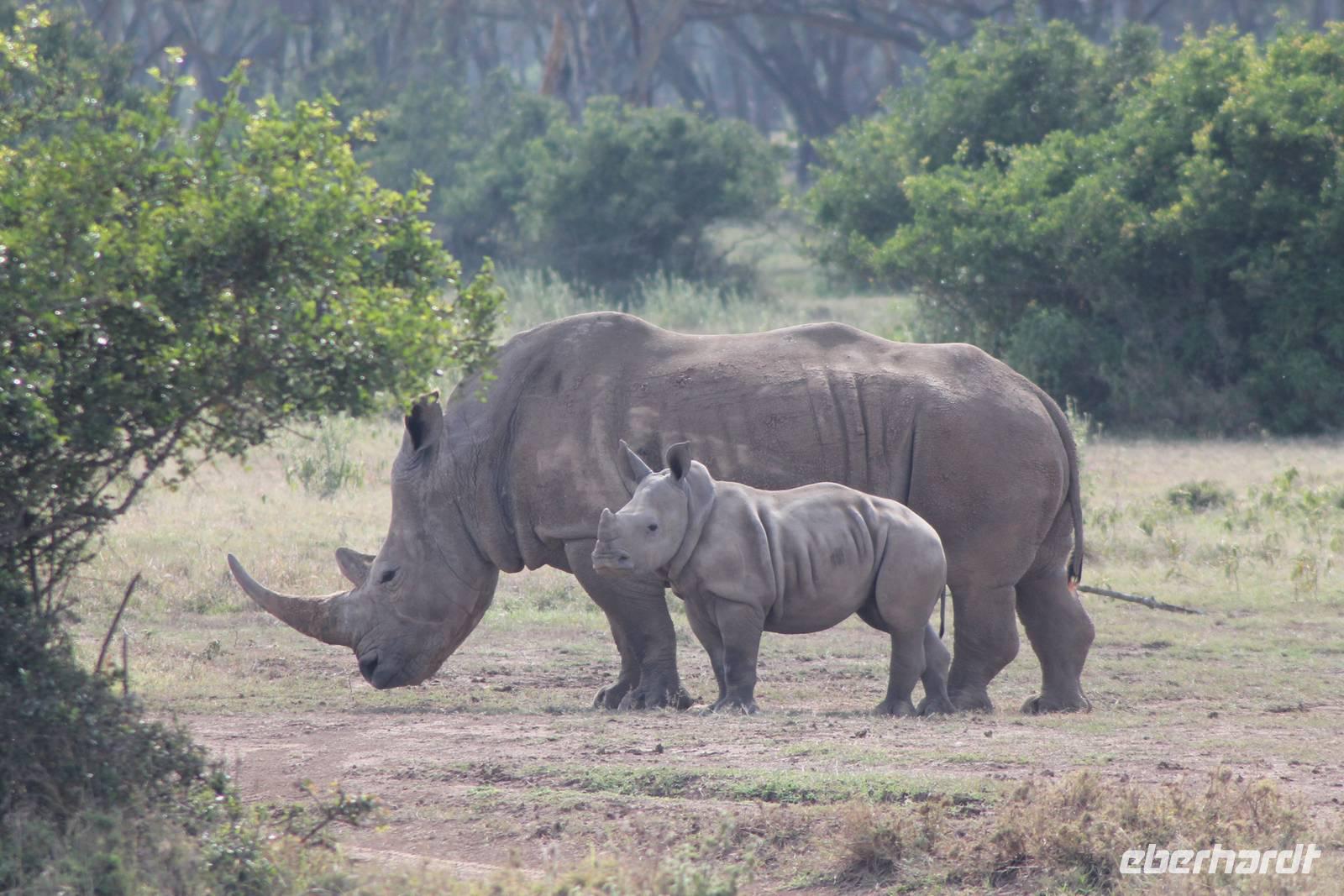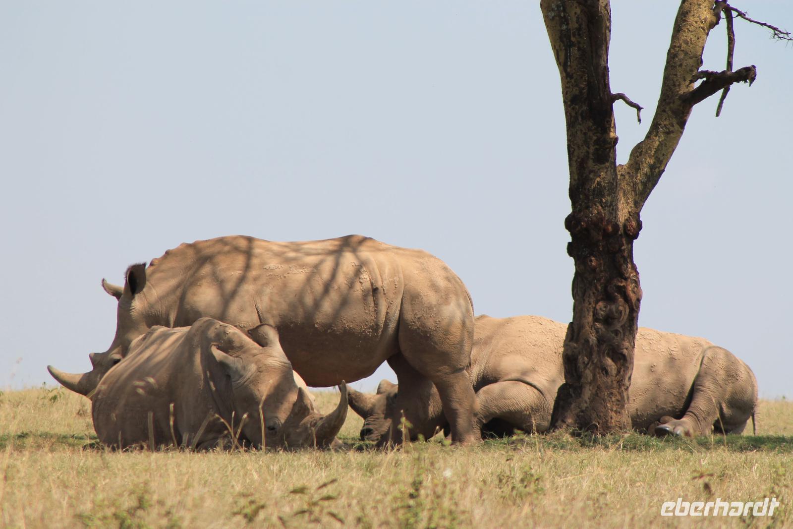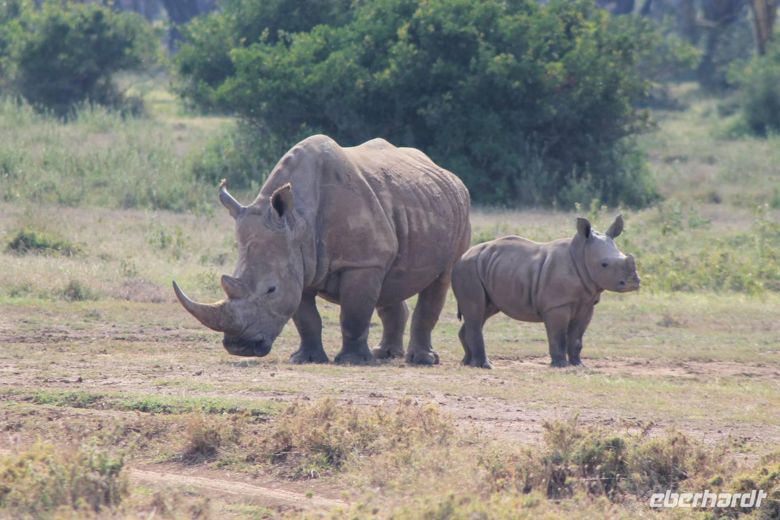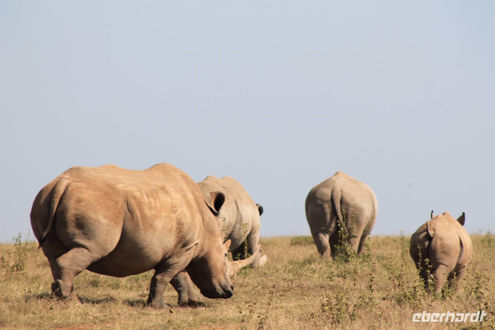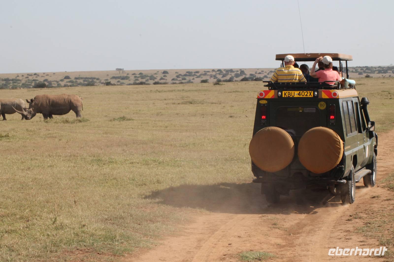 Heute frühstückten wir bereits 6.30 Uhr, denn wir wollten ja früh auf Safari in dem privaten Solio Reservat, um möglichst viele Tiere zu sehen. Und dies gelang uns dann auch - wir sahen Thomsongazellen, Hagedasch, Impalas, Wasserböcke, Breitmaulnashörner, Netzgiraffen, Elanantilopen, Steppenzebras, Kaffernbüffel, Sekretäre, Weißbrauenkuckuck, Mausvogel, Warzenschweine, Spießböcke, Steppenzebras, Grünmeerkatzen, Kronenkiebiz, Glanzstare, Gaukler, Schwarzhalsreiher, Augurbussard, Sperbergeier und Gabelracke. Besonders bekannt ist das Reservat vor allem wegen der zahlreichen Spitz- und Breitmaulnashörner, die wir ganz nah und in allen Lebenssituationen bestaunen konnten. Zurück auf Petras Ranch wurde zum Mittagessen Lasagne, Zucchini und Salat serviert. Dann wurde eine kleine Mittagsruhe eingelegt und um vier trafen wir uns wieder für einen Spaziergang. Zwei von Petras Angestellten begleiteten uns und wir sahen einige Impalas, diverse Pflanzen und vor allem tat es richtig gut, sich zu bewegen. Oskar und seine 2 Begleiter machten einem Hasen kurzzeitig das Leben schwer, aber anscheinend war der Hase doch schneller . Unseren Weg mussten wir dann noch ein Stück verlängern, denn unser Begleiter sah Büffel auf unserem Weg und auf diese nahe Begegnung hatten wir dann doch keine Lust. Zurück auf der Ranch genossen wir wieder die herrliche Ruhe bei einem Getränk auf der Terrasse. Um Moskitos und die damit verbundene Malaria musste man sich auch keine Sorgen machen, dafür liegt Petras Ranch zu hoch. Petra hatte uns noch von ihrem Kinderheim-Projekt erzählt, das viele von uns gern unterstützen und ihr eine Kleinigkeit für die Kinder mitgaben.