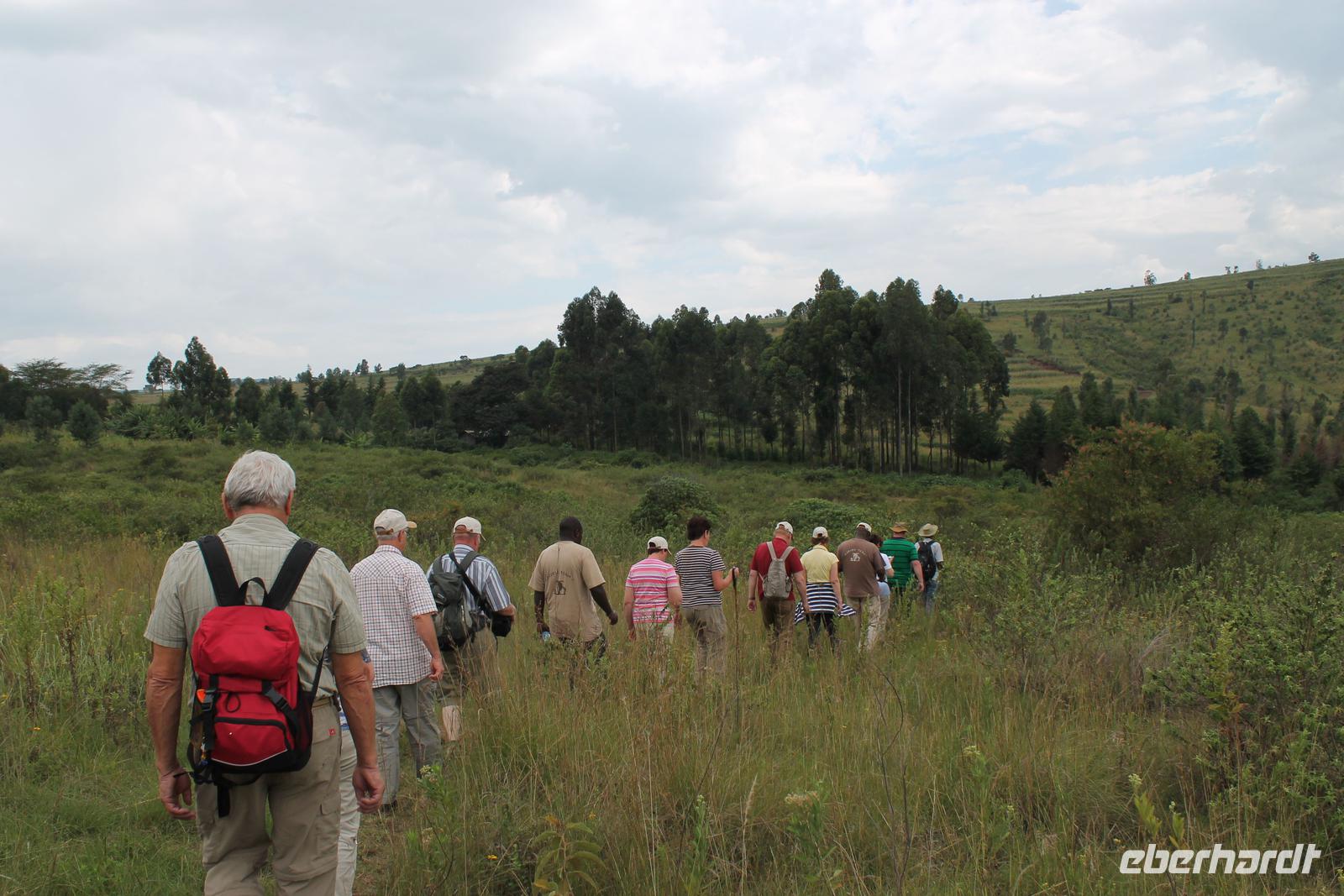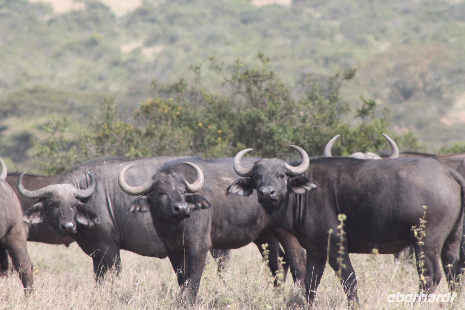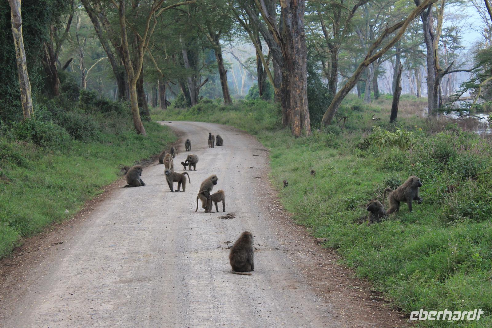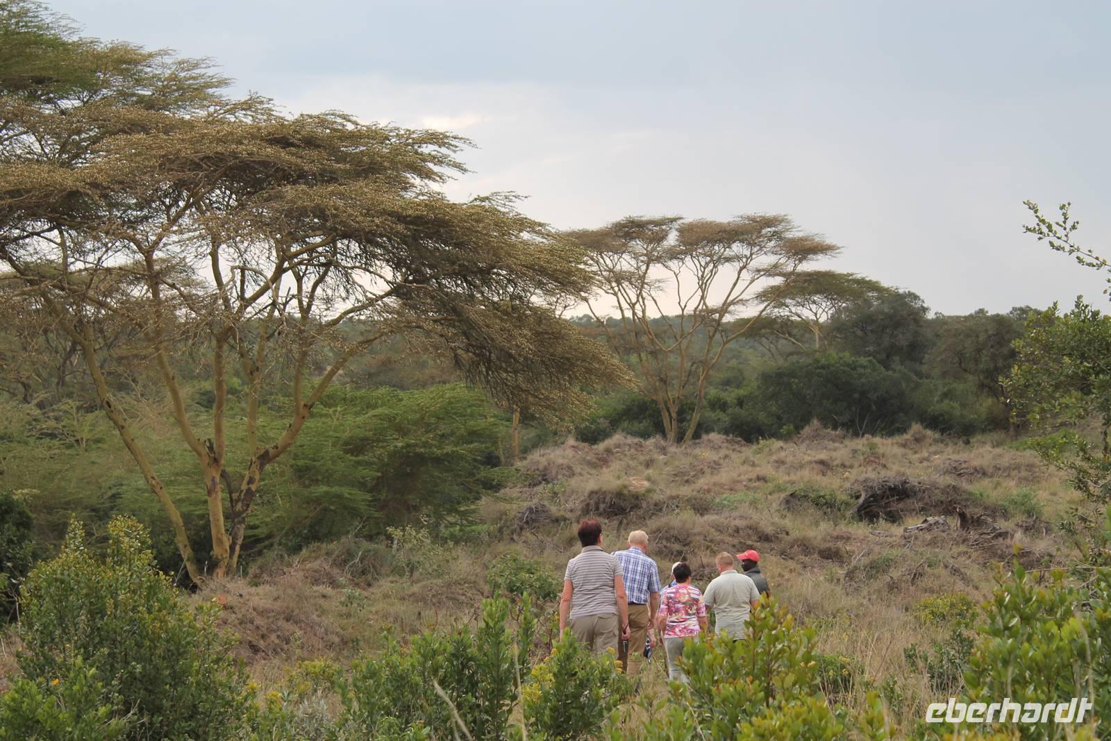 Heute ging es schon vor dem Frühstück auf Pirsch, denn wir wollten ja Raubkatzen sehen und dafür sind die Morgenstunden am besten geeignet. Die Nacht war ziemlich laut, denn es war Samstag Abend und die Kenianer mögen, wie es scheint, ihre Musik laut und lang. So fiel es uns leicht, noch vor dem Sonnenaufgang das Flamingo Hill Camp zu verlassen. Wir konnten einen Kaffee trinken und eine Kleinigkeit essen. Wir sahen die Sonne hell und wie ein Feuerball hinter den Bergen aufgehen. Als erstes sahen wir im Nakuru-Nationalpark an diesem Morgen wieder viele Büffel und Paviane, wir sahen Zebras, Grantgazellen, Thompsongazellen, Impalas, Warzenschweine, Elanantilopen, Dik-Diks, Nashörner aus weiter Ferne, eine einzelne Rotschildgiraffe und zum Schluss die ersehnte „Katze". Eigentlich waren wir schon auf dem Weg zum Frühstück in unserer Lodge, aber Jackson wurde von Caleb angefunkt, noch einmal umzudrehen. Und dann sahen wir ihn weit weg in einer Astgabel liegen - einen Löwen. Nun konnten wir uns zufrieden zum Frühstück begeben. Wir checkten in Ruhe aus und begaben uns durch die viertgrößte Stadt Kenias, Nakuru, zu unserer heutigen Unterkunft - die Maili Saba Lodge am Rande des Menengai Kraters. Das bunte Leben in einer afrikanischen Stadt am Sonntag zieht einen in seinen Bann - die Menschen haben sich in ihre schönsten Kleider gehüllt und gehen ihren Interessen nach: Frauen und Kinder gehen zumeist in die Kirche, die Männer in die Kneipe . In der Lodge wurden wir mit einem Drei-Gang-Menü verwöhnt, bevor wir uns am Nachmittag auf eine Wanderung im Krater begaben. Diese wurde erst durch die verspätete Ankunft der Wanderführerin, unserer Chauffeure und einem kurzen Regenguss verzögert. Wir entschieden uns trotz dunkler Wolken los zu gehen, und genossen zuerst auch die Sonne und den relativ gut begehbaren Weg. Beides hatte aber ein baldiges Ende . Der Weg wurde beschwerlicher, die Sonne verschwand bald und es setzten wieder Regenschauer ein, aber natürlich wollten wir noch ein Ziel erreichen. Auch das fand ein schnelles Ende, denn der Weg war leider gesperrt. So drehten wir um und traten leicht nass, aber dadurch kühlend den Rückweg berghoch an. Oben angekommen, waren alle glücklich über die Bewegung, die man hinter sich hatte. Aber um sich nicht zu erkälten, desinfizierten wir uns erst mit einem Viceroy und stiegen dann unter die heiße Dusche. Zum Abendessen trafen wir uns wieder im Haupthaus, wo nun eine Feuerschale aufgestellt war, was unser Zusammensitzen noch gemütlicher machte. Zum Abendessen wurde erst eine Suppe für alle serviert und im Anschluss konnten wir wieder zwischen Lamm, Fisch und Vegetarisch wählen. Zufrieden und satt legten wir uns ins Bett, mit den Geräuschen der umgebenden Natur.