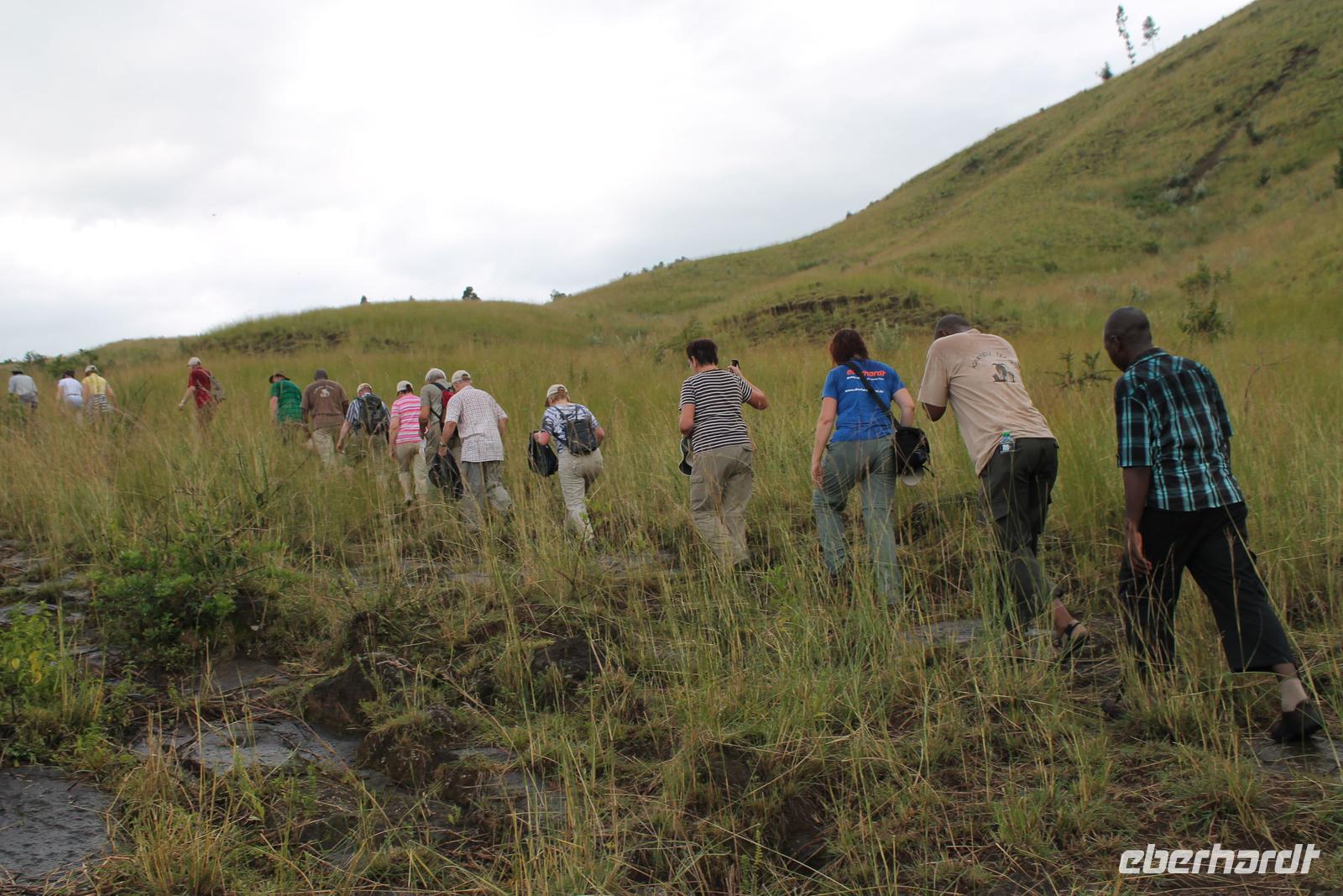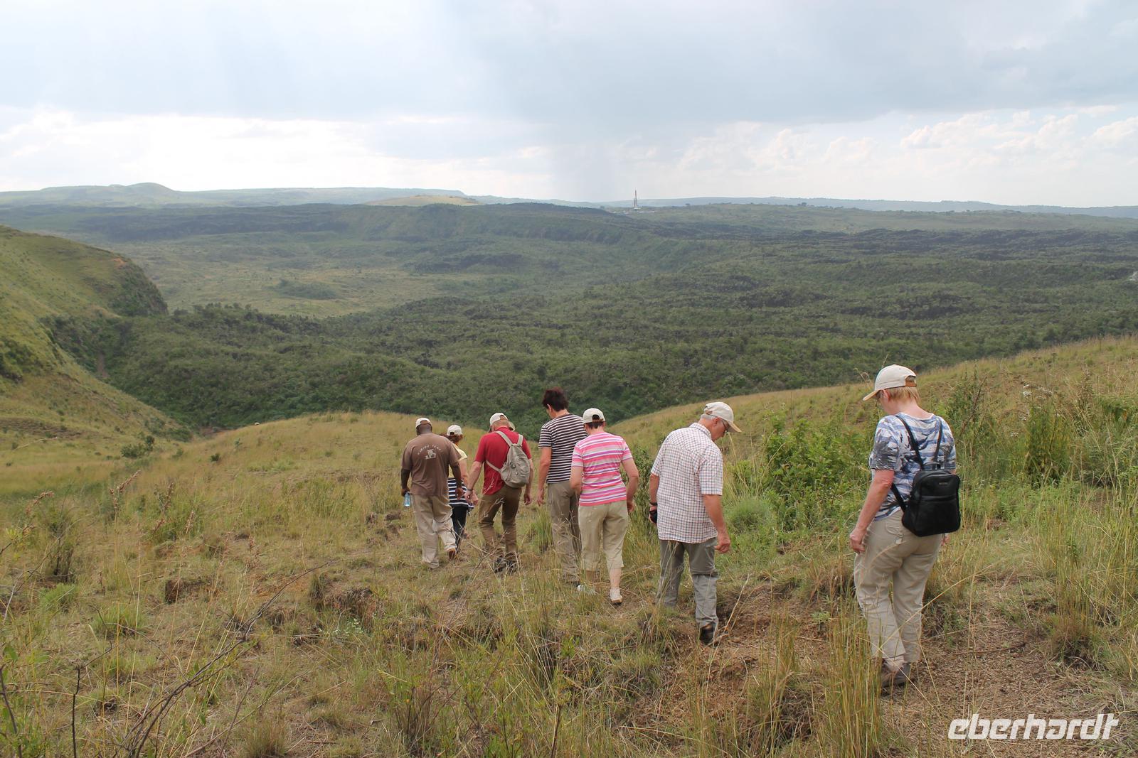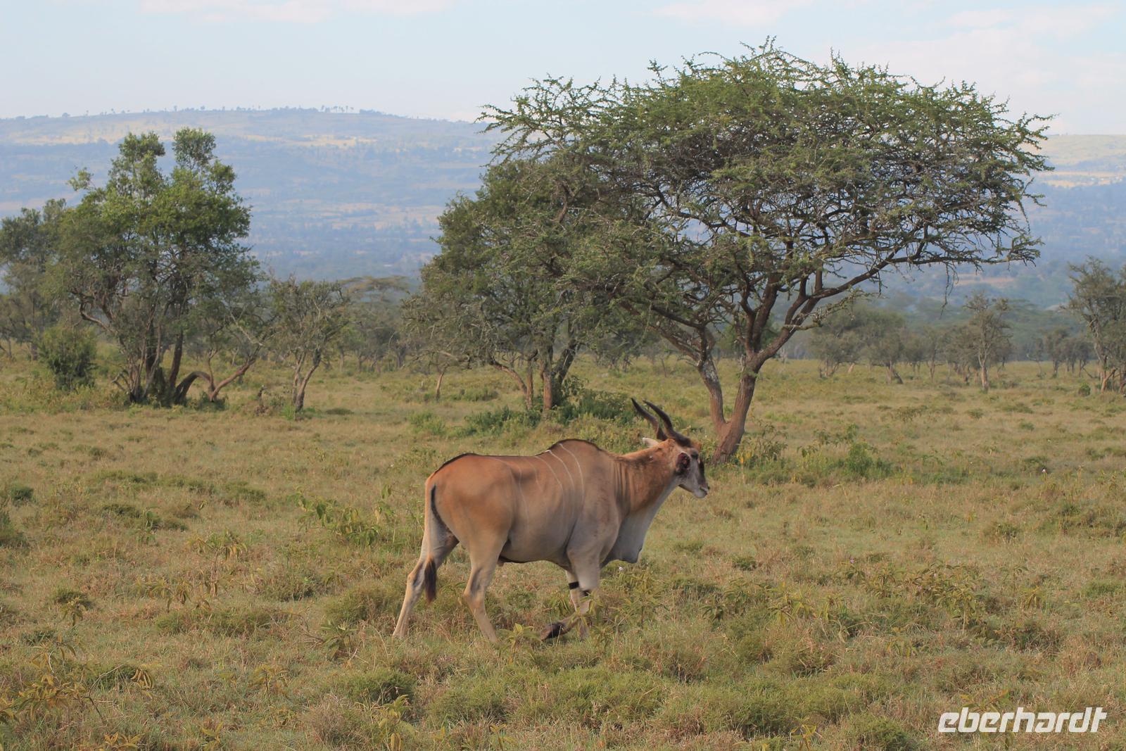 Heute ging es schon vor dem Frühstück auf Pirsch, denn wir wollten ja Raubkatzen sehen und dafür sind die Morgenstunden am besten geeignet. Die Nacht war ziemlich laut, denn es war Samstag Abend und die Kenianer mögen, wie es scheint, ihre Musik laut und lang. So fiel es uns leicht, noch vor dem Sonnenaufgang das Flamingo Hill Camp zu verlassen. Wir konnten einen Kaffee trinken und eine Kleinigkeit essen. Wir sahen die Sonne hell und wie ein Feuerball hinter den Bergen aufgehen. Als erstes sahen wir im Nakuru-Nationalpark an diesem Morgen wieder viele Büffel und Paviane, wir sahen Zebras, Grantgazellen, Thompsongazellen, Impalas, Warzenschweine, Elanantilopen, Dik-Diks, Nashörner aus weiter Ferne, eine einzelne Rotschildgiraffe und zum Schluss die ersehnte „Katze". Eigentlich waren wir schon auf dem Weg zum Frühstück in unserer Lodge, aber Jackson wurde von Caleb angefunkt, noch einmal umzudrehen. Und dann sahen wir ihn weit weg in einer Astgabel liegen - einen Löwen. Nun konnten wir uns zufrieden zum Frühstück begeben. Wir checkten in Ruhe aus und begaben uns durch die viertgrößte Stadt Kenias, Nakuru, zu unserer heutigen Unterkunft - die Maili Saba Lodge am Rande des Menengai Kraters. Das bunte Leben in einer afrikanischen Stadt am Sonntag zieht einen in seinen Bann - die Menschen haben sich in ihre schönsten Kleider gehüllt und gehen ihren Interessen nach: Frauen und Kinder gehen zumeist in die Kirche, die Männer in die Kneipe . In der Lodge wurden wir mit einem Drei-Gang-Menü verwöhnt, bevor wir uns am Nachmittag auf eine Wanderung im Krater begaben. Diese wurde erst durch die verspätete Ankunft der Wanderführerin, unserer Chauffeure und einem kurzen Regenguss verzögert. Wir entschieden uns trotz dunkler Wolken los zu gehen, und genossen zuerst auch die Sonne und den relativ gut begehbaren Weg. Beides hatte aber ein baldiges Ende . Der Weg wurde beschwerlicher, die Sonne verschwand bald und es setzten wieder Regenschauer ein, aber natürlich wollten wir noch ein Ziel erreichen. Auch das fand ein schnelles Ende, denn der Weg war leider gesperrt. So drehten wir um und traten leicht nass, aber dadurch kühlend den Rückweg berghoch an. Oben angekommen, waren alle glücklich über die Bewegung, die man hinter sich hatte. Aber um sich nicht zu erkälten, desinfizierten wir uns erst mit einem Viceroy und stiegen dann unter die heiße Dusche. Zum Abendessen trafen wir uns wieder im Haupthaus, wo nun eine Feuerschale aufgestellt war, was unser Zusammensitzen noch gemütlicher machte. Zum Abendessen wurde erst eine Suppe für alle serviert und im Anschluss konnten wir wieder zwischen Lamm, Fisch und Vegetarisch wählen. Zufrieden und satt legten wir uns ins Bett, mit den Geräuschen der umgebenden Natur.