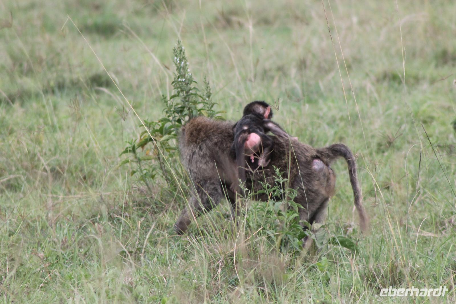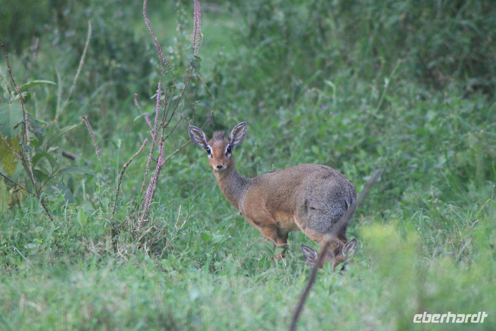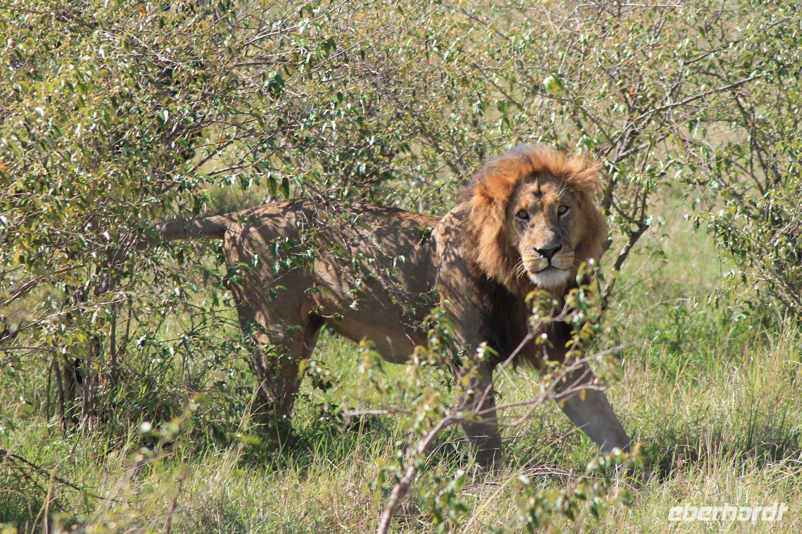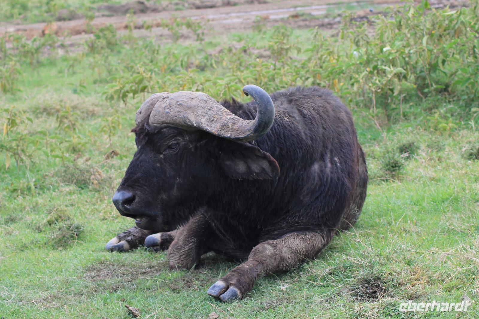 Heute ging es schon vor dem Frühstück auf Pirsch, denn wir wollten ja Raubkatzen sehen und dafür sind die Morgenstunden am besten geeignet. Die Nacht war ziemlich laut, denn es war Samstag Abend und die Kenianer mögen, wie es scheint, ihre Musik laut und lang. So fiel es uns leicht, noch vor dem Sonnenaufgang das Flamingo Hill Camp zu verlassen. Wir konnten einen Kaffee trinken und eine Kleinigkeit essen. Wir sahen die Sonne hell und wie ein Feuerball hinter den Bergen aufgehen. Als erstes sahen wir im Nakuru-Nationalpark an diesem Morgen wieder viele Büffel und Paviane, wir sahen Zebras, Grantgazellen, Thompsongazellen, Impalas, Warzenschweine, Elanantilopen, Dik-Diks, Nashörner aus weiter Ferne, eine einzelne Rotschildgiraffe und zum Schluss die ersehnte „Katze". Eigentlich waren wir schon auf dem Weg zum Frühstück in unserer Lodge, aber Jackson wurde von Caleb angefunkt, noch einmal umzudrehen. Und dann sahen wir ihn weit weg in einer Astgabel liegen - einen Löwen. Nun konnten wir uns zufrieden zum Frühstück begeben. Wir checkten in Ruhe aus und begaben uns durch die viertgrößte Stadt Kenias, Nakuru, zu unserer heutigen Unterkunft - die Maili Saba Lodge am Rande des Menengai Kraters. Das bunte Leben in einer afrikanischen Stadt am Sonntag zieht einen in seinen Bann - die Menschen haben sich in ihre schönsten Kleider gehüllt und gehen ihren Interessen nach: Frauen und Kinder gehen zumeist in die Kirche, die Männer in die Kneipe . In der Lodge wurden wir mit einem Drei-Gang-Menü verwöhnt, bevor wir uns am Nachmittag auf eine Wanderung im Krater begaben. Diese wurde erst durch die verspätete Ankunft der Wanderführerin, unserer Chauffeure und einem kurzen Regenguss verzögert. Wir entschieden uns trotz dunkler Wolken los zu gehen, und genossen zuerst auch die Sonne und den relativ gut begehbaren Weg. Beides hatte aber ein baldiges Ende . Der Weg wurde beschwerlicher, die Sonne verschwand bald und es setzten wieder Regenschauer ein, aber natürlich wollten wir noch ein Ziel erreichen. Auch das fand ein schnelles Ende, denn der Weg war leider gesperrt. So drehten wir um und traten leicht nass, aber dadurch kühlend den Rückweg berghoch an. Oben angekommen, waren alle glücklich über die Bewegung, die man hinter sich hatte. Aber um sich nicht zu erkälten, desinfizierten wir uns erst mit einem Viceroy und stiegen dann unter die heiße Dusche. Zum Abendessen trafen wir uns wieder im Haupthaus, wo nun eine Feuerschale aufgestellt war, was unser Zusammensitzen noch gemütlicher machte. Zum Abendessen wurde erst eine Suppe für alle serviert und im Anschluss konnten wir wieder zwischen Lamm, Fisch und Vegetarisch wählen. Zufrieden und satt legten wir uns ins Bett, mit den Geräuschen der umgebenden Natur.