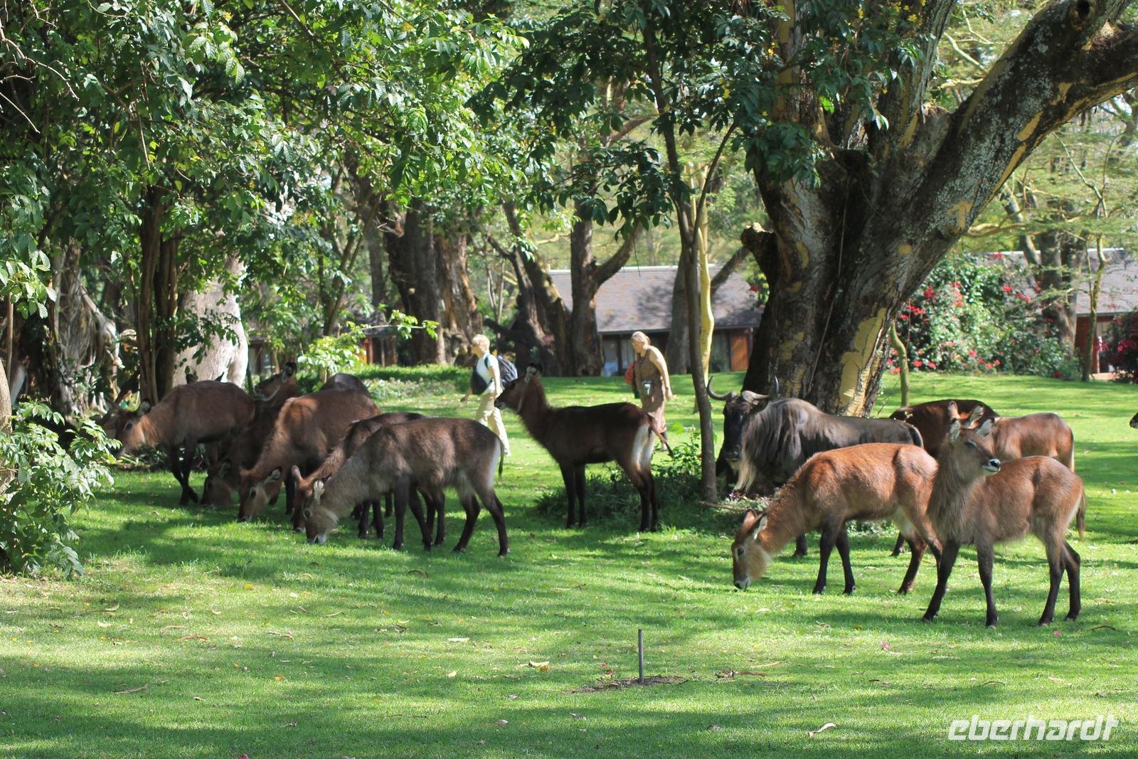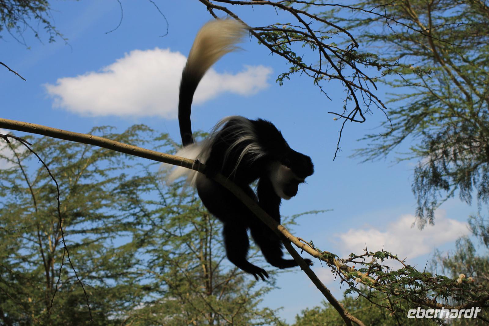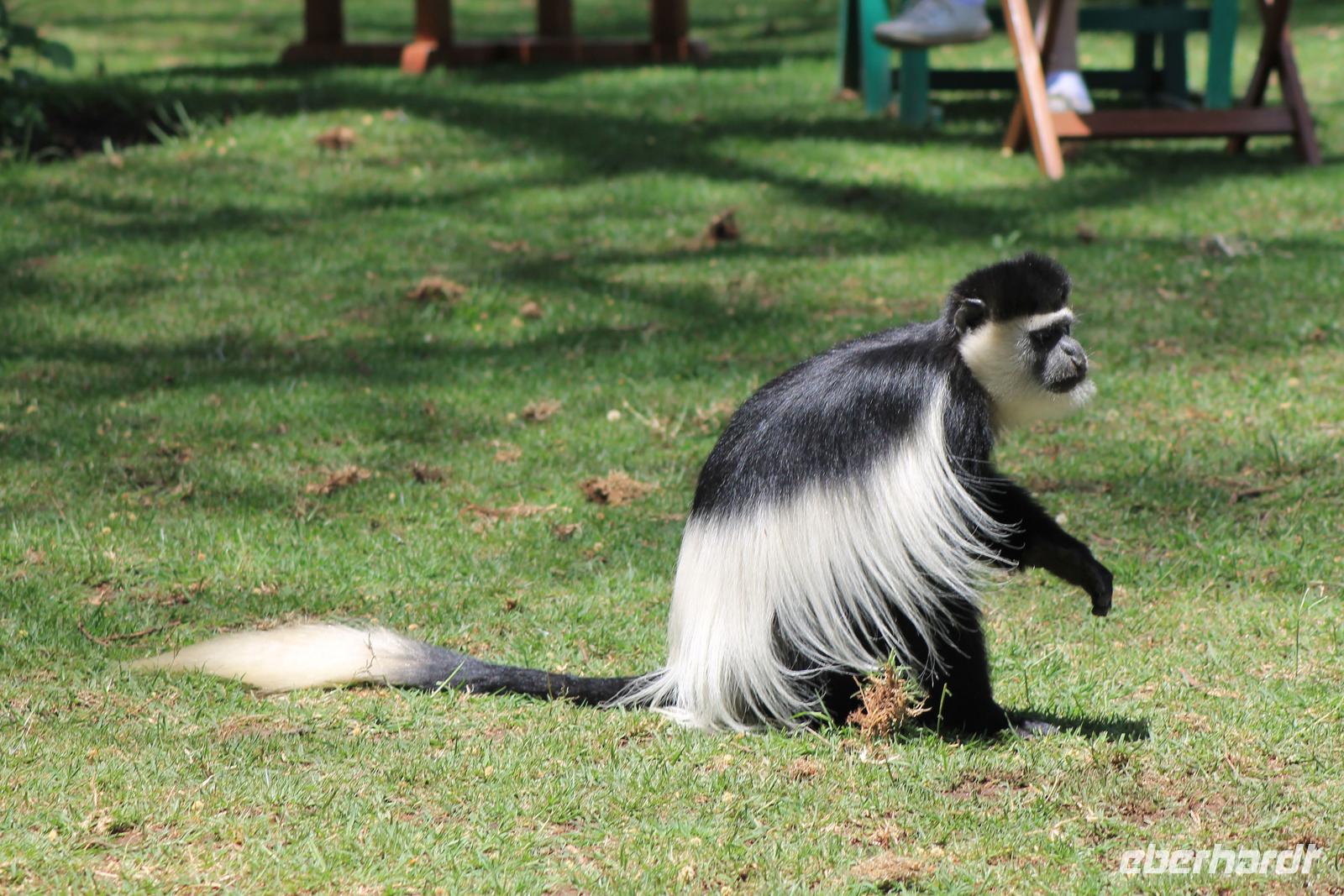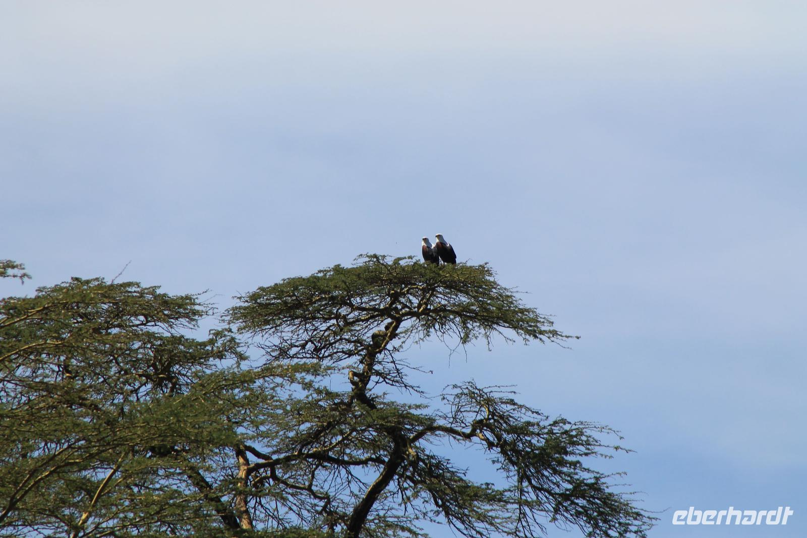 Das Frühstück nahmen wir heute vom reichlichen Buffet ein und verstauten das Gepäck für den Umzug am Mittag in die Bungalows in einen Gepäckraum. Dann fuhren wir mit den Jeeps und unseren „Jungs" zum Bootsableger. Für unsere Gruppe wurden zwei Boote vorbereitet, was von vielen mit Skepsis beobachtet wurde, denn mit den Booten in Deutschland konnte man diese nicht unbedingt vergleichen. Dennoch stiegen alle mit Rettungsweste bekleidet ein und wir fuhren los. Wir sahen unter anderem Kormorane, Pelikane und Reiher und dann versuchten unsere Bootsführer, mit Fisch die hier ansässigen Seeschreiadler bzw. Fischadler anzulocken. Sonderlich hungrig waren diese aber nicht, und so klappte es, für beide Boote sichtbar, nur einmal, dass ein Adler nah ans Boot kam, um sich die „Beute" zu holen. Und dann passierte das Befürchtete: das erste Boot fuhr davon, und unseres blieb liegen - der Motor gab den Geist auf. Sofort telefonierte der Bootsführer mit seinem Chef, aber leider dauerte es eine ganze Weile, bis wir „gerettet" wurden. Unserer guten Stimmung tat dies zum Glück keinen Abbruch. Wir wurden von dem Boot abgeschleppt, in dem der andere Teil der Gruppe zuvor gesessen hatte und trafen uns im Elsamere Conservation Center wieder. Die Gäste im intakten Boot sahen noch einmal den Seeschreiadler ganz nah und konnten auch Flusspferde aus dem Boot beobachten. Das Elsamere Conservation Center ist das ehemalige Wohnhaus von Joy und George Adamson, die mit der Aufzucht der Löwin Elsa sowie vielen weiteren Tierschutzprojekten und den daraus entstandenen Büchern und Filmen berühmt wurden. Wir beobachteten zuerst im wunderschön angelegten Garten die Colobus-Affen und sahen im Anschluss einen tollen Film über das Leben und das Lebenswerk der Familie Adamson. Danach wurde uns Kaffee, Tee und Kuchen angeboten und wir konnten einen Blick in das kleine Museum werfen.