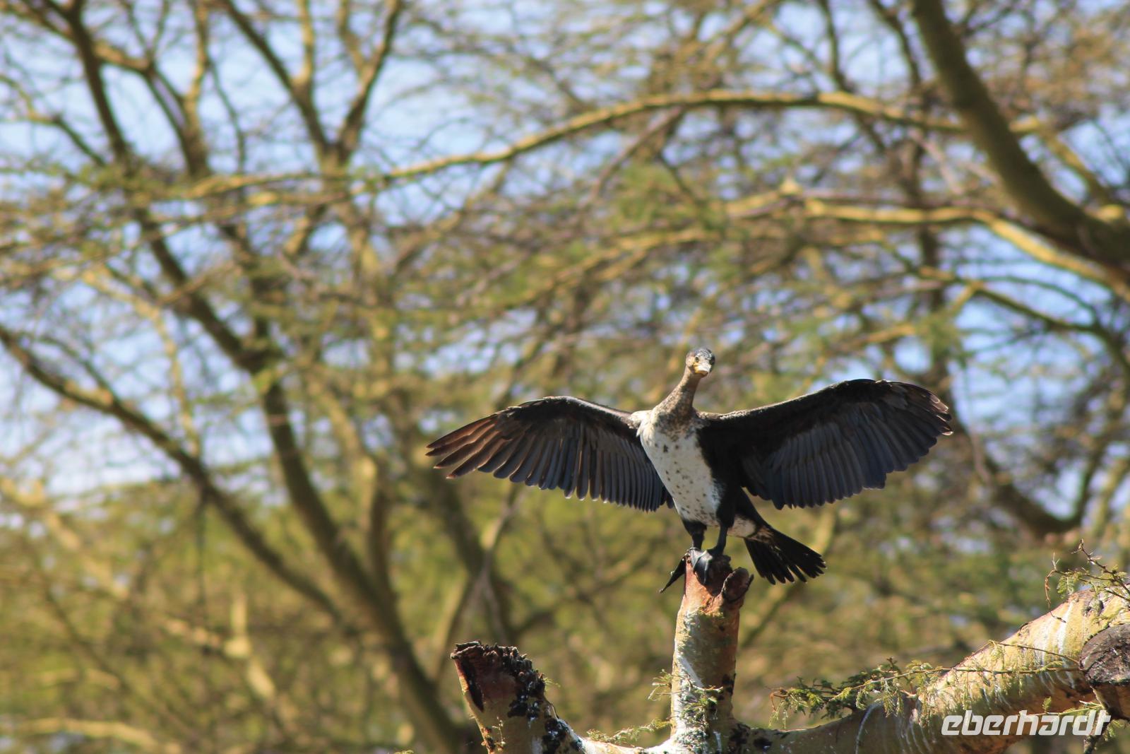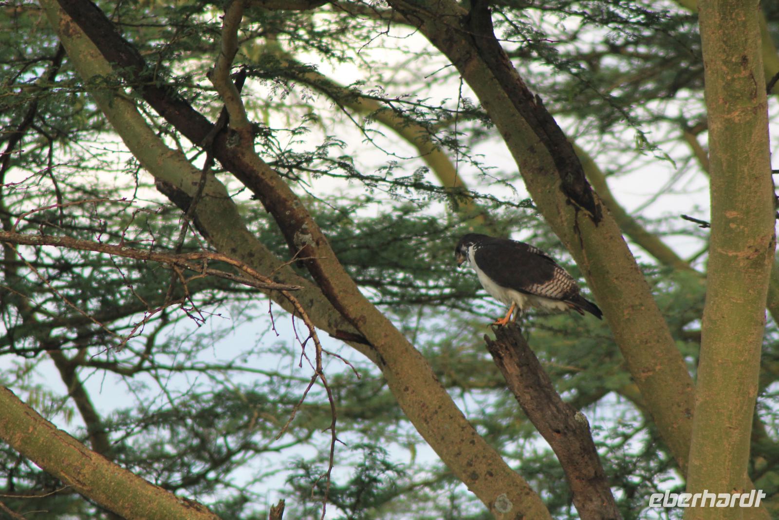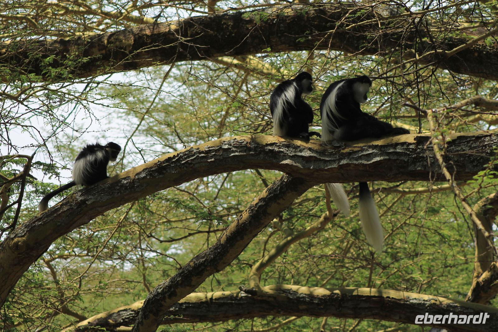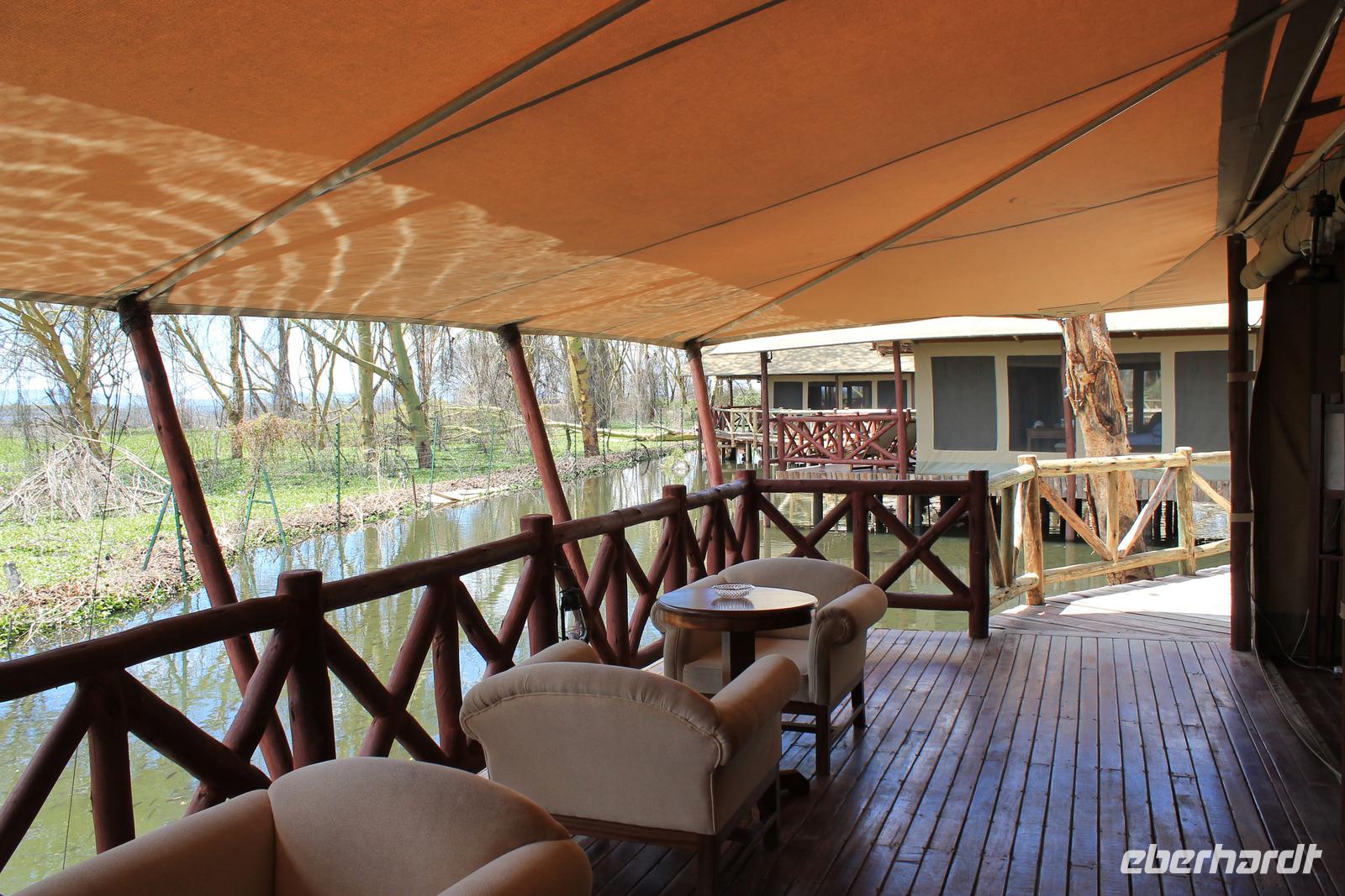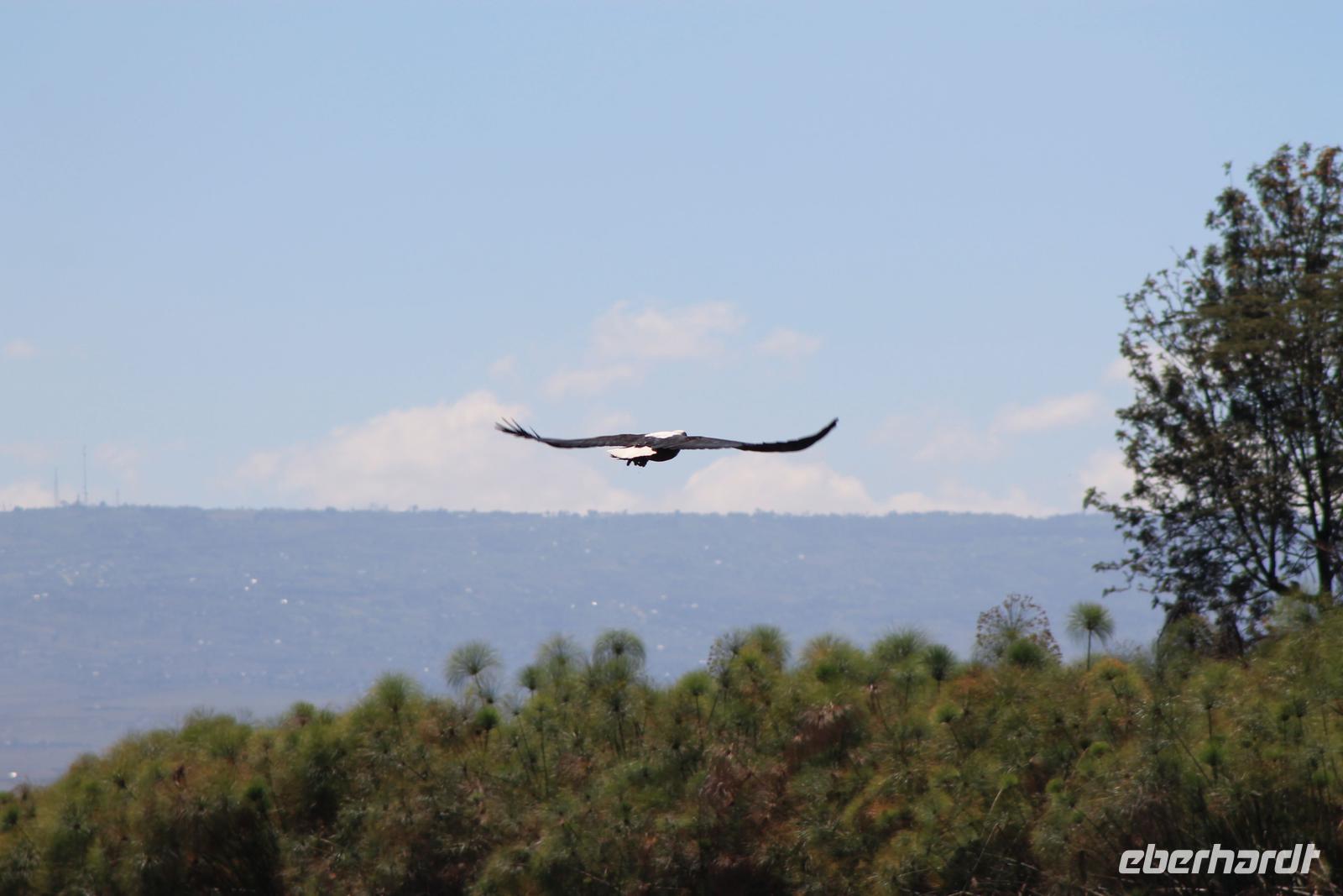Das Frühstück nahmen wir heute vom reichlichen Buffet ein und verstauten das Gepäck für den Umzug am Mittag in die Bungalows in einen Gepäckraum. Dann fuhren wir mit den Jeeps und unseren „Jungs" zum Bootsableger. Für unsere Gruppe wurden zwei Boote vorbereitet, was von vielen mit Skepsis beobachtet wurde, denn mit den Booten in Deutschland konnte man diese nicht unbedingt vergleichen. Dennoch stiegen alle mit Rettungsweste bekleidet ein und wir fuhren los. Wir sahen unter anderem Kormorane, Pelikane und Reiher und dann versuchten unsere Bootsführer, mit Fisch die hier ansässigen Seeschreiadler bzw. Fischadler anzulocken. Sonderlich hungrig waren diese aber nicht, und so klappte es, für beide Boote sichtbar, nur einmal, dass ein Adler nah ans Boot kam, um sich die „Beute" zu holen. Und dann passierte das Befürchtete: das erste Boot fuhr davon, und unseres blieb liegen - der Motor gab den Geist auf. Sofort telefonierte der Bootsführer mit seinem Chef, aber leider dauerte es eine ganze Weile, bis wir „gerettet" wurden. Unserer guten Stimmung tat dies zum Glück keinen Abbruch. Wir wurden von dem Boot abgeschleppt, in dem der andere Teil der Gruppe zuvor gesessen hatte und trafen uns im Elsamere Conservation Center wieder. Die Gäste im intakten Boot sahen noch einmal den Seeschreiadler ganz nah und konnten auch Flusspferde aus dem Boot beobachten. Das Elsamere Conservation Center ist das ehemalige Wohnhaus von Joy und George Adamson, die mit der Aufzucht der Löwin Elsa sowie vielen weiteren Tierschutzprojekten und den daraus entstandenen Büchern und Filmen berühmt wurden. Wir beobachteten zuerst im wunderschön angelegten Garten die Colobus-Affen und sahen im Anschluss einen tollen Film über das Leben und das Lebenswerk der Familie Adamson. Danach wurde uns Kaffee, Tee und Kuchen angeboten und wir konnten einen Blick in das kleine Museum werfen.