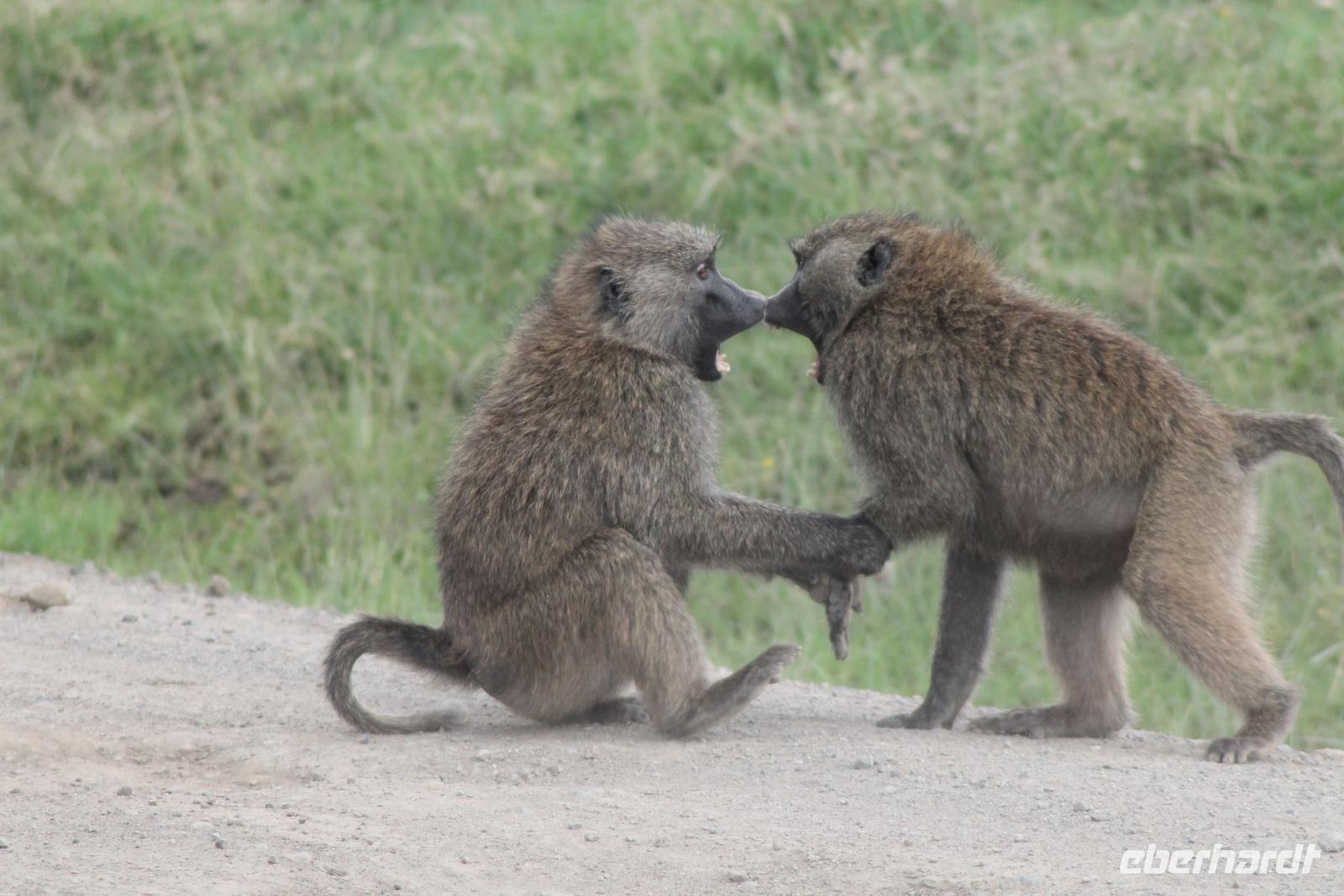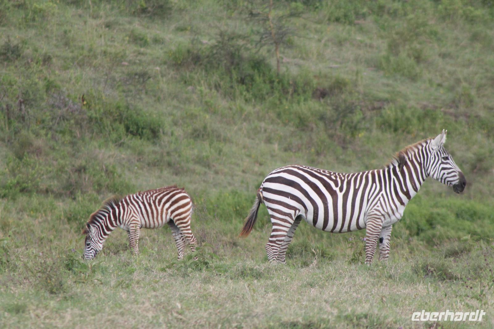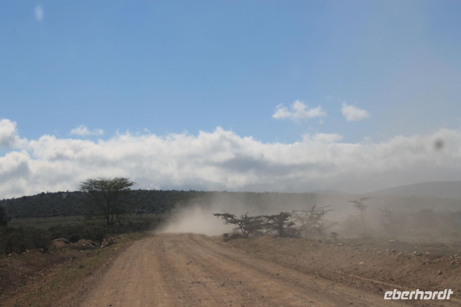 In Nairobi nur mit ein paar Minuten Verspätung angekommen verließen wir das Flugzeug, während die Gäste nach Dar-es-Salaam sitzen blieben. Wir begaben uns zur Passkontrolle und Visa-Vergabe und auch das ging ziemlich zügig, sodass wir bald unsere Koffer in Empfang nahmen und uns auf die Suche nach unserem örtlichen Reiseleiter machten. In Kenia dürfen die „Abholenden" nicht direkt im Ankunftsgebäude stehen, wie man das von anderen Ländern kennt, sondern sie stehen in einem großen Pulk draußen. Aber schnell fand ich unseren Reiseleiter Leonard, wir gingen Euro in Kenia-Schilling tauschen und begaben uns zu dem Bus, der uns ins Panafric Hotel brachte. Das Gepäck musste etwas in den Bus gebastelt werden, aber das sollte nicht das letzte Mal gewesen sein. Und auch den für Nairobi typischen Stau erlebten wir. Aber wir bekamen schnell unsere Zimmerschlüssel und fielen müde und gespannt auf die nächsten Tage ins Bett.