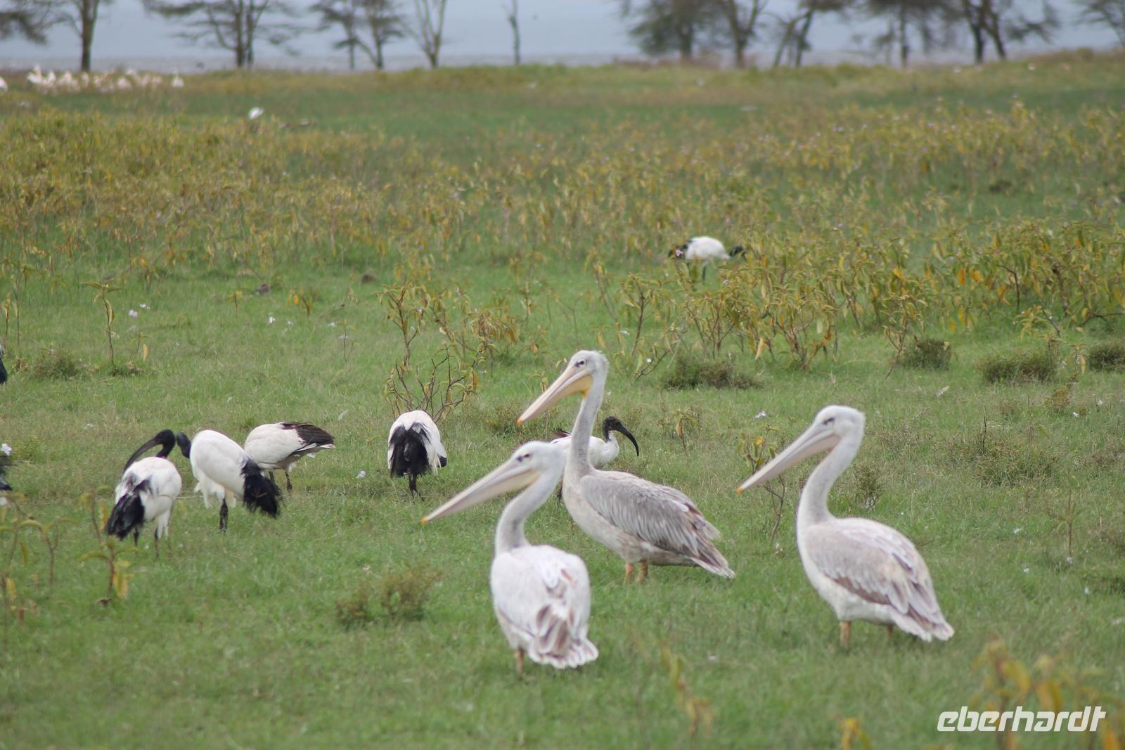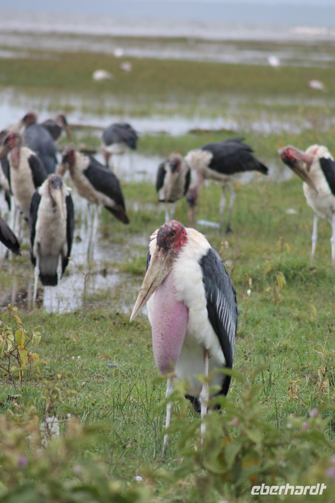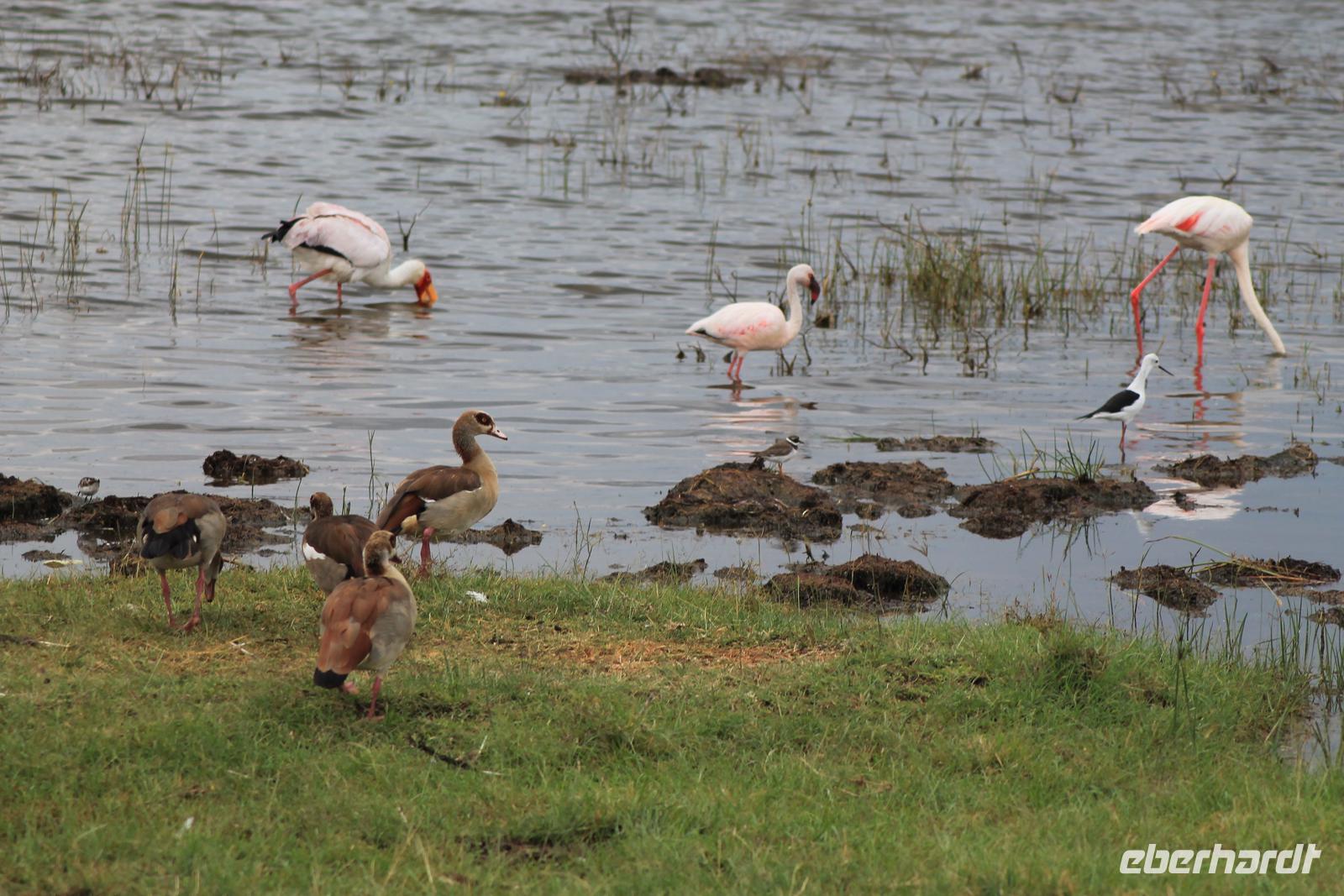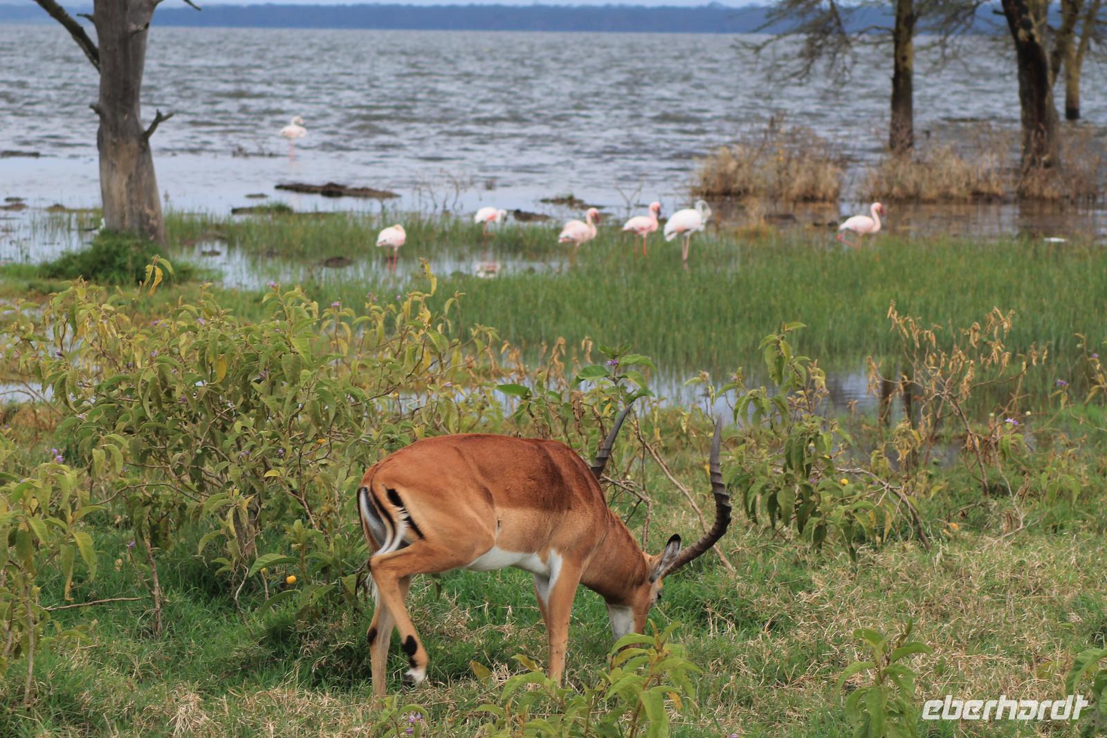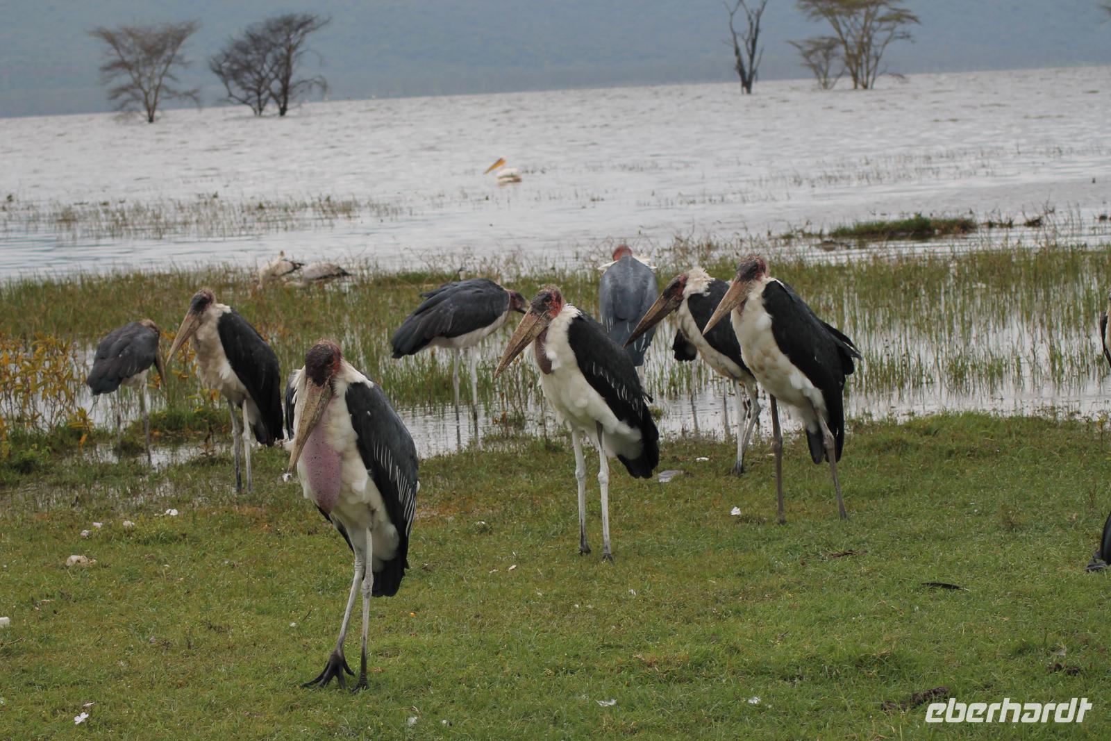 Ein letztes familiäres Frühstück am großen Tisch mit allen Leckereien um uns herum machte uns den Abschied von Petra und ihren lieben Angestellten noch ein bißchen schwerer, aber wir wollten ja noch mehr von Kenia sehen. Nach einem letzten Gruppenbild in ihrem schönen Garten und einer innigen Verabschiedung schlugen wir den Weg Richtung Nakuru See-Nationalpark ein, wo uns das schöne Flamingo-Hill-Camp erwartete. Da wir auf unserer Strecke den Äquator überquerten, wurde natürlich eine richtige Äquator-Taufe durchgeführt, mit einem Zertifikat als Erinnerung für zu Hause, und wir stießen mit einem schönen Viceroy auf dieses Erlebnis an. Die Desinfektion des Bauches ist ja auch immer sehr wichtig auf Reisen . Eine kurze Pause an den 81 Meter hohen Thomson Wasserfällen wurde auf der Strecke auch eingelegt. Pünktlich zum Mittagessen kamen wir in unserem Quartier an. Einige nutzten die Pause für eine Massage, die unseren „Kenia-Straßen-geplagten" Chauffeuren am Abend auch zu gute kommen sollte. Auch der Pool lud zum Entspannen ein. Auf unserer Fahrt am Nachmittag konnten wir vor allem die herrliche Vogelwelt bestaunen. Durch die Ausdehnung des Nakuru-Sees auf ein Vielfaches seiner ursprünglichen Größe sind die Riesenschwärme von Flamingos zwar nicht mehr so zahlreich vorhanden, aber dennoch hatten wir einiges zu bestaunen. Zebras, Impalas, Paviane, Zwergflamingos, gemeine Flamingos, Kormorane, Marabu- und Nimmersatt-Störche, Löffler, Pelikane, eine Leopardenschildkröte, Büffel mit Madenhackern und verschiedenen Reihern, Ibisse und vieles vieles mehr. Vom Aussichtspunkt konnte man von oben sehen, wo die ursprünglichen Grenzen des Sees vorher zu finden waren und wo nun Straßen und Wege im Wasser verschwunden sind. Das Abendessen war sehr lecker und die Bettschwere sollte auch bald eintreten, sodass wir uns bald in unsere Luxus-Zelte "verkrümelten".