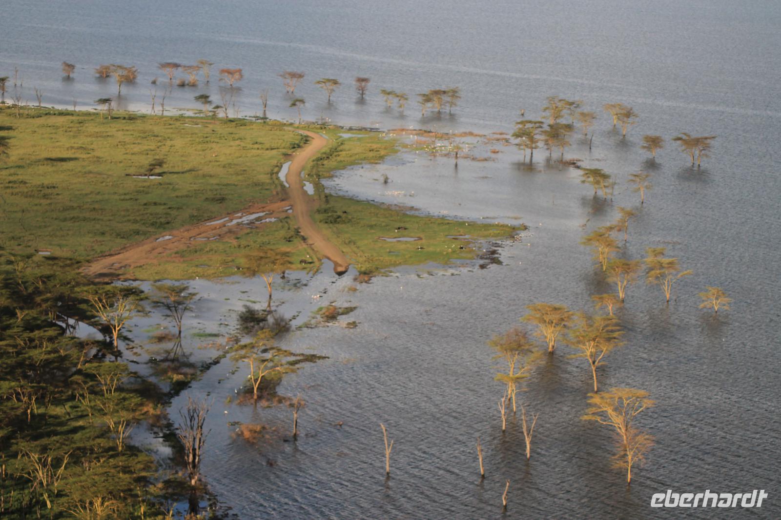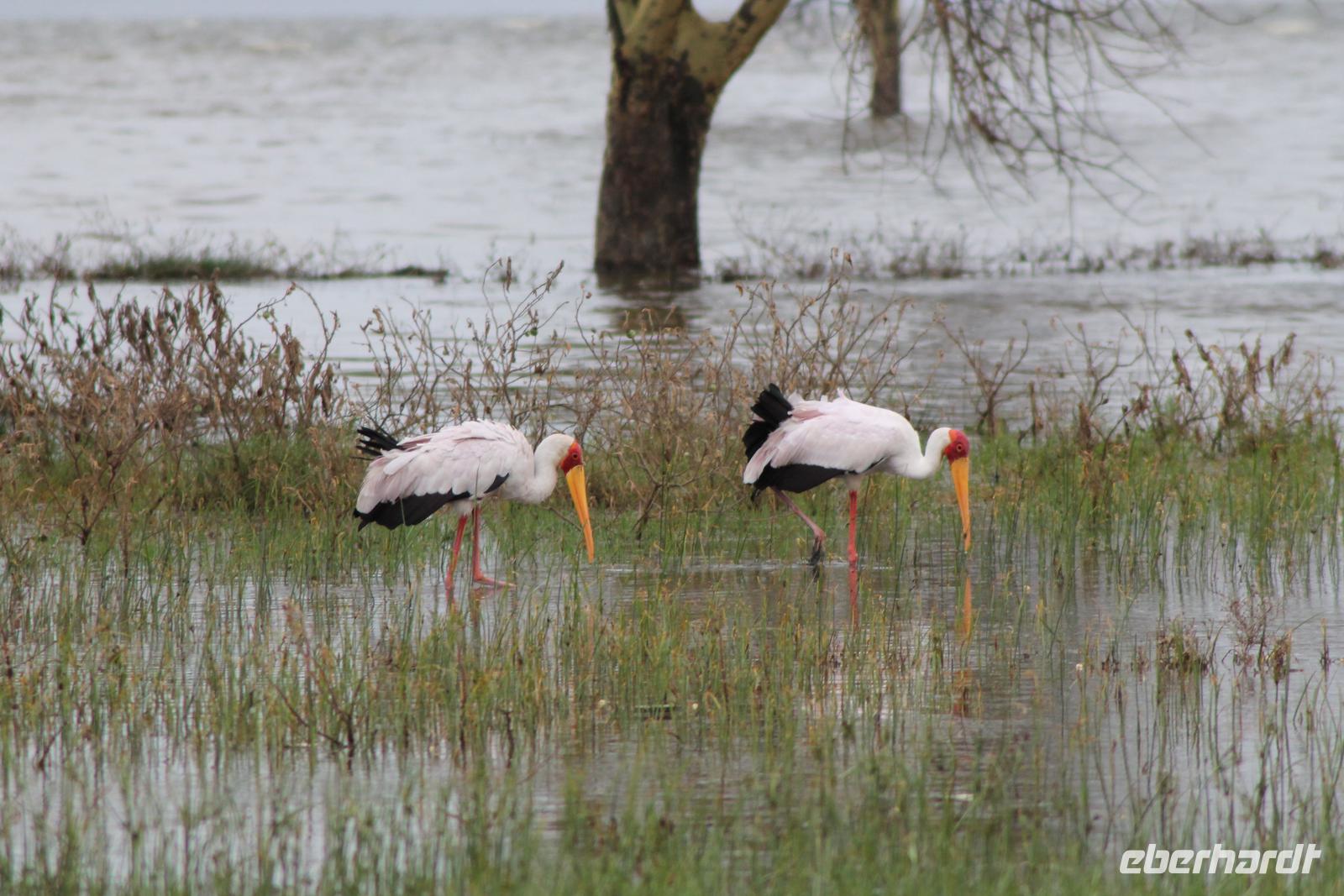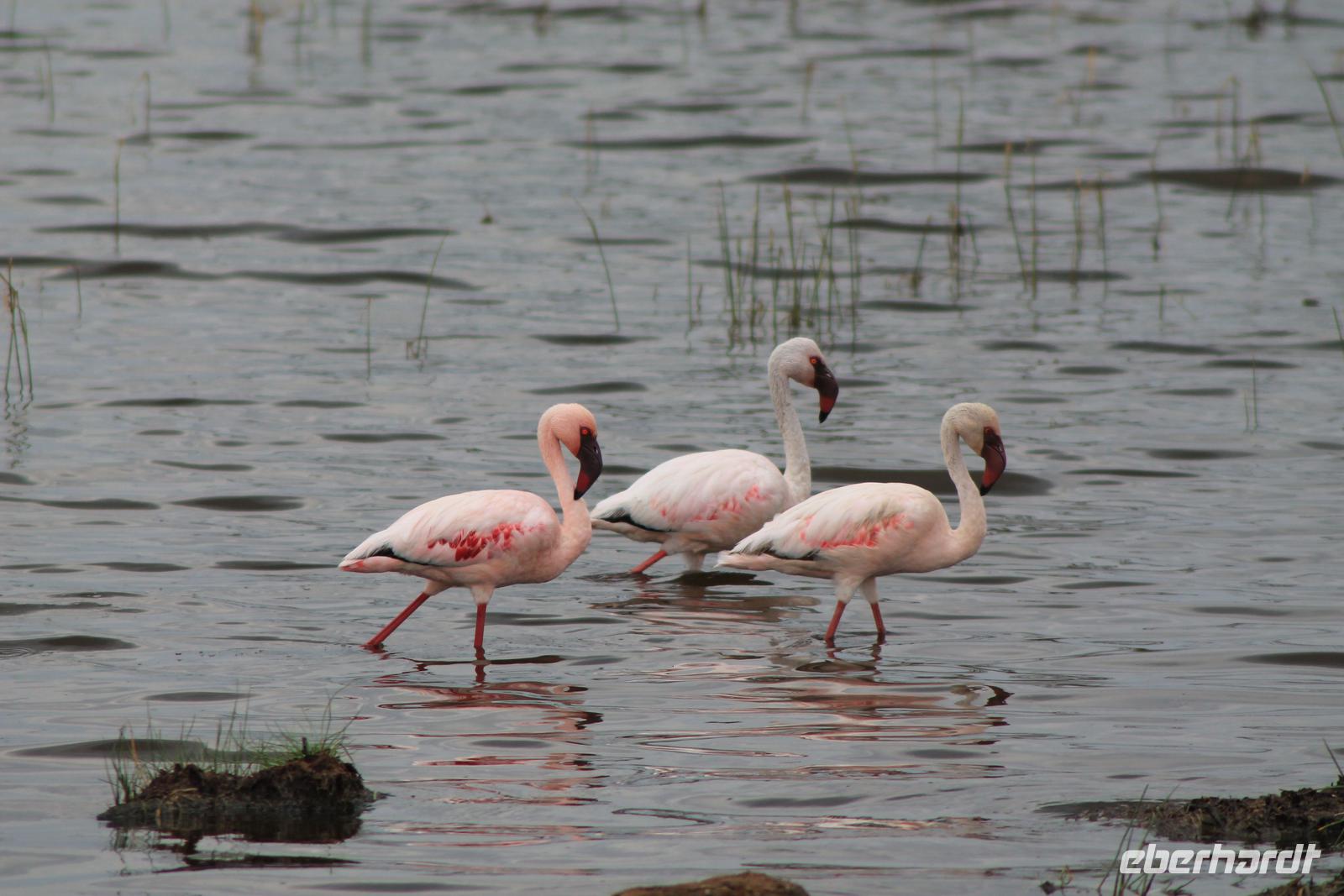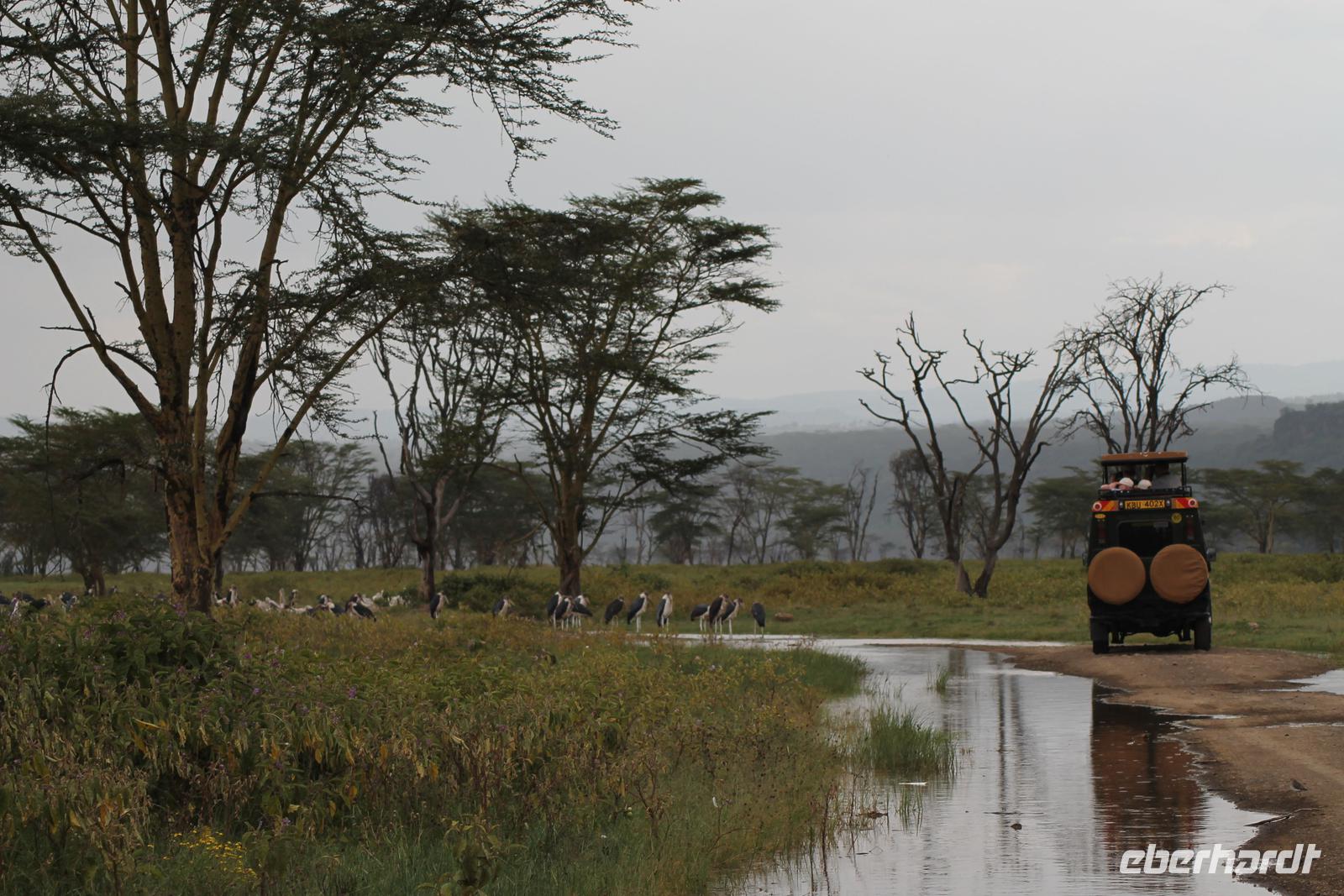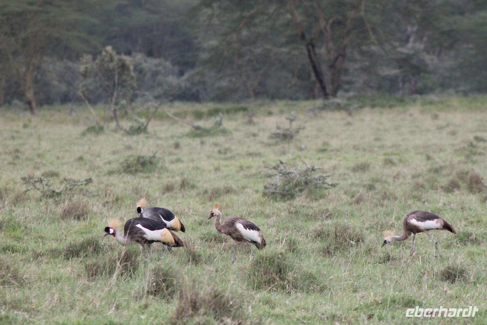 Ein letztes familiäres Frühstück am großen Tisch mit allen Leckereien um uns herum machte uns den Abschied von Petra und ihren lieben Angestellten noch ein bißchen schwerer, aber wir wollten ja noch mehr von Kenia sehen. Nach einem letzten Gruppenbild in ihrem schönen Garten und einer innigen Verabschiedung schlugen wir den Weg Richtung Nakuru See-Nationalpark ein, wo uns das schöne Flamingo-Hill-Camp erwartete. Da wir auf unserer Strecke den Äquator überquerten, wurde natürlich eine richtige Äquator-Taufe durchgeführt, mit einem Zertifikat als Erinnerung für zu Hause, und wir stießen mit einem schönen Viceroy auf dieses Erlebnis an. Die Desinfektion des Bauches ist ja auch immer sehr wichtig auf Reisen . Eine kurze Pause an den 81 Meter hohen Thomson Wasserfällen wurde auf der Strecke auch eingelegt. Pünktlich zum Mittagessen kamen wir in unserem Quartier an. Einige nutzten die Pause für eine Massage, die unseren „Kenia-Straßen-geplagten" Chauffeuren am Abend auch zu gute kommen sollte. Auch der Pool lud zum Entspannen ein. Auf unserer Fahrt am Nachmittag konnten wir vor allem die herrliche Vogelwelt bestaunen. Durch die Ausdehnung des Nakuru-Sees auf ein Vielfaches seiner ursprünglichen Größe sind die Riesenschwärme von Flamingos zwar nicht mehr so zahlreich vorhanden, aber dennoch hatten wir einiges zu bestaunen. Zebras, Impalas, Paviane, Zwergflamingos, gemeine Flamingos, Kormorane, Marabu- und Nimmersatt-Störche, Löffler, Pelikane, eine Leopardenschildkröte, Büffel mit Madenhackern und verschiedenen Reihern, Ibisse und vieles vieles mehr. Vom Aussichtspunkt konnte man von oben sehen, wo die ursprünglichen Grenzen des Sees vorher zu finden waren und wo nun Straßen und Wege im Wasser verschwunden sind. Das Abendessen war sehr lecker und die Bettschwere sollte auch bald eintreten, sodass wir uns bald in unsere Luxus-Zelte "verkrümelten".