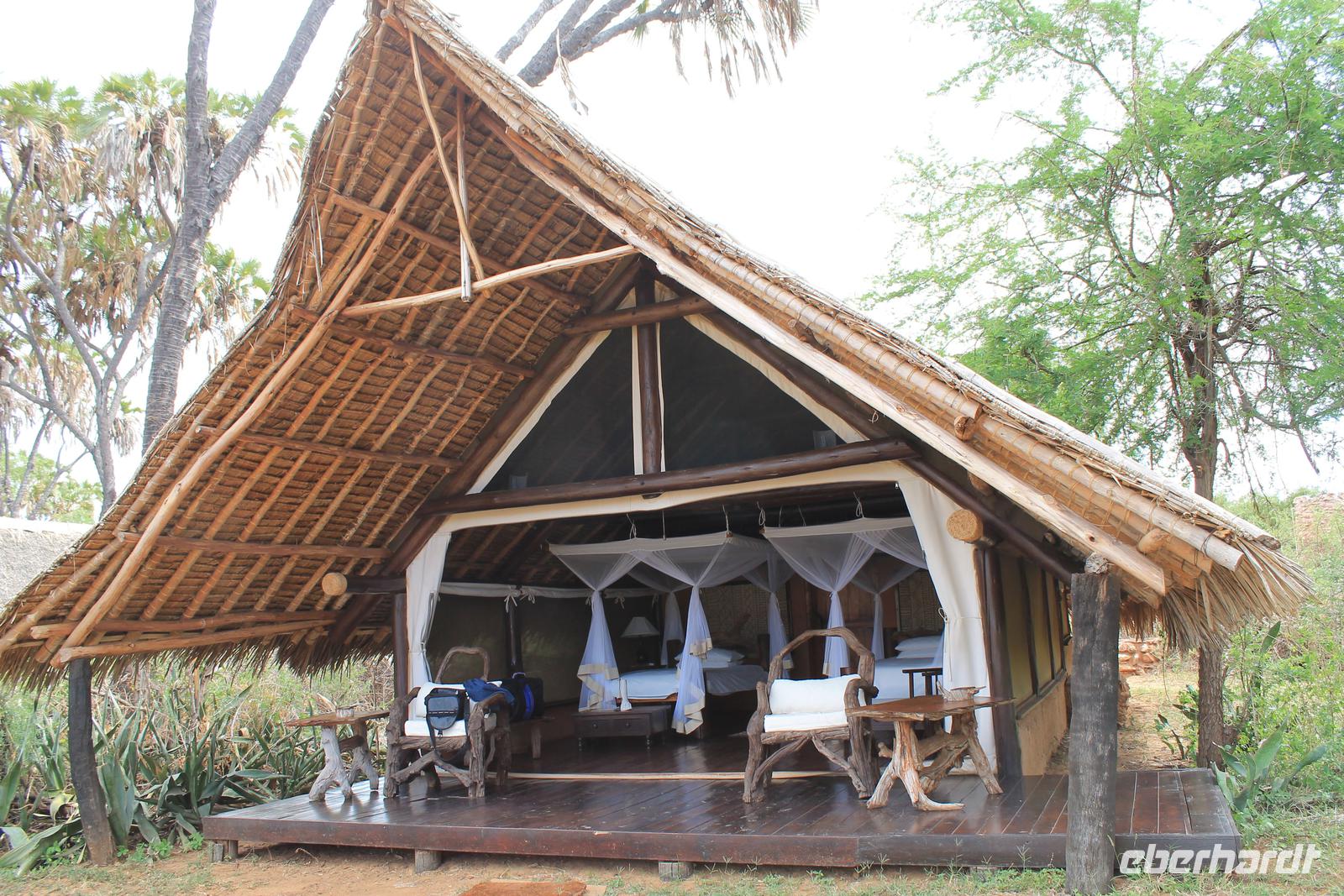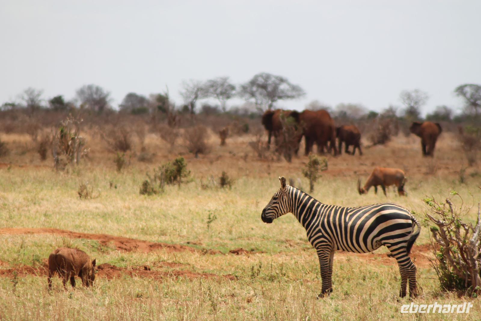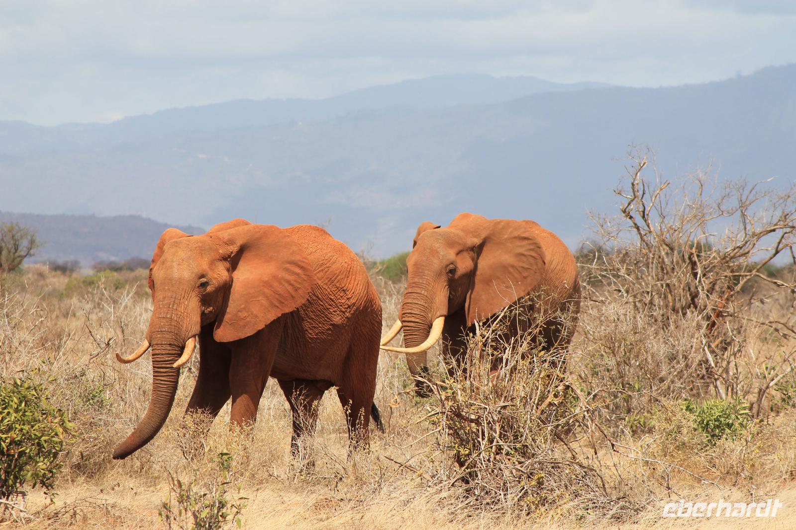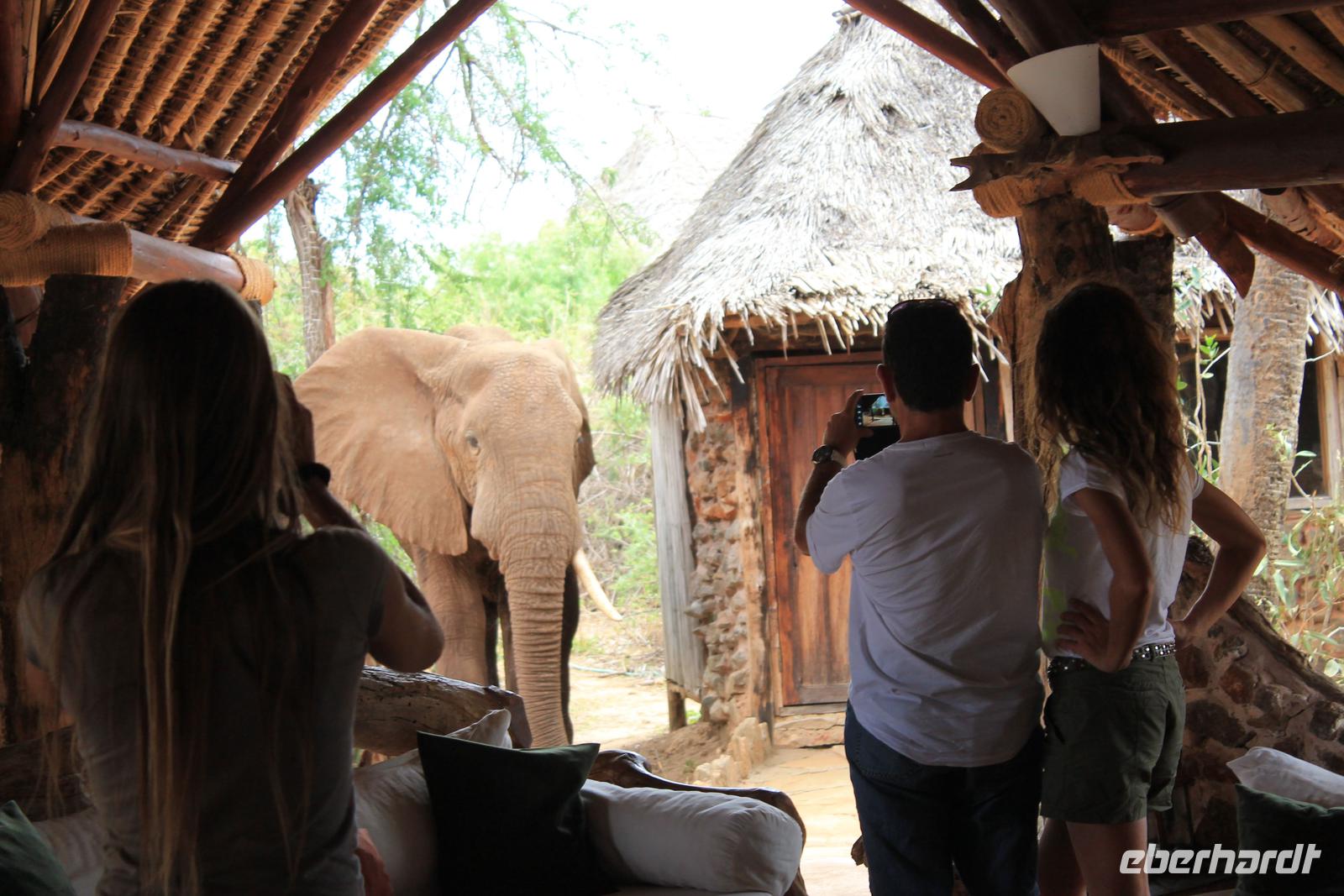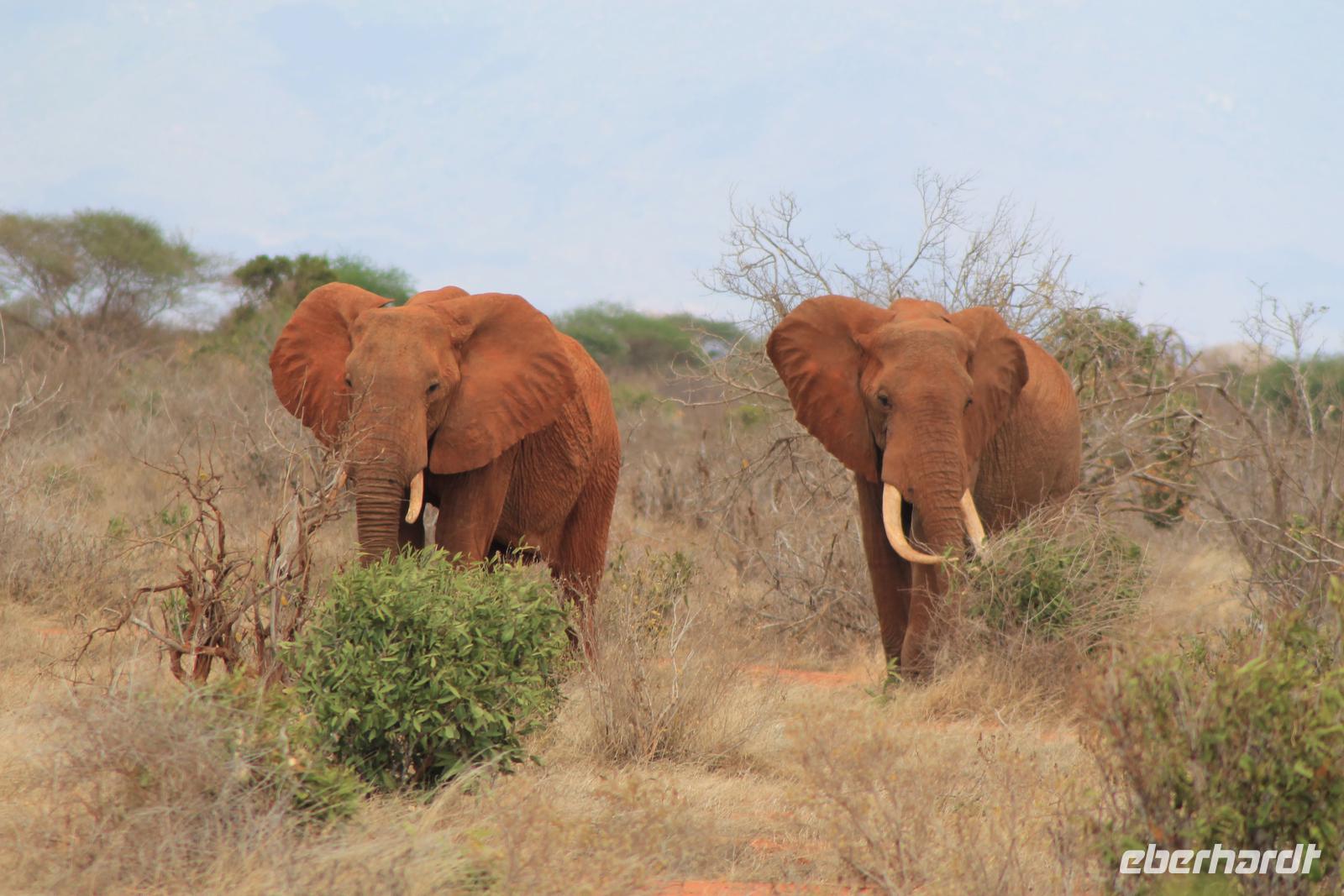 Nach dem Frühstück begaben wir uns Richtung Tsavo-Ost Nationalpark, der sich mit seiner riesigen Ausdehnung von den bisherigen Nationalparks auf unserer Route unterschied. Entlang der Chyulu-Berge, die mit ihren zahlreichen Quellen Wasserlieferant für Machakos und Mombasa sind, sowie mit Blick auf das 300 km lange und somit größte Plateau der Welt, das Yatta Plateau, erreichten wir den Nationalpark. Sofort stach uns die extreme Rotfärbung der Erde ins Auge, die durch Laterit verursacht wird. Auch die Baobab-Bäume, die Affenbrotbäume, hatten wir vorher auf unserer Reise noch nicht gesehen, da sie nur in Höhenlagen unter 1000 Meter vorkommen. Pünktlich zum Mittagessen erreichten wir die luxuriöse Galdessa Lodge. Mit nur 11 festen Zelten, die weitläufig verteilt sind, erfährt hier jeder ein besonderes Afrika-Erlebnis. Die größte Besonderheit ist dabei, dass das Camp nicht eingezäunt ist und jederzeit ein Elefant oder andere Tiere vor einem stehen können. Sylvia, die Managerin des Camps, warnte uns besonders vor dem „einzahnigen" Elefanten, aber ehrlich gesagt blieb uns allen kurzzeitig das Herz stehen, wenn einer der Dickhäuter am Zeltrand auftauchte. Was während der Mittagspause auch passierte. Dabei sind tolle Fotos und Videos entstanden. Auch schon vorab im Restaurant statteten uns die Vierbeiner einen Besuch ab - die ersten Male staunten alle nicht schlecht und zückten schnell den Fotoapparat, den nächsten Tag war dies schon in Fleisch und Blut über gegangen. Bei der Pirschfahrt an diesem Nachmittag sahen wir kurzzeitig einen Leoparden, der sich aber rasch wieder vor uns versteckte. Später konnte Jackson noch einen Artgenossen faul auf dem Baum liegend erspähen - viele Fotos wurden zum Beweis geschossen. Wir sahen Dik-Diks, kleine Kudus, Braunbauchflughühner, Rotschnabel-Tokos - wobei die Vögel an diesem Tag wenig Aufmerksamkeit erhalten sollten - die Schildkröte versteckte sich schnell vor uns, den Schlangenadler konnten wir von Weitem fotografieren und auch die berühmten roten Elefanten bekamen wir nach einigen Versuchen vor die Linse. Zurück im Camp war das warme Wasser für uns vorbereitet, sodass wir eine schöne Dusche nehmen konnten. Das Abendessen war gemächlich, aber sehr lecker. Und kurz nach halb elf wurde der "Saft" abgedreht, denn der Strom erfolgt größtenteils über eine Solaranlage, am Abend aber über einen Generator. Dann erlebte jeder von uns eine besondere Nacht, je nach Tierbesuch und Hörempfindlichkeit . Die Flusspferde und die Elefanten streiften an unseren Zelten vorbei, wobei die Flusspferde dazu noch grunzende Laute von sich geben, und ca. vier Uhr hörte man auch den Löwen in der Ferne brüllen. Afrika pur!