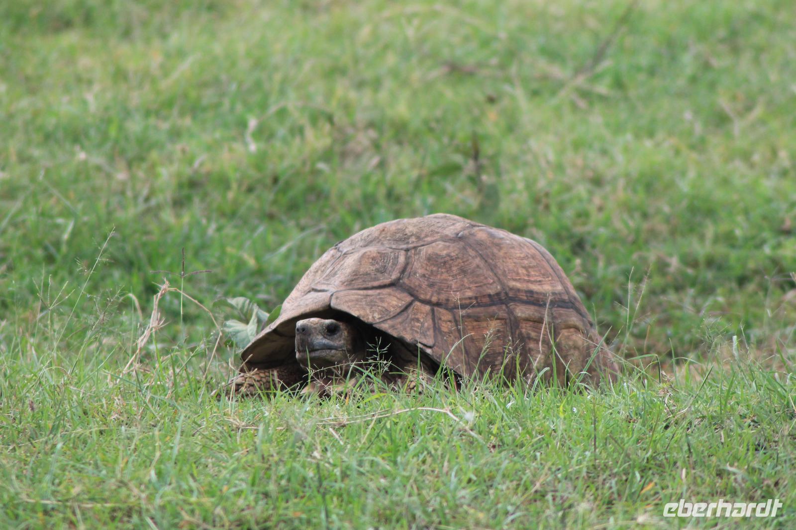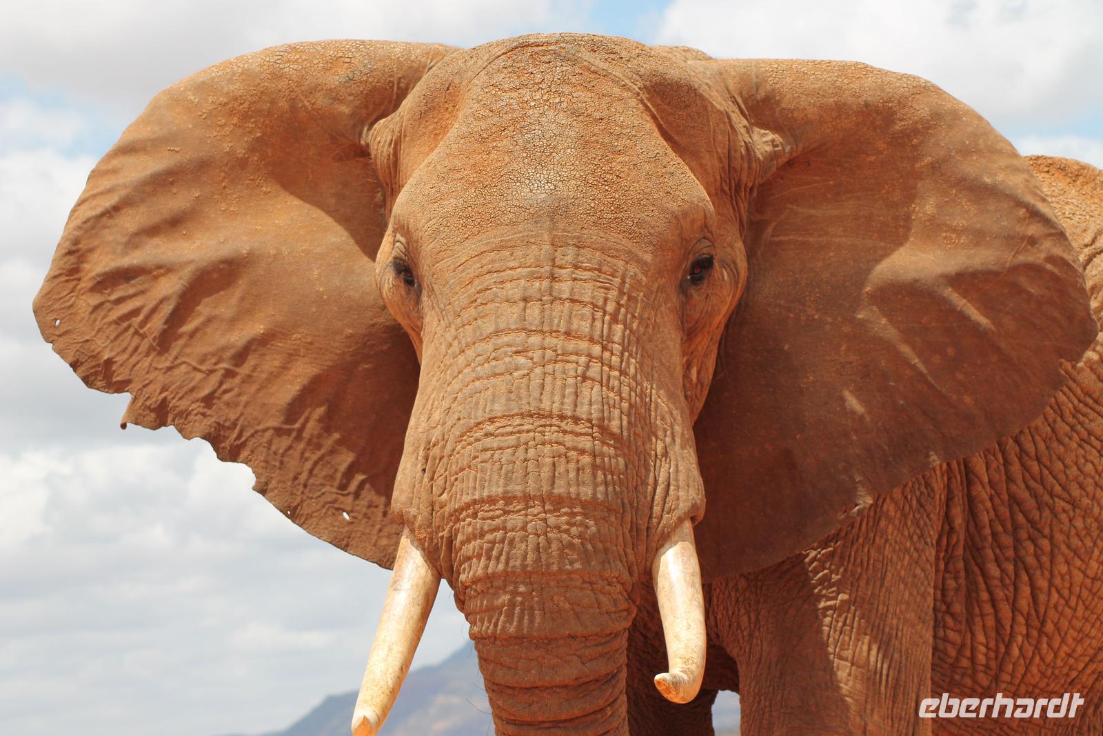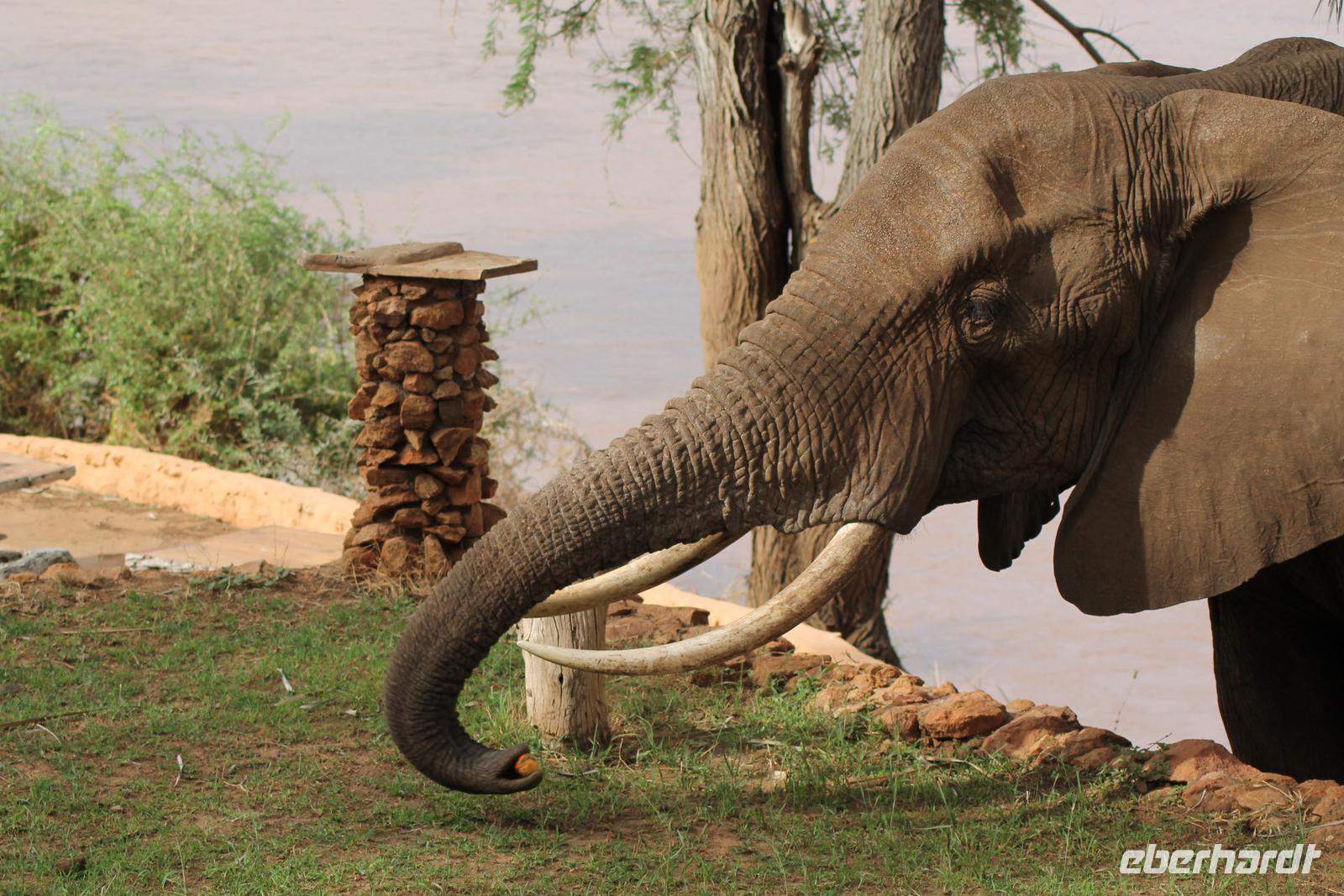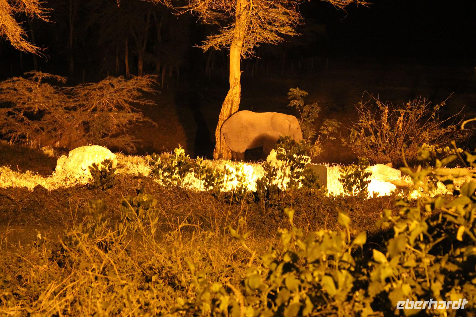 Nach dem Frühstück begaben wir uns Richtung Tsavo-Ost Nationalpark, der sich mit seiner riesigen Ausdehnung von den bisherigen Nationalparks auf unserer Route unterschied. Entlang der Chyulu-Berge, die mit ihren zahlreichen Quellen Wasserlieferant für Machakos und Mombasa sind, sowie mit Blick auf das 300 km lange und somit größte Plateau der Welt, das Yatta Plateau, erreichten wir den Nationalpark. Sofort stach uns die extreme Rotfärbung der Erde ins Auge, die durch Laterit verursacht wird. Auch die Baobab-Bäume, die Affenbrotbäume, hatten wir vorher auf unserer Reise noch nicht gesehen, da sie nur in Höhenlagen unter 1000 Meter vorkommen. Pünktlich zum Mittagessen erreichten wir die luxuriöse Galdessa Lodge. Mit nur 11 festen Zelten, die weitläufig verteilt sind, erfährt hier jeder ein besonderes Afrika-Erlebnis. Die größte Besonderheit ist dabei, dass das Camp nicht eingezäunt ist und jederzeit ein Elefant oder andere Tiere vor einem stehen können. Sylvia, die Managerin des Camps, warnte uns besonders vor dem „einzahnigen" Elefanten, aber ehrlich gesagt blieb uns allen kurzzeitig das Herz stehen, wenn einer der Dickhäuter am Zeltrand auftauchte. Was während der Mittagspause auch passierte. Dabei sind tolle Fotos und Videos entstanden. Auch schon vorab im Restaurant statteten uns die Vierbeiner einen Besuch ab - die ersten Male staunten alle nicht schlecht und zückten schnell den Fotoapparat, den nächsten Tag war dies schon in Fleisch und Blut über gegangen. Bei der Pirschfahrt an diesem Nachmittag sahen wir kurzzeitig einen Leoparden, der sich aber rasch wieder vor uns versteckte. Später konnte Jackson noch einen Artgenossen faul auf dem Baum liegend erspähen - viele Fotos wurden zum Beweis geschossen. Wir sahen Dik-Diks, kleine Kudus, Braunbauchflughühner, Rotschnabel-Tokos - wobei die Vögel an diesem Tag wenig Aufmerksamkeit erhalten sollten - die Schildkröte versteckte sich schnell vor uns, den Schlangenadler konnten wir von Weitem fotografieren und auch die berühmten roten Elefanten bekamen wir nach einigen Versuchen vor die Linse. Zurück im Camp war das warme Wasser für uns vorbereitet, sodass wir eine schöne Dusche nehmen konnten. Das Abendessen war gemächlich, aber sehr lecker. Und kurz nach halb elf wurde der "Saft" abgedreht, denn der Strom erfolgt größtenteils über eine Solaranlage, am Abend aber über einen Generator. Dann erlebte jeder von uns eine besondere Nacht, je nach Tierbesuch und Hörempfindlichkeit . Die Flusspferde und die Elefanten streiften an unseren Zelten vorbei, wobei die Flusspferde dazu noch grunzende Laute von sich geben, und ca. vier Uhr hörte man auch den Löwen in der Ferne brüllen. Afrika pur!