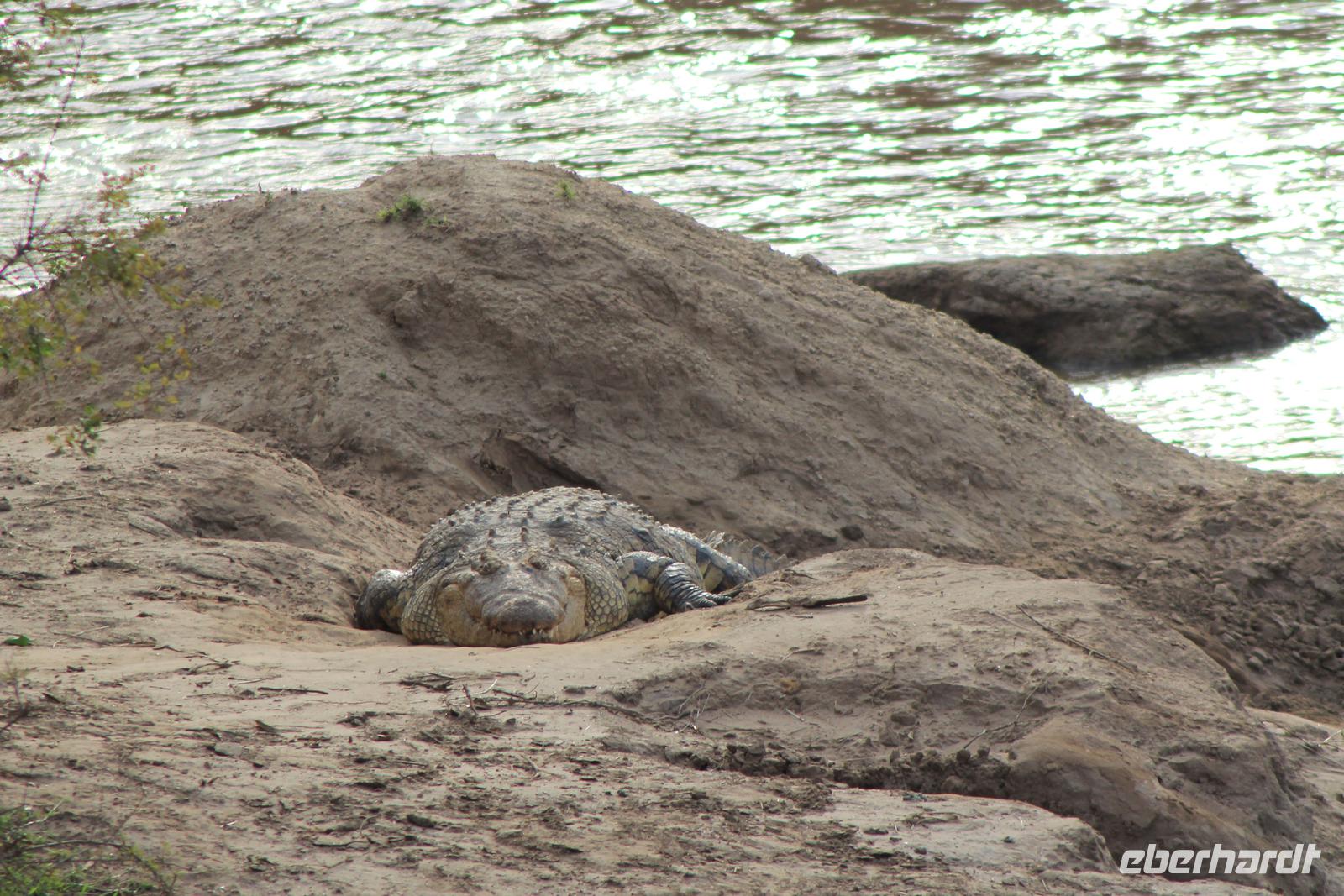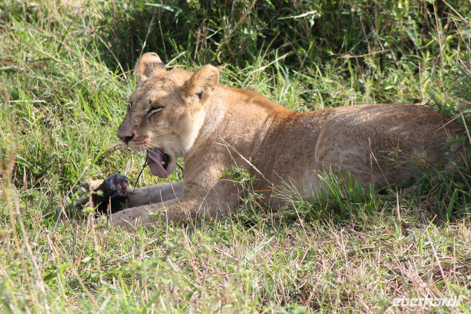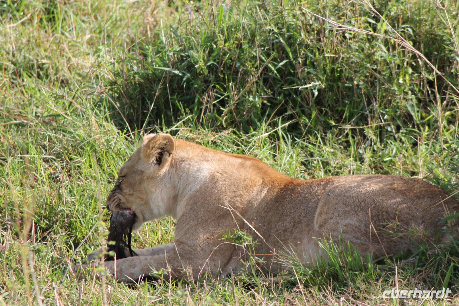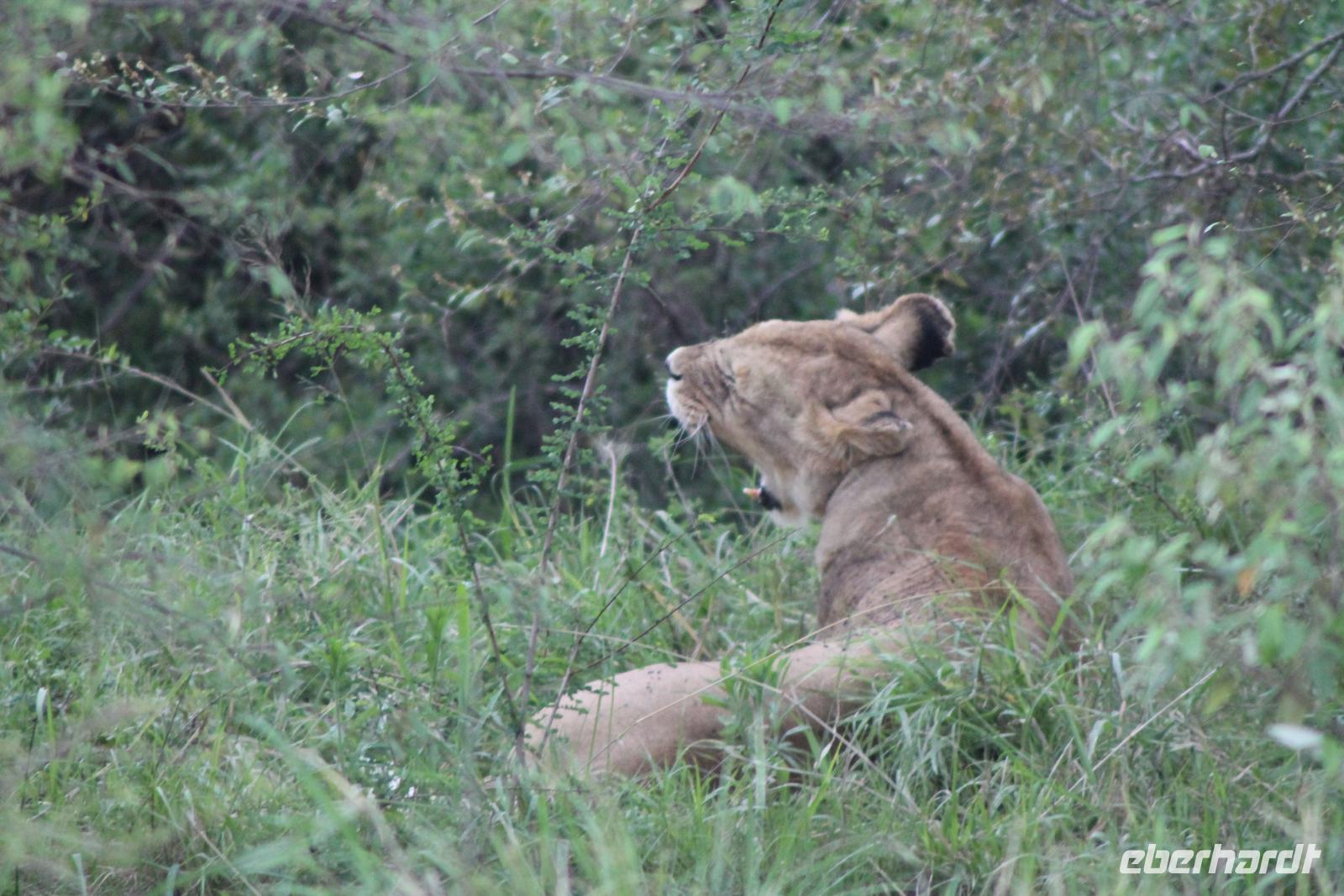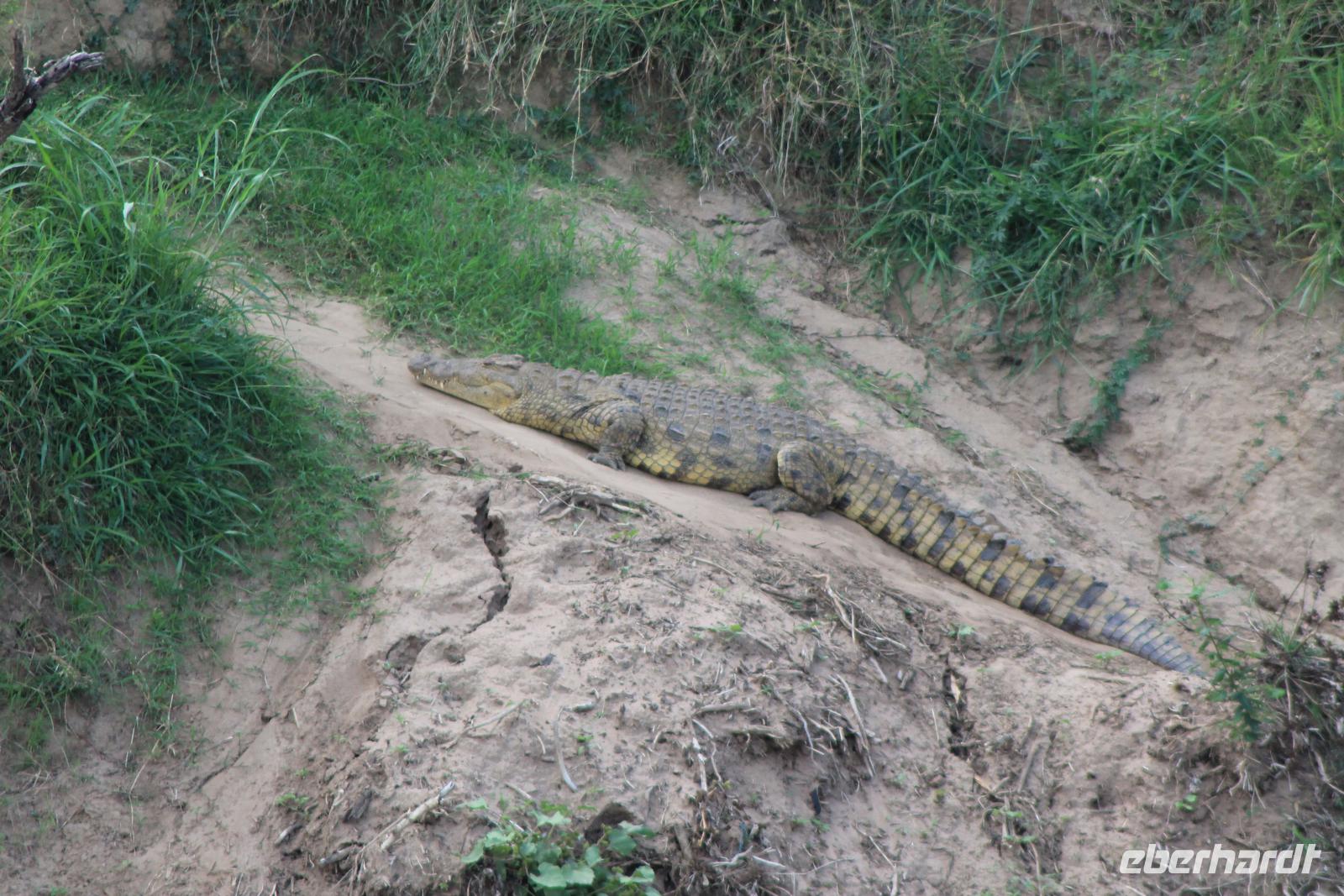 Heute ging es wieder zeitig auf Pirsch, sodass wir nur einen Kaffee/Tee und ein paar Kekse zu uns nahmen. Um 6.30 Uhr ging es auf zur Pirsch: wir sahen viele Tiere wie Topis mit ihren Jungen, Schakale mit ihren Jungen, Warzenschweine mit Nachwuchs, Geier, eine Tüpfelhyäne, einen Adler, einen Frankolin, Wasserböcke, Paviane mit Nachwuchs und vor allem als krönenden Abschluss eine Löwenfamilie, die ein Gnu gerissen hatte und nun faul, satt und zufrieden im Gras lag. Es waren vor allem junge Weibchen, ein junges Männchen von ca. 2 Jahren und ein ganz Junges von ca. 6 Monaten. Bei solch einem Schauspiel störte uns auch der Verwesungsgeruch des Gnus nicht, das wahrscheinlich an diesem Morgen gerissen wurde. Als ein Geier sich an den Überresten zu schaffen machte, ging schnell eine der Löwinnen dazwischen und verteidigte ihren Fang. Auch wenn sie selbst nicht noch einmal etwas vernaschen wollte. Auf dem Weg zum Camp sahen wir dann noch Flusspferde und Krokodile. Ein „hängendes Gnu" war auch dabei - Leoparden verzehren ihre Beute auf dem Baum - sie können Beute mit einem Gewicht bis zu ihrem Eigengewicht auf den Baum schleppen - starke Tiere. Zurück im Camp genossen wir unser Frühstück und im Anschluss unternahmen wir eine geführte Wanderung von ca. 1 Stunde mit einem Ranger des Camps. Er zeigte uns anhand des Kots und der Abdrücke im Boden, welche Tiere hier ihre Spuren hinterlassen hatten. Auch die Pflanzen wurden erläutert und zum Schluss konnte man Speer werfen üben. Beim Mittagessen gab es leckeren Red Snapper-Fisch, gebratenen Reis, gemischtes Gemüse, Linsen, gebratenen Kohl und zum Nachtisch Obst. Nach einer kleinen Mittagspause trafen wir uns 15.30 Uhr wieder zur Pirsch. Neben vielen anderen Tieren sahen wir wieder Löwen, einen Geparden und einen Leoparden. Ein solches Glück wird nur wenigen Safari-Teilnehmern zuteil!