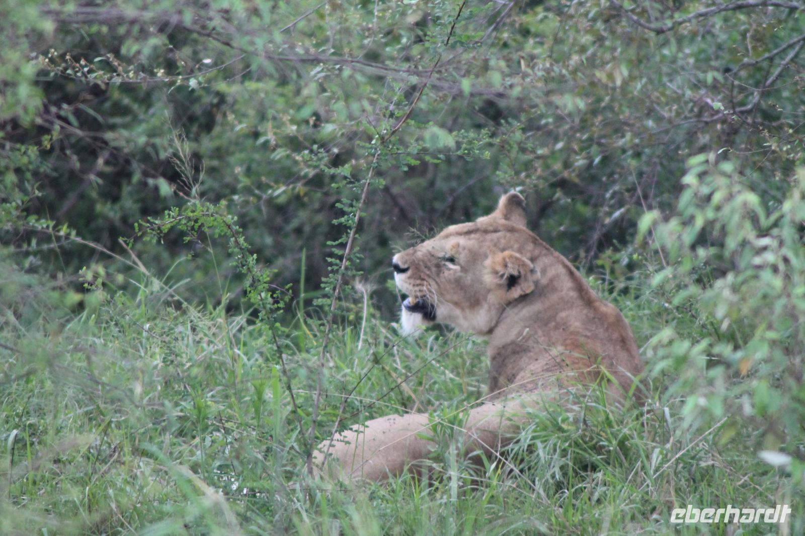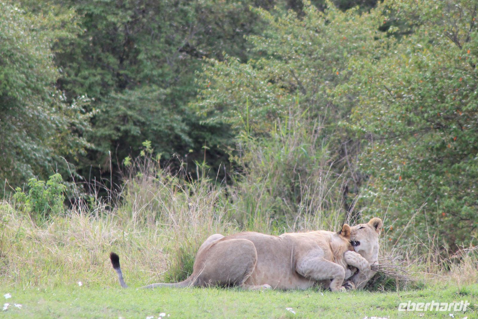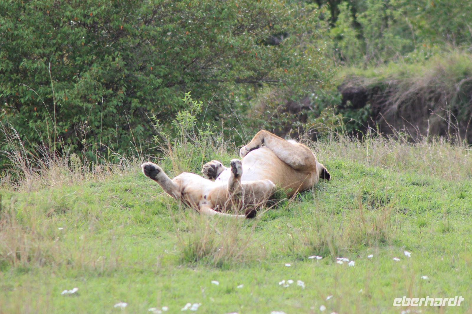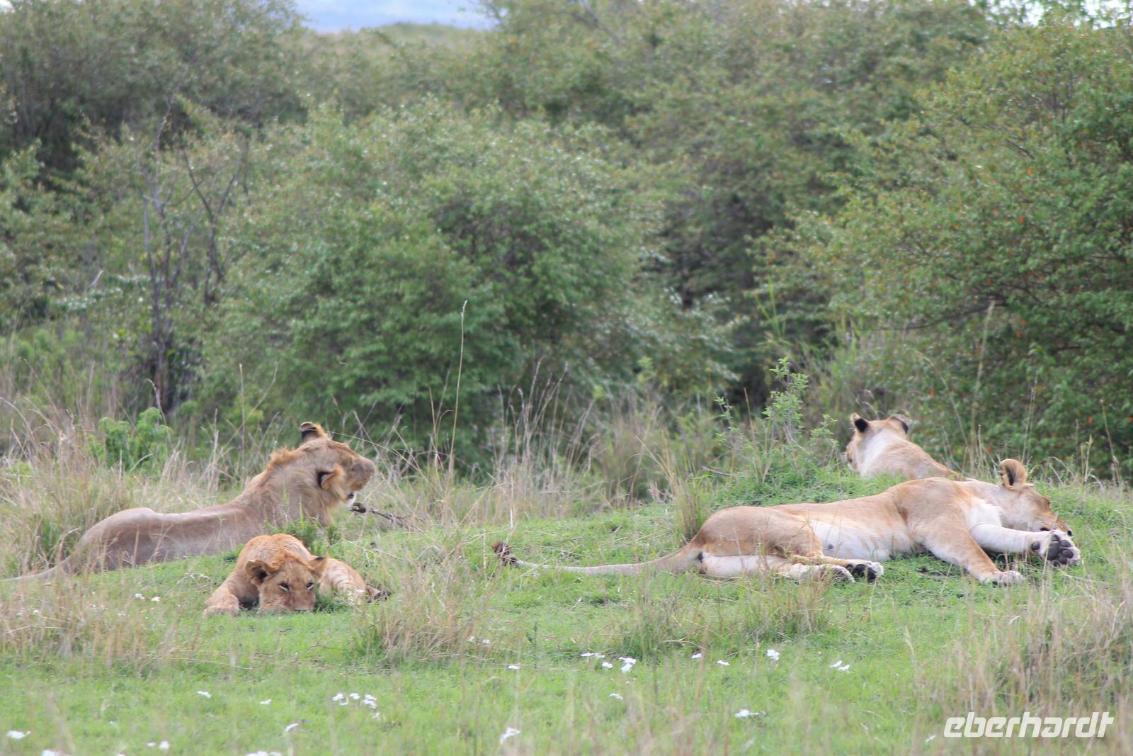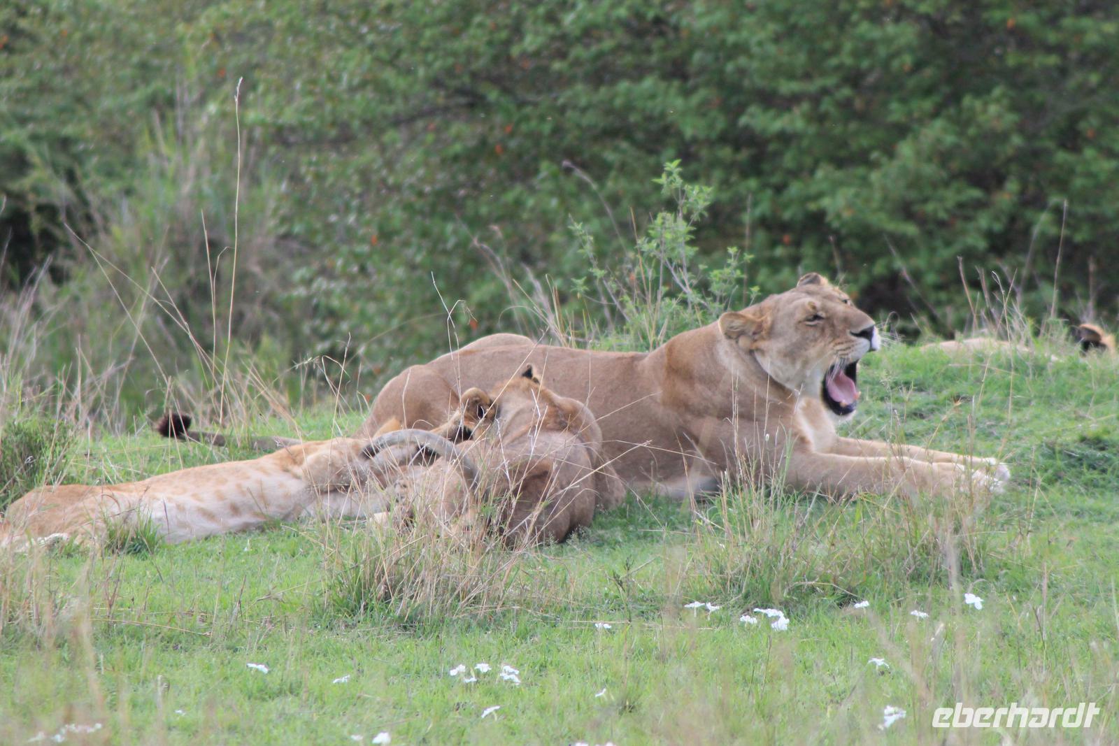Heute ging es wieder zeitig auf Pirsch, sodass wir nur einen Kaffee/Tee und ein paar Kekse zu uns nahmen. Um 6.30 Uhr ging es auf zur Pirsch: wir sahen viele Tiere wie Topis mit ihren Jungen, Schakale mit ihren Jungen, Warzenschweine mit Nachwuchs, Geier, eine Tüpfelhyäne, einen Adler, einen Frankolin, Wasserböcke, Paviane mit Nachwuchs und vor allem als krönenden Abschluss eine Löwenfamilie, die ein Gnu gerissen hatte und nun faul, satt und zufrieden im Gras lag. Es waren vor allem junge Weibchen, ein junges Männchen von ca. 2 Jahren und ein ganz Junges von ca. 6 Monaten. Bei solch einem Schauspiel störte uns auch der Verwesungsgeruch des Gnus nicht, das wahrscheinlich an diesem Morgen gerissen wurde. Als ein Geier sich an den Überresten zu schaffen machte, ging schnell eine der Löwinnen dazwischen und verteidigte ihren Fang. Auch wenn sie selbst nicht noch einmal etwas vernaschen wollte. Auf dem Weg zum Camp sahen wir dann noch Flusspferde und Krokodile. Ein „hängendes Gnu" war auch dabei - Leoparden verzehren ihre Beute auf dem Baum - sie können Beute mit einem Gewicht bis zu ihrem Eigengewicht auf den Baum schleppen - starke Tiere. Zurück im Camp genossen wir unser Frühstück und im Anschluss unternahmen wir eine geführte Wanderung von ca. 1 Stunde mit einem Ranger des Camps. Er zeigte uns anhand des Kots und der Abdrücke im Boden, welche Tiere hier ihre Spuren hinterlassen hatten. Auch die Pflanzen wurden erläutert und zum Schluss konnte man Speer werfen üben. Beim Mittagessen gab es leckeren Red Snapper-Fisch, gebratenen Reis, gemischtes Gemüse, Linsen, gebratenen Kohl und zum Nachtisch Obst. Nach einer kleinen Mittagspause trafen wir uns 15.30 Uhr wieder zur Pirsch. Neben vielen anderen Tieren sahen wir wieder Löwen, einen Geparden und einen Leoparden. Ein solches Glück wird nur wenigen Safari-Teilnehmern zuteil!
