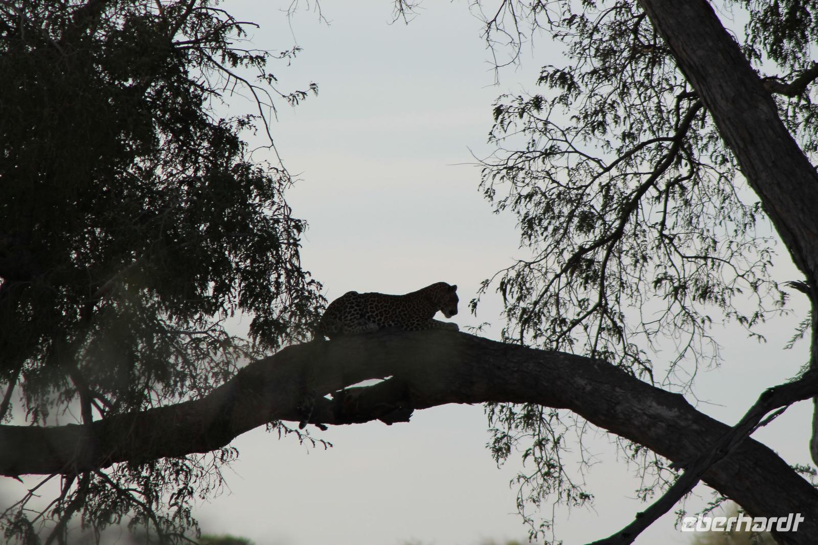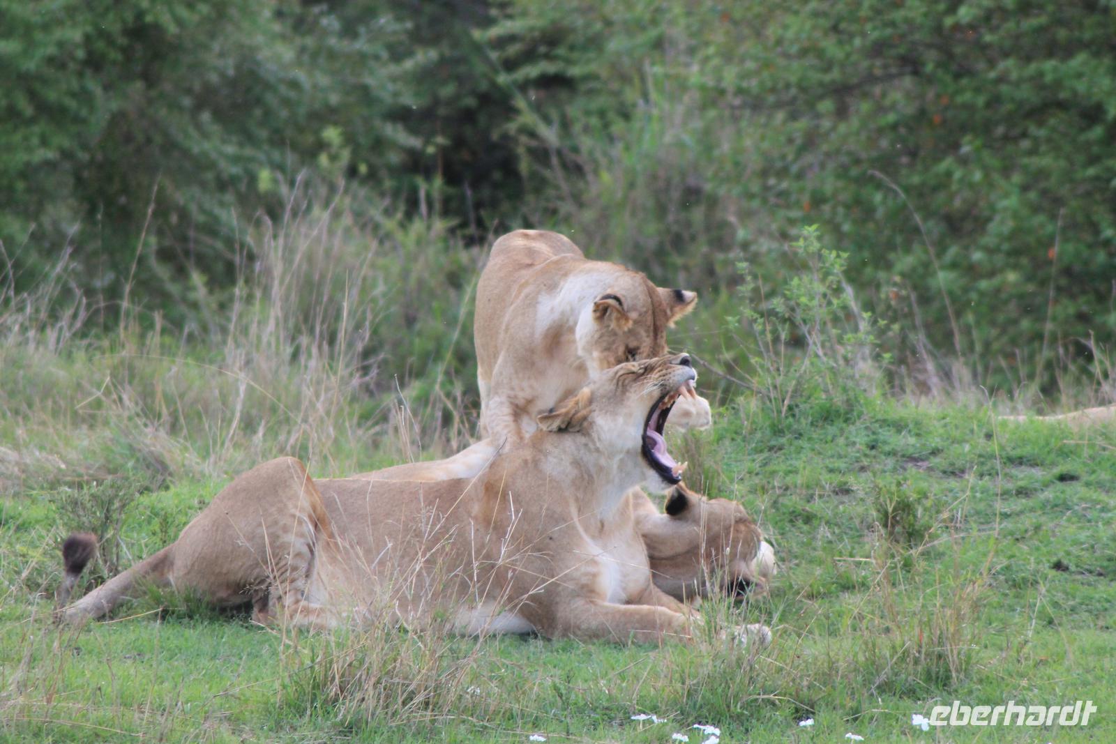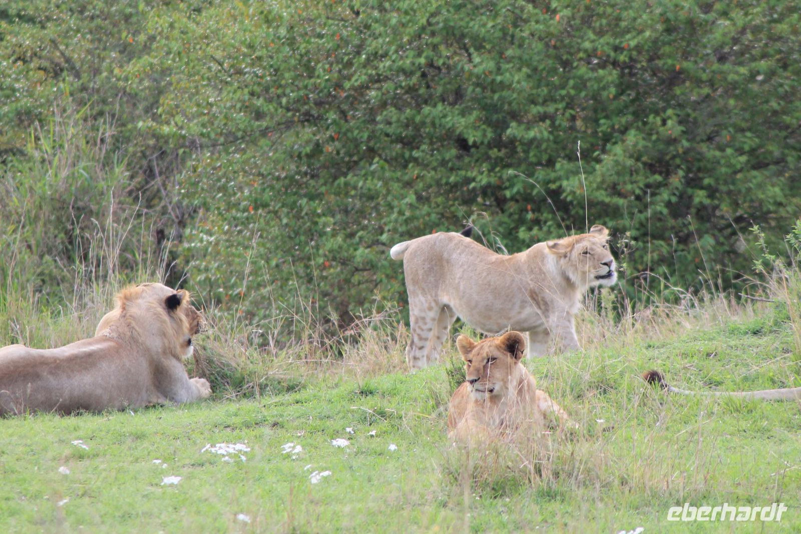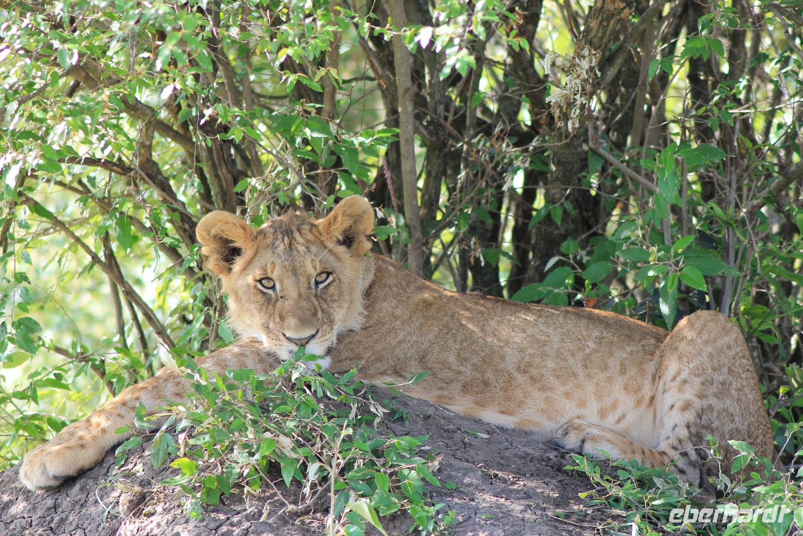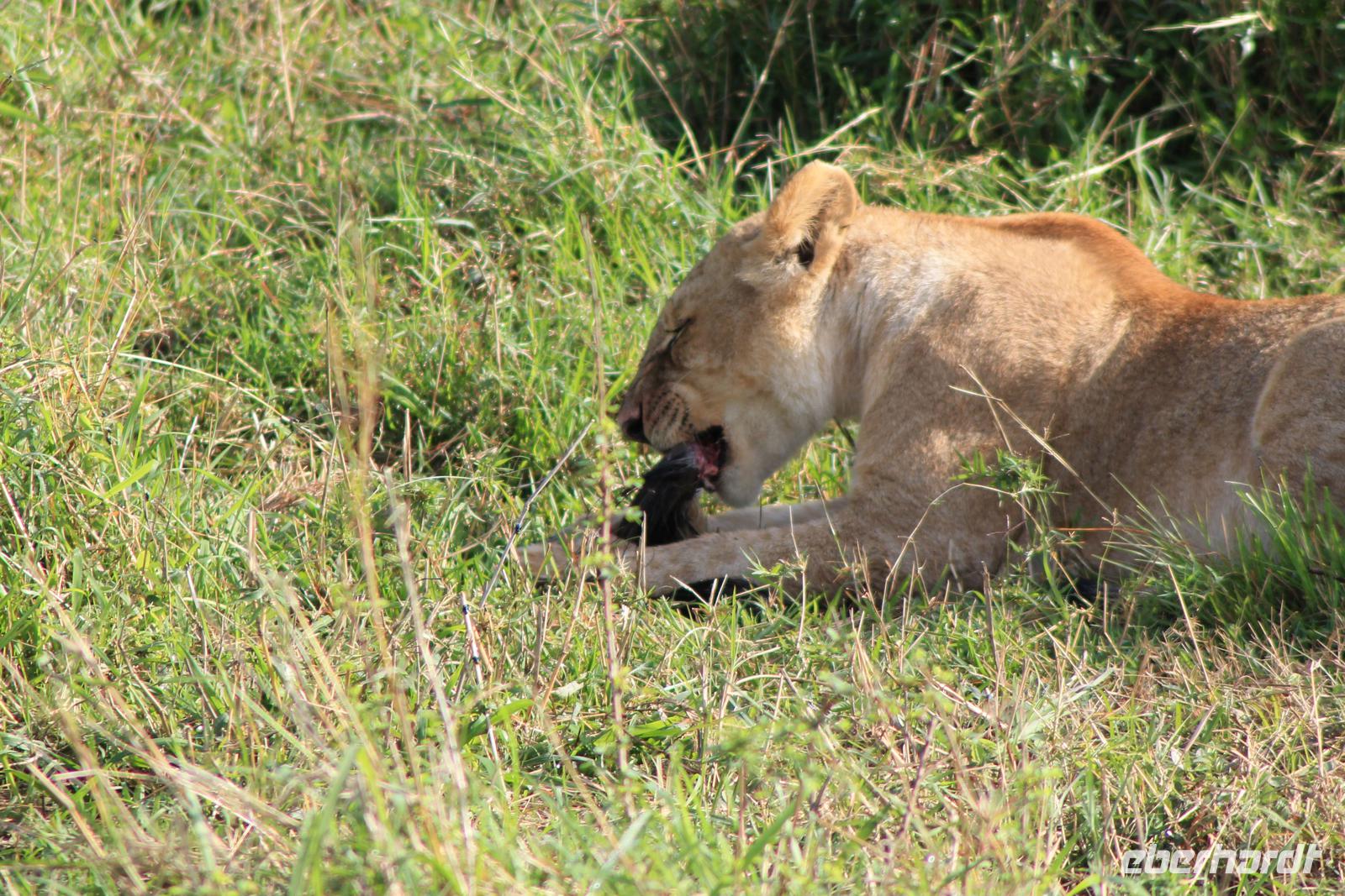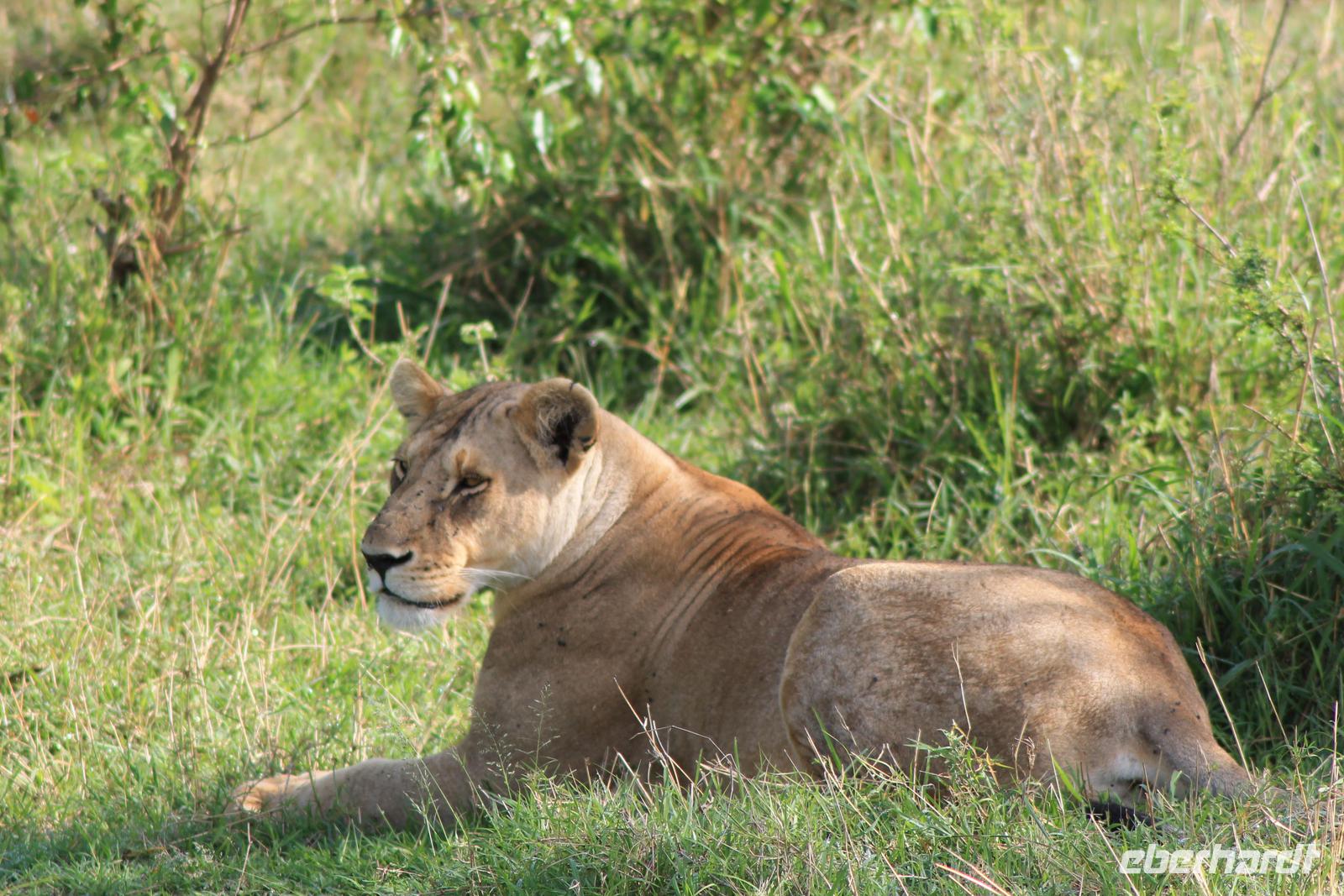 Heute ging es wieder zeitig auf Pirsch, sodass wir nur einen Kaffee/Tee und ein paar Kekse zu uns nahmen. Um 6.30 Uhr ging es auf zur Pirsch: wir sahen viele Tiere wie Topis mit ihren Jungen, Schakale mit ihren Jungen, Warzenschweine mit Nachwuchs, Geier, eine Tüpfelhyäne, einen Adler, einen Frankolin, Wasserböcke, Paviane mit Nachwuchs und vor allem als krönenden Abschluss eine Löwenfamilie, die ein Gnu gerissen hatte und nun faul, satt und zufrieden im Gras lag. Es waren vor allem junge Weibchen, ein junges Männchen von ca. 2 Jahren und ein ganz Junges von ca. 6 Monaten. Bei solch einem Schauspiel störte uns auch der Verwesungsgeruch des Gnus nicht, das wahrscheinlich an diesem Morgen gerissen wurde. Als ein Geier sich an den Überresten zu schaffen machte, ging schnell eine der Löwinnen dazwischen und verteidigte ihren Fang. Auch wenn sie selbst nicht noch einmal etwas vernaschen wollte. Auf dem Weg zum Camp sahen wir dann noch Flusspferde und Krokodile. Ein „hängendes Gnu" war auch dabei - Leoparden verzehren ihre Beute auf dem Baum - sie können Beute mit einem Gewicht bis zu ihrem Eigengewicht auf den Baum schleppen - starke Tiere. Zurück im Camp genossen wir unser Frühstück und im Anschluss unternahmen wir eine geführte Wanderung von ca. 1 Stunde mit einem Ranger des Camps. Er zeigte uns anhand des Kots und der Abdrücke im Boden, welche Tiere hier ihre Spuren hinterlassen hatten. Auch die Pflanzen wurden erläutert und zum Schluss konnte man Speer werfen üben. Beim Mittagessen gab es leckeren Red Snapper-Fisch, gebratenen Reis, gemischtes Gemüse, Linsen, gebratenen Kohl und zum Nachtisch Obst. Nach einer kleinen Mittagspause trafen wir uns 15.30 Uhr wieder zur Pirsch. Neben vielen anderen Tieren sahen wir wieder Löwen, einen Geparden und einen Leoparden. Ein solches Glück wird nur wenigen Safari-Teilnehmern zuteil!