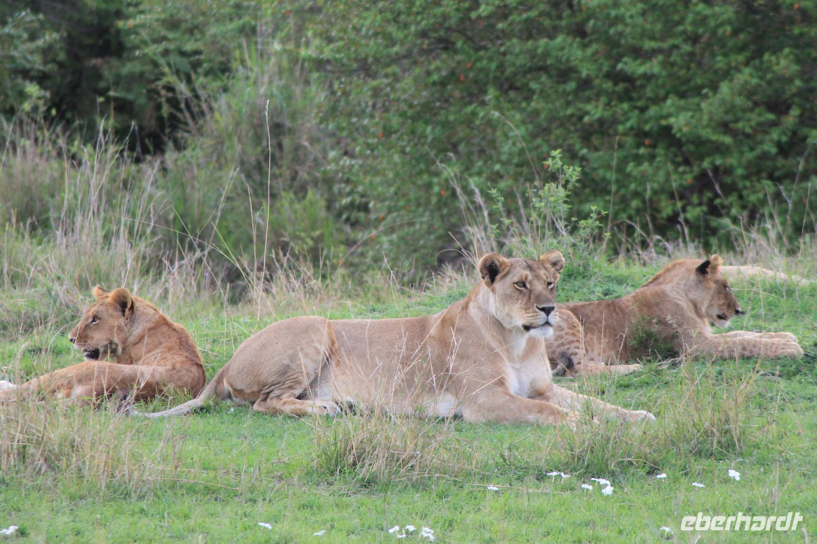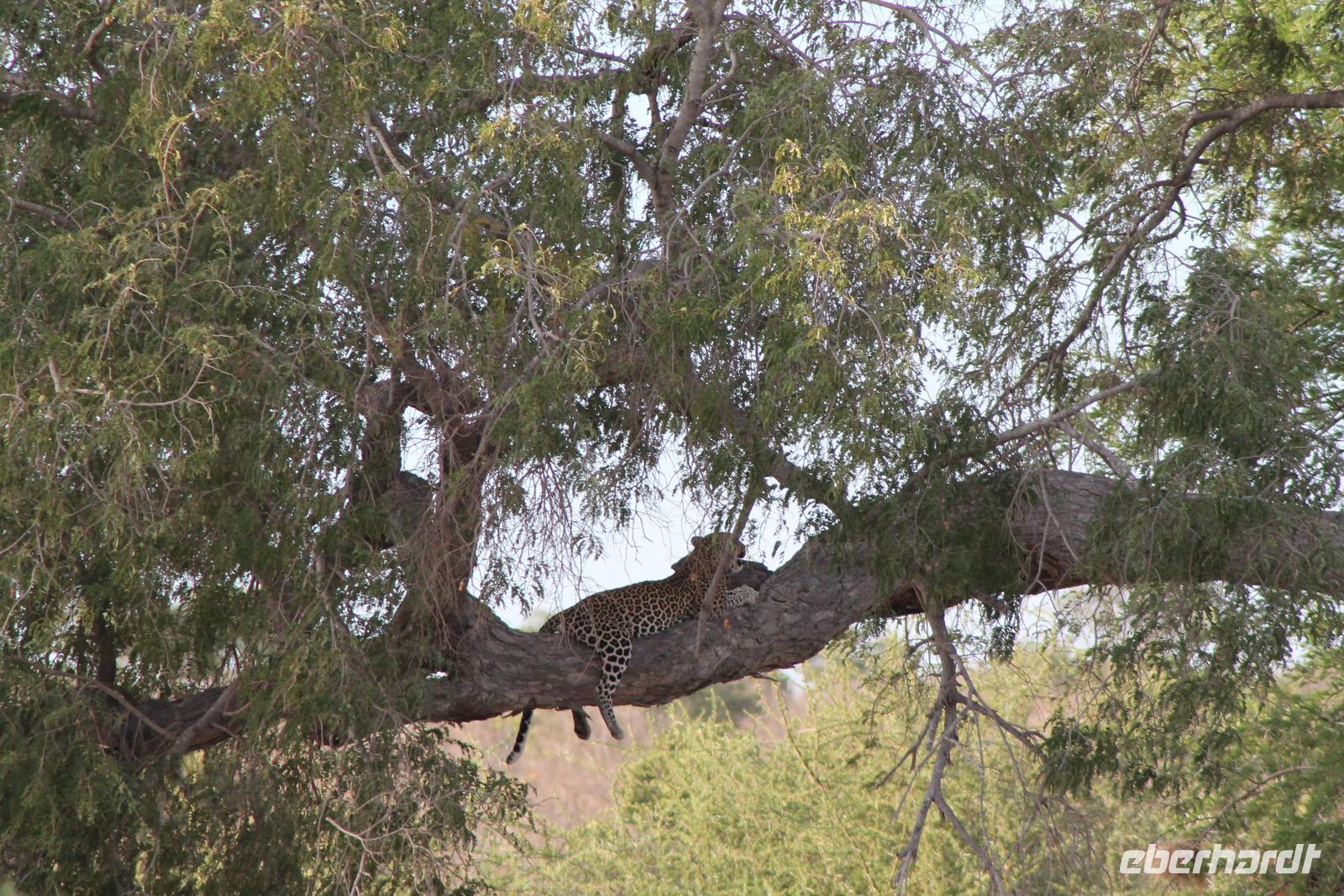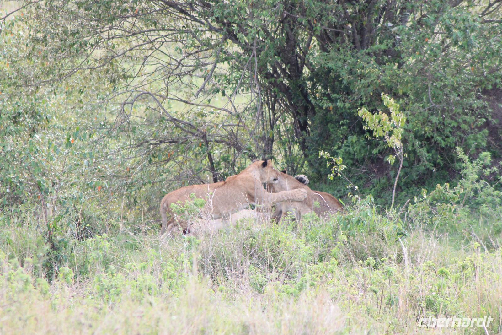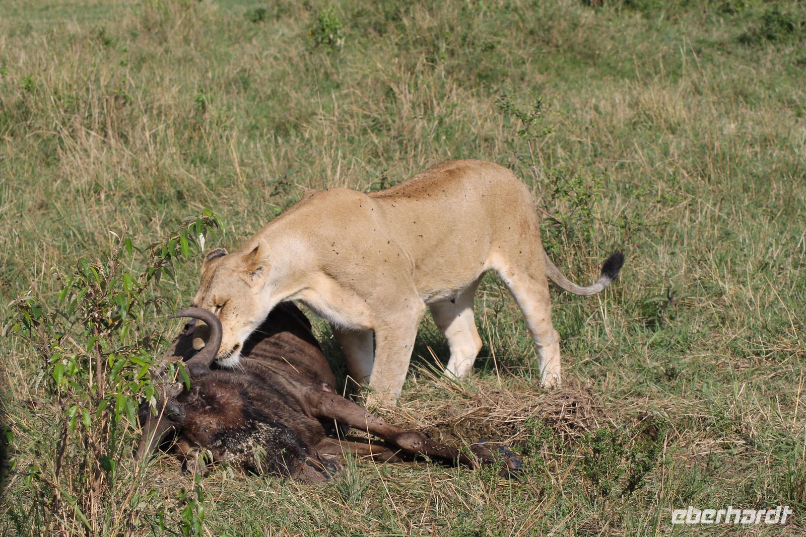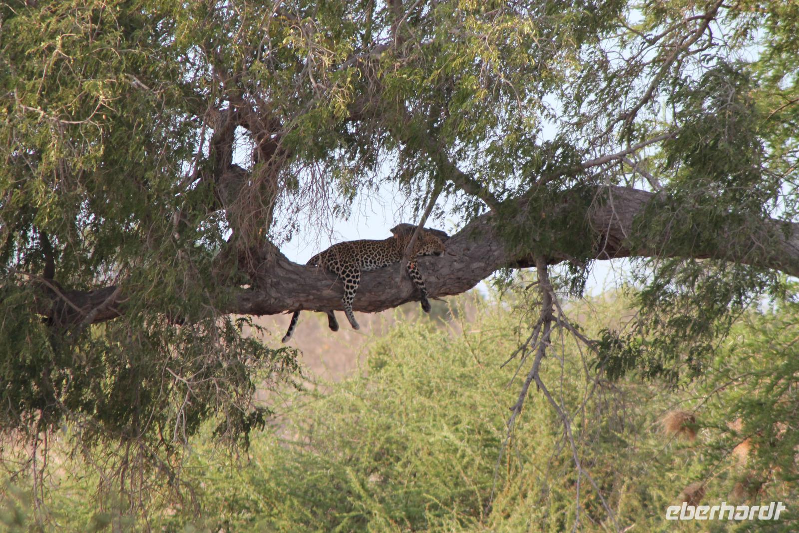 Heute ging es wieder zeitig auf Pirsch, sodass wir nur einen Kaffee/Tee und ein paar Kekse zu uns nahmen. Um 6.30 Uhr ging es auf zur Pirsch: wir sahen viele Tiere wie Topis mit ihren Jungen, Schakale mit ihren Jungen, Warzenschweine mit Nachwuchs, Geier, eine Tüpfelhyäne, einen Adler, einen Frankolin, Wasserböcke, Paviane mit Nachwuchs und vor allem als krönenden Abschluss eine Löwenfamilie, die ein Gnu gerissen hatte und nun faul, satt und zufrieden im Gras lag. Es waren vor allem junge Weibchen, ein junges Männchen von ca. 2 Jahren und ein ganz Junges von ca. 6 Monaten. Bei solch einem Schauspiel störte uns auch der Verwesungsgeruch des Gnus nicht, das wahrscheinlich an diesem Morgen gerissen wurde. Als ein Geier sich an den Überresten zu schaffen machte, ging schnell eine der Löwinnen dazwischen und verteidigte ihren Fang. Auch wenn sie selbst nicht noch einmal etwas vernaschen wollte. Auf dem Weg zum Camp sahen wir dann noch Flusspferde und Krokodile. Ein „hängendes Gnu" war auch dabei - Leoparden verzehren ihre Beute auf dem Baum - sie können Beute mit einem Gewicht bis zu ihrem Eigengewicht auf den Baum schleppen - starke Tiere. Zurück im Camp genossen wir unser Frühstück und im Anschluss unternahmen wir eine geführte Wanderung von ca. 1 Stunde mit einem Ranger des Camps. Er zeigte uns anhand des Kots und der Abdrücke im Boden, welche Tiere hier ihre Spuren hinterlassen hatten. Auch die Pflanzen wurden erläutert und zum Schluss konnte man Speer werfen üben. Beim Mittagessen gab es leckeren Red Snapper-Fisch, gebratenen Reis, gemischtes Gemüse, Linsen, gebratenen Kohl und zum Nachtisch Obst. Nach einer kleinen Mittagspause trafen wir uns 15.30 Uhr wieder zur Pirsch. Neben vielen anderen Tieren sahen wir wieder Löwen, einen Geparden und einen Leoparden. Ein solches Glück wird nur wenigen Safari-Teilnehmern zuteil!