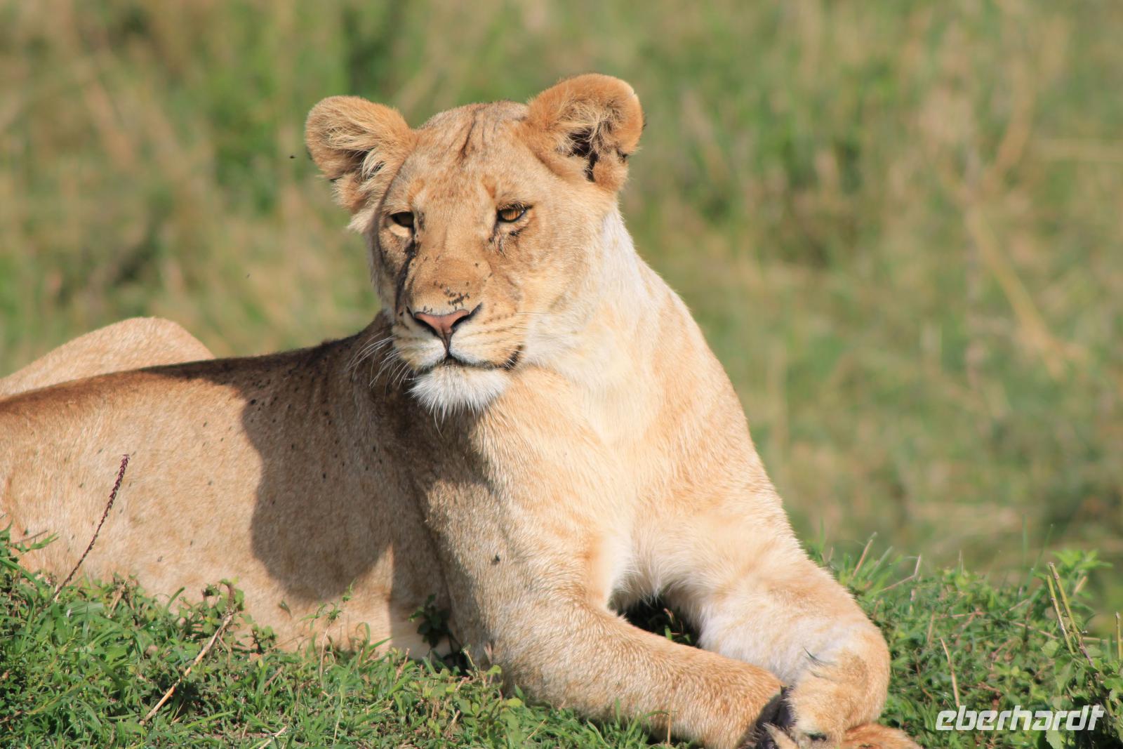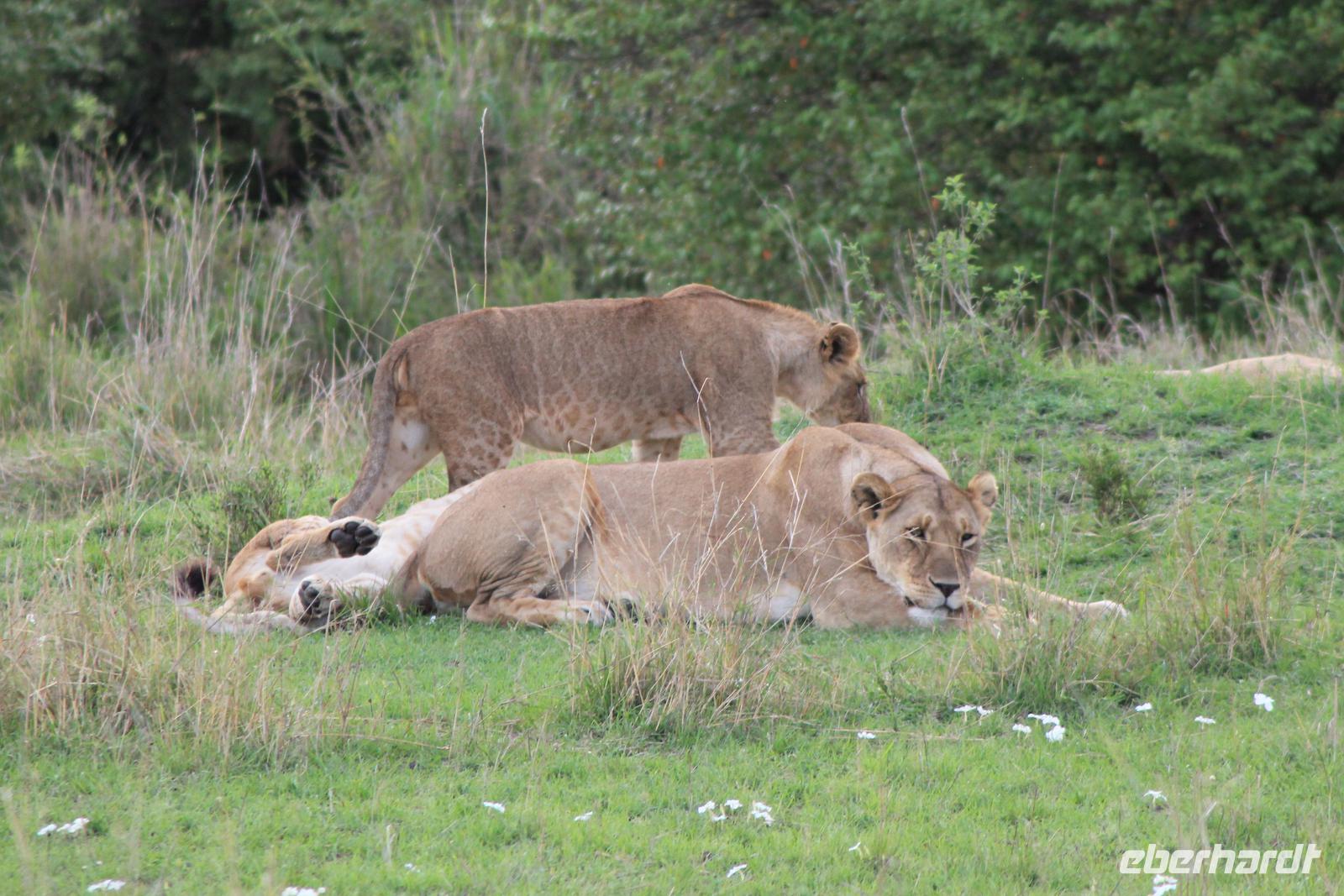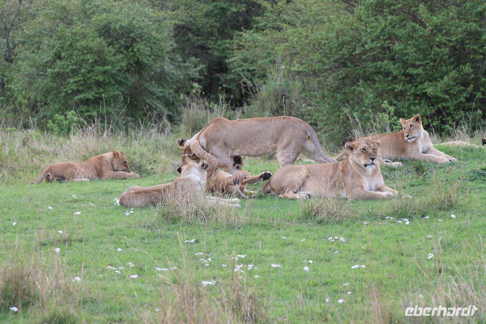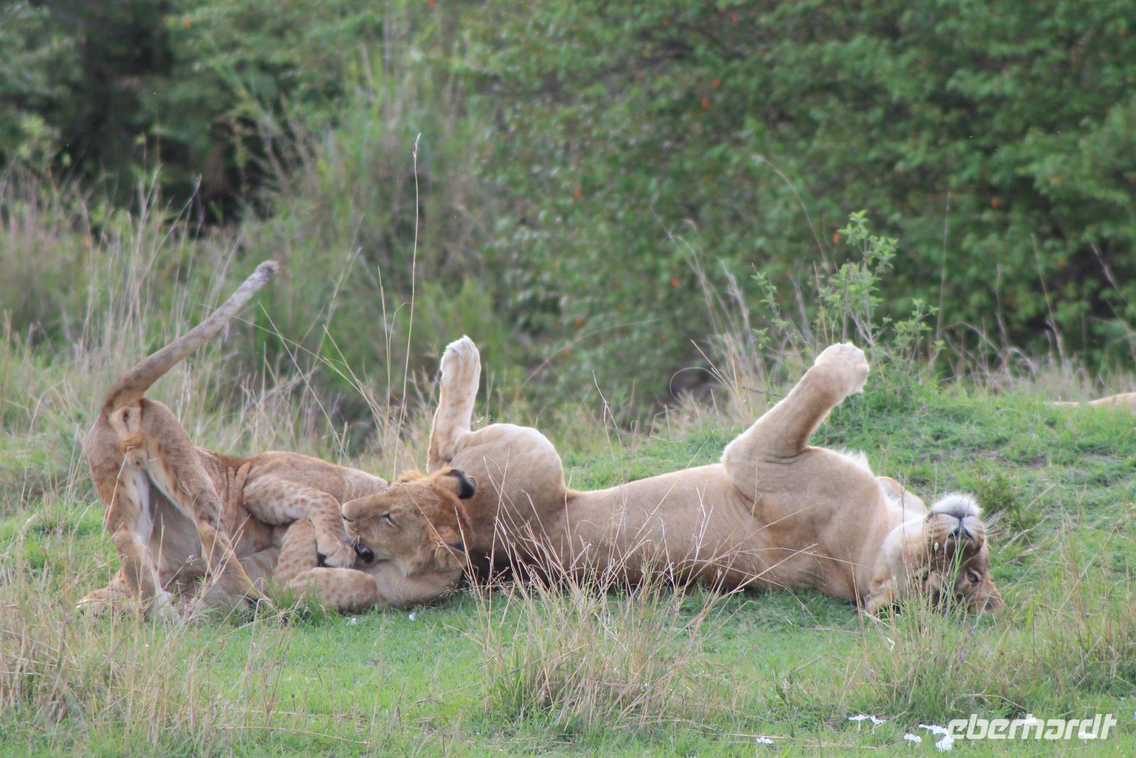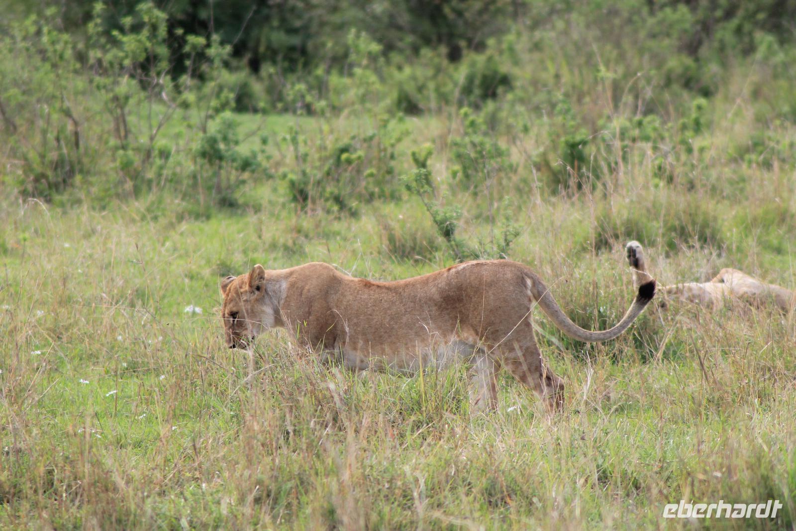 Heute ging es wieder zeitig auf Pirsch, sodass wir nur einen Kaffee/Tee und ein paar Kekse zu uns nahmen. Um 6.30 Uhr ging es auf zur Pirsch: wir sahen viele Tiere wie Topis mit ihren Jungen, Schakale mit ihren Jungen, Warzenschweine mit Nachwuchs, Geier, eine Tüpfelhyäne, einen Adler, einen Frankolin, Wasserböcke, Paviane mit Nachwuchs und vor allem als krönenden Abschluss eine Löwenfamilie, die ein Gnu gerissen hatte und nun faul, satt und zufrieden im Gras lag. Es waren vor allem junge Weibchen, ein junges Männchen von ca. 2 Jahren und ein ganz Junges von ca. 6 Monaten. Bei solch einem Schauspiel störte uns auch der Verwesungsgeruch des Gnus nicht, das wahrscheinlich an diesem Morgen gerissen wurde. Als ein Geier sich an den Überresten zu schaffen machte, ging schnell eine der Löwinnen dazwischen und verteidigte ihren Fang. Auch wenn sie selbst nicht noch einmal etwas vernaschen wollte. Auf dem Weg zum Camp sahen wir dann noch Flusspferde und Krokodile. Ein „hängendes Gnu" war auch dabei - Leoparden verzehren ihre Beute auf dem Baum - sie können Beute mit einem Gewicht bis zu ihrem Eigengewicht auf den Baum schleppen - starke Tiere. Zurück im Camp genossen wir unser Frühstück und im Anschluss unternahmen wir eine geführte Wanderung von ca. 1 Stunde mit einem Ranger des Camps. Er zeigte uns anhand des Kots und der Abdrücke im Boden, welche Tiere hier ihre Spuren hinterlassen hatten. Auch die Pflanzen wurden erläutert und zum Schluss konnte man Speer werfen üben. Beim Mittagessen gab es leckeren Red Snapper-Fisch, gebratenen Reis, gemischtes Gemüse, Linsen, gebratenen Kohl und zum Nachtisch Obst. Nach einer kleinen Mittagspause trafen wir uns 15.30 Uhr wieder zur Pirsch. Neben vielen anderen Tieren sahen wir wieder Löwen, einen Geparden und einen Leoparden. Ein solches Glück wird nur wenigen Safari-Teilnehmern zuteil!