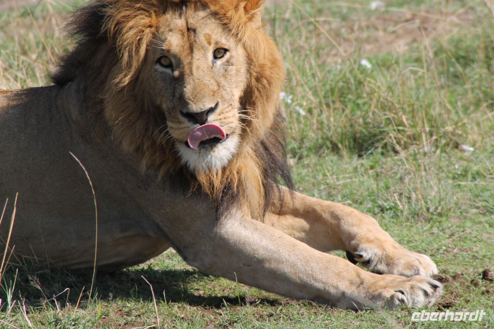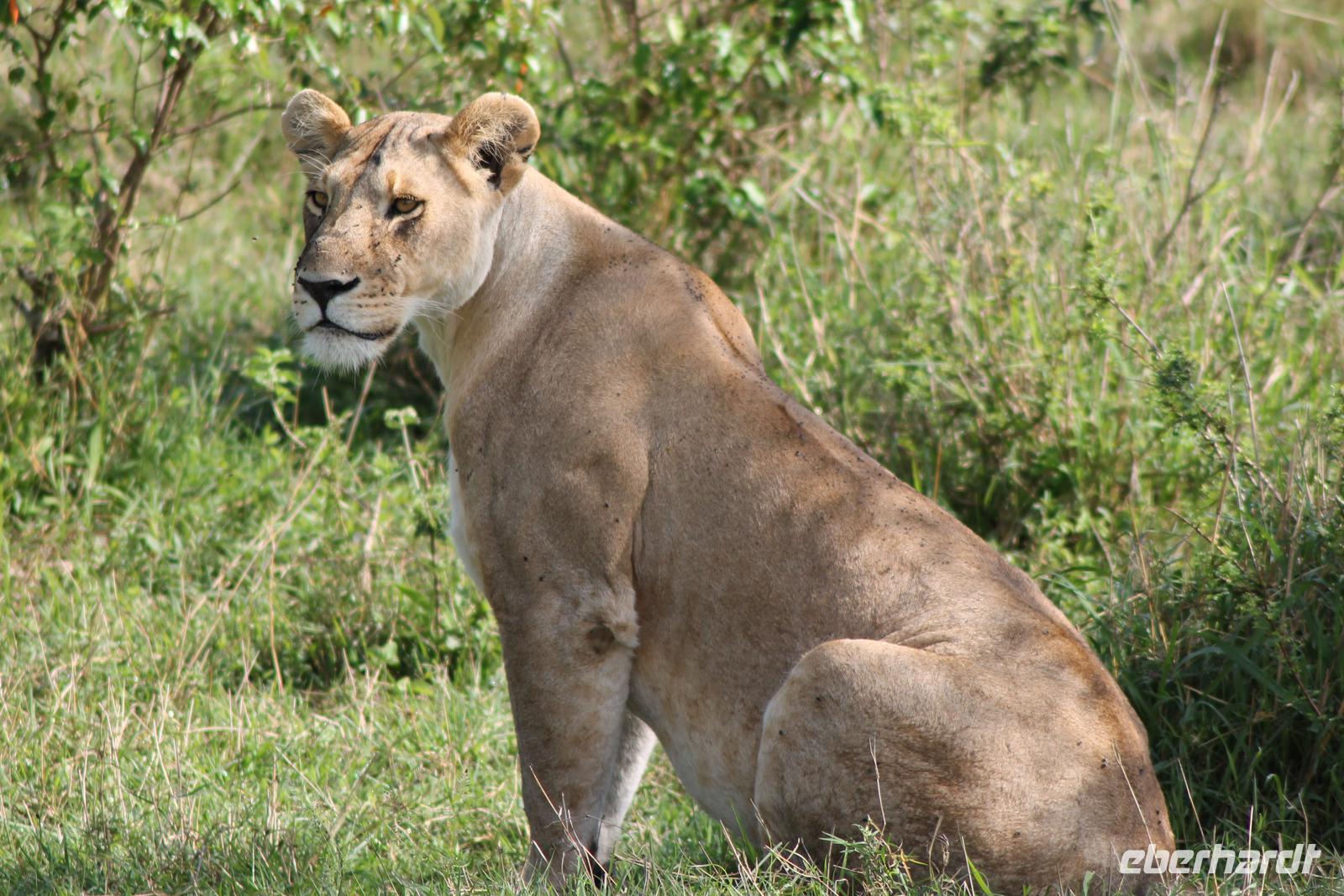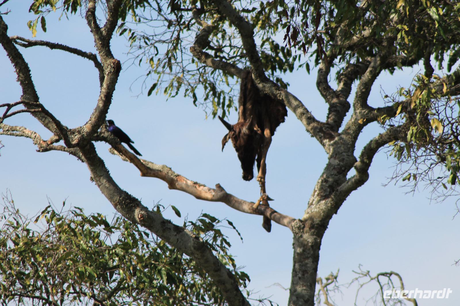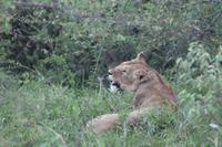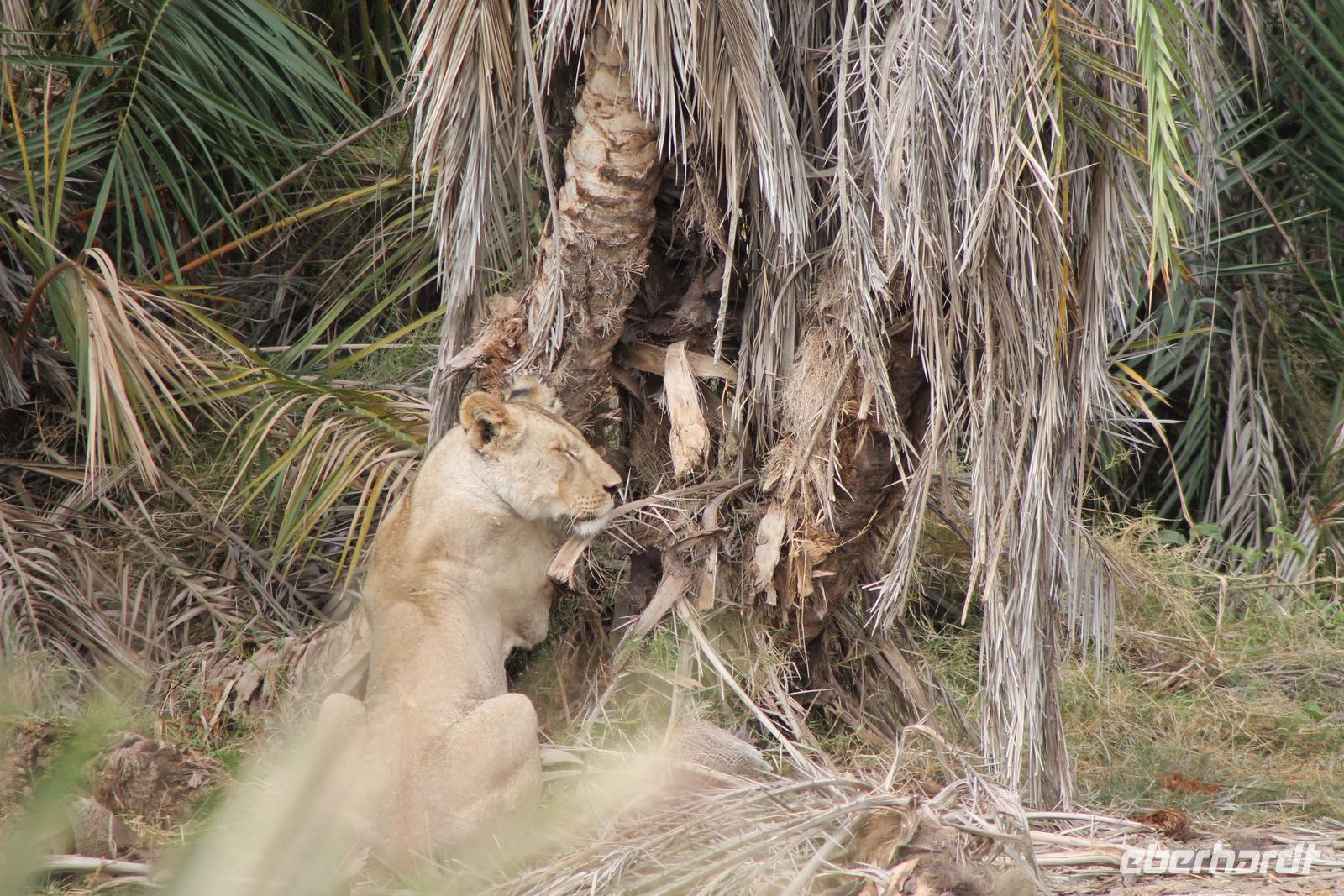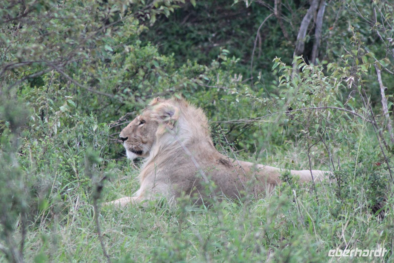 Heute ging es wieder zeitig auf Pirsch, sodass wir nur einen Kaffee/Tee und ein paar Kekse zu uns nahmen. Um 6.30 Uhr ging es auf zur Pirsch: wir sahen viele Tiere wie Topis mit ihren Jungen, Schakale mit ihren Jungen, Warzenschweine mit Nachwuchs, Geier, eine Tüpfelhyäne, einen Adler, einen Frankolin, Wasserböcke, Paviane mit Nachwuchs und vor allem als krönenden Abschluss eine Löwenfamilie, die ein Gnu gerissen hatte und nun faul, satt und zufrieden im Gras lag. Es waren vor allem junge Weibchen, ein junges Männchen von ca. 2 Jahren und ein ganz Junges von ca. 6 Monaten. Bei solch einem Schauspiel störte uns auch der Verwesungsgeruch des Gnus nicht, das wahrscheinlich an diesem Morgen gerissen wurde. Als ein Geier sich an den Überresten zu schaffen machte, ging schnell eine der Löwinnen dazwischen und verteidigte ihren Fang. Auch wenn sie selbst nicht noch einmal etwas vernaschen wollte. Auf dem Weg zum Camp sahen wir dann noch Flusspferde und Krokodile. Ein „hängendes Gnu" war auch dabei - Leoparden verzehren ihre Beute auf dem Baum - sie können Beute mit einem Gewicht bis zu ihrem Eigengewicht auf den Baum schleppen - starke Tiere. Zurück im Camp genossen wir unser Frühstück und im Anschluss unternahmen wir eine geführte Wanderung von ca. 1 Stunde mit einem Ranger des Camps. Er zeigte uns anhand des Kots und der Abdrücke im Boden, welche Tiere hier ihre Spuren hinterlassen hatten. Auch die Pflanzen wurden erläutert und zum Schluss konnte man Speer werfen üben. Beim Mittagessen gab es leckeren Red Snapper-Fisch, gebratenen Reis, gemischtes Gemüse, Linsen, gebratenen Kohl und zum Nachtisch Obst. Nach einer kleinen Mittagspause trafen wir uns 15.30 Uhr wieder zur Pirsch. Neben vielen anderen Tieren sahen wir wieder Löwen, einen Geparden und einen Leoparden. Ein solches Glück wird nur wenigen Safari-Teilnehmern zuteil!