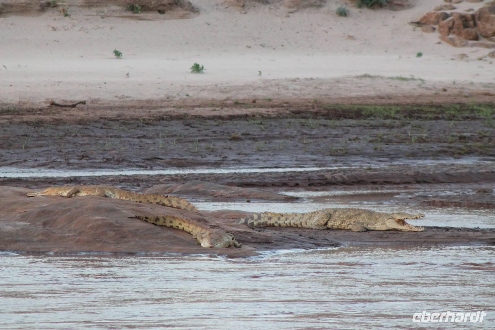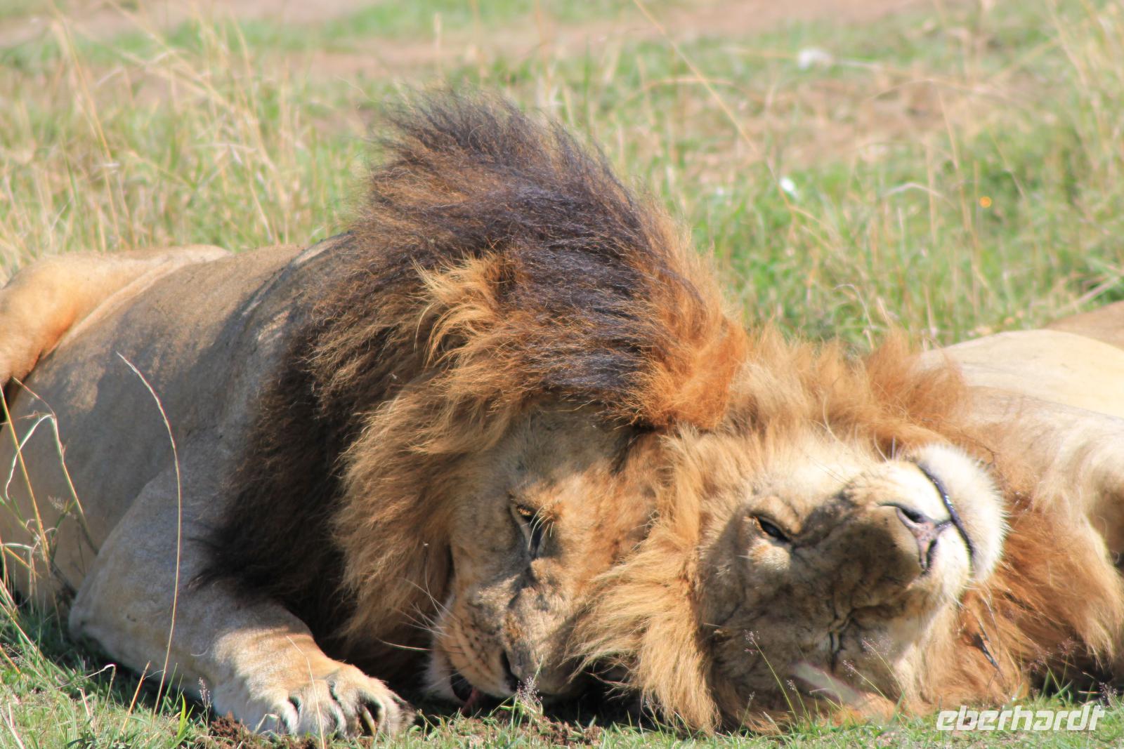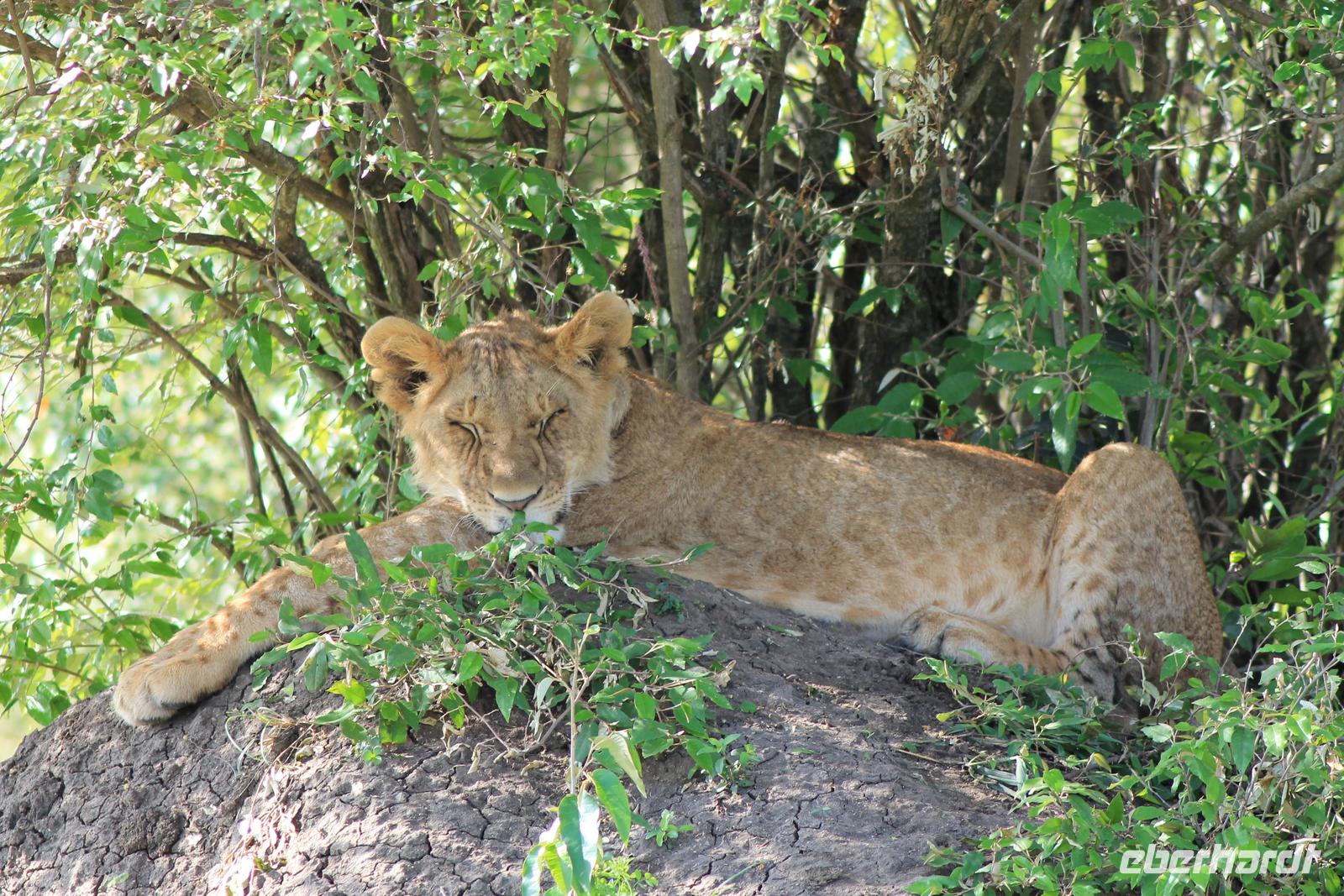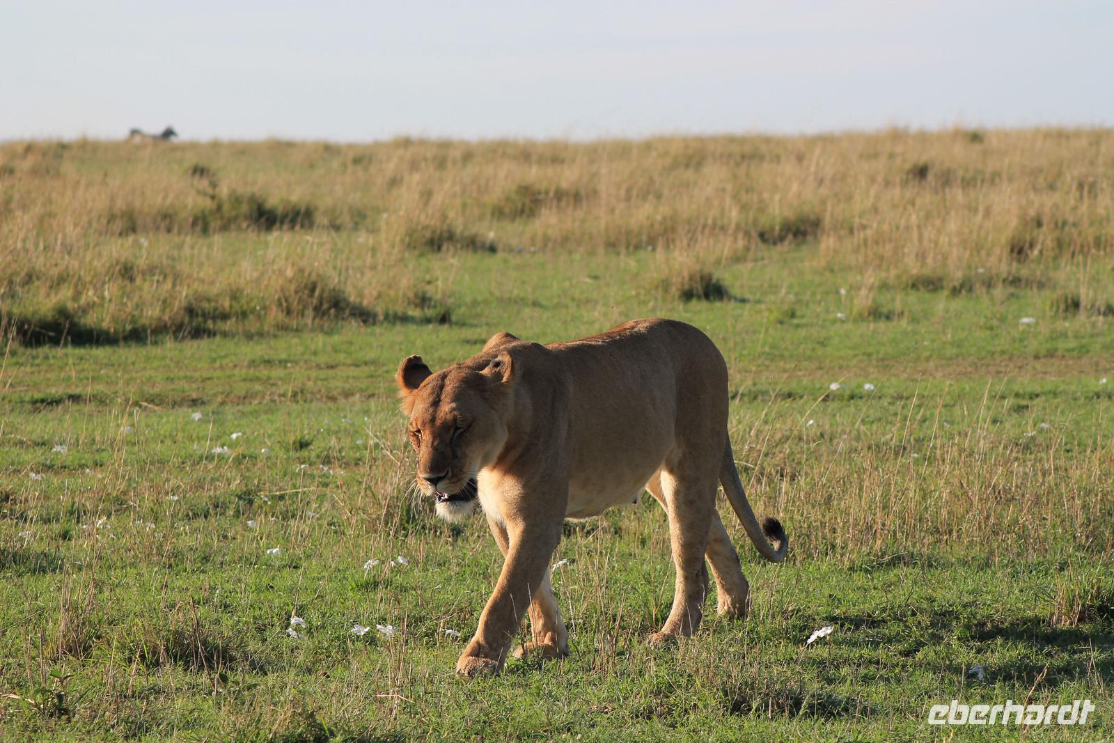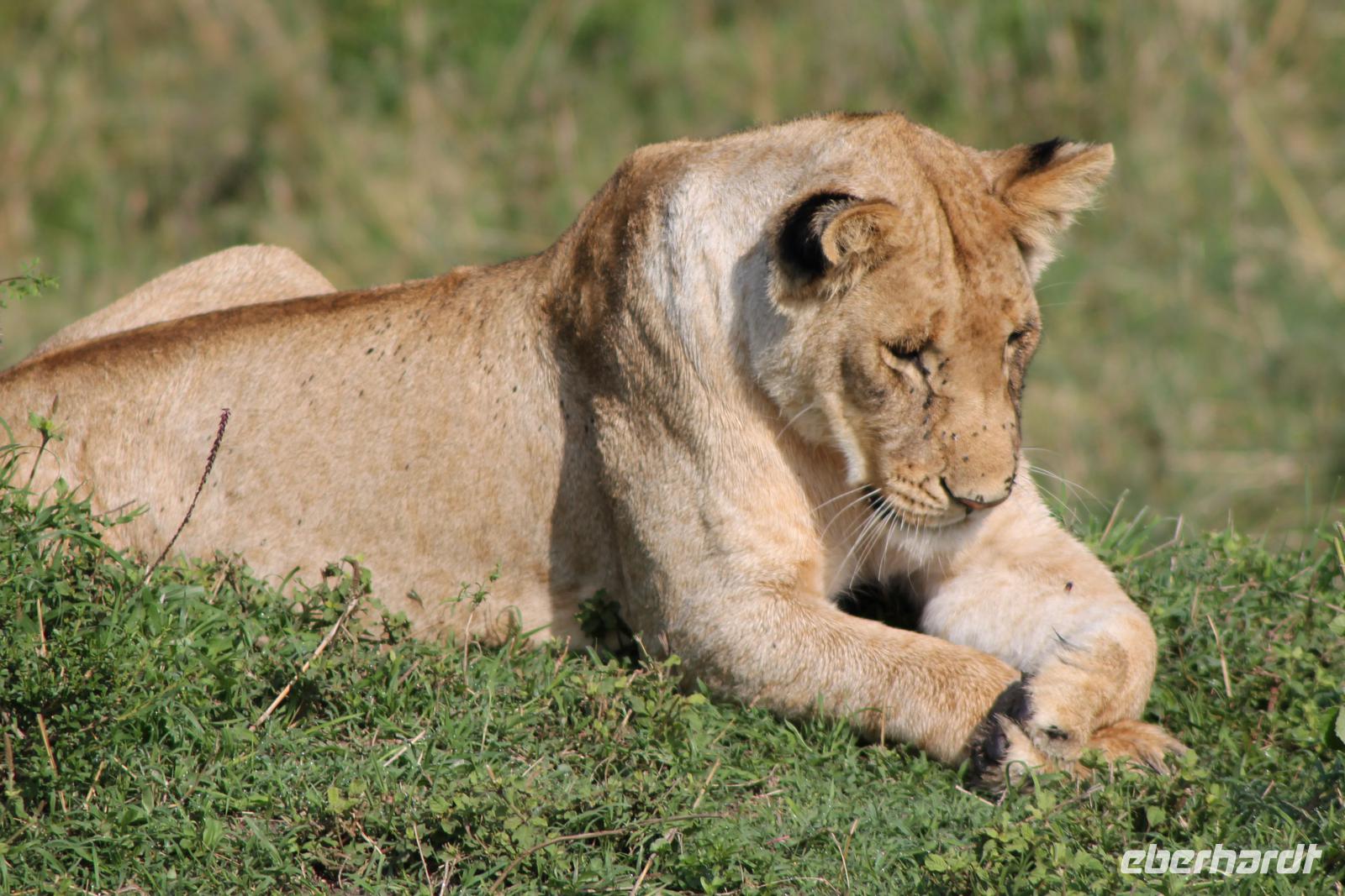 Heute ging es wieder zeitig auf Pirsch, sodass wir nur einen Kaffee/Tee und ein paar Kekse zu uns nahmen. Um 6.30 Uhr ging es auf zur Pirsch: wir sahen viele Tiere wie Topis mit ihren Jungen, Schakale mit ihren Jungen, Warzenschweine mit Nachwuchs, Geier, eine Tüpfelhyäne, einen Adler, einen Frankolin, Wasserböcke, Paviane mit Nachwuchs und vor allem als krönenden Abschluss eine Löwenfamilie, die ein Gnu gerissen hatte und nun faul, satt und zufrieden im Gras lag. Es waren vor allem junge Weibchen, ein junges Männchen von ca. 2 Jahren und ein ganz Junges von ca. 6 Monaten. Bei solch einem Schauspiel störte uns auch der Verwesungsgeruch des Gnus nicht, das wahrscheinlich an diesem Morgen gerissen wurde. Als ein Geier sich an den Überresten zu schaffen machte, ging schnell eine der Löwinnen dazwischen und verteidigte ihren Fang. Auch wenn sie selbst nicht noch einmal etwas vernaschen wollte. Auf dem Weg zum Camp sahen wir dann noch Flusspferde und Krokodile. Ein „hängendes Gnu" war auch dabei - Leoparden verzehren ihre Beute auf dem Baum - sie können Beute mit einem Gewicht bis zu ihrem Eigengewicht auf den Baum schleppen - starke Tiere. Zurück im Camp genossen wir unser Frühstück und im Anschluss unternahmen wir eine geführte Wanderung von ca. 1 Stunde mit einem Ranger des Camps. Er zeigte uns anhand des Kots und der Abdrücke im Boden, welche Tiere hier ihre Spuren hinterlassen hatten. Auch die Pflanzen wurden erläutert und zum Schluss konnte man Speer werfen üben. Beim Mittagessen gab es leckeren Red Snapper-Fisch, gebratenen Reis, gemischtes Gemüse, Linsen, gebratenen Kohl und zum Nachtisch Obst. Nach einer kleinen Mittagspause trafen wir uns 15.30 Uhr wieder zur Pirsch. Neben vielen anderen Tieren sahen wir wieder Löwen, einen Geparden und einen Leoparden. Ein solches Glück wird nur wenigen Safari-Teilnehmern zuteil!