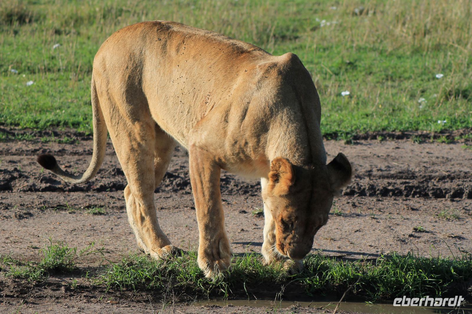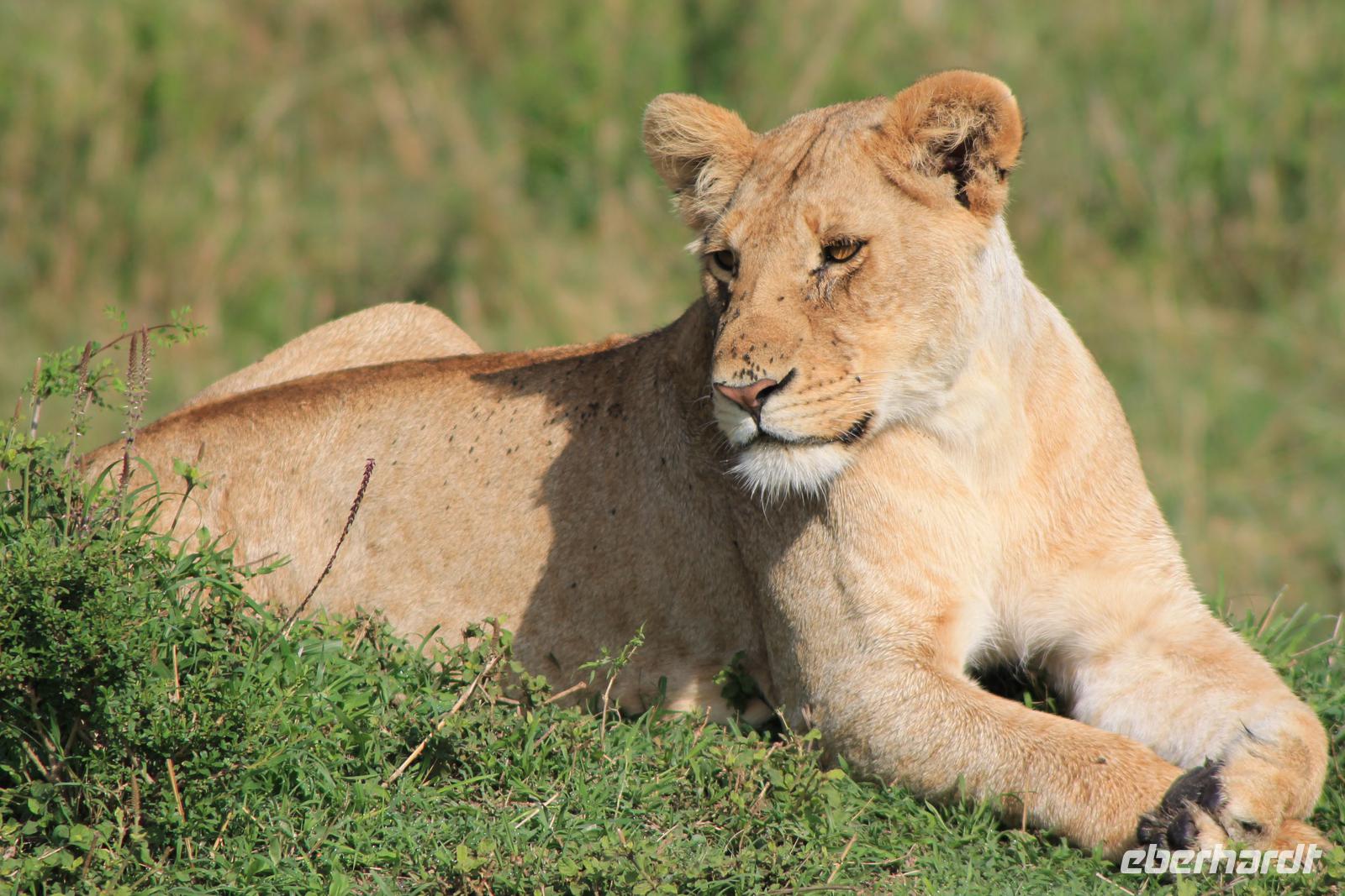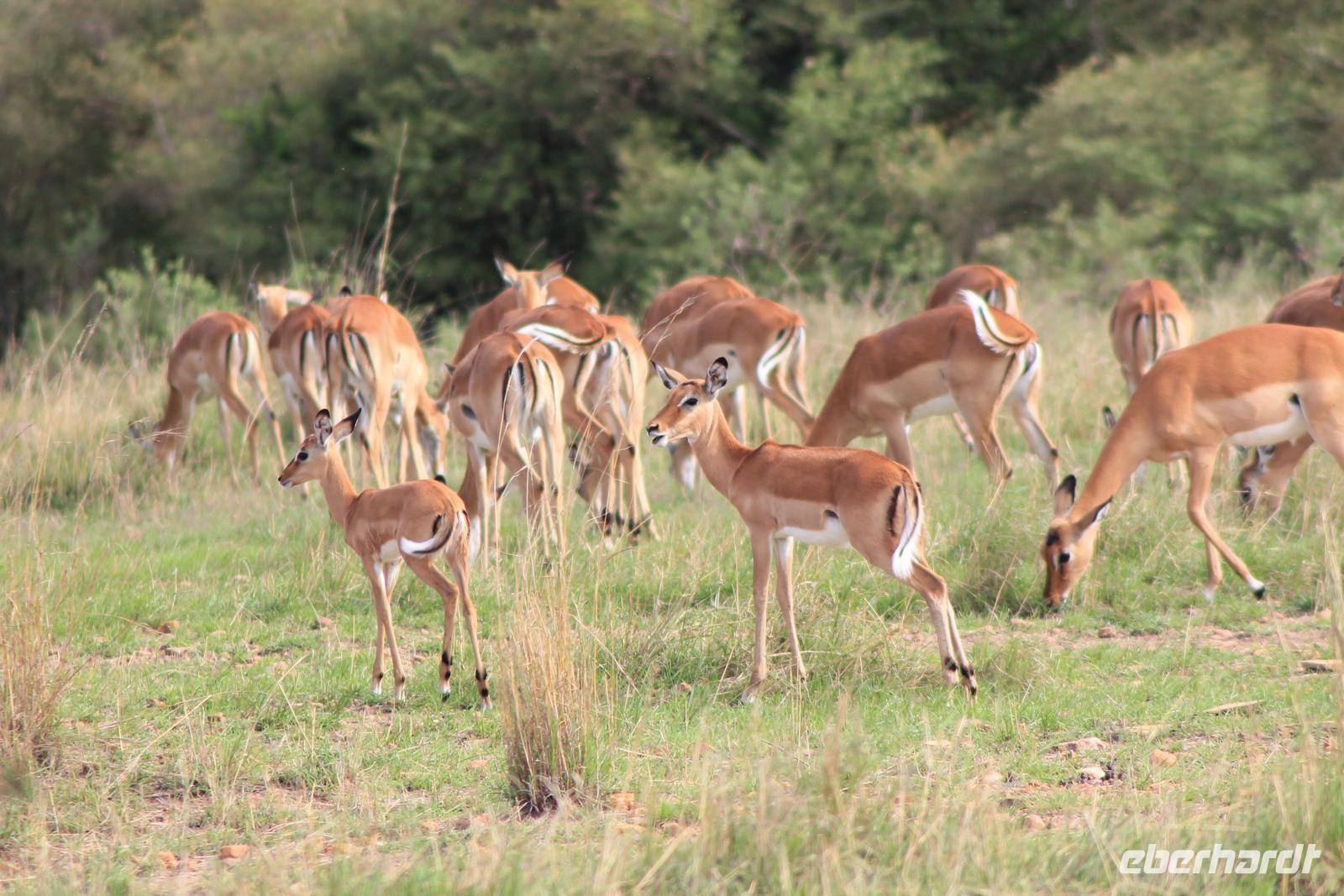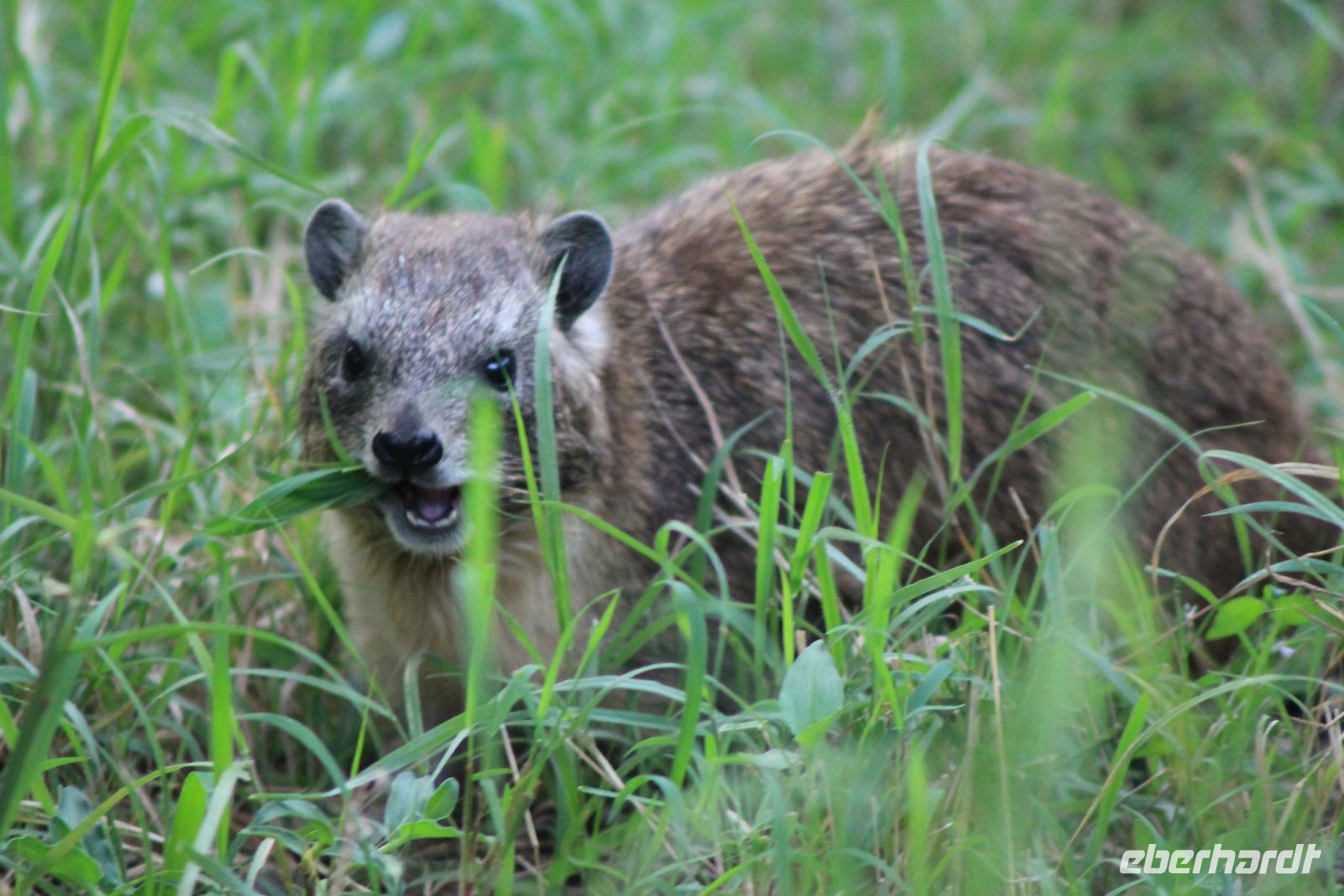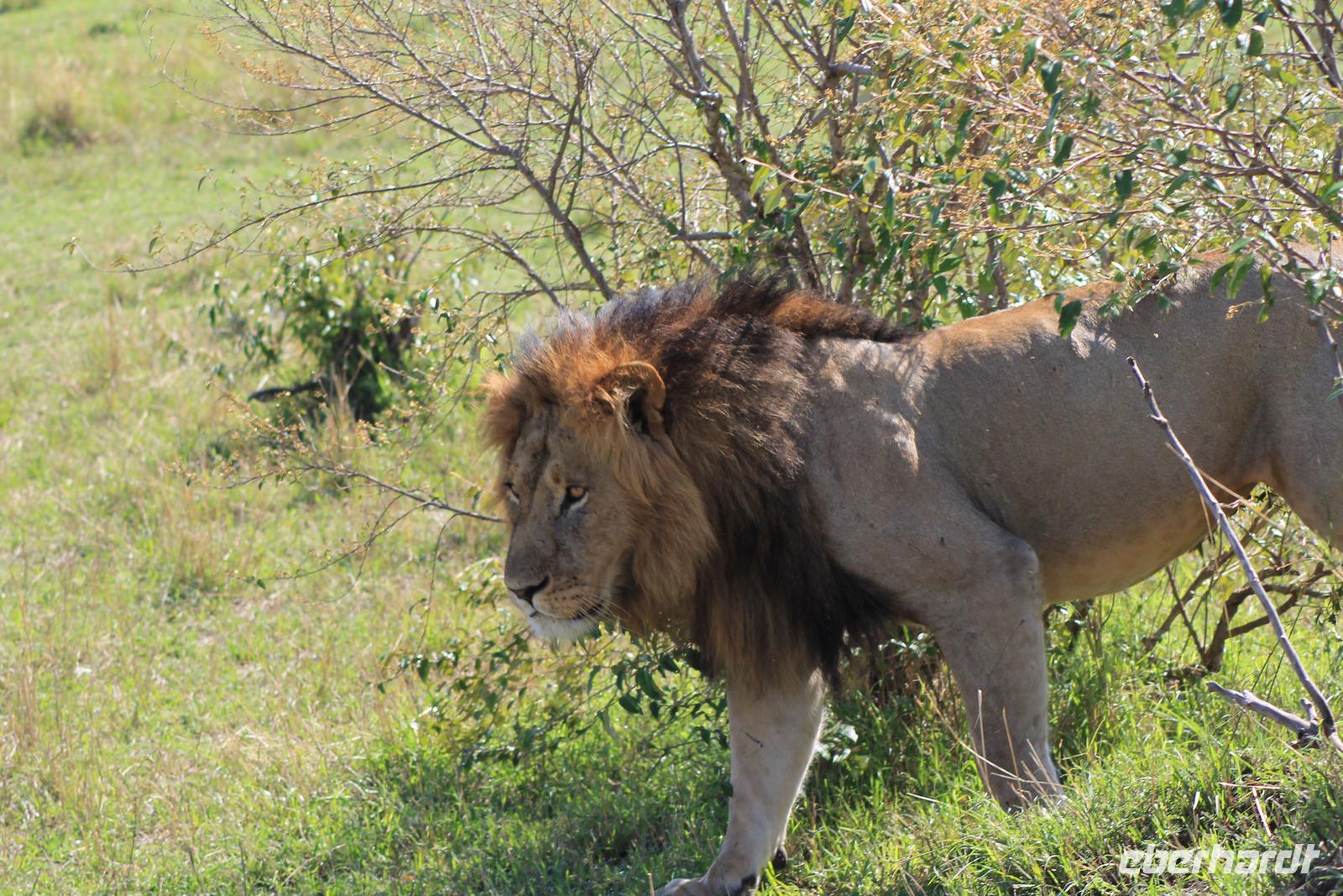 Heute ging es wieder zeitig auf Pirsch, sodass wir nur einen Kaffee/Tee und ein paar Kekse zu uns nahmen. Um 6.30 Uhr ging es auf zur Pirsch: wir sahen viele Tiere wie Topis mit ihren Jungen, Schakale mit ihren Jungen, Warzenschweine mit Nachwuchs, Geier, eine Tüpfelhyäne, einen Adler, einen Frankolin, Wasserböcke, Paviane mit Nachwuchs und vor allem als krönenden Abschluss eine Löwenfamilie, die ein Gnu gerissen hatte und nun faul, satt und zufrieden im Gras lag. Es waren vor allem junge Weibchen, ein junges Männchen von ca. 2 Jahren und ein ganz Junges von ca. 6 Monaten. Bei solch einem Schauspiel störte uns auch der Verwesungsgeruch des Gnus nicht, das wahrscheinlich an diesem Morgen gerissen wurde. Als ein Geier sich an den Überresten zu schaffen machte, ging schnell eine der Löwinnen dazwischen und verteidigte ihren Fang. Auch wenn sie selbst nicht noch einmal etwas vernaschen wollte. Auf dem Weg zum Camp sahen wir dann noch Flusspferde und Krokodile. Ein „hängendes Gnu" war auch dabei - Leoparden verzehren ihre Beute auf dem Baum - sie können Beute mit einem Gewicht bis zu ihrem Eigengewicht auf den Baum schleppen - starke Tiere. Zurück im Camp genossen wir unser Frühstück und im Anschluss unternahmen wir eine geführte Wanderung von ca. 1 Stunde mit einem Ranger des Camps. Er zeigte uns anhand des Kots und der Abdrücke im Boden, welche Tiere hier ihre Spuren hinterlassen hatten. Auch die Pflanzen wurden erläutert und zum Schluss konnte man Speer werfen üben. Beim Mittagessen gab es leckeren Red Snapper-Fisch, gebratenen Reis, gemischtes Gemüse, Linsen, gebratenen Kohl und zum Nachtisch Obst. Nach einer kleinen Mittagspause trafen wir uns 15.30 Uhr wieder zur Pirsch. Neben vielen anderen Tieren sahen wir wieder Löwen, einen Geparden und einen Leoparden. Ein solches Glück wird nur wenigen Safari-Teilnehmern zuteil!