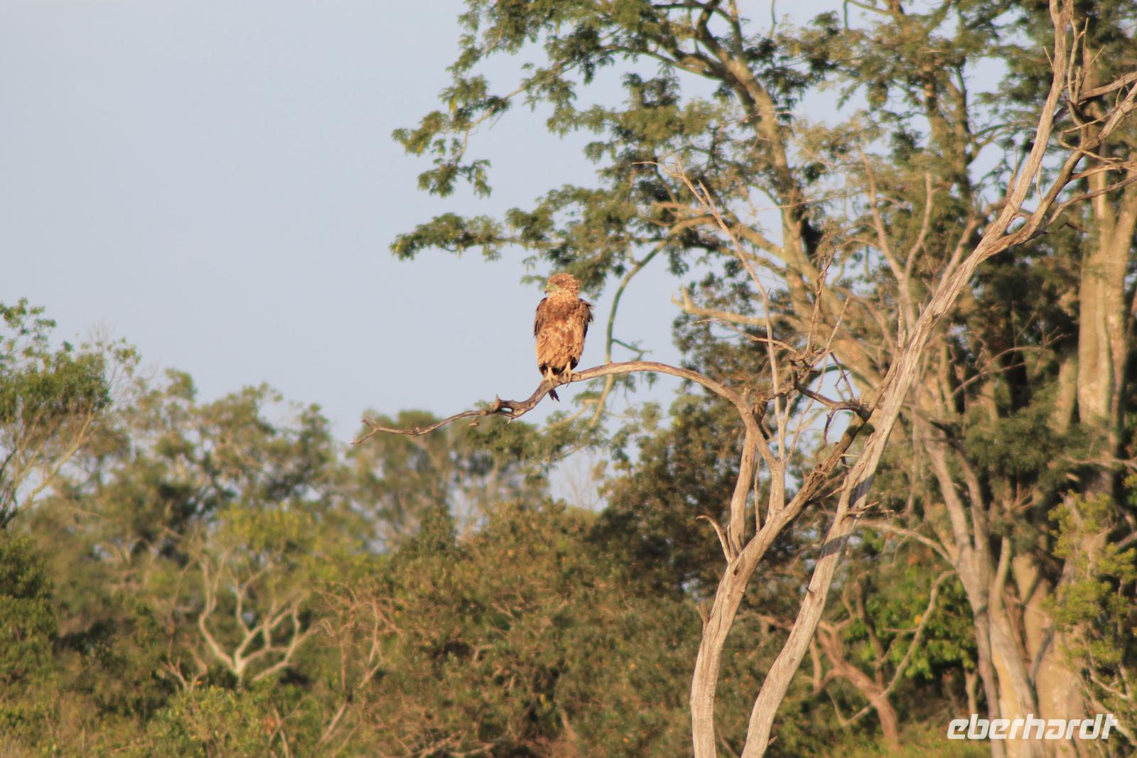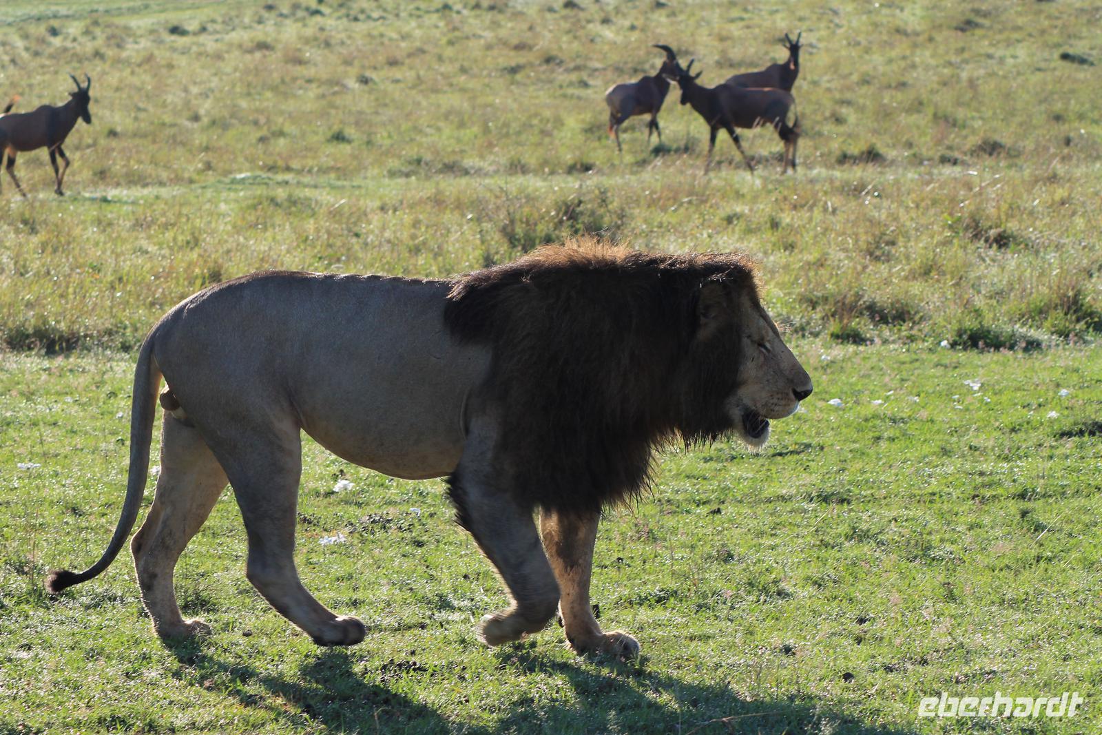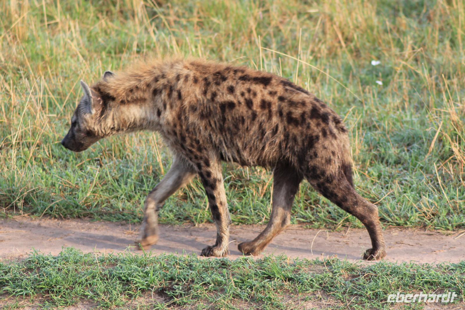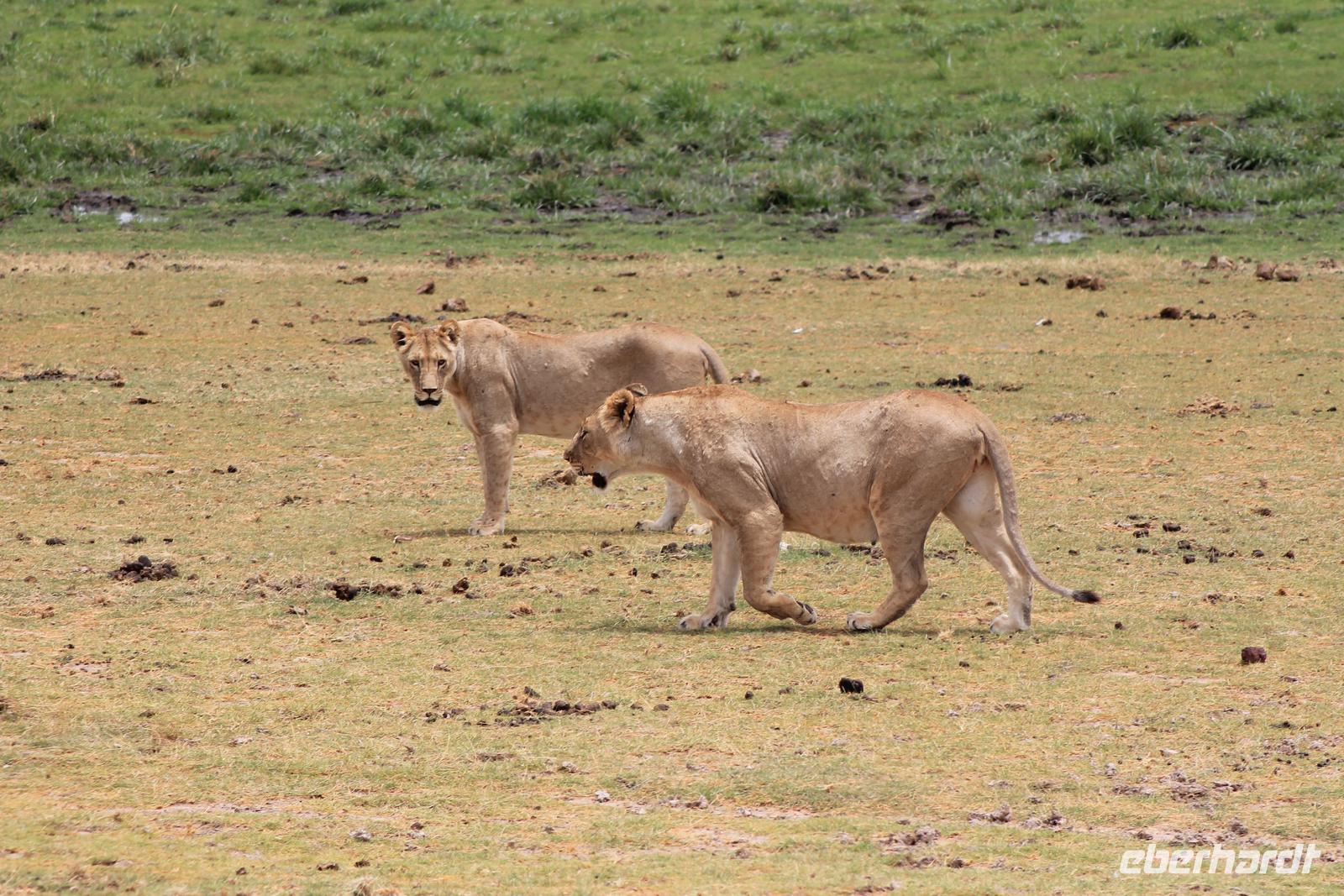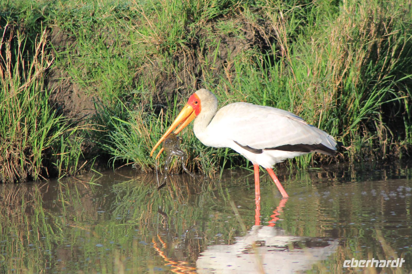 Heute ging es wieder zeitig auf Pirsch, sodass wir nur einen Kaffee/Tee und ein paar Kekse zu uns nahmen. Um 6.30 Uhr ging es auf zur Pirsch: wir sahen viele Tiere wie Topis mit ihren Jungen, Schakale mit ihren Jungen, Warzenschweine mit Nachwuchs, Geier, eine Tüpfelhyäne, einen Adler, einen Frankolin, Wasserböcke, Paviane mit Nachwuchs und vor allem als krönenden Abschluss eine Löwenfamilie, die ein Gnu gerissen hatte und nun faul, satt und zufrieden im Gras lag. Es waren vor allem junge Weibchen, ein junges Männchen von ca. 2 Jahren und ein ganz Junges von ca. 6 Monaten. Bei solch einem Schauspiel störte uns auch der Verwesungsgeruch des Gnus nicht, das wahrscheinlich an diesem Morgen gerissen wurde. Als ein Geier sich an den Überresten zu schaffen machte, ging schnell eine der Löwinnen dazwischen und verteidigte ihren Fang. Auch wenn sie selbst nicht noch einmal etwas vernaschen wollte. Auf dem Weg zum Camp sahen wir dann noch Flusspferde und Krokodile. Ein „hängendes Gnu" war auch dabei - Leoparden verzehren ihre Beute auf dem Baum - sie können Beute mit einem Gewicht bis zu ihrem Eigengewicht auf den Baum schleppen - starke Tiere. Zurück im Camp genossen wir unser Frühstück und im Anschluss unternahmen wir eine geführte Wanderung von ca. 1 Stunde mit einem Ranger des Camps. Er zeigte uns anhand des Kots und der Abdrücke im Boden, welche Tiere hier ihre Spuren hinterlassen hatten. Auch die Pflanzen wurden erläutert und zum Schluss konnte man Speer werfen üben. Beim Mittagessen gab es leckeren Red Snapper-Fisch, gebratenen Reis, gemischtes Gemüse, Linsen, gebratenen Kohl und zum Nachtisch Obst. Nach einer kleinen Mittagspause trafen wir uns 15.30 Uhr wieder zur Pirsch. Neben vielen anderen Tieren sahen wir wieder Löwen, einen Geparden und einen Leoparden. Ein solches Glück wird nur wenigen Safari-Teilnehmern zuteil!
