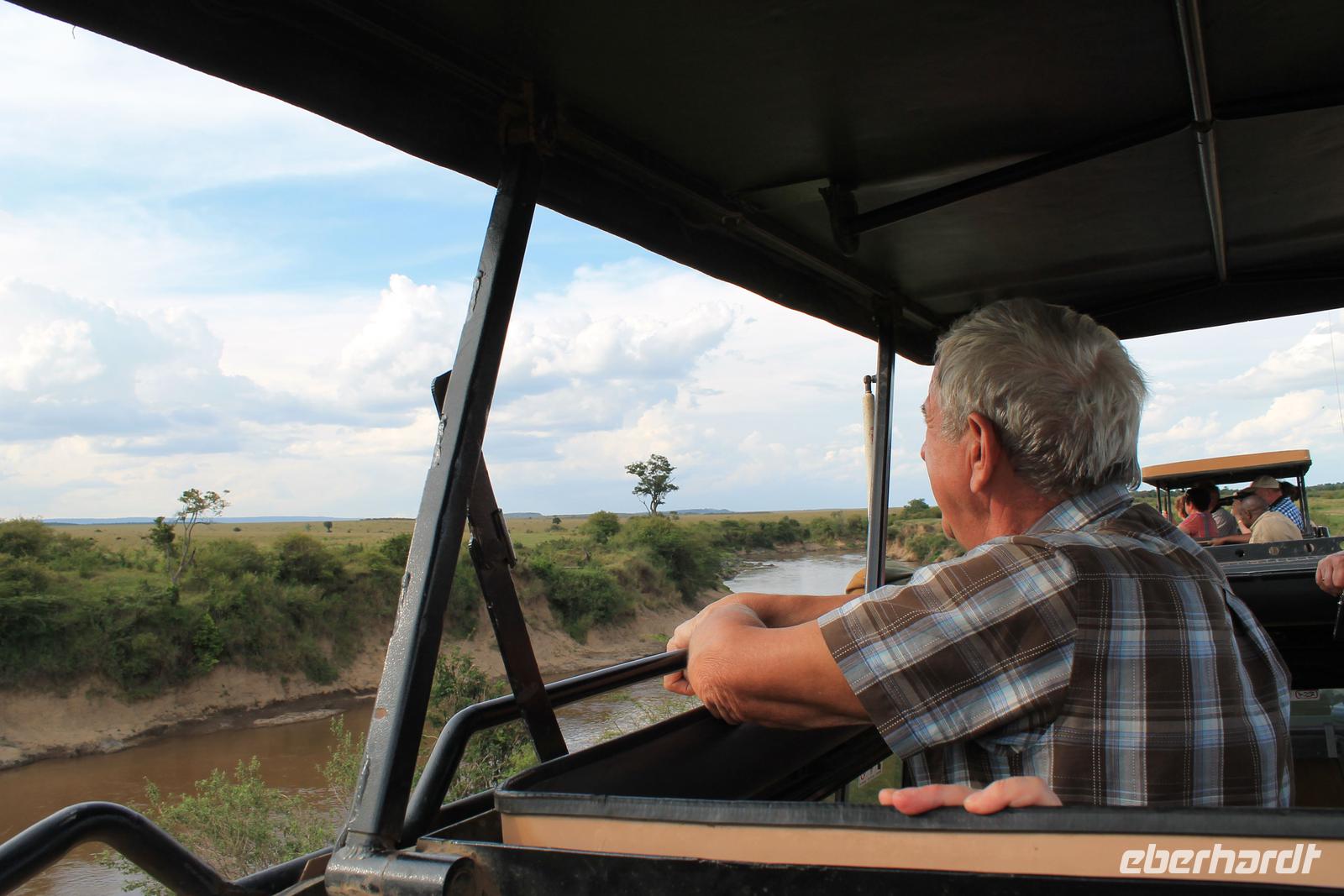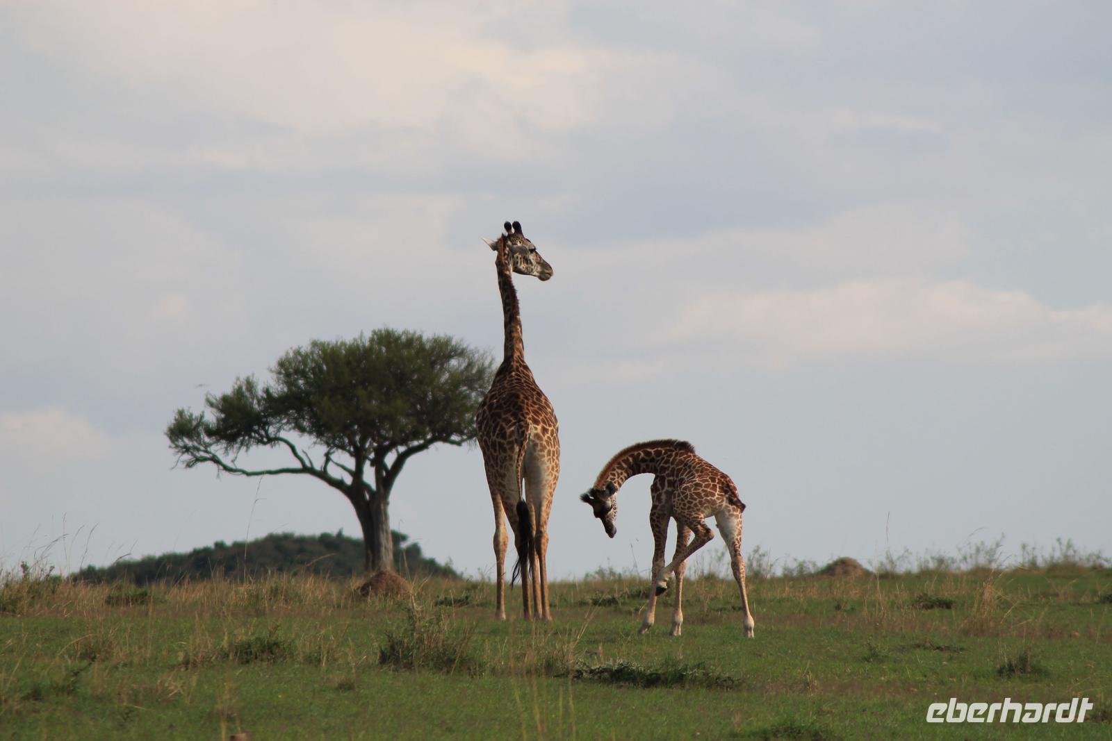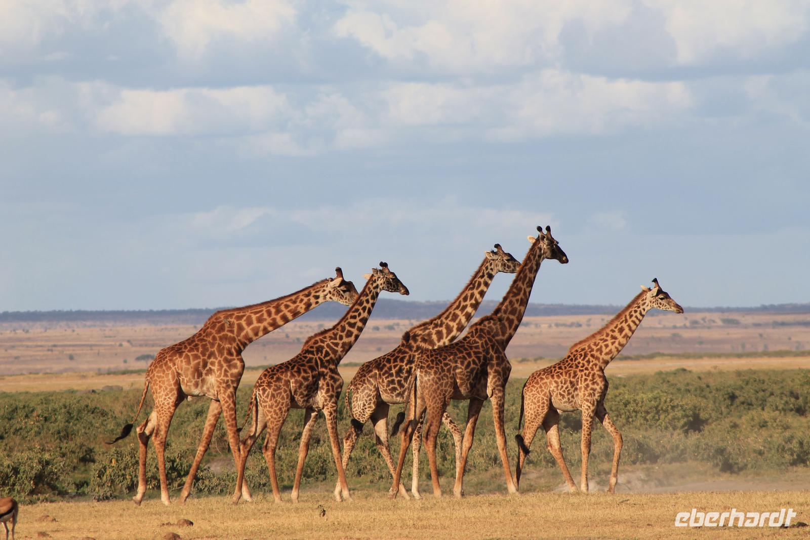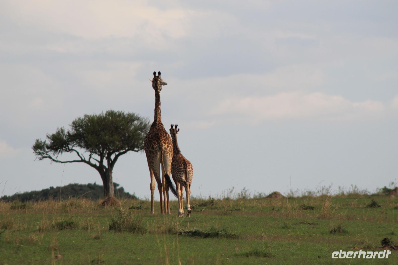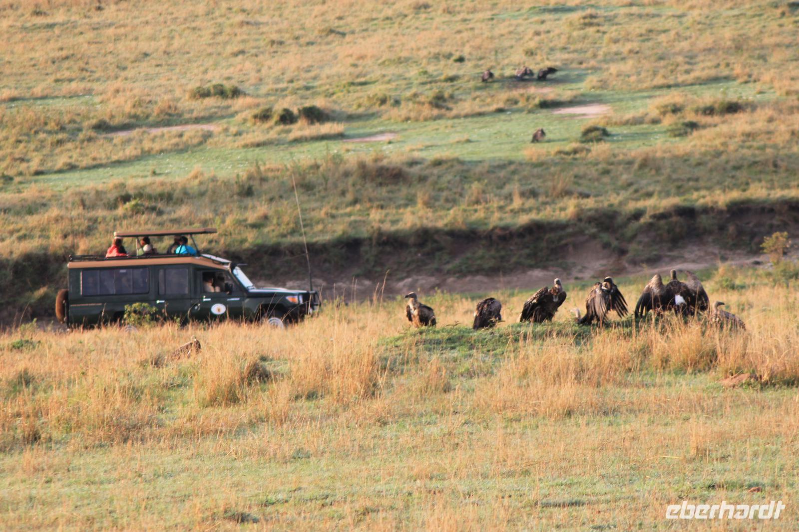 Heute hatten wir unser Frühstück dabei und so hielten wir auf einer Anhöhe und präparierten das leckere Frühstück auf den Motorhauben der beiden „Fahrerlieblinge": Jaqueline und Becci. Hier in der freien Natur schmeckte es gleich noch leckerer. Danach fuhren wir in ein Massaidorf, um mehr über die Traditionen dieses Nomadenstammes zu erfahren, der etwa 6 Prozent der kenianischen Bevölkerung ausmacht, bei uns aber sicher auch durch das Buch „Die weiße Massai" berühmt wurde. Wir wurden durch den Häuptling begrüßt - die Frauen unserer Gruppe von den jungen Massai-Männern. Im Anschluss wurde uns das berühmte Springen der Junggesellen vorgeführt - der der am höchsten springt, bekommt die schönste Freundin. Auch unsere männlichen Reisegäste durften sich beteiligen. Im Anschluss durften wir einen Blick in die Häuser der Massai werfen, die von den Frauen gebaut werden und meist 4 Räume haben. Wobei aus unserer Perspektive der Begriff "Räume" sehr großzügig gefasst ist... Im Anschluss durften wir noch einen Tanz der Frauen bestaunen und auch dort unsere „Künste" einbringen. Abschließend konnte man Handgefertigtes erwerben und die Reisegäste gaben die Geschenke, die sie extra aus Deutschland mitgebracht hatten, für die Kinder der Massai ab. Am meisten bewegte uns wahrscheinlich die Polygamie der Massai-Männer, denn darüber diskutierten wir noch am Abend um das Feuer in unserem Camp. Nach dem Mittagessen im Camp war eine kurze Ruhepause angesetzt, bevor wir noch einmal auf Pirsch gingen. Wir fuhren an den Marafluss, der jedes Jahr Schauplatz der berühmten Überquerung während der großen Wanderung ist. Leider ist er aber eben auch für viele Gnus der Platz, an dem sie ihr Leben lassen, da sie den Weg zwischen ihren vielen Artgenossen durch den teilweise hohen Fluss nicht schaffen. Die toten Kadaver bleiben liegen und werden von den Tieren gefressen. Den Geruch kann man sich lebhaft vorstellen - wir hielten ihn für einen Moment aus, um ein gigantisches Krokodil und auch ein paar Flusspferde zu fotografieren, flüchteten dann aber schnell. Wir konnten an diesem Nachmittag auch eine Elefantenfamilie sowie Hyänen beobachten. Zum krönenden Abschluss gab sich eine Löwenfamilie die Ehre und wir fuhren sehr zufrieden zurück ins Camp. Ein Giraffenjunges kreuzte noch unseren Weg und wir nutzten das tolle Sonnenuntergangslicht für ein paar wunderschöne Gruppenbilder.