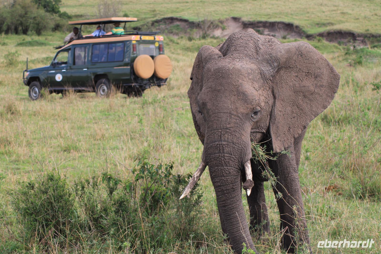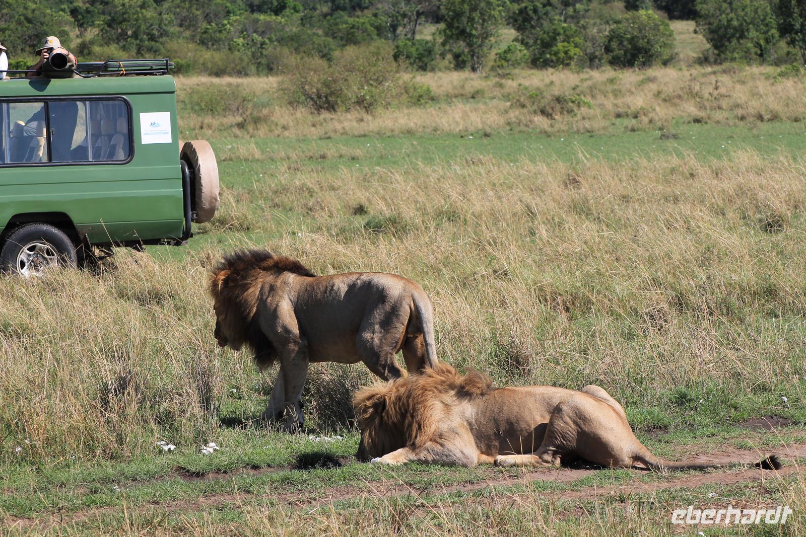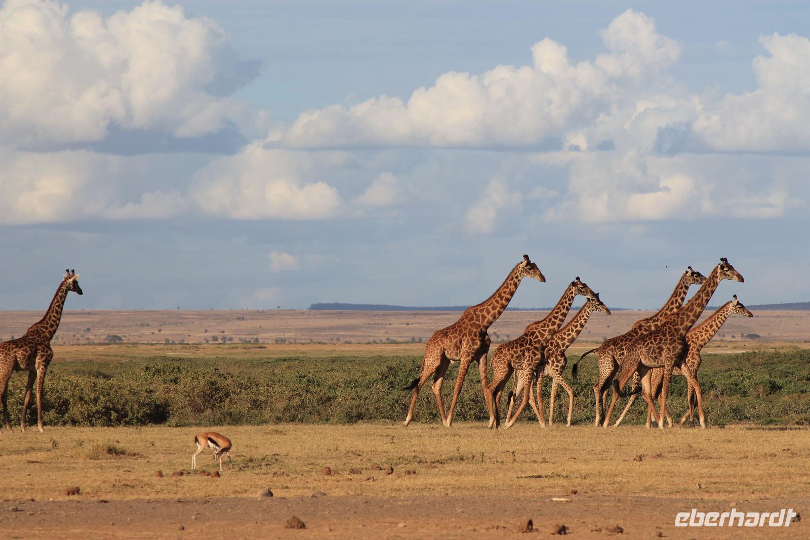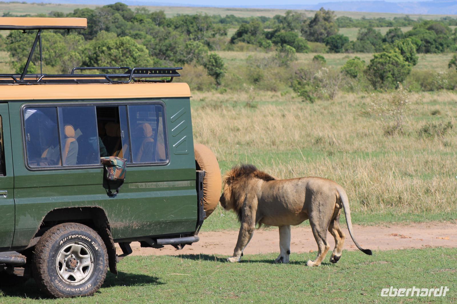 Heute hatten wir unser Frühstück dabei und so hielten wir auf einer Anhöhe und präparierten das leckere Frühstück auf den Motorhauben der beiden „Fahrerlieblinge": Jaqueline und Becci. Hier in der freien Natur schmeckte es gleich noch leckerer. Danach fuhren wir in ein Massaidorf, um mehr über die Traditionen dieses Nomadenstammes zu erfahren, der etwa 6 Prozent der kenianischen Bevölkerung ausmacht, bei uns aber sicher auch durch das Buch „Die weiße Massai" berühmt wurde. Wir wurden durch den Häuptling begrüßt - die Frauen unserer Gruppe von den jungen Massai-Männern. Im Anschluss wurde uns das berühmte Springen der Junggesellen vorgeführt - der der am höchsten springt, bekommt die schönste Freundin. Auch unsere männlichen Reisegäste durften sich beteiligen. Im Anschluss durften wir einen Blick in die Häuser der Massai werfen, die von den Frauen gebaut werden und meist 4 Räume haben. Wobei aus unserer Perspektive der Begriff "Räume" sehr großzügig gefasst ist... Im Anschluss durften wir noch einen Tanz der Frauen bestaunen und auch dort unsere „Künste" einbringen. Abschließend konnte man Handgefertigtes erwerben und die Reisegäste gaben die Geschenke, die sie extra aus Deutschland mitgebracht hatten, für die Kinder der Massai ab. Am meisten bewegte uns wahrscheinlich die Polygamie der Massai-Männer, denn darüber diskutierten wir noch am Abend um das Feuer in unserem Camp. Nach dem Mittagessen im Camp war eine kurze Ruhepause angesetzt, bevor wir noch einmal auf Pirsch gingen. Wir fuhren an den Marafluss, der jedes Jahr Schauplatz der berühmten Überquerung während der großen Wanderung ist. Leider ist er aber eben auch für viele Gnus der Platz, an dem sie ihr Leben lassen, da sie den Weg zwischen ihren vielen Artgenossen durch den teilweise hohen Fluss nicht schaffen. Die toten Kadaver bleiben liegen und werden von den Tieren gefressen. Den Geruch kann man sich lebhaft vorstellen - wir hielten ihn für einen Moment aus, um ein gigantisches Krokodil und auch ein paar Flusspferde zu fotografieren, flüchteten dann aber schnell. Wir konnten an diesem Nachmittag auch eine Elefantenfamilie sowie Hyänen beobachten. Zum krönenden Abschluss gab sich eine Löwenfamilie die Ehre und wir fuhren sehr zufrieden zurück ins Camp. Ein Giraffenjunges kreuzte noch unseren Weg und wir nutzten das tolle Sonnenuntergangslicht für ein paar wunderschöne Gruppenbilder.