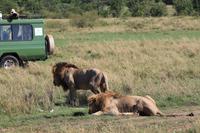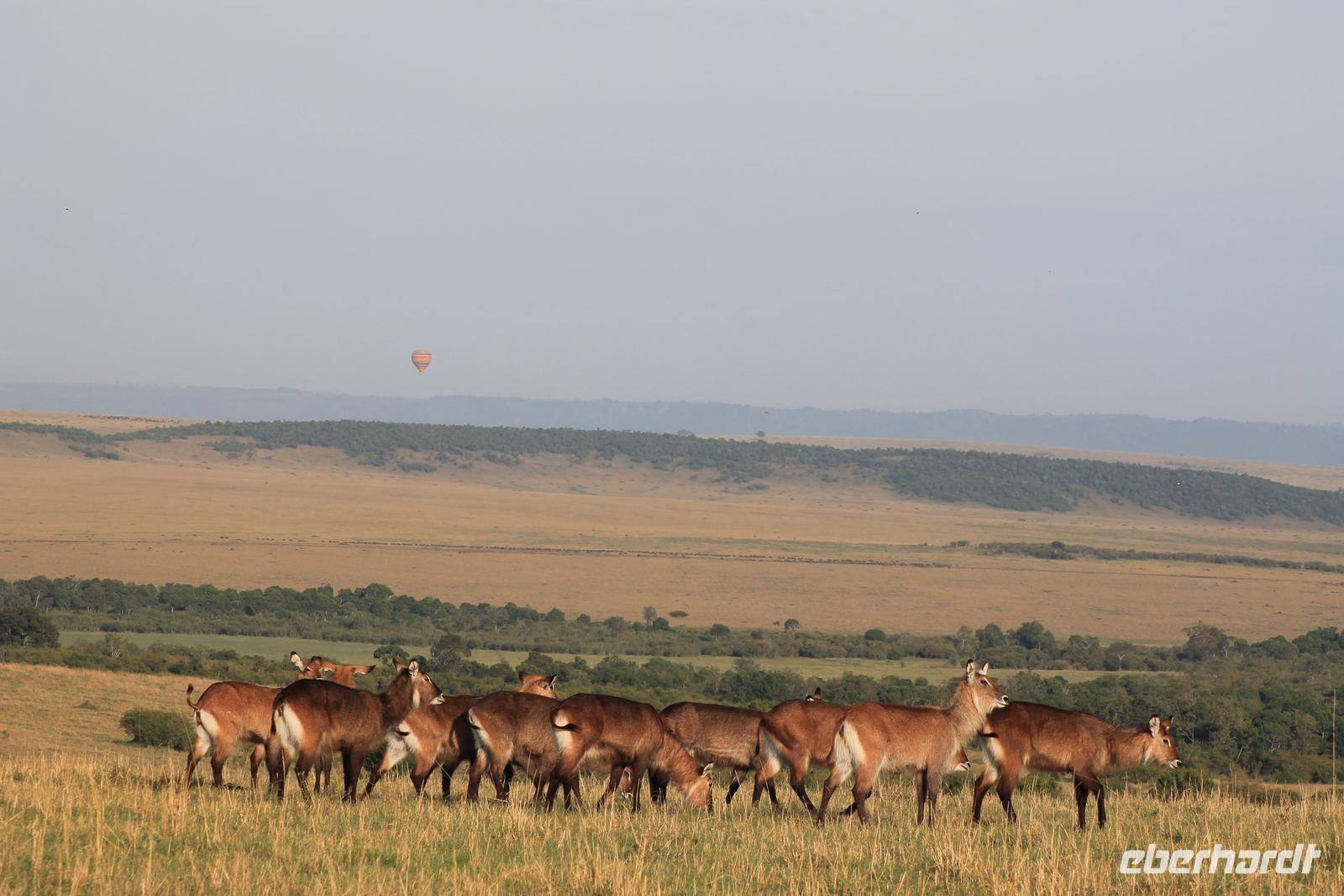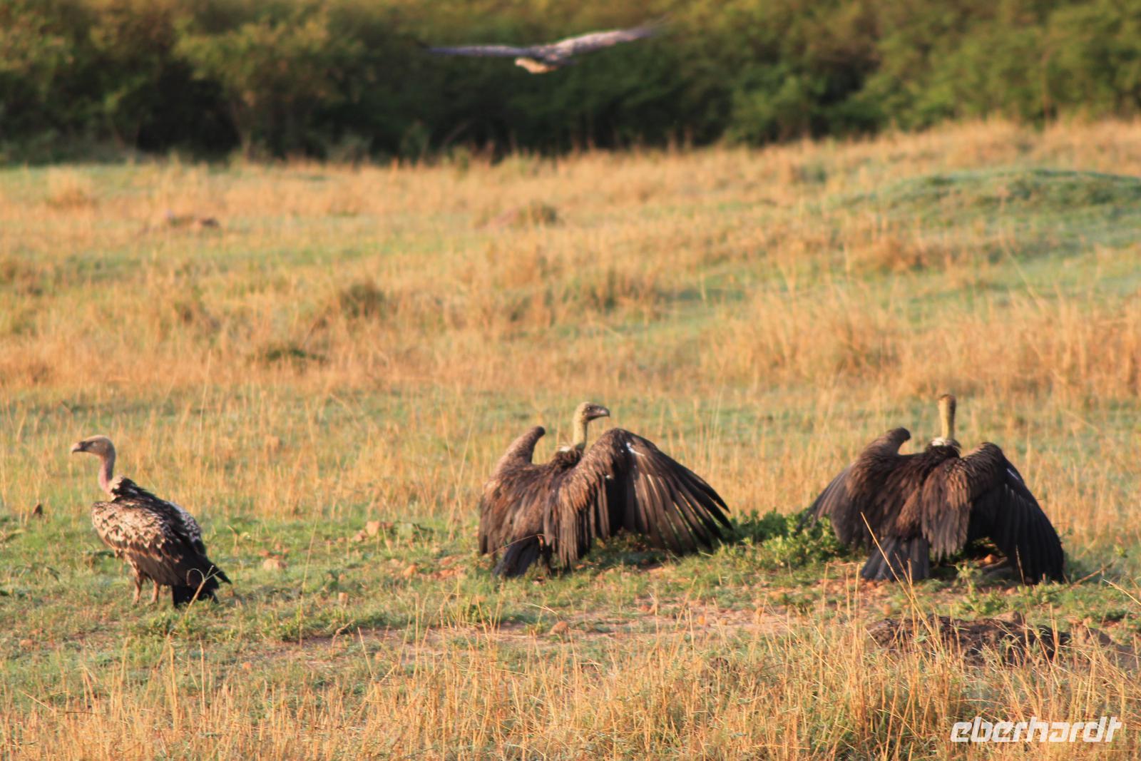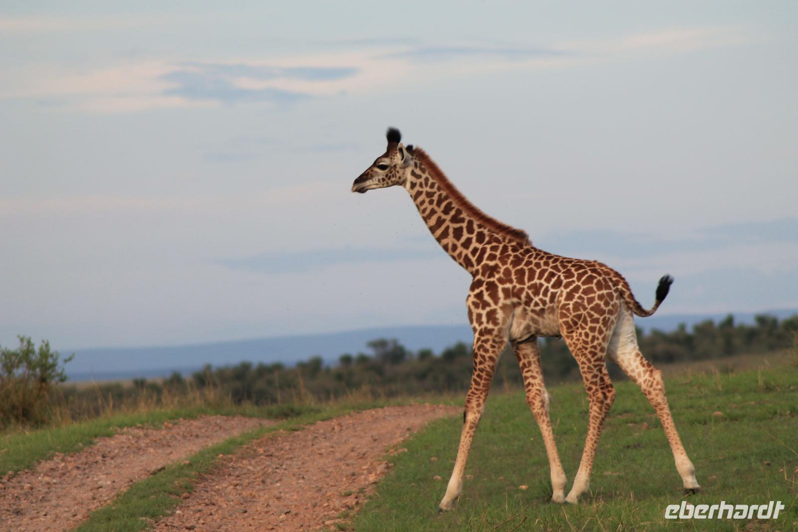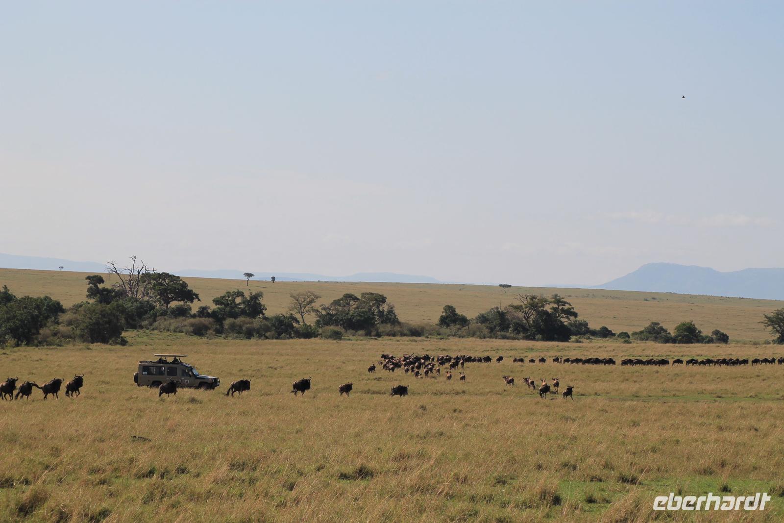 Heute hatten wir unser Frühstück dabei und so hielten wir auf einer Anhöhe und präparierten das leckere Frühstück auf den Motorhauben der beiden „Fahrerlieblinge": Jaqueline und Becci. Hier in der freien Natur schmeckte es gleich noch leckerer. Danach fuhren wir in ein Massaidorf, um mehr über die Traditionen dieses Nomadenstammes zu erfahren, der etwa 6 Prozent der kenianischen Bevölkerung ausmacht, bei uns aber sicher auch durch das Buch „Die weiße Massai" berühmt wurde. Wir wurden durch den Häuptling begrüßt - die Frauen unserer Gruppe von den jungen Massai-Männern. Im Anschluss wurde uns das berühmte Springen der Junggesellen vorgeführt - der der am höchsten springt, bekommt die schönste Freundin. Auch unsere männlichen Reisegäste durften sich beteiligen. Im Anschluss durften wir einen Blick in die Häuser der Massai werfen, die von den Frauen gebaut werden und meist 4 Räume haben. Wobei aus unserer Perspektive der Begriff "Räume" sehr großzügig gefasst ist... Im Anschluss durften wir noch einen Tanz der Frauen bestaunen und auch dort unsere „Künste" einbringen. Abschließend konnte man Handgefertigtes erwerben und die Reisegäste gaben die Geschenke, die sie extra aus Deutschland mitgebracht hatten, für die Kinder der Massai ab. Am meisten bewegte uns wahrscheinlich die Polygamie der Massai-Männer, denn darüber diskutierten wir noch am Abend um das Feuer in unserem Camp. Nach dem Mittagessen im Camp war eine kurze Ruhepause angesetzt, bevor wir noch einmal auf Pirsch gingen. Wir fuhren an den Marafluss, der jedes Jahr Schauplatz der berühmten Überquerung während der großen Wanderung ist. Leider ist er aber eben auch für viele Gnus der Platz, an dem sie ihr Leben lassen, da sie den Weg zwischen ihren vielen Artgenossen durch den teilweise hohen Fluss nicht schaffen. Die toten Kadaver bleiben liegen und werden von den Tieren gefressen. Den Geruch kann man sich lebhaft vorstellen - wir hielten ihn für einen Moment aus, um ein gigantisches Krokodil und auch ein paar Flusspferde zu fotografieren, flüchteten dann aber schnell. Wir konnten an diesem Nachmittag auch eine Elefantenfamilie sowie Hyänen beobachten. Zum krönenden Abschluss gab sich eine Löwenfamilie die Ehre und wir fuhren sehr zufrieden zurück ins Camp. Ein Giraffenjunges kreuzte noch unseren Weg und wir nutzten das tolle Sonnenuntergangslicht für ein paar wunderschöne Gruppenbilder.
