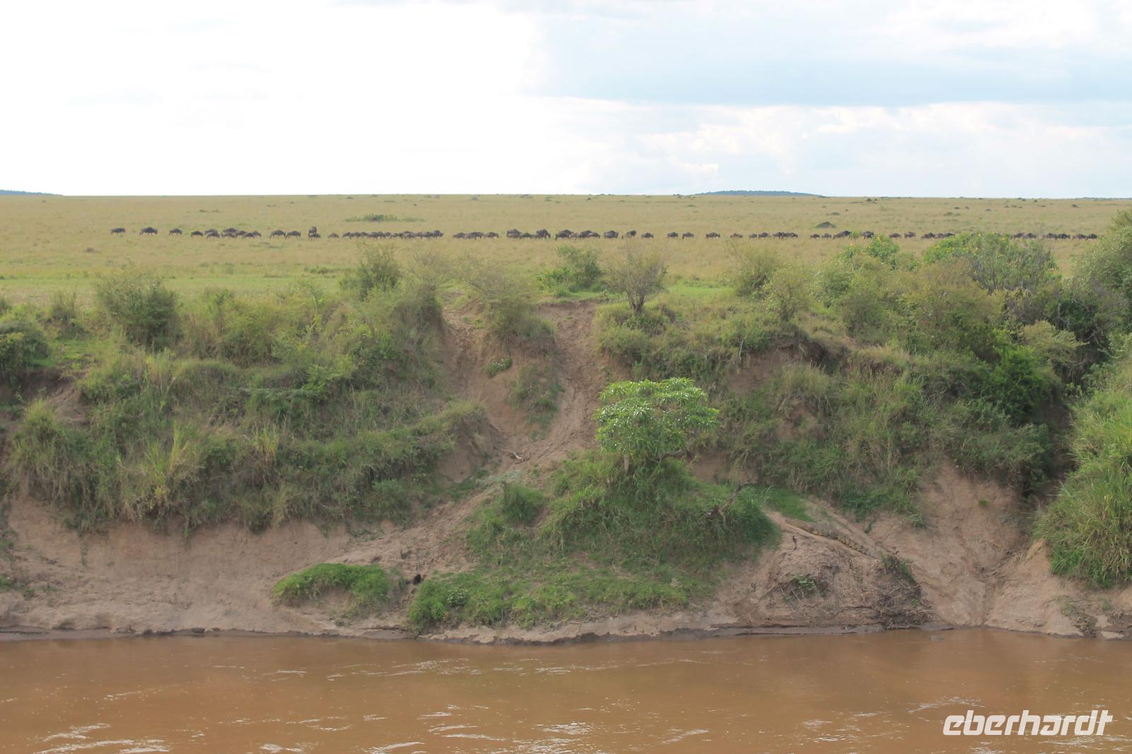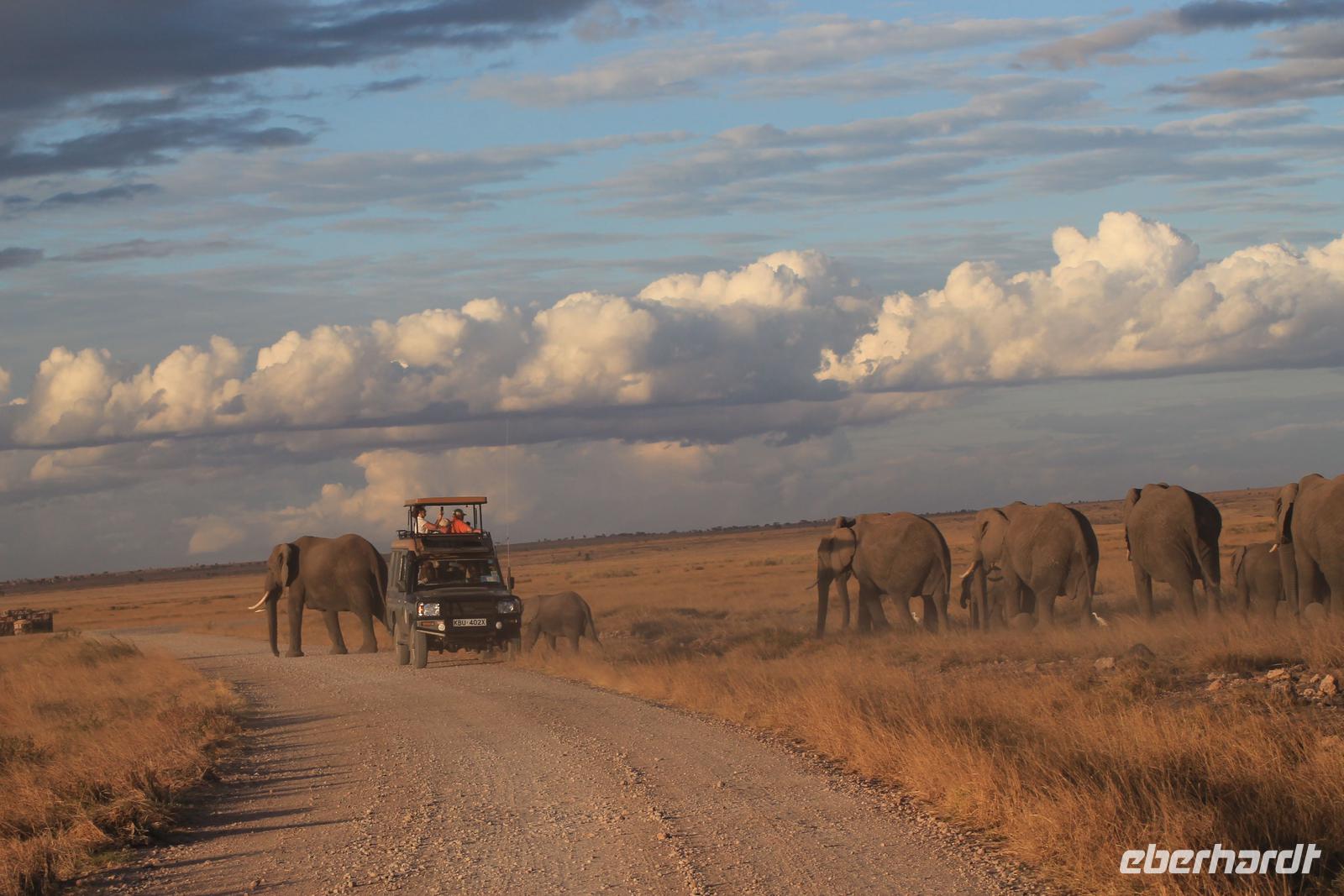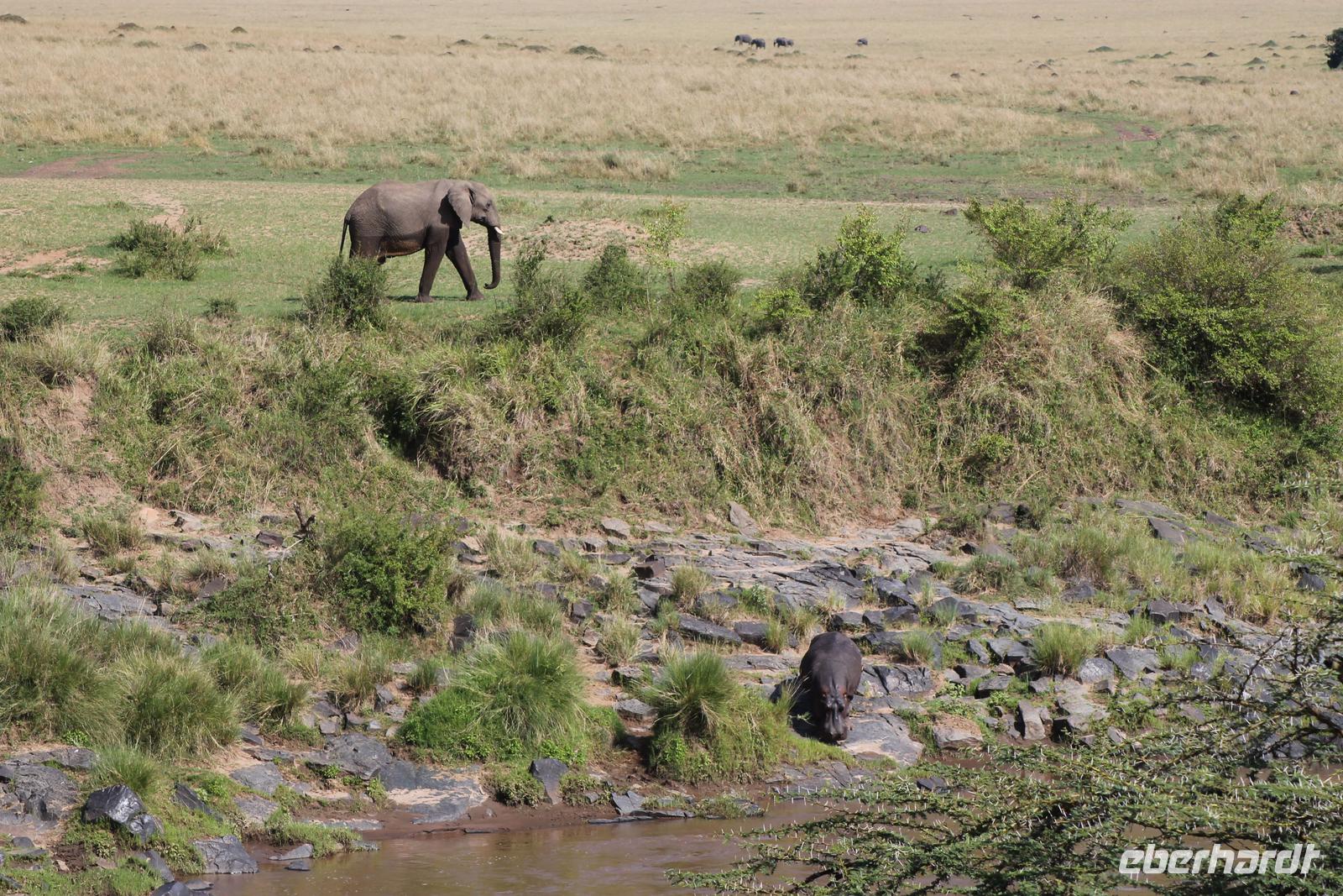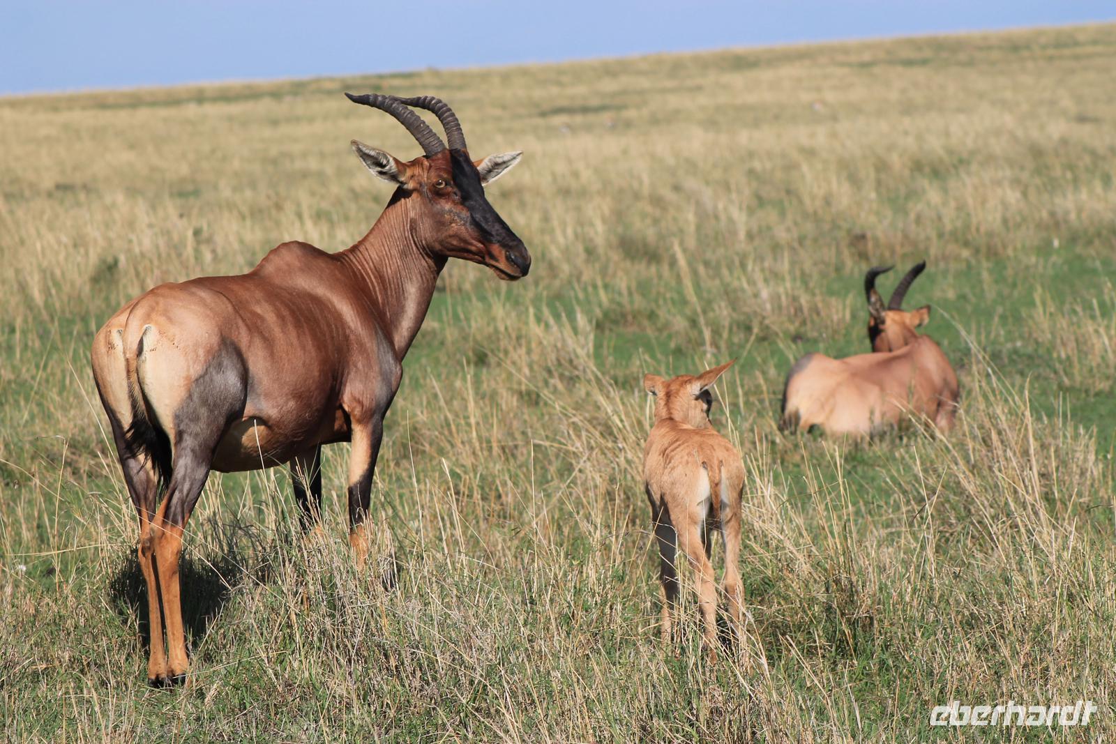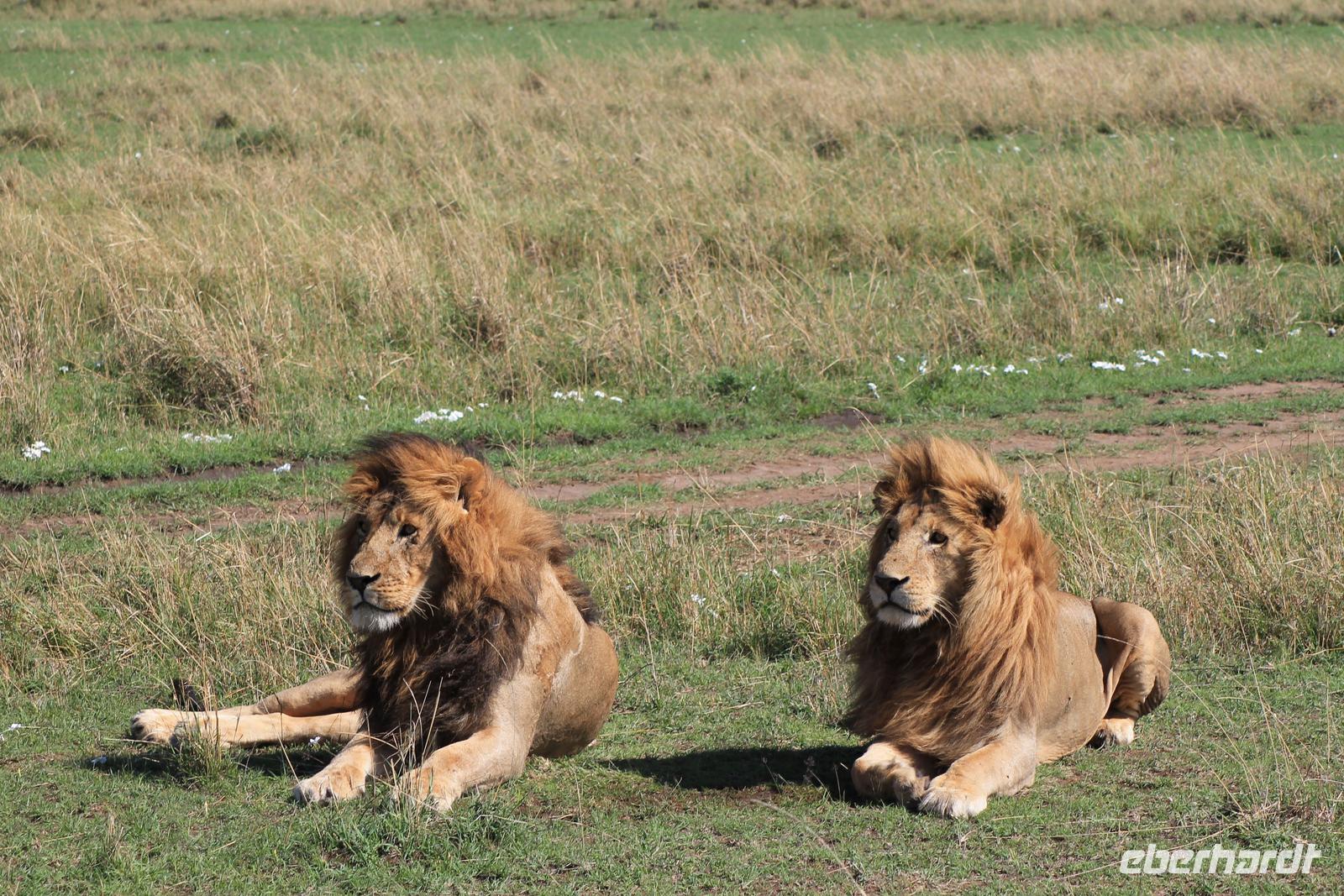 Heute hatten wir unser Frühstück dabei und so hielten wir auf einer Anhöhe und präparierten das leckere Frühstück auf den Motorhauben der beiden „Fahrerlieblinge": Jaqueline und Becci. Hier in der freien Natur schmeckte es gleich noch leckerer. Danach fuhren wir in ein Massaidorf, um mehr über die Traditionen dieses Nomadenstammes zu erfahren, der etwa 6 Prozent der kenianischen Bevölkerung ausmacht, bei uns aber sicher auch durch das Buch „Die weiße Massai" berühmt wurde. Wir wurden durch den Häuptling begrüßt - die Frauen unserer Gruppe von den jungen Massai-Männern. Im Anschluss wurde uns das berühmte Springen der Junggesellen vorgeführt - der der am höchsten springt, bekommt die schönste Freundin. Auch unsere männlichen Reisegäste durften sich beteiligen. Im Anschluss durften wir einen Blick in die Häuser der Massai werfen, die von den Frauen gebaut werden und meist 4 Räume haben. Wobei aus unserer Perspektive der Begriff "Räume" sehr großzügig gefasst ist... Im Anschluss durften wir noch einen Tanz der Frauen bestaunen und auch dort unsere „Künste" einbringen. Abschließend konnte man Handgefertigtes erwerben und die Reisegäste gaben die Geschenke, die sie extra aus Deutschland mitgebracht hatten, für die Kinder der Massai ab. Am meisten bewegte uns wahrscheinlich die Polygamie der Massai-Männer, denn darüber diskutierten wir noch am Abend um das Feuer in unserem Camp. Nach dem Mittagessen im Camp war eine kurze Ruhepause angesetzt, bevor wir noch einmal auf Pirsch gingen. Wir fuhren an den Marafluss, der jedes Jahr Schauplatz der berühmten Überquerung während der großen Wanderung ist. Leider ist er aber eben auch für viele Gnus der Platz, an dem sie ihr Leben lassen, da sie den Weg zwischen ihren vielen Artgenossen durch den teilweise hohen Fluss nicht schaffen. Die toten Kadaver bleiben liegen und werden von den Tieren gefressen. Den Geruch kann man sich lebhaft vorstellen - wir hielten ihn für einen Moment aus, um ein gigantisches Krokodil und auch ein paar Flusspferde zu fotografieren, flüchteten dann aber schnell. Wir konnten an diesem Nachmittag auch eine Elefantenfamilie sowie Hyänen beobachten. Zum krönenden Abschluss gab sich eine Löwenfamilie die Ehre und wir fuhren sehr zufrieden zurück ins Camp. Ein Giraffenjunges kreuzte noch unseren Weg und wir nutzten das tolle Sonnenuntergangslicht für ein paar wunderschöne Gruppenbilder.
