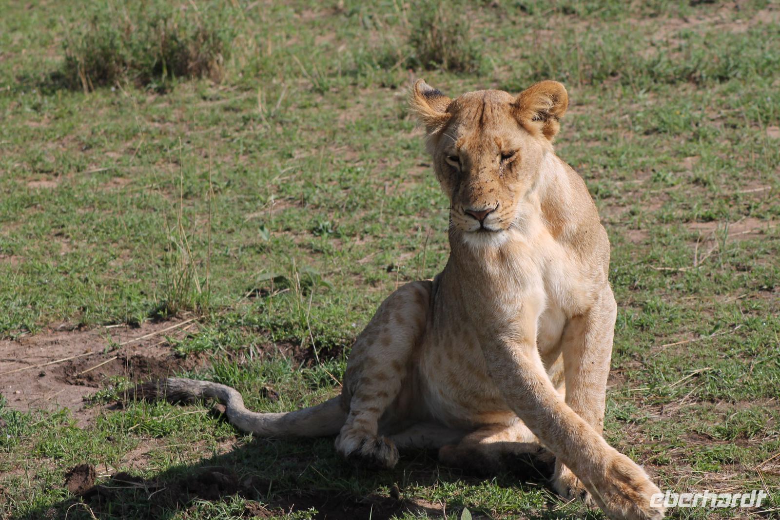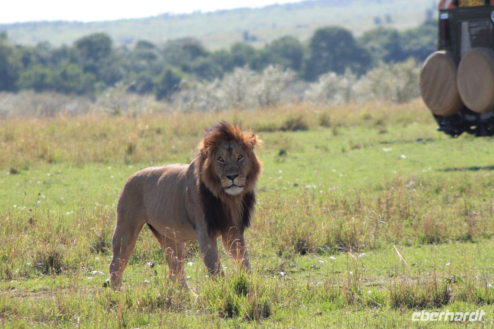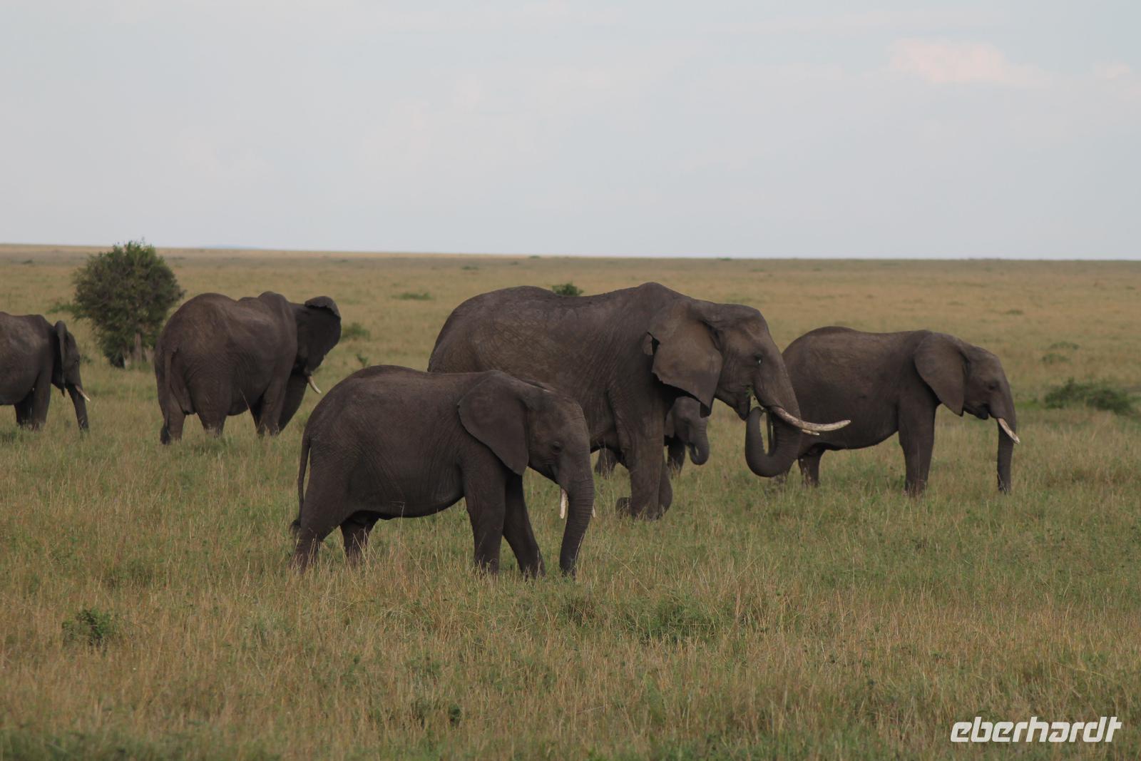 Vorm Frühstück stand heute ein kleiner Rechenmarathon auf dem Programm - letztendlich waren alle Rechnungen aber richtig. Das Frühstück wurde serviert: Fruchtplatte, selbst gemachter Smoothie und die Wahl zwischen englischem Frühstück mit Würstchen, Ei und Speck oder Cerealien. Gestärkt fuhren wir nun Richtung Masai Mara. Wir wussten, es stand uns eine lange Fahrt bevor, aber sie wurde noch länger als gedacht. In Narok kauften wir Bananen, da das Mittagessen spät werden würde. Nach einer langen Zeit auf der „Massagestraße", die in die Masai Mara führte, mussten wir einen Stopp für die Buschtoilette einlegen . Bei einem Ausweich, da die Straße gebaut wurde, setzte unser Jeep „Jacklin" mit Jackson leider auf. Wir mussten das Team Caleb zurück holen, damit sie uns aus der Misere helfen. Vielen Dank an dieser Stelle dafür! Der Weg zum Camp nahm irgendwie kein Ende und bei der Fahrt durch einen Fluss blieben wir mit dem Unterboden hängen und „verletzten" leider Jacklin, die dann am nächsten Tag soweit geflickt wurde, dass wir es wieder bis Nairobi schafften. Unterwegs sahen wir schon einige Tiere, aber wir wollten erst einmal das Camp erreichen. Am Matira Main Bush Camp angekommen, wurden wir kurz eingewiesen, denn Strom ist nur abends in den Zelten verfügbar, und man darf das Wasser nicht trinken, ansonsten sind die Zelte vergleichbar mit Hotelzimmern - auch Dusche und WC sind im Zelt vorhanden. Dann setzten wir uns schnell zum Mittagessen hin, denn es war schon 15 Uhr. Und anschließend starteten wir zur ersten Pirsch in der Masai Mara. Es gewitterte über der Serengeti, aber wir bekamen zum Glück nur ein paar Tropfen ab. Dann konnten wir bald gespannt den Tieren zuschauen: wir sahen ganz nah Elefanten, auch in der Musth, Gnus, Topis, Zebras, ein Flusspferd und zum Schluss 1 Löwenmutter mit 2 Jungen und ihren Bruder. Letztendlich konnten wir noch einen traumhaften Sonnenuntergang genießen. Beim Abendessen war vor allem die Suppe „der Renner", aber auch alles andere war sehr schmackhaft. Den Abend ließen wir in kleiner Runde um das Feuer sitzend ausklingen.