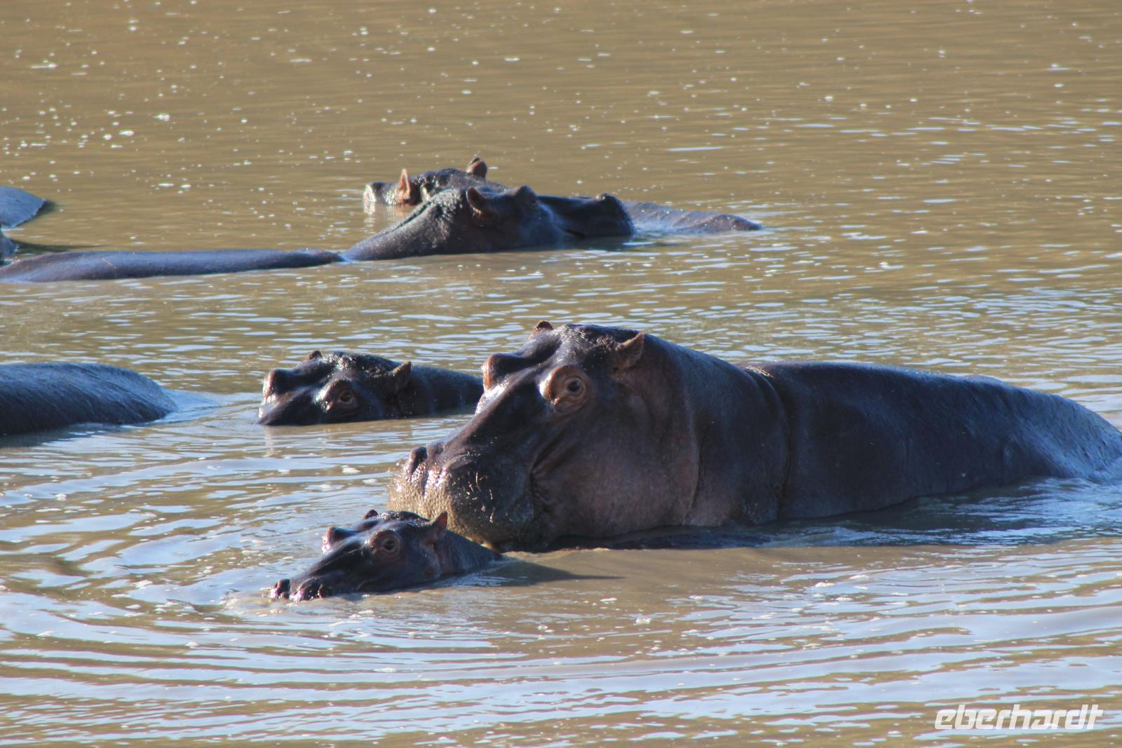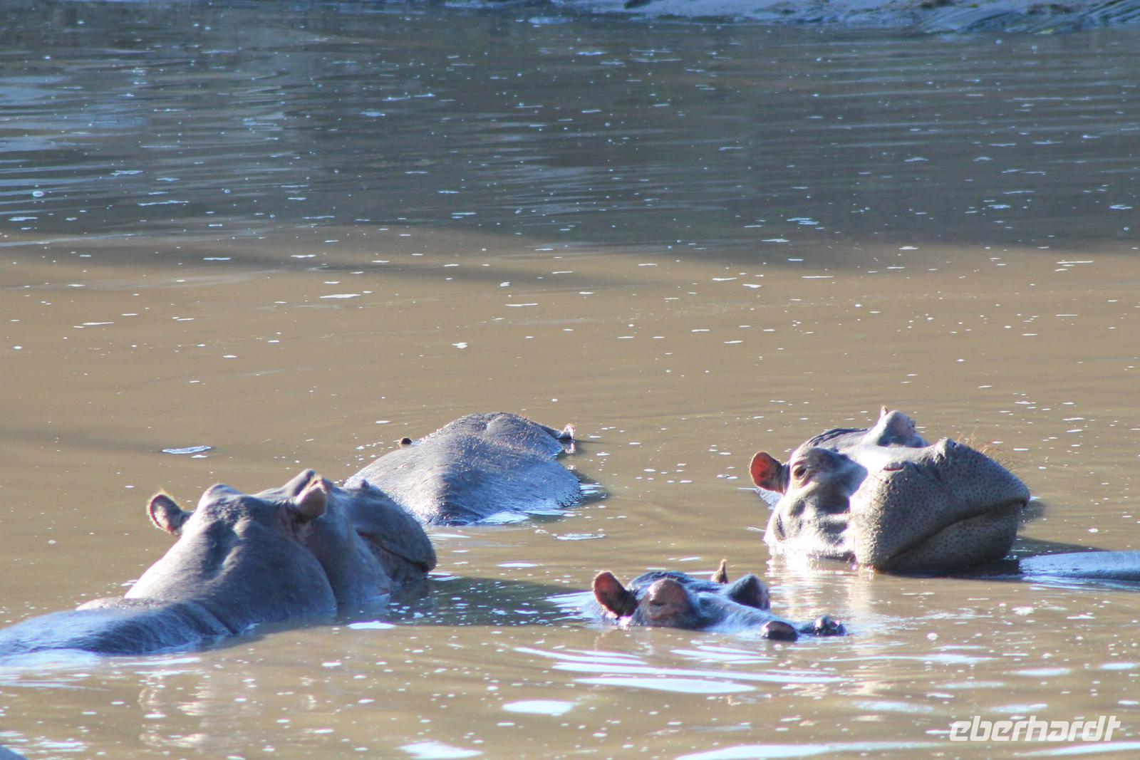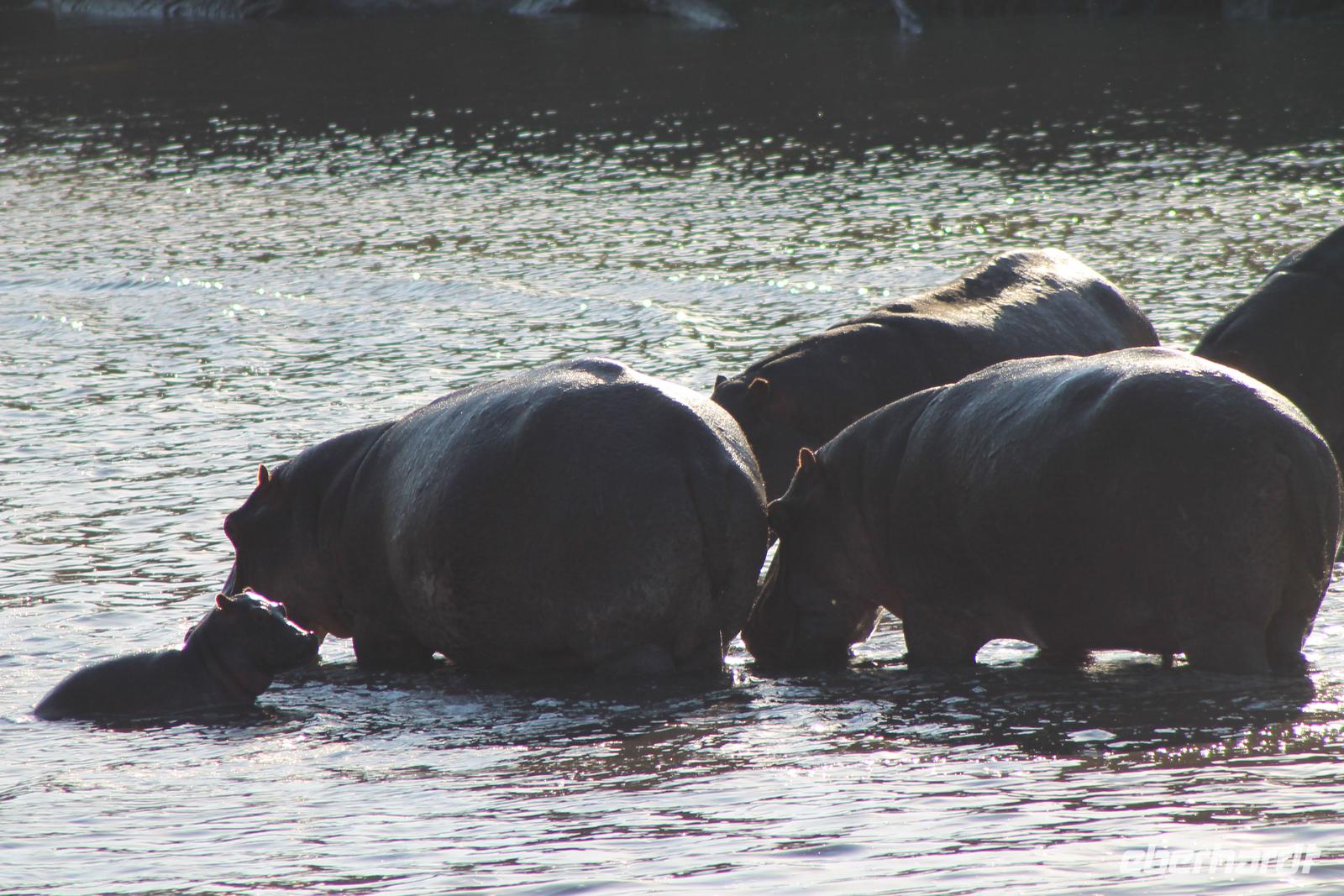 An das zeitige Aufstehen hatten sich schon (fast ) alle gewöhnt und so nutzten wir auch heute wieder den zeitigen Morgen für eine Pirschfahrt - nach Kaffee/Tee und Keksen machten wir uns zuerst auf den Weg zum „Hippo-Pool" - dort konnten wir aussteigen und die Flusspferde mit viel Zeit beobachten. Auch Junge waren unter den Flusspferden und so erklärte uns Leo, dass die Nilpferde ihre Jungen am Ufer bekommen, also nicht wie vielleicht gedacht im Wasser. Das grunzende Flusspferd an Land stellte sich dann als unser Chauffeur Jackson heraus. Auch unseren liebsten „Katzen", den Löwen kamen wir an diesem Morgen wieder ganz nah.