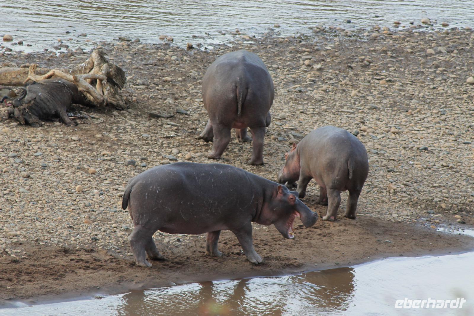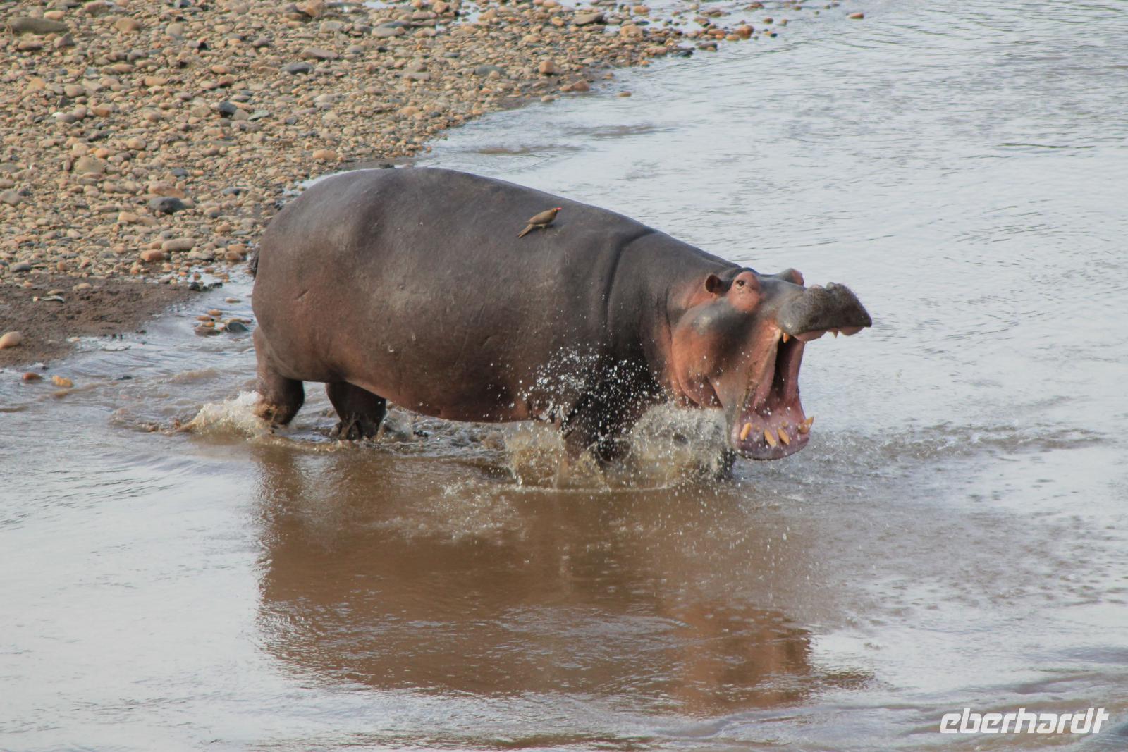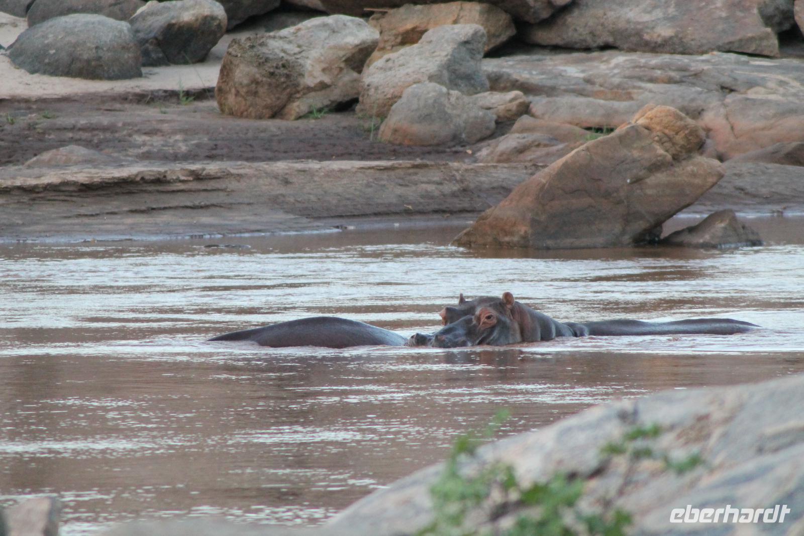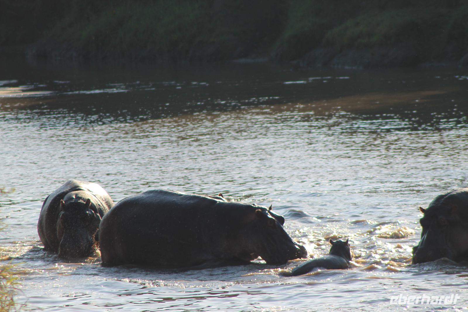 An das zeitige Aufstehen hatten sich schon (fast ) alle gewöhnt und so nutzten wir auch heute wieder den zeitigen Morgen für eine Pirschfahrt - nach Kaffee/Tee und Keksen machten wir uns zuerst auf den Weg zum „Hippo-Pool" - dort konnten wir aussteigen und die Flusspferde mit viel Zeit beobachten. Auch Junge waren unter den Flusspferden und so erklärte uns Leo, dass die Nilpferde ihre Jungen am Ufer bekommen, also nicht wie vielleicht gedacht im Wasser. Das grunzende Flusspferd an Land stellte sich dann als unser Chauffeur Jackson heraus. Auch unseren liebsten „Katzen", den Löwen kamen wir an diesem Morgen wieder ganz nah.