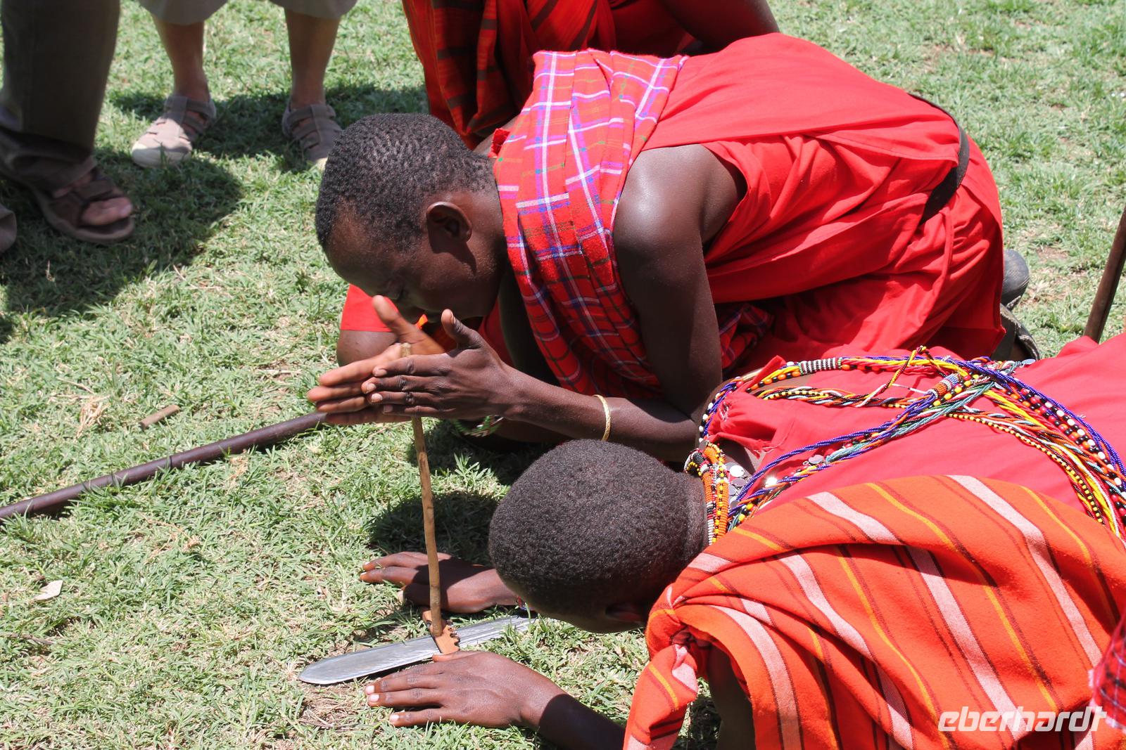 Als es dunkel wurde, hielten wir auf einem Berg und - siehe da - vor uns war eine Überraschung aufgebaut: Buschdinner. Die Tische waren sehr schön eingedeckt, der Koch unseres Matira-Camps hatte wieder wunderbare Speisen vorbereitet und am Rande des Geschehens loderte ein Feuer. Glück hatten wir, denn die Regenwolken ließen nur einige Tropfen fallen und verzogen sich dann. Auch der Wind wurde schwächer und so genossen wir eine kleine Darbietung der Massai am Feuer im Anschluss an unser leckeres Abendessen.
