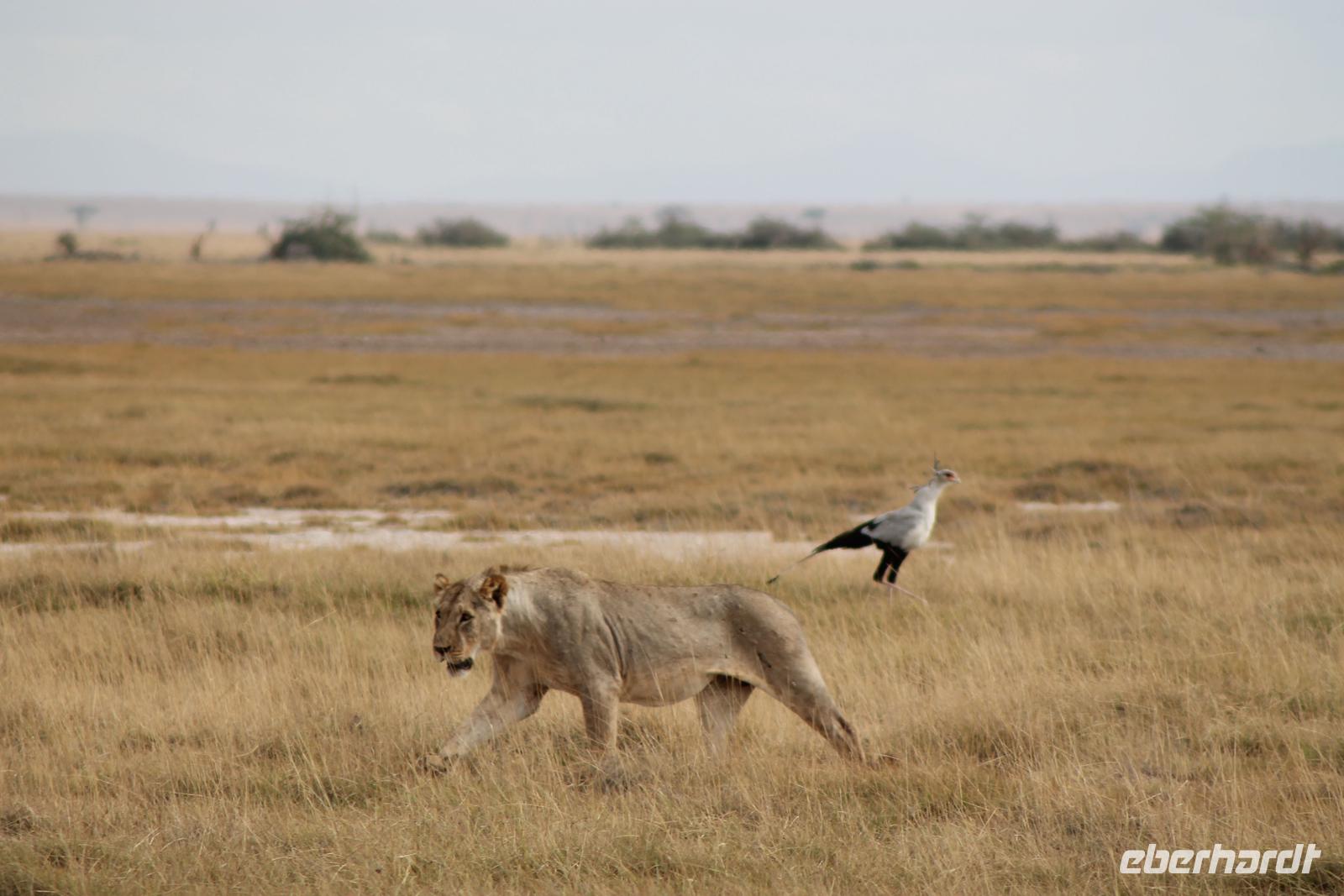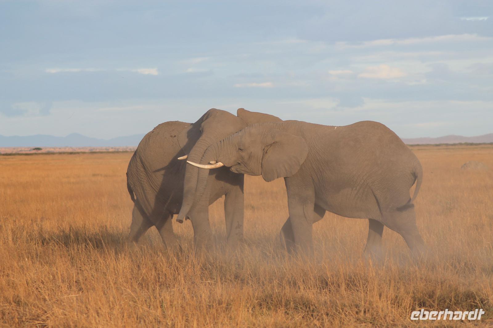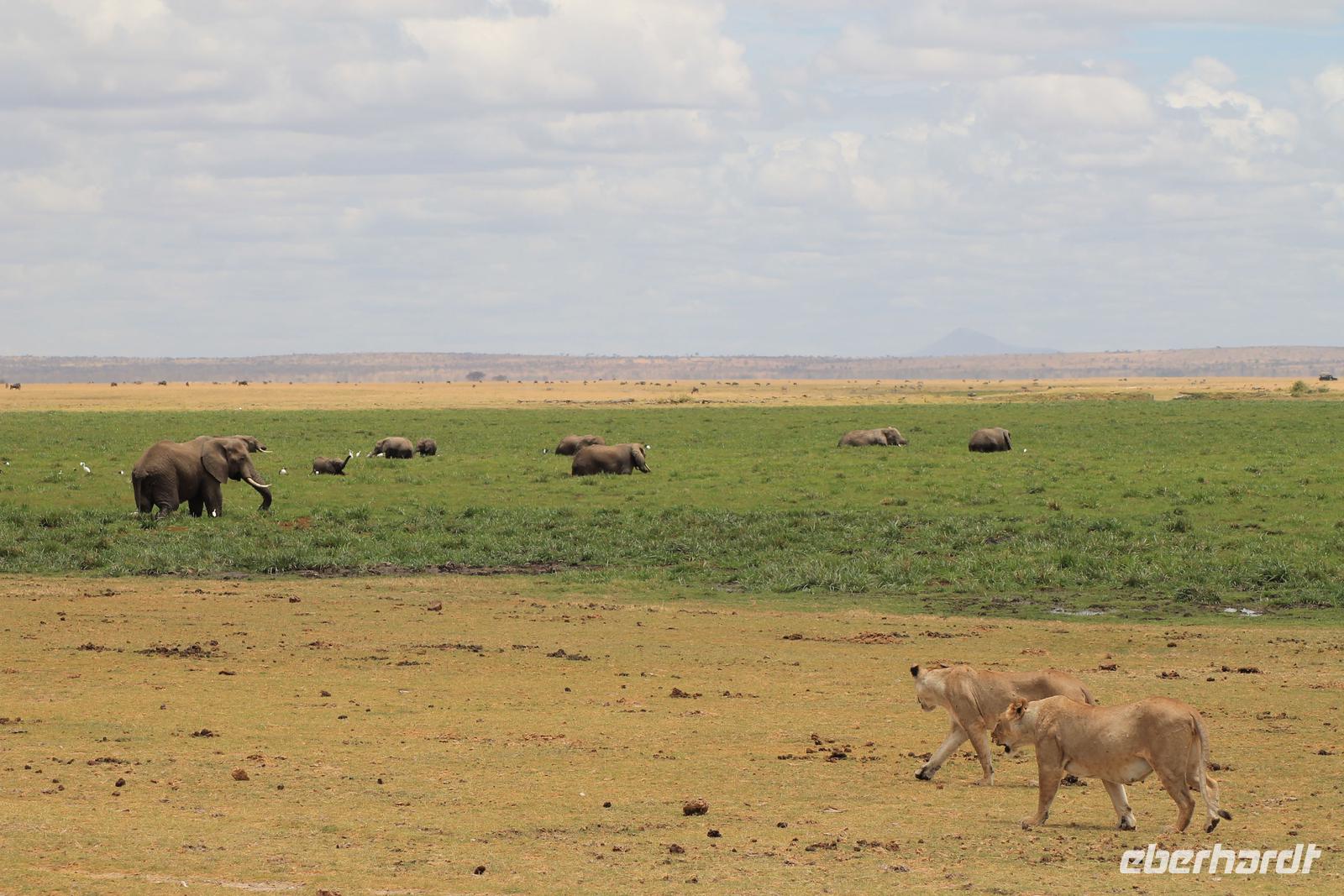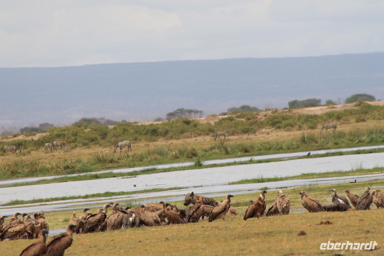 Um möglichst „Katzen" zu sehen und natürlich auch die wunderbare Stimmung um den höchsten frei stehenden Berg der Welt mit 5.898 Metern, den Kilimandscharo, einzufangen, ging es nach Kaffee und einer Kleinigkeit wieder zeitig auf Pirsch. Auch die frechen Affen in der Lodge hatten uns mit einem kleinen Angriff begrüßt, sich den Kuchen zu eigen gemacht und dabei auch noch eine Tasse Kaffee umgestoßen. Davon ließ sich aber keiner die Laune verderben und wir starteten. Der Amboseli-Nationalpark ist nicht so groß, unterscheidet sich aber von den bereits gesehenen auch landschaftlich sehr, denn hier findet man große Sumpfgebiete und viele Palmenhaine - das Schlafzimmer der Katzen, denen wir heute Morgen auch begegneten. Wir sahen eine Riesentrappe, einen Sekretär, natürlich Gnus, Zebras und viele viele Elefanten, auch schön positioniert vorm "Kili" . Wir kamen den Tüpfelhyänen sehr nah und konnten beim Verspeisen eines Zebras zuschauen. Dann stärkten wir uns erst einmal wieder am reichlichen Frühstücks-Buffet, bevor es noch einmal auf Pirsch ging. Auch diesmal gaben uns die Löwen die Ehre und wir konnten eine Weile zwei Weibchen beobachten, eine davon trächtig. Anscheinend war es aber zu warm für die Jagd, denn sie legten sich nieder und wir „pirschten" weiter. Im Sumpf findet man natürlich auch viele "Hippos", die ebenfalls auf dem Foto verewigt wurden. Um die besondere Landschaft des Amboseli-Nationalparks richtig bewundern zu können, bestiegen wir den Observation Hill und staunten von oben. Nach dem Mittagessen konnte man auf der eigenen Terrasse entspannen oder ein kühlendes Bad im Pool nehmen, bevor es um vier noch einmal auf Tierschau ging. Die erste Fotostrecke wurde bei einer großen Herde Giraffen angefertigt, die nächste bei den riesigen Elefantenherden mit dem wunderschönen Hintergrund des "Kili". Einige Elefanten übten sich im Kräfte messen und wirbelten dabei mächtig Staub auf. Nach dem Abendessen vom riesigen Buffet machten wir es uns bei einem Glas Wein auf der Terrasse gemütlich, der Elefant stattete uns heute allerdings keinen Besuch ab.