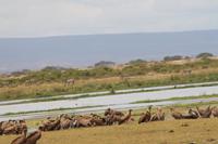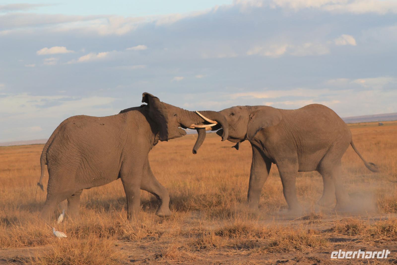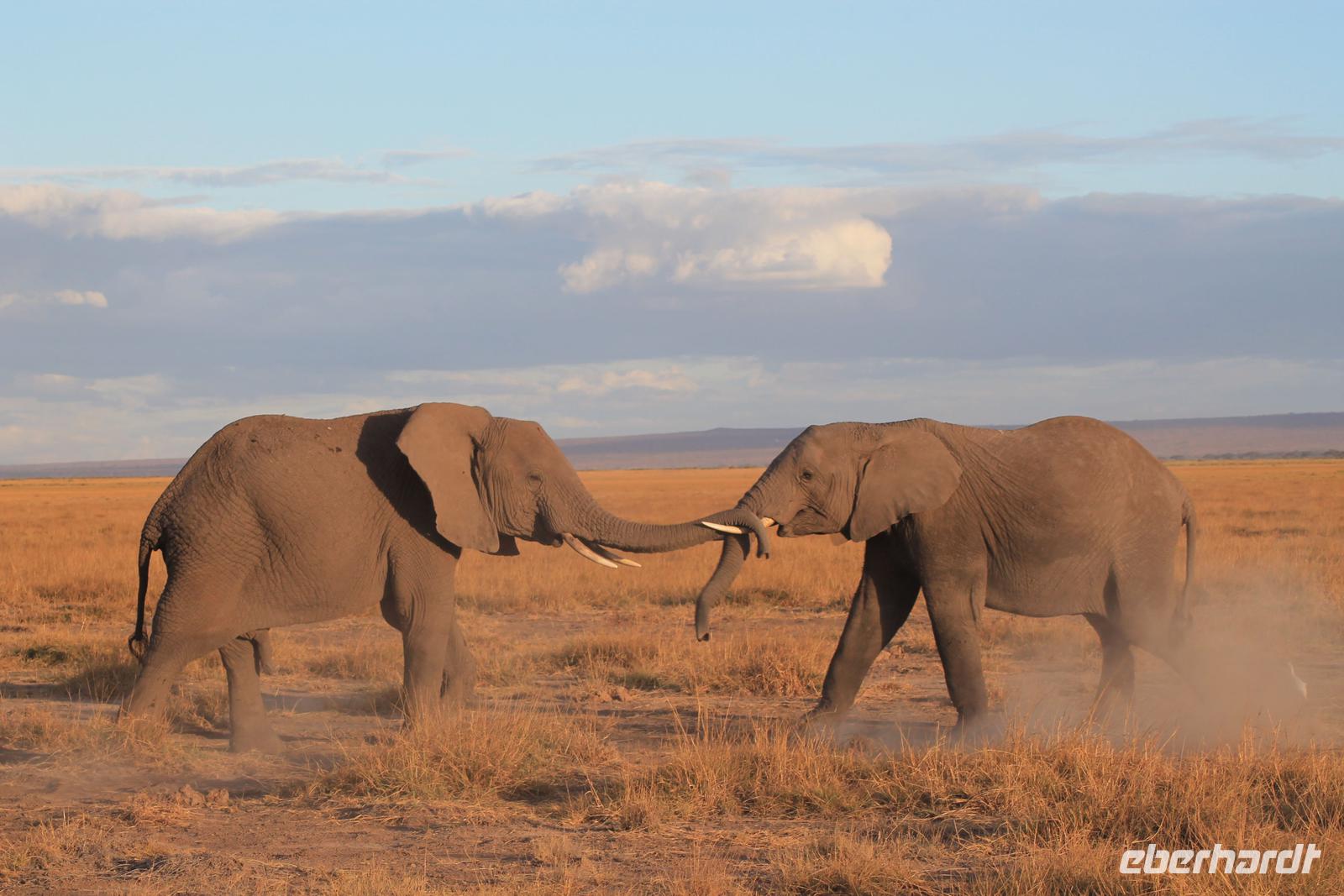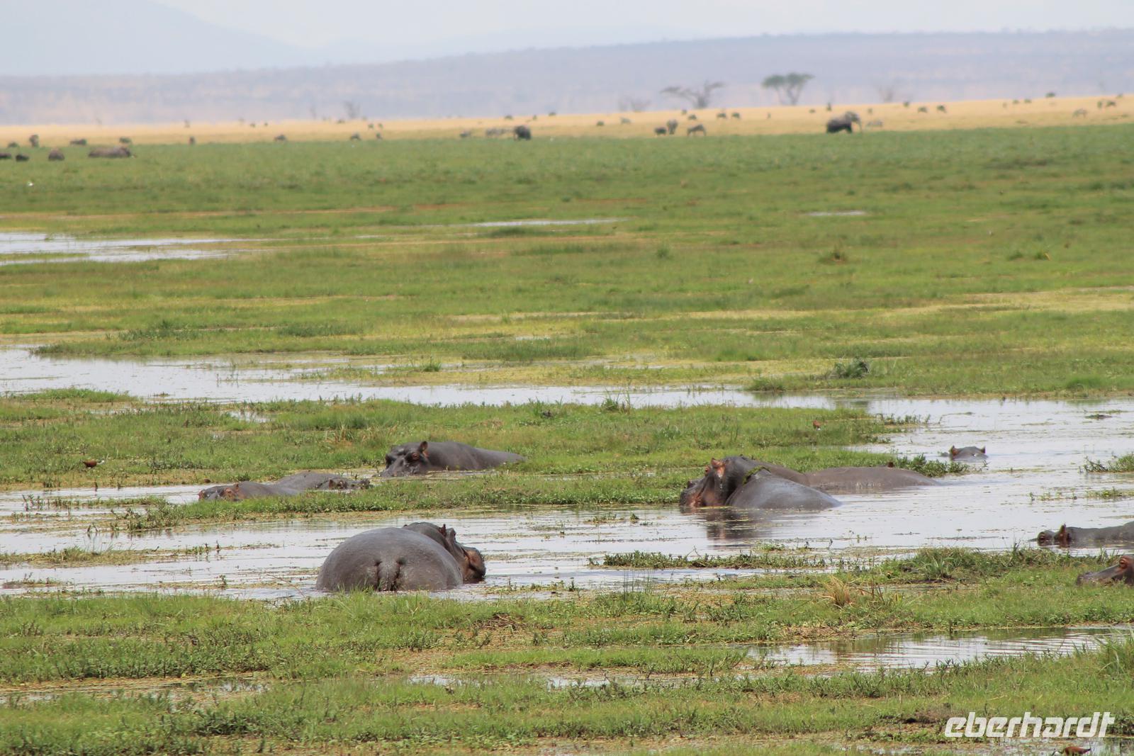 Um möglichst „Katzen" zu sehen und natürlich auch die wunderbare Stimmung um den höchsten frei stehenden Berg der Welt mit 5.898 Metern, den Kilimandscharo, einzufangen, ging es nach Kaffee und einer Kleinigkeit wieder zeitig auf Pirsch. Auch die frechen Affen in der Lodge hatten uns mit einem kleinen Angriff begrüßt, sich den Kuchen zu eigen gemacht und dabei auch noch eine Tasse Kaffee umgestoßen. Davon ließ sich aber keiner die Laune verderben und wir starteten. Der Amboseli-Nationalpark ist nicht so groß, unterscheidet sich aber von den bereits gesehenen auch landschaftlich sehr, denn hier findet man große Sumpfgebiete und viele Palmenhaine - das Schlafzimmer der Katzen, denen wir heute Morgen auch begegneten. Wir sahen eine Riesentrappe, einen Sekretär, natürlich Gnus, Zebras und viele viele Elefanten, auch schön positioniert vorm "Kili" . Wir kamen den Tüpfelhyänen sehr nah und konnten beim Verspeisen eines Zebras zuschauen. Dann stärkten wir uns erst einmal wieder am reichlichen Frühstücks-Buffet, bevor es noch einmal auf Pirsch ging. Auch diesmal gaben uns die Löwen die Ehre und wir konnten eine Weile zwei Weibchen beobachten, eine davon trächtig. Anscheinend war es aber zu warm für die Jagd, denn sie legten sich nieder und wir „pirschten" weiter. Im Sumpf findet man natürlich auch viele "Hippos", die ebenfalls auf dem Foto verewigt wurden. Um die besondere Landschaft des Amboseli-Nationalparks richtig bewundern zu können, bestiegen wir den Observation Hill und staunten von oben. Nach dem Mittagessen konnte man auf der eigenen Terrasse entspannen oder ein kühlendes Bad im Pool nehmen, bevor es um vier noch einmal auf Tierschau ging. Die erste Fotostrecke wurde bei einer großen Herde Giraffen angefertigt, die nächste bei den riesigen Elefantenherden mit dem wunderschönen Hintergrund des "Kili". Einige Elefanten übten sich im Kräfte messen und wirbelten dabei mächtig Staub auf. Nach dem Abendessen vom riesigen Buffet machten wir es uns bei einem Glas Wein auf der Terrasse gemütlich, der Elefant stattete uns heute allerdings keinen Besuch ab.