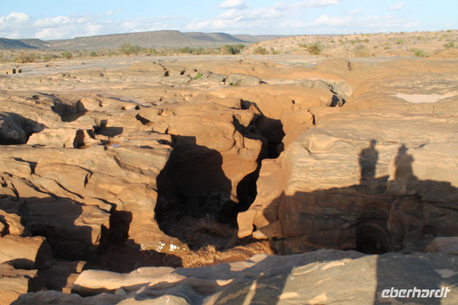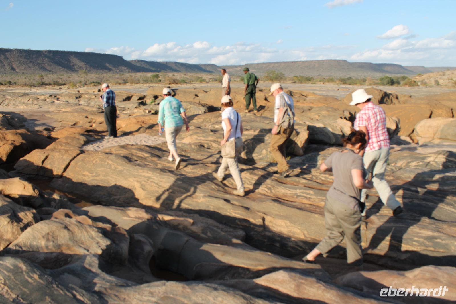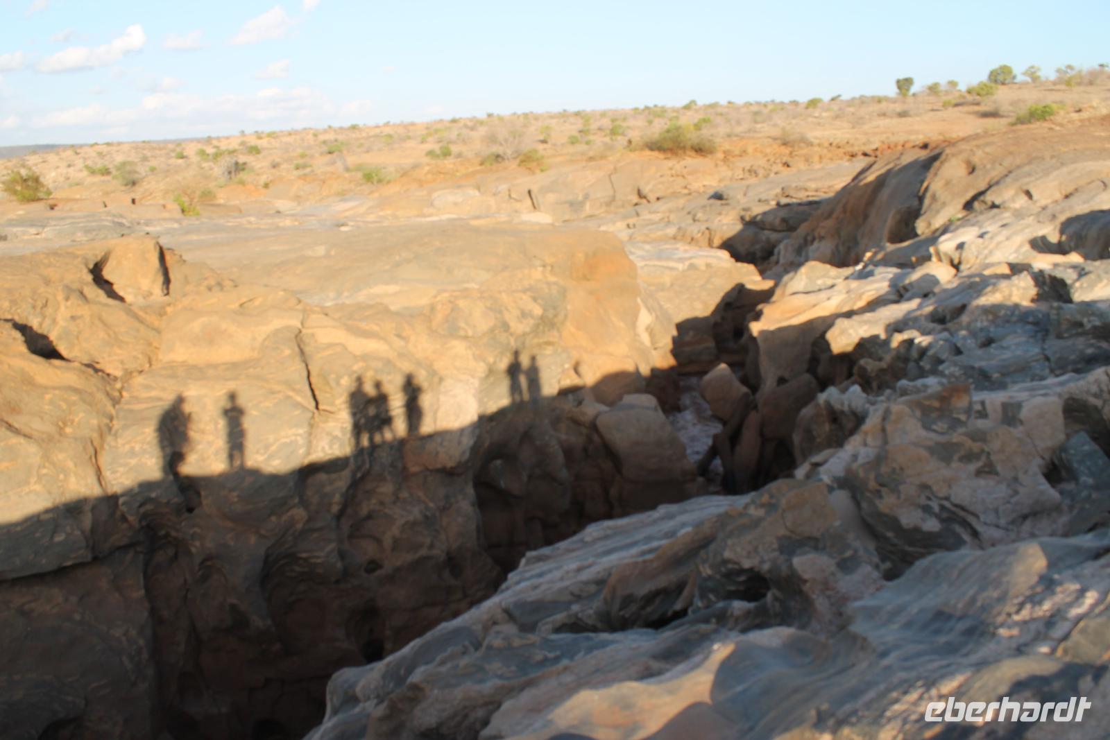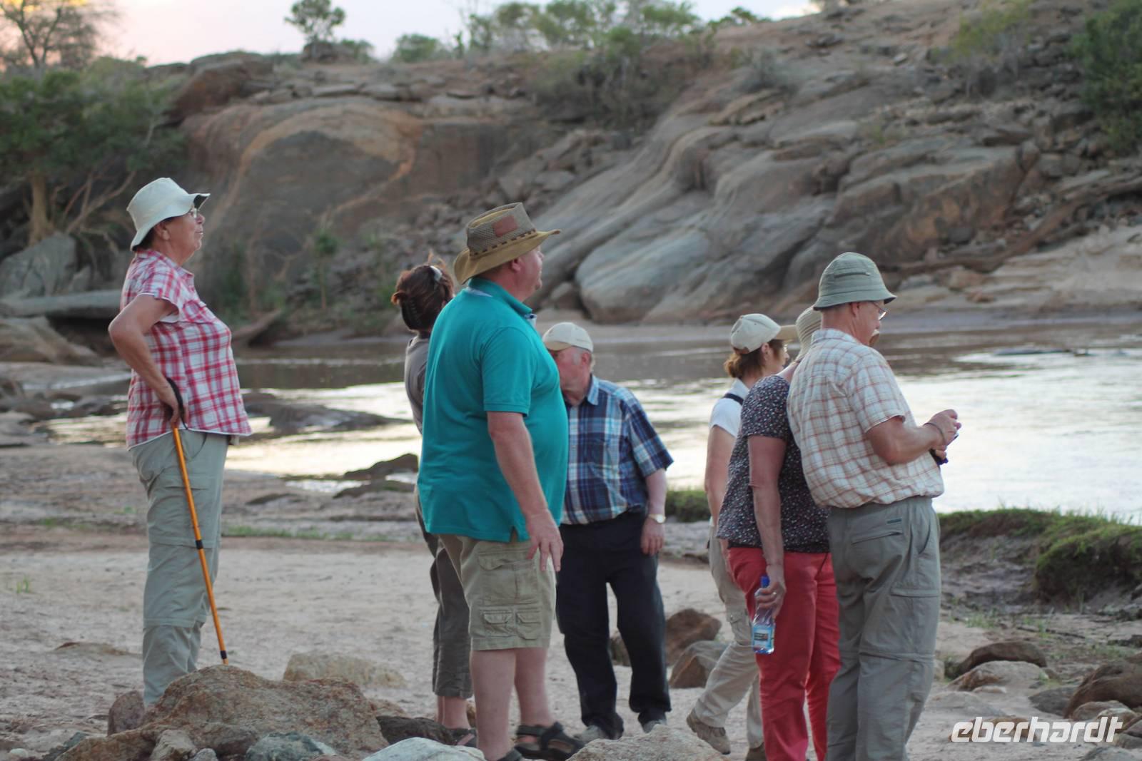 Um dem während der Reise verliehenen Titel „Frühaufsteher-Reise" gerecht zu werden, ging es auch heute Morgen kurz nach Sonnenaufgang auf Pirsch. Zuerst stärkten sich alle beim Frühstück mit Blick auf die Flusspferde im Galana-Fluss und den vorbei streifenden Elefanten. Dann ging es auf Pirsch. Heute hatte Leo einen Orden verdient, denn er hatte 2 Löwen-Männchen im Gestrüpp entdeckt. Diese waren über unsere Anwesenheit allerdings weniger erfreut und versteckten sich schnell noch weiter. Die roten Elefanten in der weiß-gelben, trockenen Dornbuschsavanne waren ebenfalls ein Foto wert. Wir sahen die Giraffengazellen, die sich von anderen Antilopen bezüglich ihres Fressverhaltens unterscheiden - da sie Blätter dem Gras vorziehen. Dies wurde uns auch gleich imposant präsentiert. Eine kurze Pause legten wir in der Nähe des Haupteingangs und des Ortes Voi ein. Dort sahen wir dann noch einen schönen Tier-Cocktail: ein Topi, Kuh-Antilopen, ein Buschfunk, Zebras, rote Elefanten, eine Straußfamilie und Impalas. Bei der Nahaufnahme eines Elefanten zeigte dieser uns seine Angriffslust, sodass wir dann den Rückzug antraten. Zurück im Camp wurden wir wieder von den Elefanten begrüßt, bevor wir unser leckeres Mittagessen genossen und unsere Wanderung in der Nähe der Lugard-Wasserfälle antraten. Hierbei handelt es sich nicht um spektakuläre Wasserfälle mit Wassermassen oder besonderer Fallhöhe, sondern eher um einen sehr interessanten Wasserlauf des Galana-Flusses und außergewöhnliche Gesteinsformationen und Hinterlassenschaften des Vulkanausbruchs, der diese Landschaft formte. Die romantische Sonnenuntergangsstimmung zusammen mit den nahen Naturerlebnissen und den Erläuterungen des Rangers machten aus diesem Spaziergang eine runde Sache. Abschließend sahen wir noch einige Krokodile und "Hippos" in greifbarer Nähe und einer der Ranger zeigte uns, wie man ohne moderne Mittel schnell und effektiv Feuer macht - schließlich kennt er mit seinen 81 Jahren, die er immer hier verbrachte, noch die Zeit, in der man Elefanten zum Verzehr jagte und sie dann über selbst gemachtem Feuer grillte. „Unsere Jungs" begrüßten uns am Ende der Wanderung wieder zusammen mit einer unserer Gäste und wir begaben uns im Dunkeln zurück in unser Camp. Beim Abendessen leisteten uns Leo, Caleb und Jackson Gesellschaft und wir konnten uns gebührend bei ihnen für die tolle, erlebnisreiche und vielfältige Zeit bedanken, die sie uns hier in Kenia ermöglicht hatten! Auch mir wurde Dank zuteil, über den ich mich sehr freute. Beim Blick in den klaren abendlichen Afrika-Himmel wurde schon ein wenig Wehmut laut, aber wir genossen noch einmal die Idylle im Galdessa Camp.