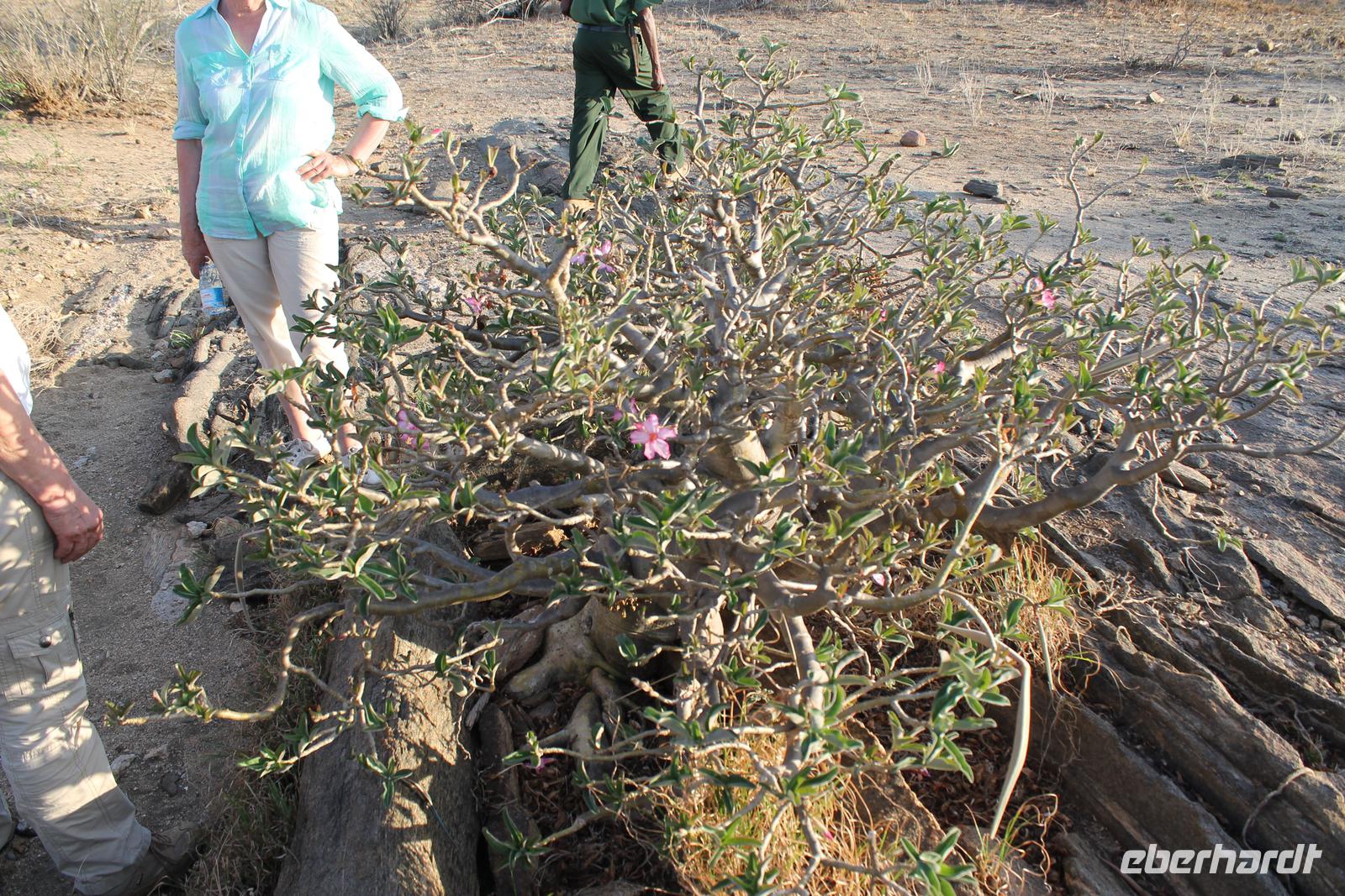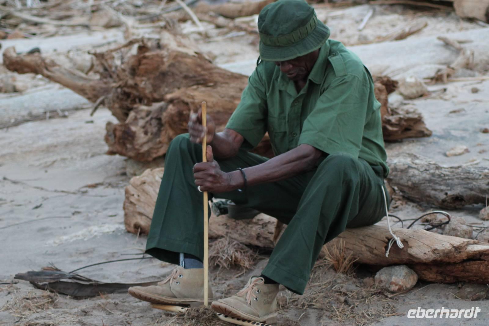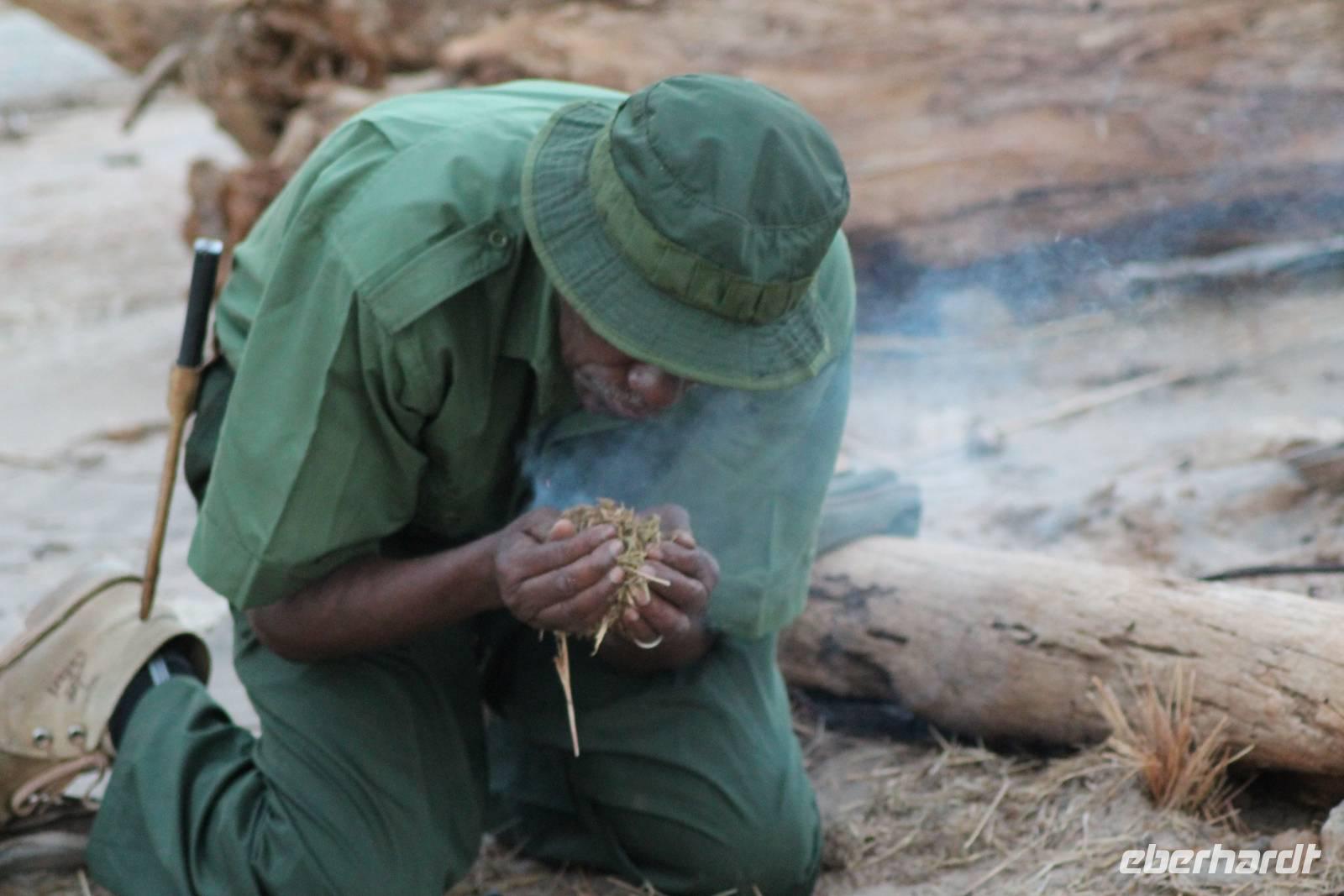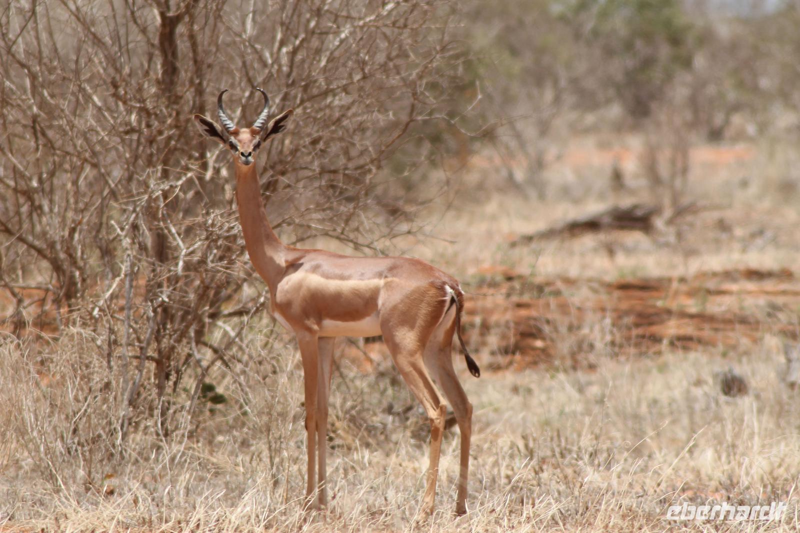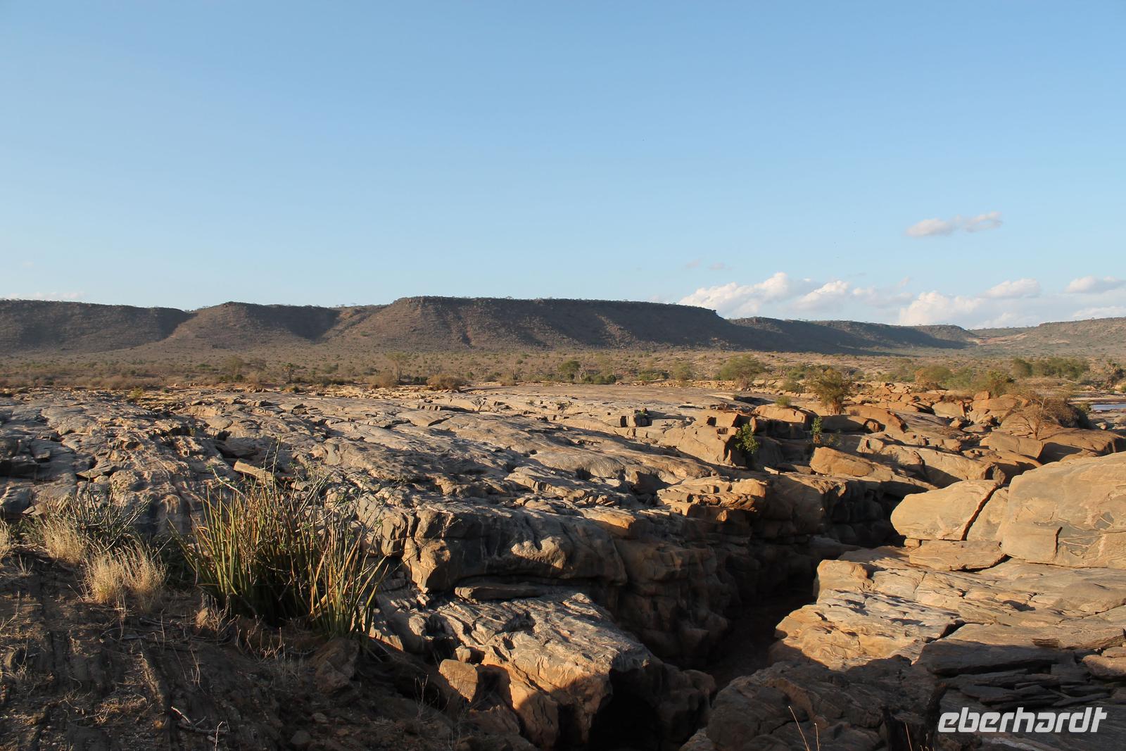 Um dem während der Reise verliehenen Titel „Frühaufsteher-Reise" gerecht zu werden, ging es auch heute Morgen kurz nach Sonnenaufgang auf Pirsch. Zuerst stärkten sich alle beim Frühstück mit Blick auf die Flusspferde im Galana-Fluss und den vorbei streifenden Elefanten. Dann ging es auf Pirsch. Heute hatte Leo einen Orden verdient, denn er hatte 2 Löwen-Männchen im Gestrüpp entdeckt. Diese waren über unsere Anwesenheit allerdings weniger erfreut und versteckten sich schnell noch weiter. Die roten Elefanten in der weiß-gelben, trockenen Dornbuschsavanne waren ebenfalls ein Foto wert. Wir sahen die Giraffengazellen, die sich von anderen Antilopen bezüglich ihres Fressverhaltens unterscheiden - da sie Blätter dem Gras vorziehen. Dies wurde uns auch gleich imposant präsentiert. Eine kurze Pause legten wir in der Nähe des Haupteingangs und des Ortes Voi ein. Dort sahen wir dann noch einen schönen Tier-Cocktail: ein Topi, Kuh-Antilopen, ein Buschfunk, Zebras, rote Elefanten, eine Straußfamilie und Impalas. Bei der Nahaufnahme eines Elefanten zeigte dieser uns seine Angriffslust, sodass wir dann den Rückzug antraten. Zurück im Camp wurden wir wieder von den Elefanten begrüßt, bevor wir unser leckeres Mittagessen genossen und unsere Wanderung in der Nähe der Lugard-Wasserfälle antraten. Hierbei handelt es sich nicht um spektakuläre Wasserfälle mit Wassermassen oder besonderer Fallhöhe, sondern eher um einen sehr interessanten Wasserlauf des Galana-Flusses und außergewöhnliche Gesteinsformationen und Hinterlassenschaften des Vulkanausbruchs, der diese Landschaft formte. Die romantische Sonnenuntergangsstimmung zusammen mit den nahen Naturerlebnissen und den Erläuterungen des Rangers machten aus diesem Spaziergang eine runde Sache. Abschließend sahen wir noch einige Krokodile und "Hippos" in greifbarer Nähe und einer der Ranger zeigte uns, wie man ohne moderne Mittel schnell und effektiv Feuer macht - schließlich kennt er mit seinen 81 Jahren, die er immer hier verbrachte, noch die Zeit, in der man Elefanten zum Verzehr jagte und sie dann über selbst gemachtem Feuer grillte. „Unsere Jungs" begrüßten uns am Ende der Wanderung wieder zusammen mit einer unserer Gäste und wir begaben uns im Dunkeln zurück in unser Camp. Beim Abendessen leisteten uns Leo, Caleb und Jackson Gesellschaft und wir konnten uns gebührend bei ihnen für die tolle, erlebnisreiche und vielfältige Zeit bedanken, die sie uns hier in Kenia ermöglicht hatten! Auch mir wurde Dank zuteil, über den ich mich sehr freute. Beim Blick in den klaren abendlichen Afrika-Himmel wurde schon ein wenig Wehmut laut, aber wir genossen noch einmal die Idylle im Galdessa Camp.