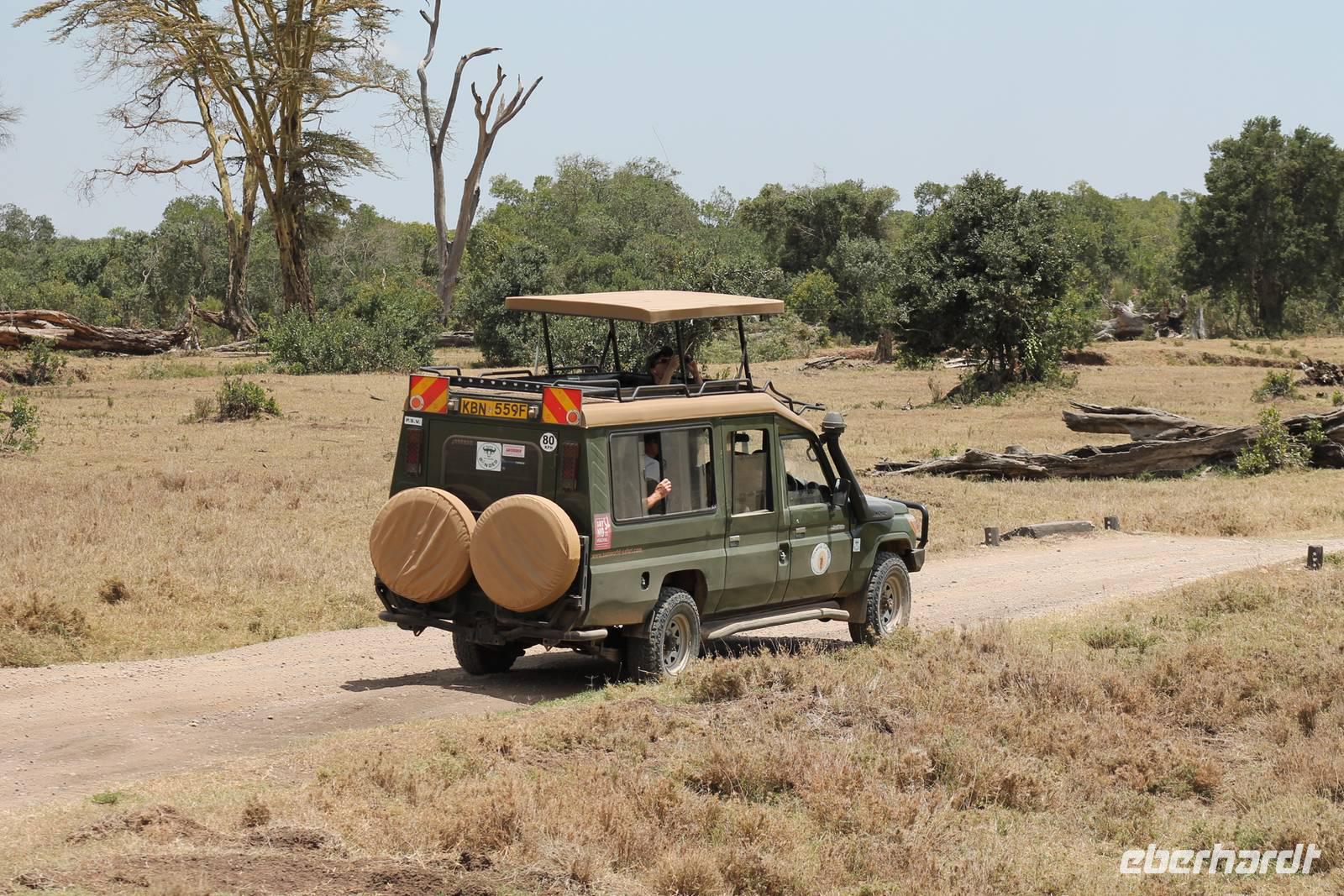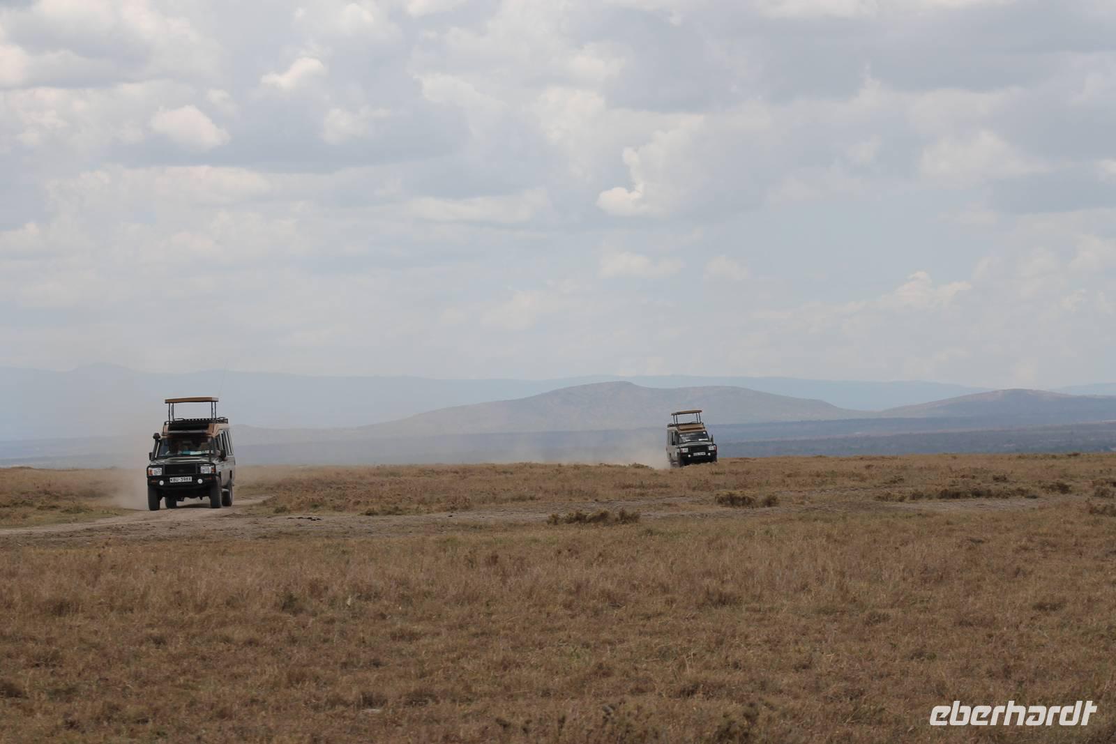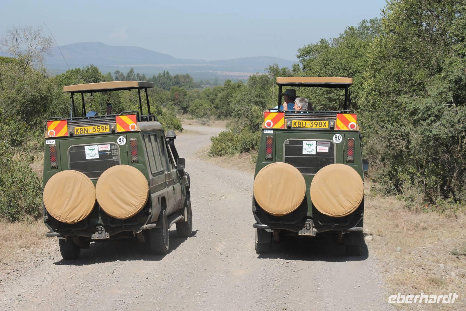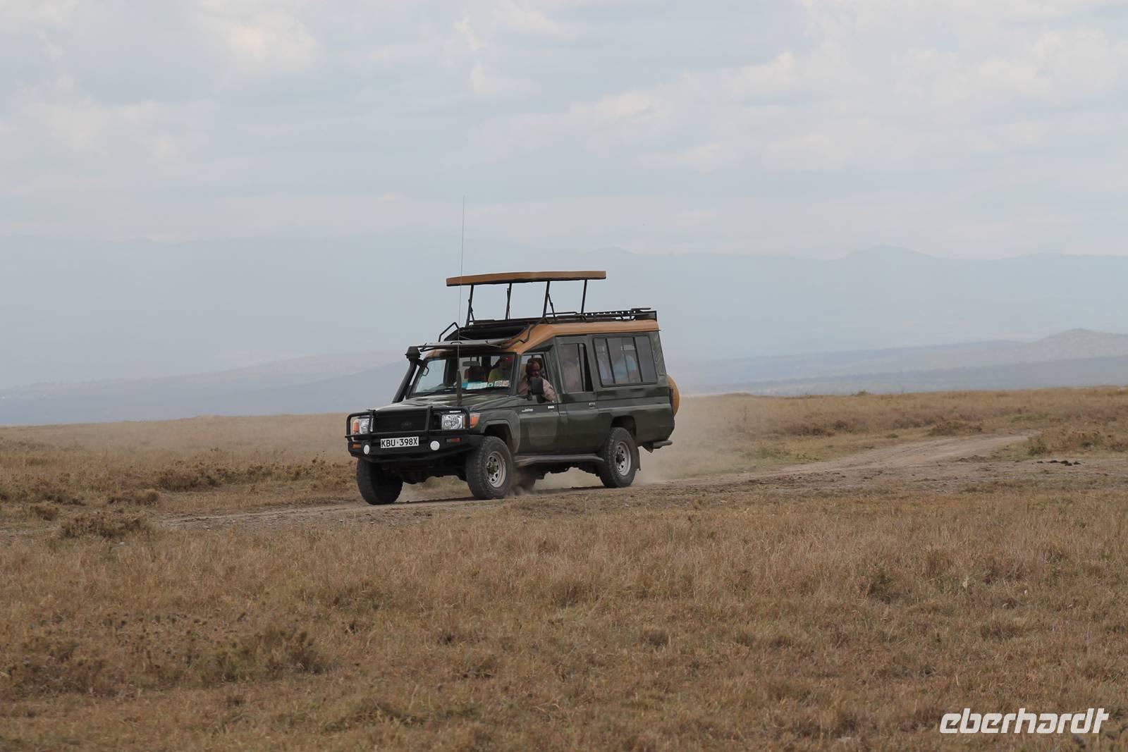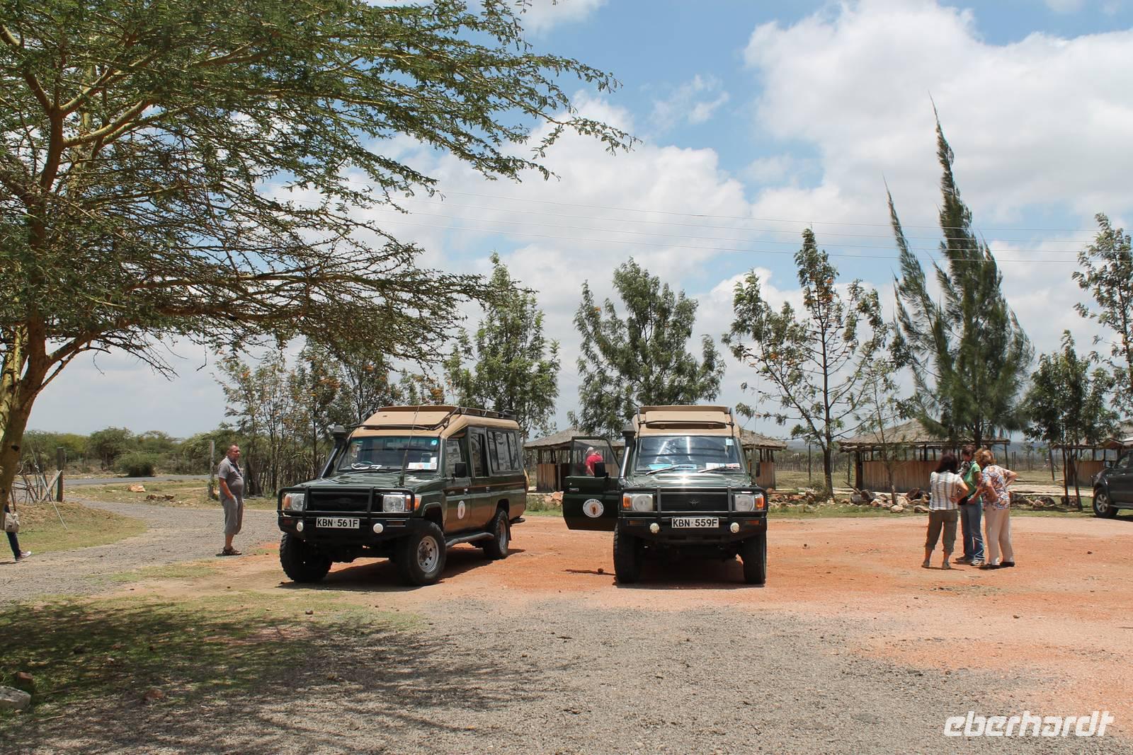 Am Flughafen nutzen wir noch die Möglichkeit um unsere Euronen in Kenianische Schilling umzutauschen und fühlen uns damit gleich viel wohler und ein bisschen „einheimischer". Es ist ja auch nicht schlecht, mal um die 300.000 Kenianische Schilling zu besitzen. Da fühlt man sich doch fast wie ein Millionär. Am Flughafen sind wir froh, dass wir von unserem örtlichen Reiseleiter Leonard herzlich empfangen werden und fühlen uns bei ihm gleich wohl und sicher. Hier begrüßen wir auch unsere drei Jeepfahrer, die uns auf unserer wunderbaren Rundreise begleiten werden: Jackson, Armstrong und Capell. Die Plätze in den Jeeps sind schnell verteilt und auch die Koffer verstaut. Jeder Gast verfügt über einen Fensterplatz und auch so bieten die Jeeps allerlei Platz und Komfort und sind vor allem für unsere Safaris ideal geeignet, da sich das Dach der Fahrzeuge öffnen lässt. So erleben wir heute schon unsere erste Safari durch die Vorstadt von Nairobi und erreichen kurze Zeit später unser Eka Hotel, nicht weit vom Flughafen gelegen. Hier beziehen wir unsere Zimmer und treffen uns kurze Zeit später wieder für einen Willkommensdrink und eine kurze Vorstellung der Reise. Hier merken wir auch, dass das kenianische Bier Tusker wundervoll köstlich schmeckt und es uns auf unserer Reise täglich begleiten wird. Anschließend fallen wir nach einem langen Tag alle in unsere Betten und freuen uns auf die nächsten Tage.