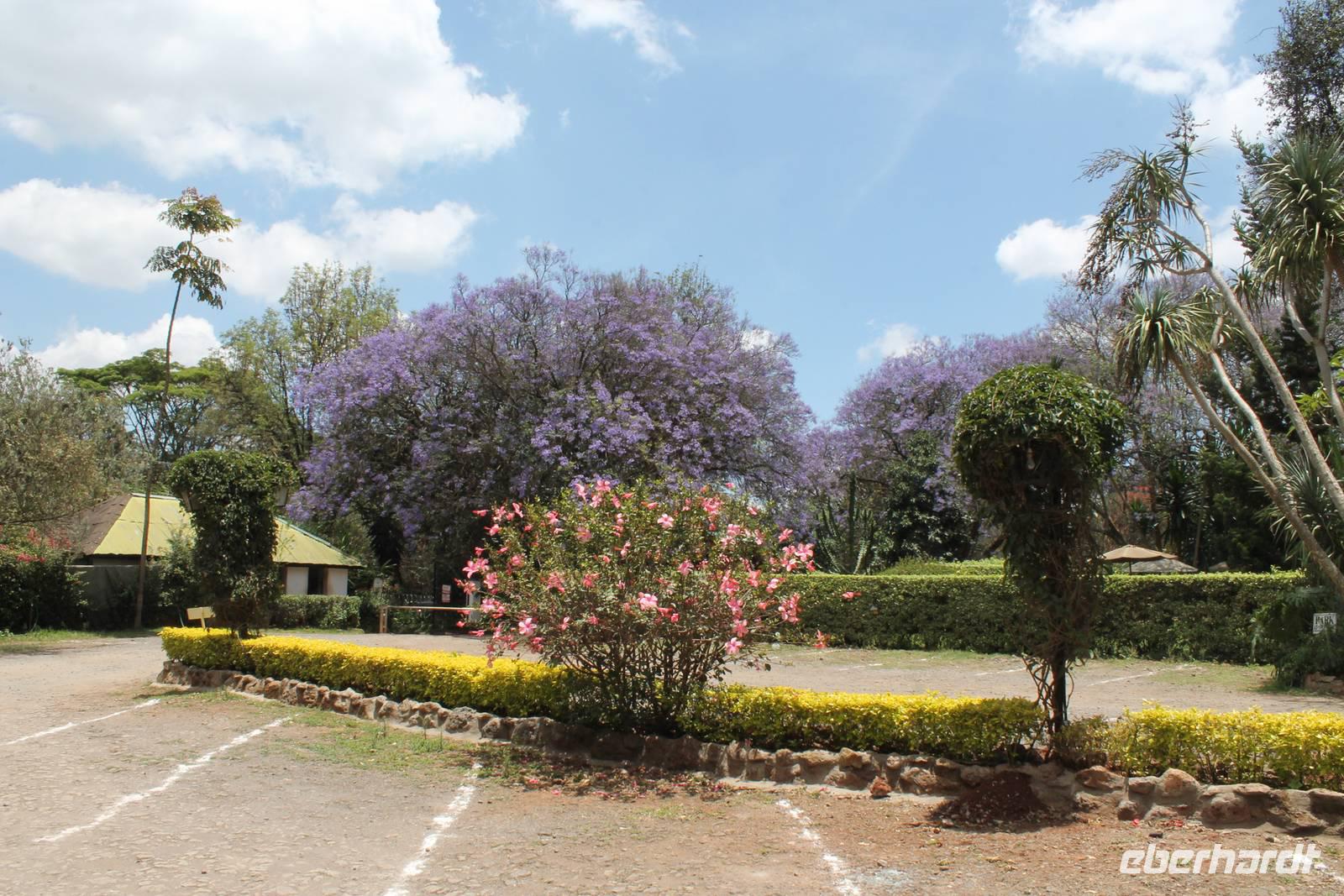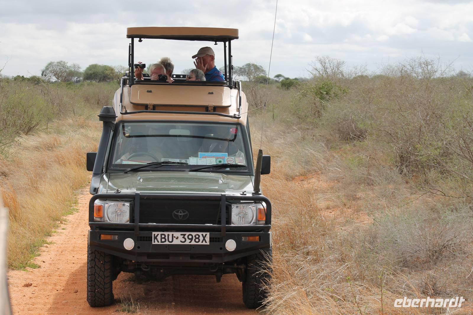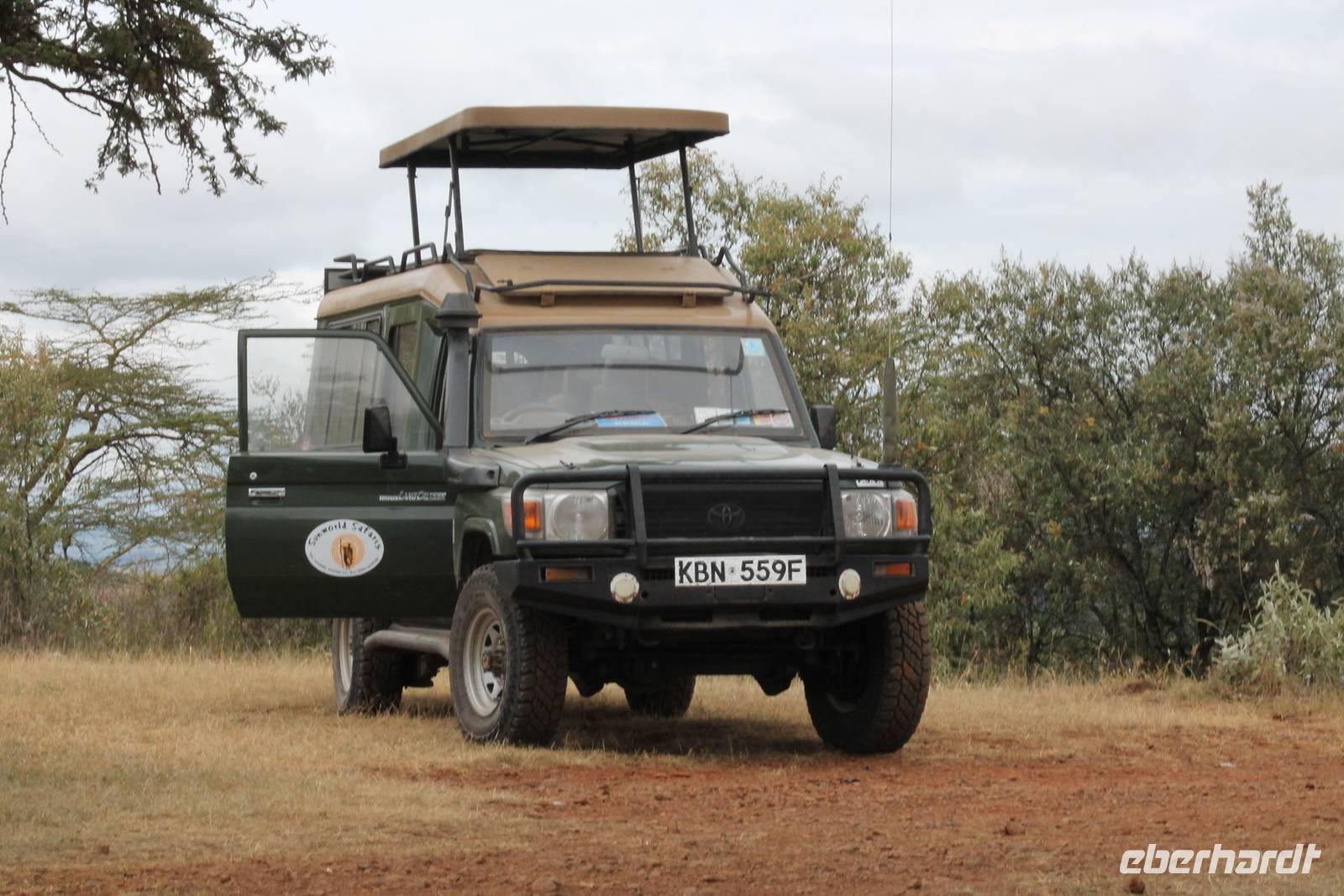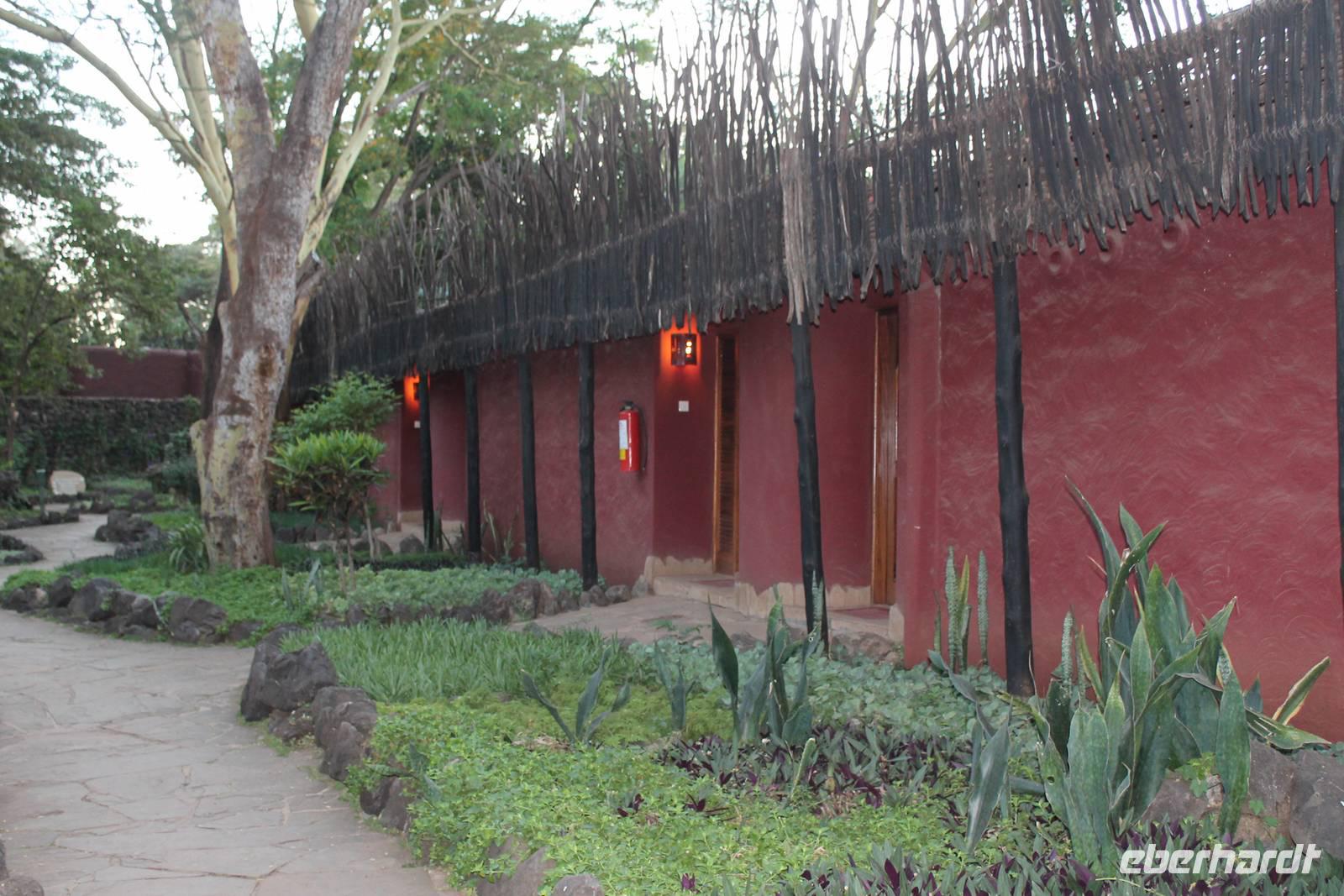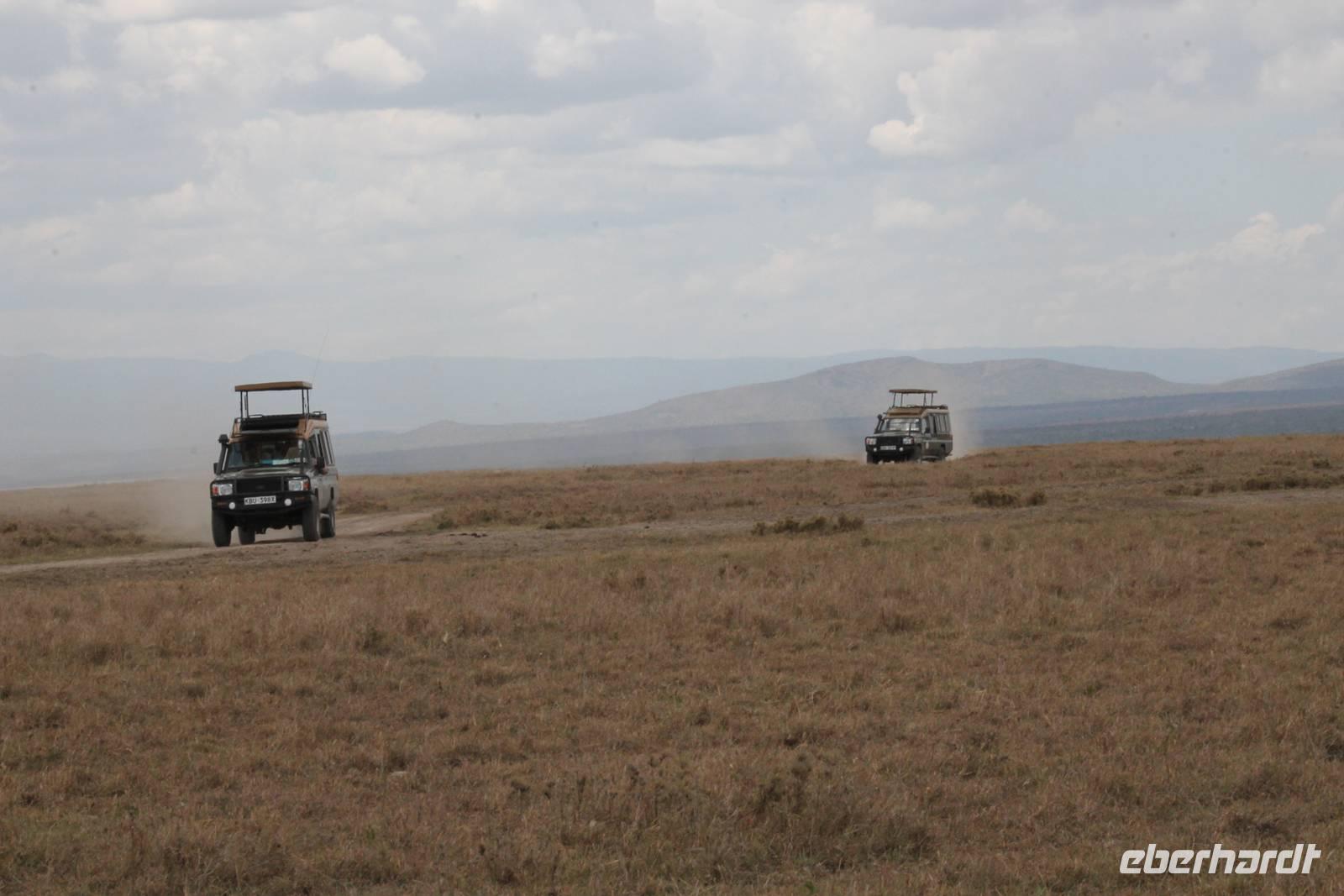 Am Flughafen nutzen wir noch die Möglichkeit um unsere Euronen in Kenianische Schilling umzutauschen und fühlen uns damit gleich viel wohler und ein bisschen „einheimischer". Es ist ja auch nicht schlecht, mal um die 300.000 Kenianische Schilling zu besitzen. Da fühlt man sich doch fast wie ein Millionär. Am Flughafen sind wir froh, dass wir von unserem örtlichen Reiseleiter Leonard herzlich empfangen werden und fühlen uns bei ihm gleich wohl und sicher. Hier begrüßen wir auch unsere drei Jeepfahrer, die uns auf unserer wunderbaren Rundreise begleiten werden: Jackson, Armstrong und Capell. Die Plätze in den Jeeps sind schnell verteilt und auch die Koffer verstaut. Jeder Gast verfügt über einen Fensterplatz und auch so bieten die Jeeps allerlei Platz und Komfort und sind vor allem für unsere Safaris ideal geeignet, da sich das Dach der Fahrzeuge öffnen lässt. So erleben wir heute schon unsere erste Safari durch die Vorstadt von Nairobi und erreichen kurze Zeit später unser Eka Hotel, nicht weit vom Flughafen gelegen. Hier beziehen wir unsere Zimmer und treffen uns kurze Zeit später wieder für einen Willkommensdrink und eine kurze Vorstellung der Reise. Hier merken wir auch, dass das kenianische Bier Tusker wundervoll köstlich schmeckt und es uns auf unserer Reise täglich begleiten wird. Anschließend fallen wir nach einem langen Tag alle in unsere Betten und freuen uns auf die nächsten Tage.
