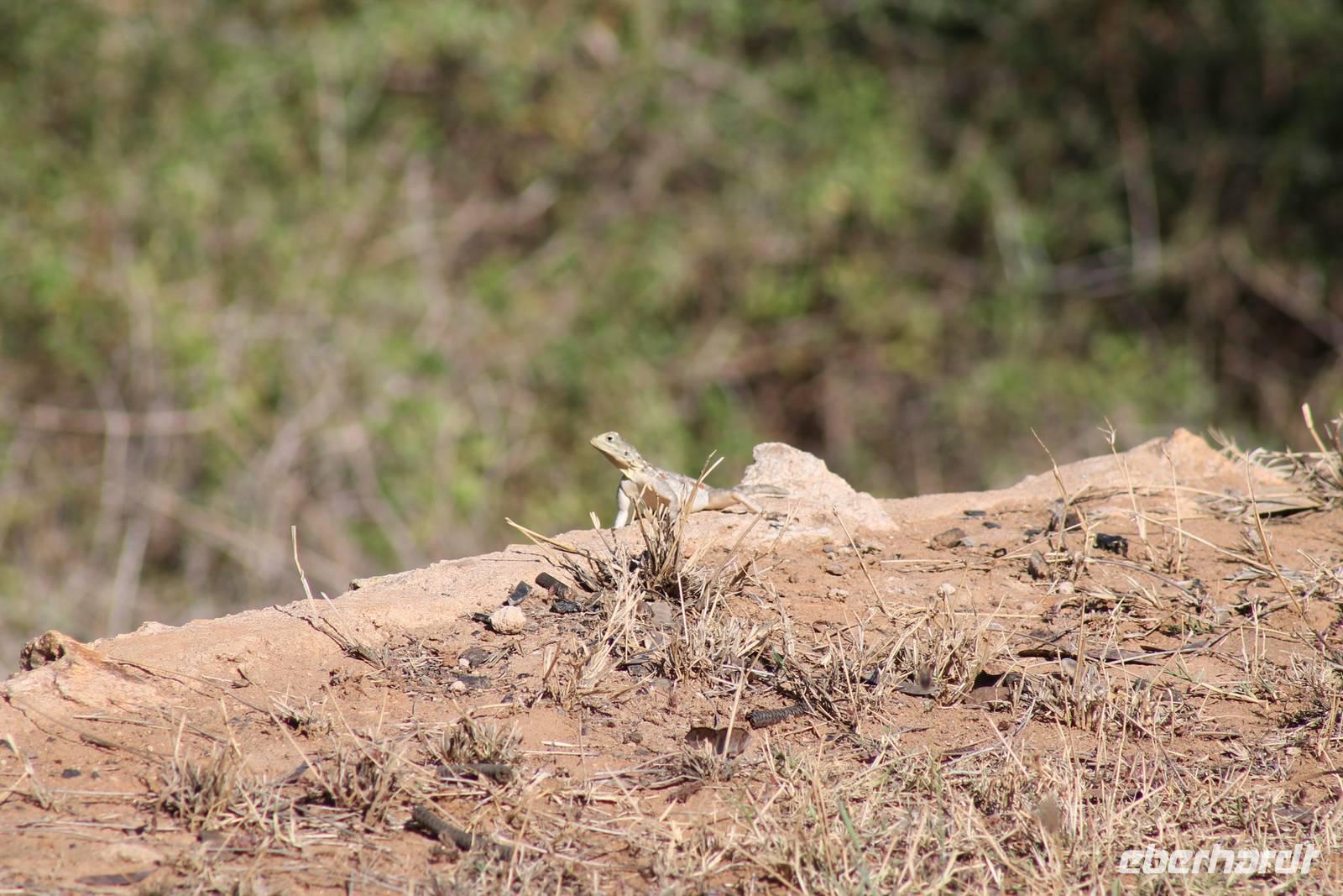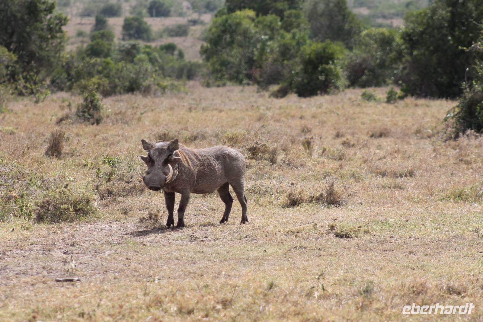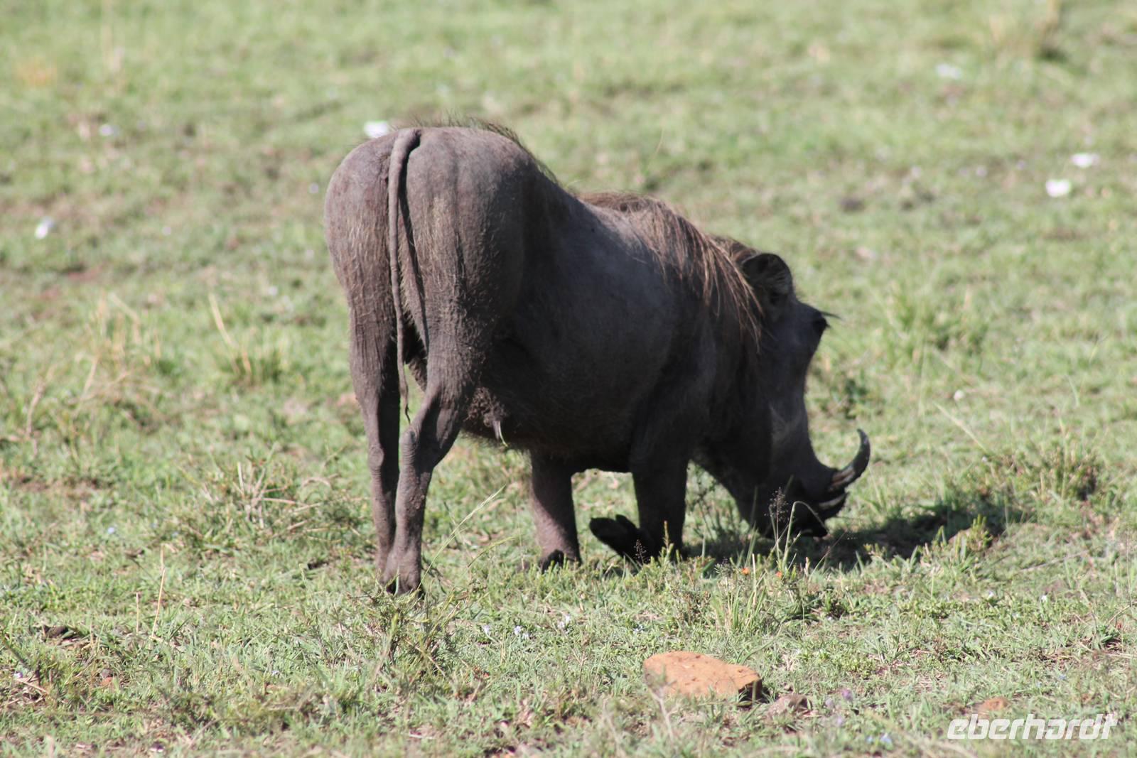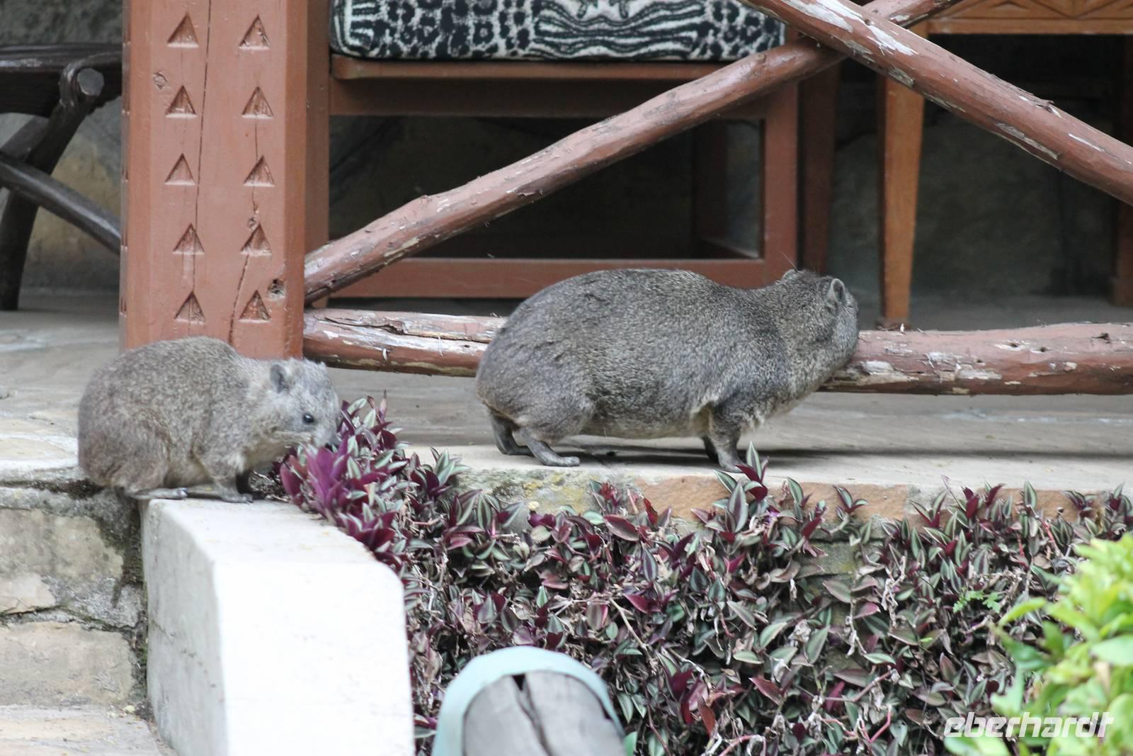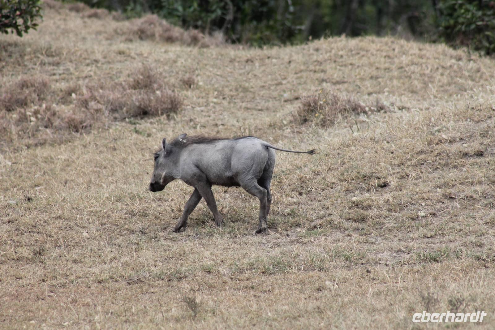 Nach etwa drei Stunden Pirschfahrt am Morgen knurrt allen schon sehr der Magen und so lassen wir heute einige Tiere auf dem Wegesrand aus um schnell zu unserem Aussichtspunkt und damit zu unserem Frühstück zu kommen. Denn ein jeder weiß, wer hungrig ist, wird agressiv. Leider bekommt das auch unser Fahrer Jackson zu spüren (Spaß). So sind wir froh, dass wir unser Frühstück mit einem tollen Ausblick auf den Nationalpark in vollen Zügen genießen können. Satt und zufrieden fahren wir weiter zu einem weiteren Aussichtspunkt, wo wir auch Klippschläfer und einige Vögel beobachten können. Auf dem Weg zurück zu unserer Lodge sehen wir noch einige Impalas, Warzenschweine, die sich mit dem sogenannten „Buschfunk" verständigen und immer so schön mit ihren Schwänzchen wackeln, sowie viele Zebras und auch eine Leopard-Schildkröte. Außerdem einen Kampfadler und eine grüne Meerkatze. So langsam fällt es uns gar nicht mehr so leicht alle Tiere noch aufzählen zu können, die wir gesehen haben.