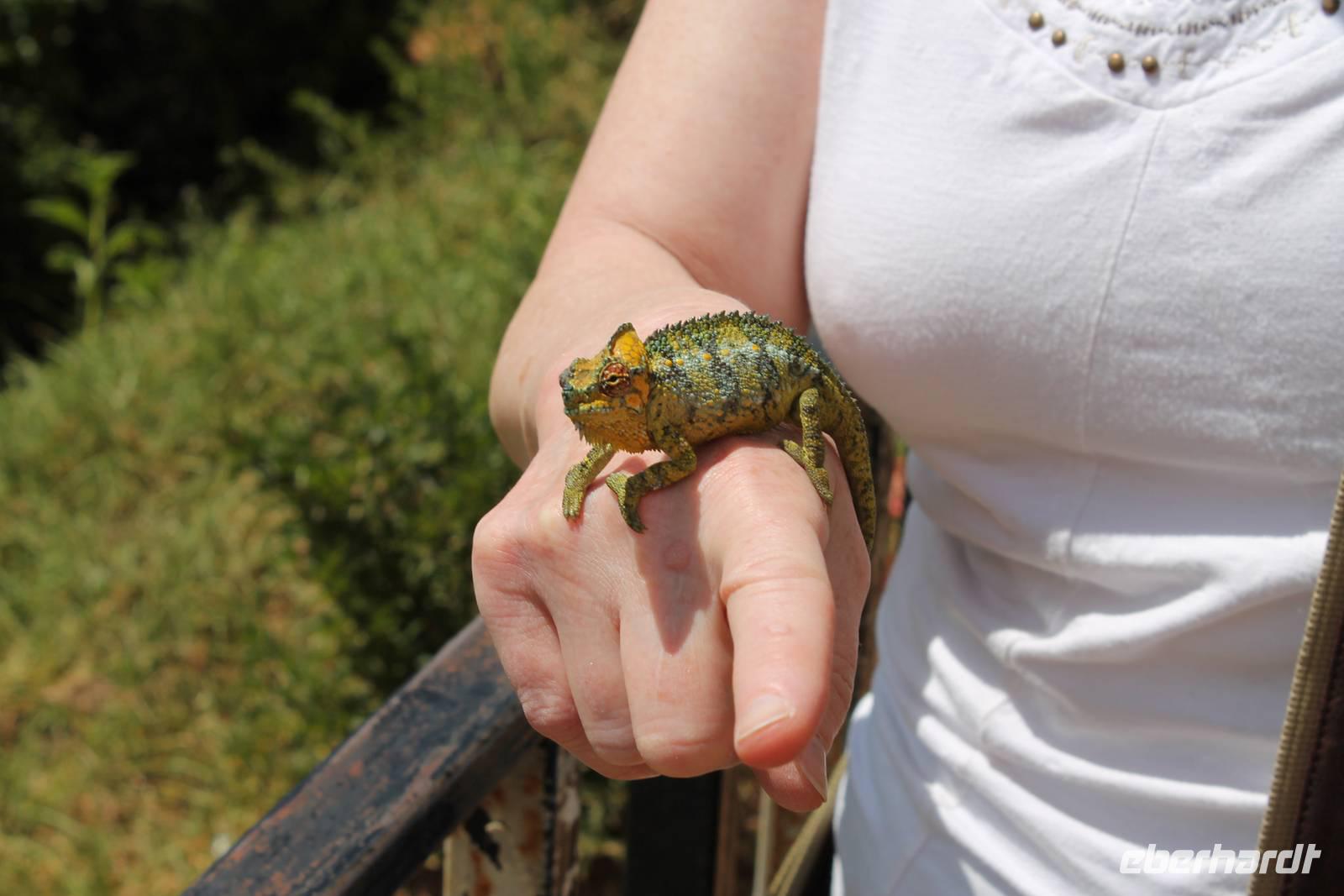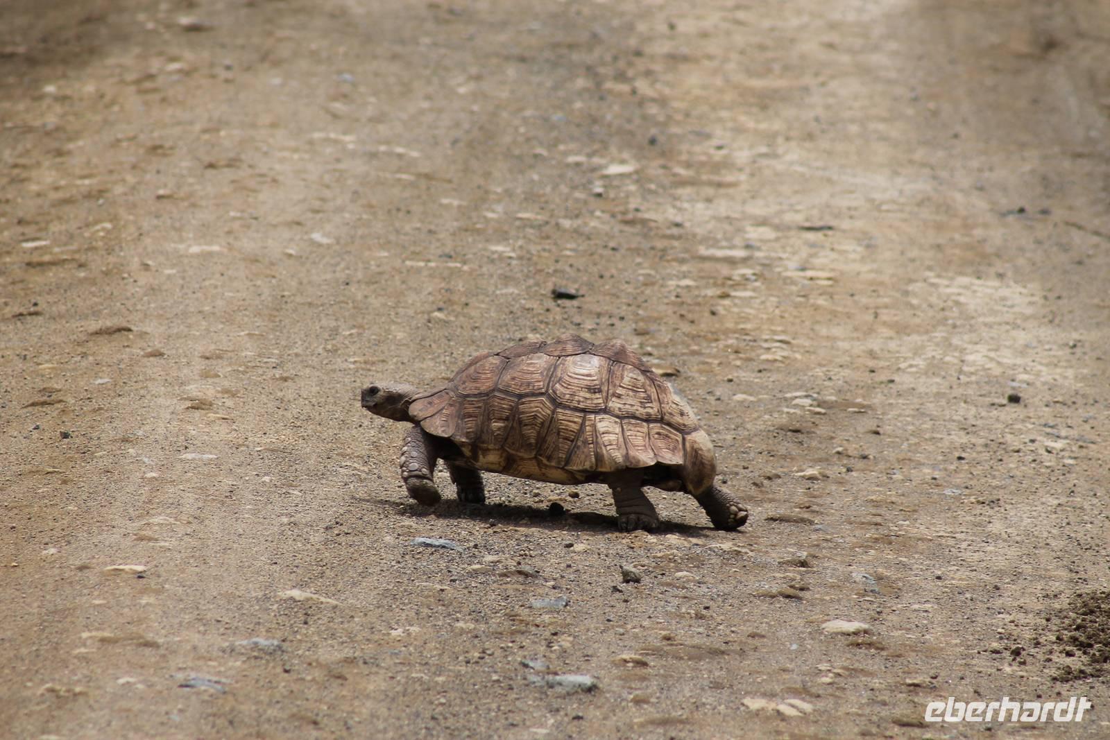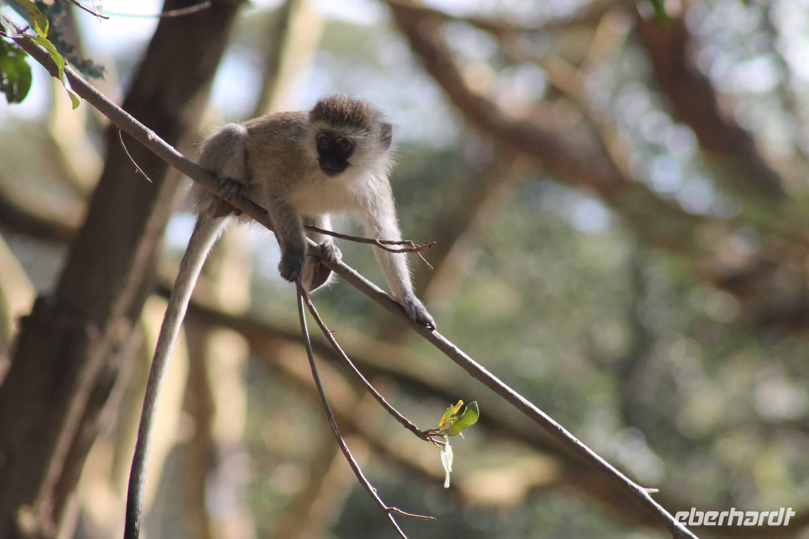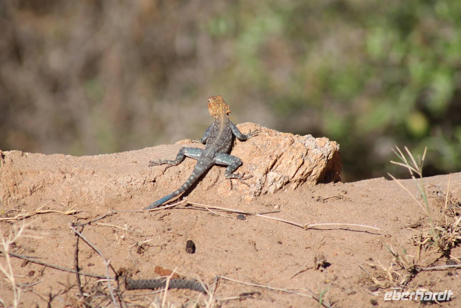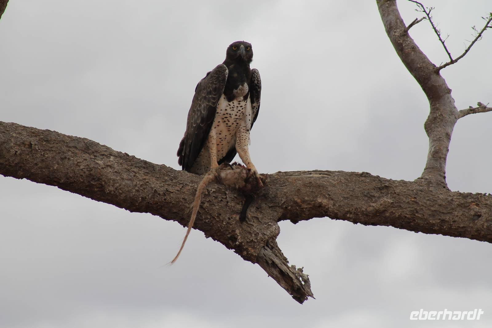 Nach etwa drei Stunden Pirschfahrt am Morgen knurrt allen schon sehr der Magen und so lassen wir heute einige Tiere auf dem Wegesrand aus um schnell zu unserem Aussichtspunkt und damit zu unserem Frühstück zu kommen. Denn ein jeder weiß, wer hungrig ist, wird agressiv. Leider bekommt das auch unser Fahrer Jackson zu spüren (Spaß). So sind wir froh, dass wir unser Frühstück mit einem tollen Ausblick auf den Nationalpark in vollen Zügen genießen können. Satt und zufrieden fahren wir weiter zu einem weiteren Aussichtspunkt, wo wir auch Klippschläfer und einige Vögel beobachten können. Auf dem Weg zurück zu unserer Lodge sehen wir noch einige Impalas, Warzenschweine, die sich mit dem sogenannten „Buschfunk" verständigen und immer so schön mit ihren Schwänzchen wackeln, sowie viele Zebras und auch eine Leopard-Schildkröte. Außerdem einen Kampfadler und eine grüne Meerkatze. So langsam fällt es uns gar nicht mehr so leicht alle Tiere noch aufzählen zu können, die wir gesehen haben.
