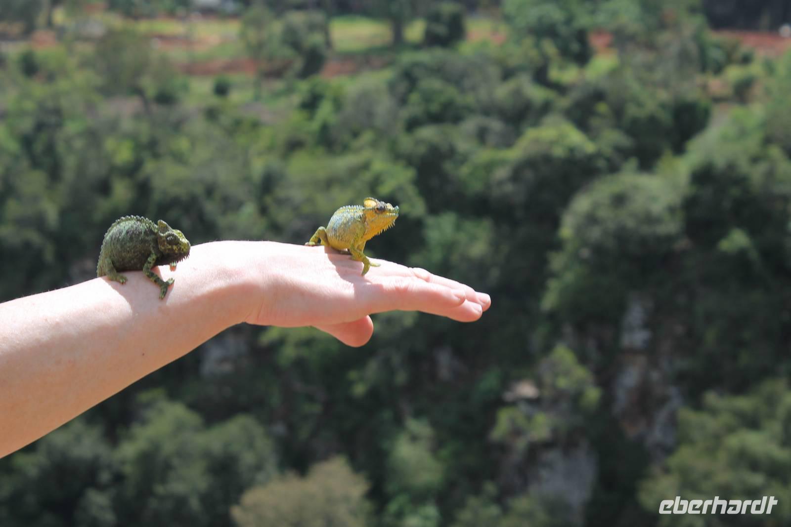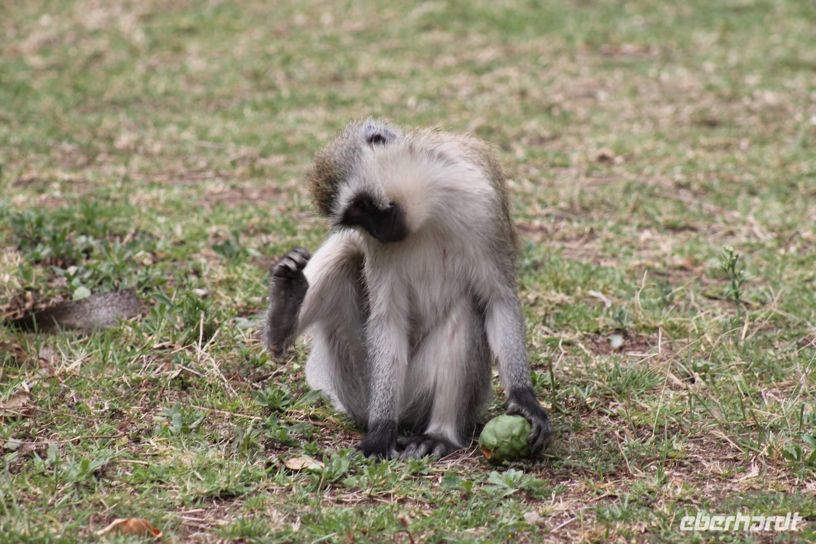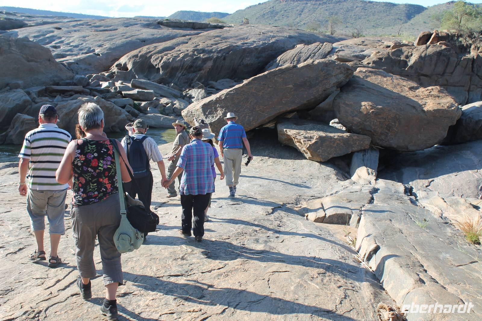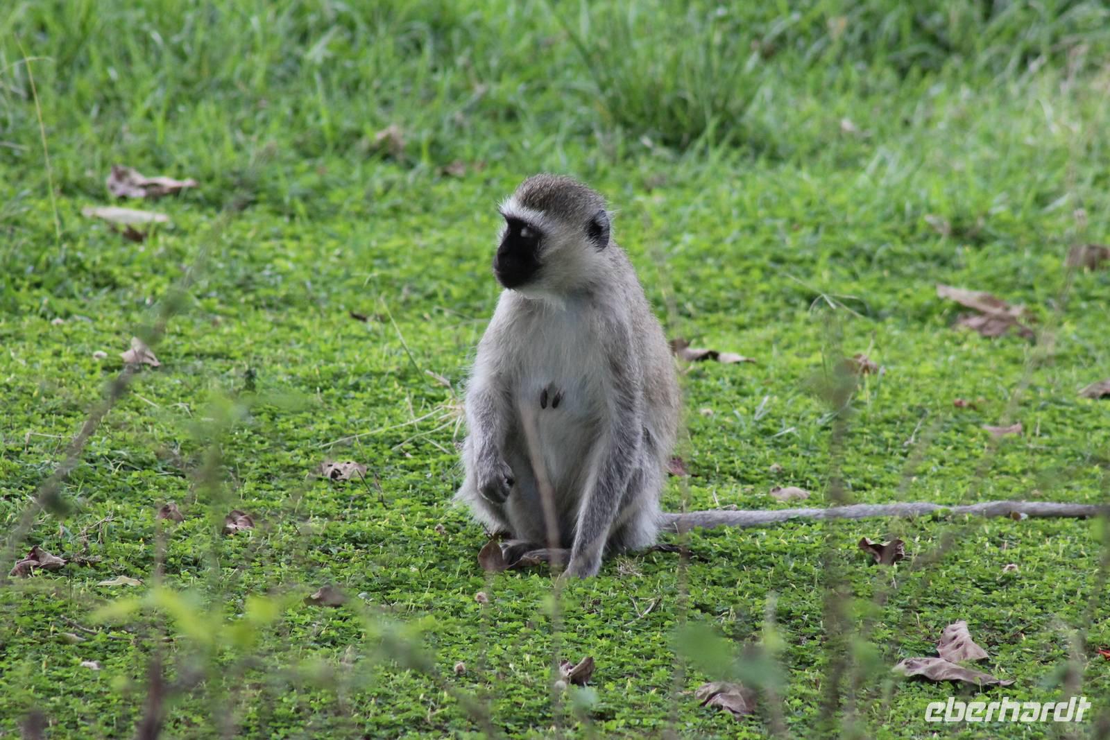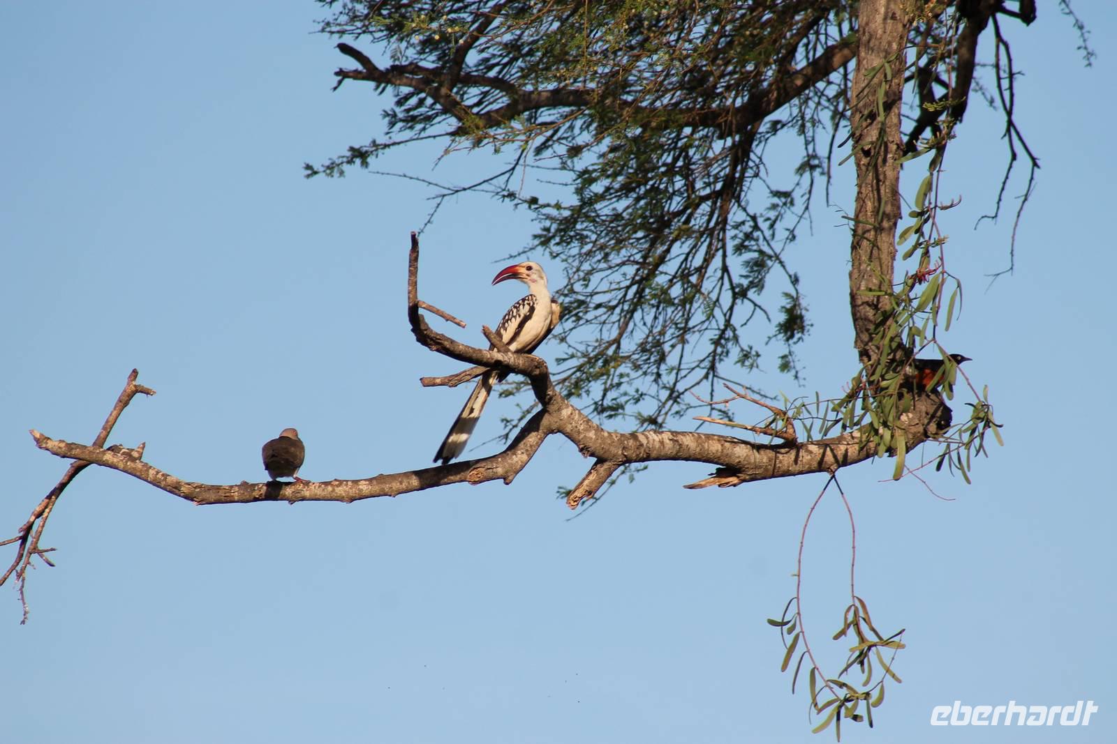 Nach etwa drei Stunden Pirschfahrt am Morgen knurrt allen schon sehr der Magen und so lassen wir heute einige Tiere auf dem Wegesrand aus um schnell zu unserem Aussichtspunkt und damit zu unserem Frühstück zu kommen. Denn ein jeder weiß, wer hungrig ist, wird agressiv. Leider bekommt das auch unser Fahrer Jackson zu spüren (Spaß). So sind wir froh, dass wir unser Frühstück mit einem tollen Ausblick auf den Nationalpark in vollen Zügen genießen können. Satt und zufrieden fahren wir weiter zu einem weiteren Aussichtspunkt, wo wir auch Klippschläfer und einige Vögel beobachten können. Auf dem Weg zurück zu unserer Lodge sehen wir noch einige Impalas, Warzenschweine, die sich mit dem sogenannten „Buschfunk" verständigen und immer so schön mit ihren Schwänzchen wackeln, sowie viele Zebras und auch eine Leopard-Schildkröte. Außerdem einen Kampfadler und eine grüne Meerkatze. So langsam fällt es uns gar nicht mehr so leicht alle Tiere noch aufzählen zu können, die wir gesehen haben.