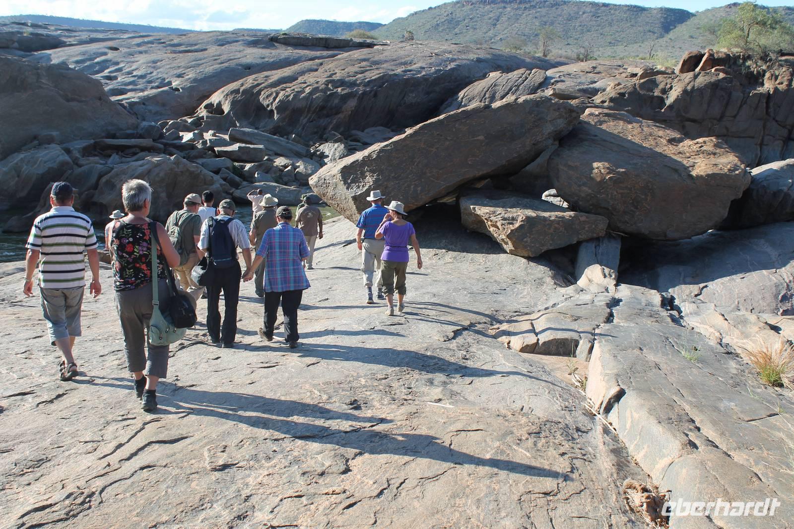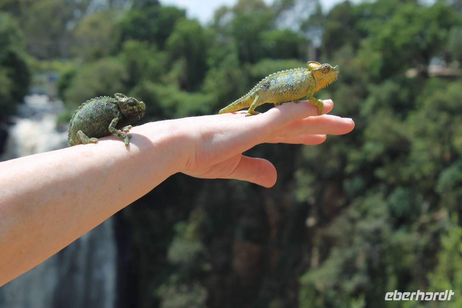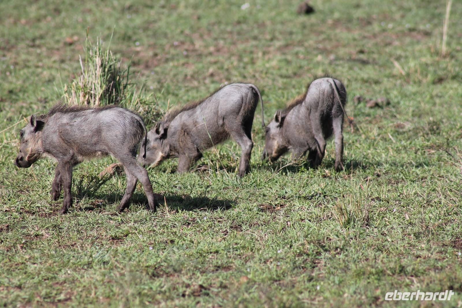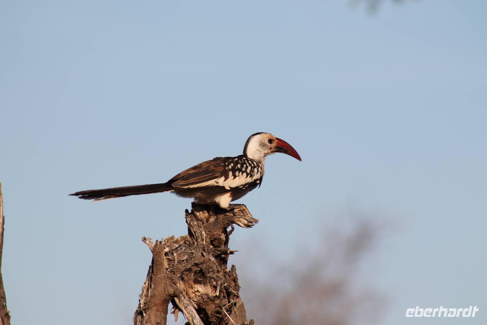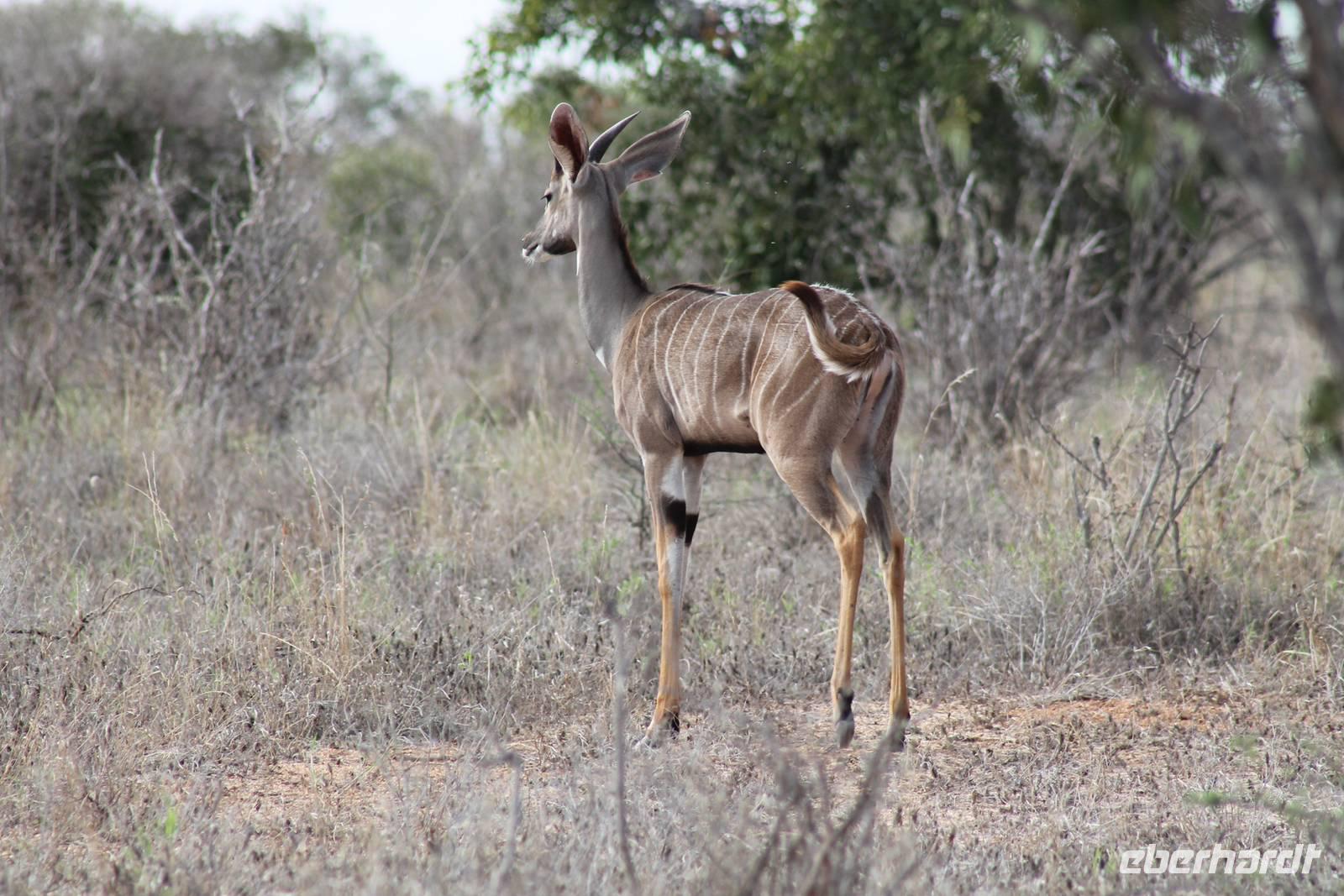 Nach etwa drei Stunden Pirschfahrt am Morgen knurrt allen schon sehr der Magen und so lassen wir heute einige Tiere auf dem Wegesrand aus um schnell zu unserem Aussichtspunkt und damit zu unserem Frühstück zu kommen. Denn ein jeder weiß, wer hungrig ist, wird agressiv. Leider bekommt das auch unser Fahrer Jackson zu spüren (Spaß). So sind wir froh, dass wir unser Frühstück mit einem tollen Ausblick auf den Nationalpark in vollen Zügen genießen können. Satt und zufrieden fahren wir weiter zu einem weiteren Aussichtspunkt, wo wir auch Klippschläfer und einige Vögel beobachten können. Auf dem Weg zurück zu unserer Lodge sehen wir noch einige Impalas, Warzenschweine, die sich mit dem sogenannten „Buschfunk" verständigen und immer so schön mit ihren Schwänzchen wackeln, sowie viele Zebras und auch eine Leopard-Schildkröte. Außerdem einen Kampfadler und eine grüne Meerkatze. So langsam fällt es uns gar nicht mehr so leicht alle Tiere noch aufzählen zu können, die wir gesehen haben.