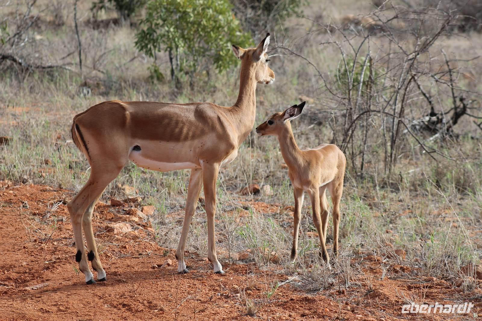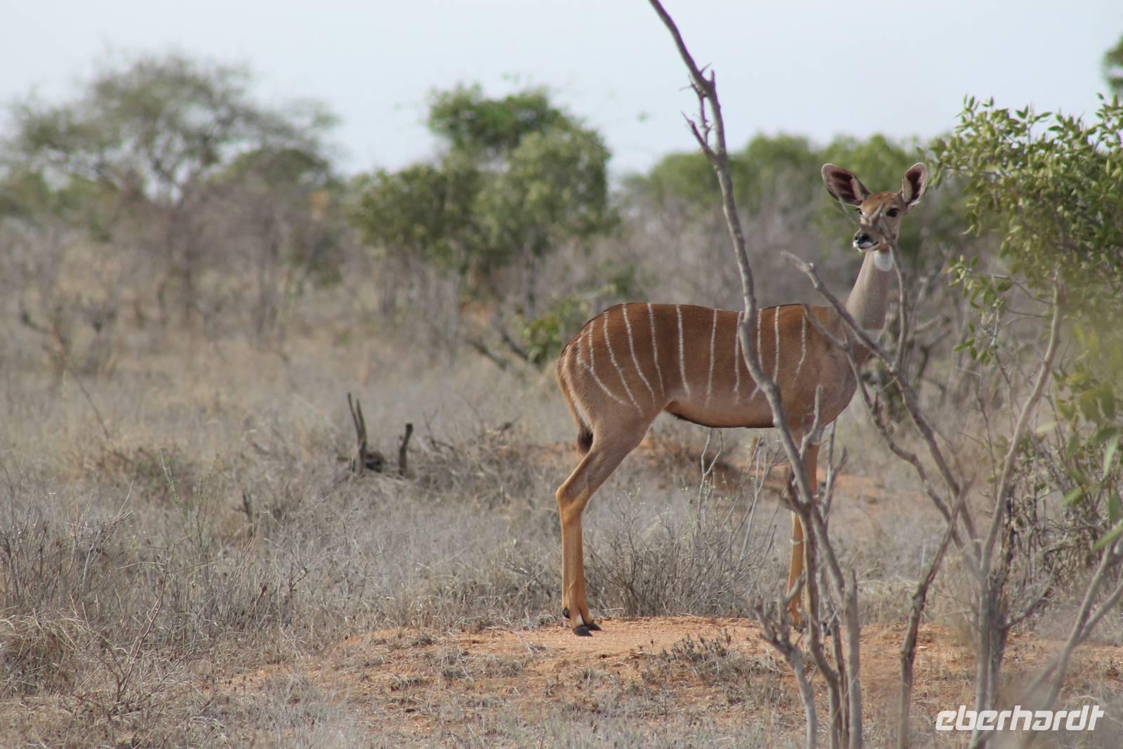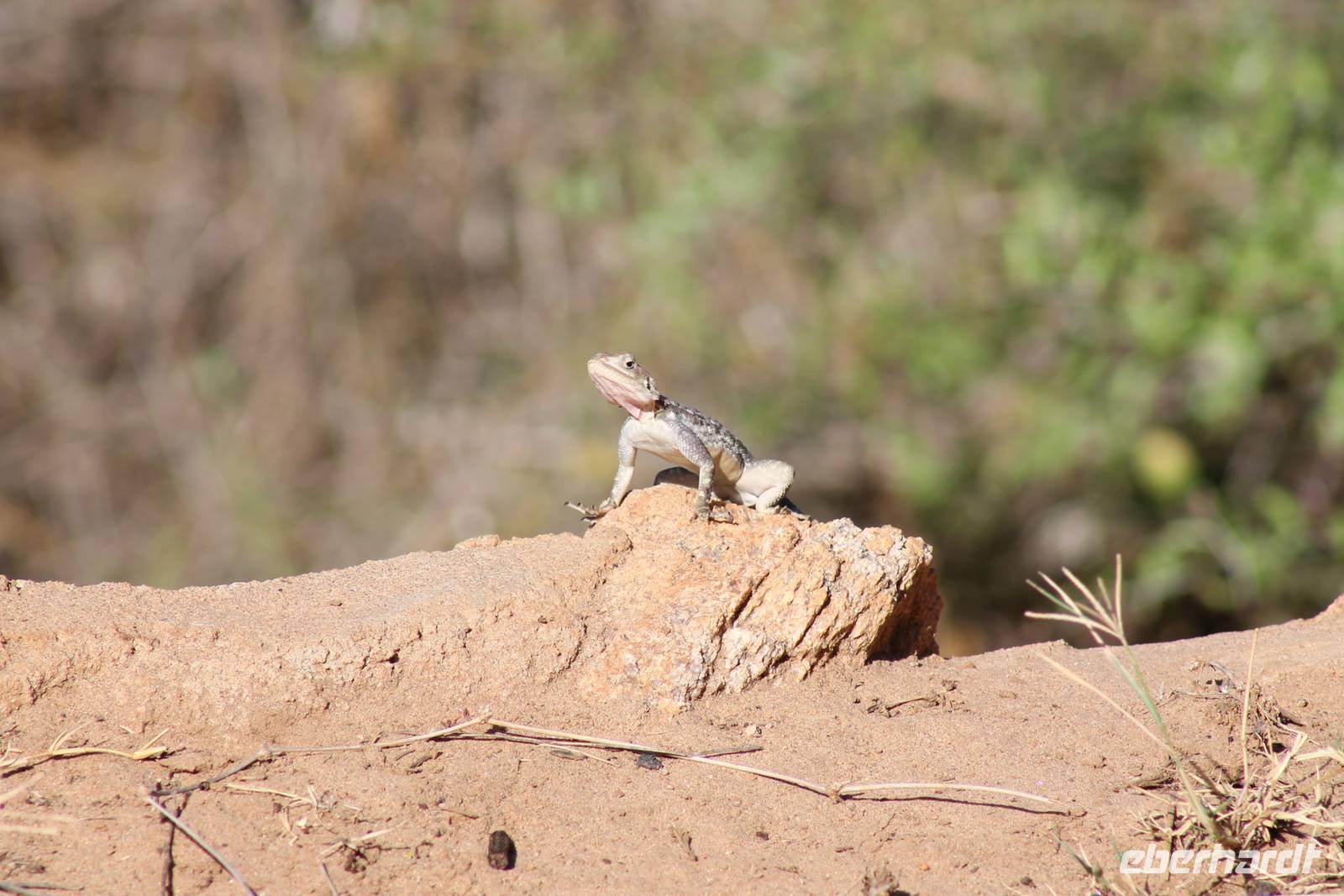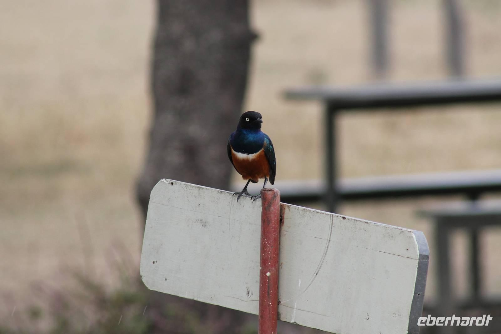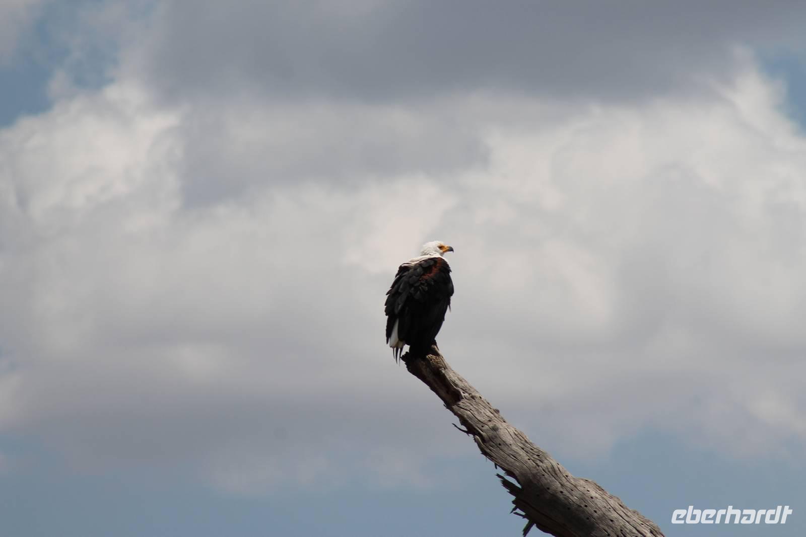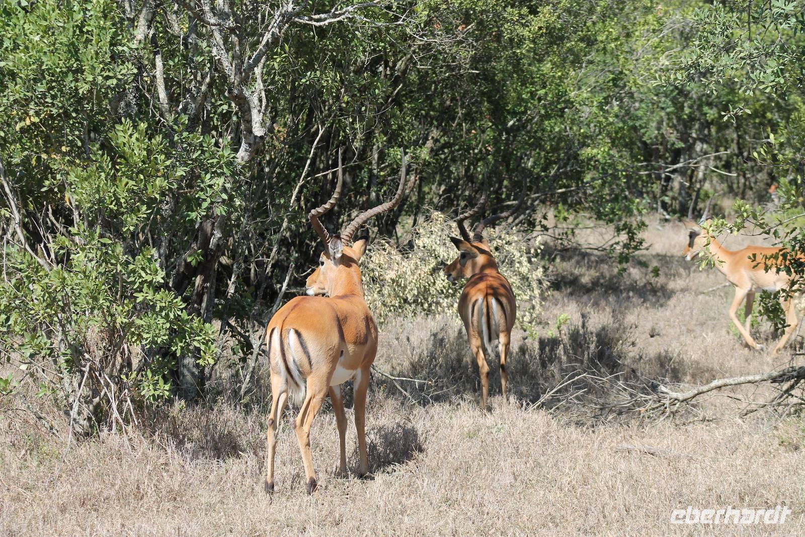 Nach etwa drei Stunden Pirschfahrt am Morgen knurrt allen schon sehr der Magen und so lassen wir heute einige Tiere auf dem Wegesrand aus um schnell zu unserem Aussichtspunkt und damit zu unserem Frühstück zu kommen. Denn ein jeder weiß, wer hungrig ist, wird agressiv. Leider bekommt das auch unser Fahrer Jackson zu spüren (Spaß). So sind wir froh, dass wir unser Frühstück mit einem tollen Ausblick auf den Nationalpark in vollen Zügen genießen können. Satt und zufrieden fahren wir weiter zu einem weiteren Aussichtspunkt, wo wir auch Klippschläfer und einige Vögel beobachten können. Auf dem Weg zurück zu unserer Lodge sehen wir noch einige Impalas, Warzenschweine, die sich mit dem sogenannten „Buschfunk" verständigen und immer so schön mit ihren Schwänzchen wackeln, sowie viele Zebras und auch eine Leopard-Schildkröte. Außerdem einen Kampfadler und eine grüne Meerkatze. So langsam fällt es uns gar nicht mehr so leicht alle Tiere noch aufzählen zu können, die wir gesehen haben.