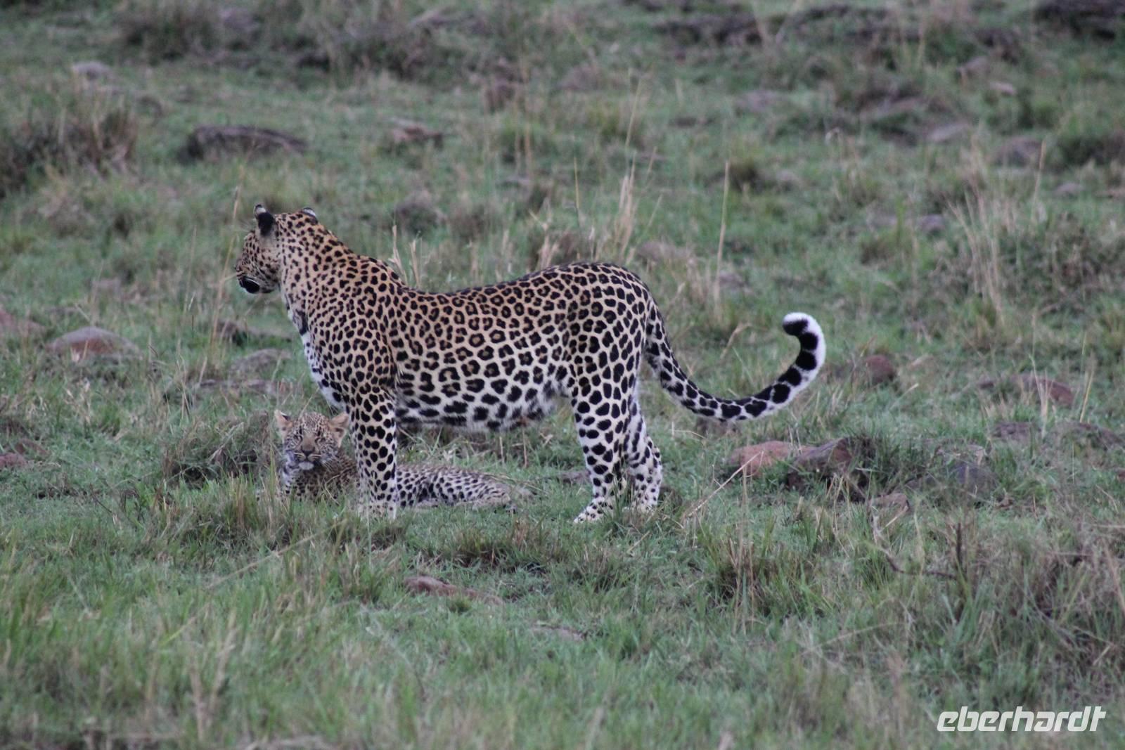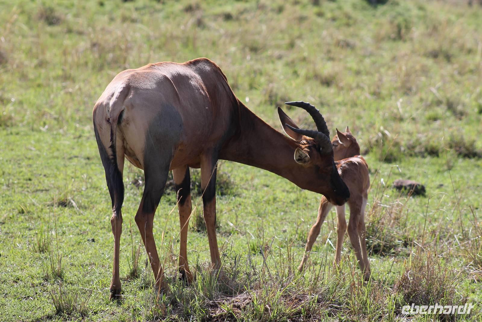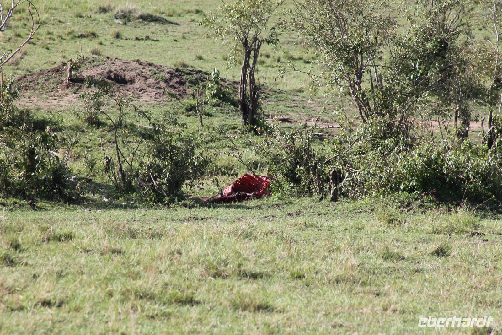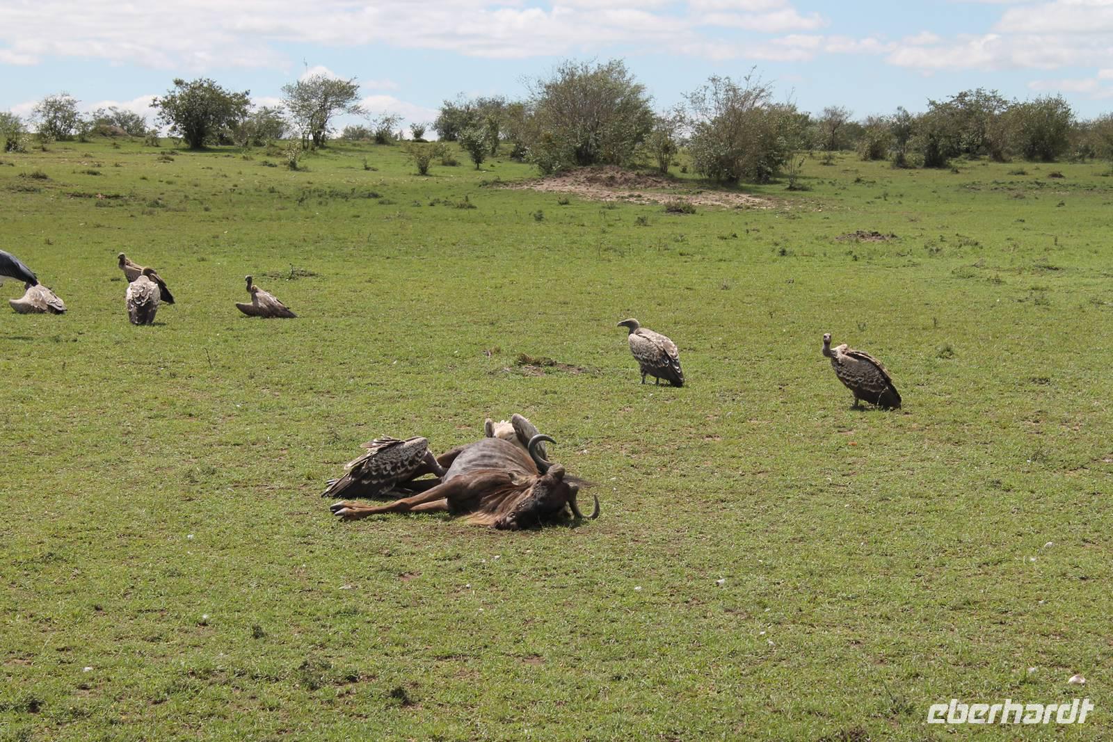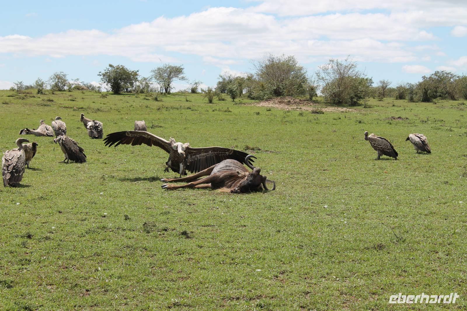 Die nächsten beiden Tage stehen ganz im Zeichen der Masai Mara und viele von uns empfanden diese zweifelsohne als einen Höhepunkt der Reise. Wir stehen natürlich wieder zeitig auf um eine frühe Pirsch in der Masai Mara zu unternehmen. Alle haben mehr oder weniger gut in ihren Zelten geschlafen, denn die Angst vor den Hippos bleibt, zumindest bei Vicky :-). Aber Sie fühlt sich schon etwas sicherer, da Sie ja ihren Askari immer dabei hat. Während unseren heutigen Pirschfahrten sehen wir wieder allerhand Tiere: Viele Gnuherden, einige Geier, kleine und große Warzenschweine und ganz viele Topis mit Jungen, die gerade erst geboren sind. Jackson erklärt uns, dass gerade Paarungszeit ist und so viele Jungen zur Welt kommen. Unglaublich das die kleinen Geschöpfe schon direkt nach der Geburt laufen und stehen können. Natürlich werden Sie von der Mutter sehr umsorgt, weil die Raubkatzen natürlich überall lauern um sich auch ein kleines Topi zu schnappen. Später sehen wir auch noch einen Strauss und mehrere Löwen. Später werden unsere Fahrer informiert, dass sich wohl ein totes Impala auf einem Baum befindet, welches von einem Leoparden gerissen wurde. Leider sehen wir nur das tote Impala aber keinen Leoparden. Ob wir ihn doch noch gesehen haben, erfahren Sie nur wenn Sie weiter lesen. Nach einigen vorbeiziehenden Giraffen und vielen weiteren Kibizen fahren wir mit unseren Jeeps zum Fluss, wo sich aus der Erfahrung heraus immer viele Tiere tummeln und wir sollten Recht behalten. Am Fluss angekommen sehen wir ein riesiges Krokodil, wahrscheinlich das größte Krokodil was wir bisher gesehen haben und auch einige Hippos. Wir sehen auch ein Hippo, was sich im Busch versteckt und viele Wunden hat. Wahrscheinlich hat es einen Machtkampf verloren und muss jetzt einsam und allein leben. Noch vor unserem Mittagessen begegnen wir auch einigen Löwen, die sich über eine Beute hermachen. Viele glauben es wäre ein kleines Warzenschwein, aber genau erkennen können wir es nicht, da es fast vollständig verspeist wurde. Bevor wir heute zu unserem Camp zurückkehren sehen wir auch endlich die ersten Elefanten und sogar mit Jungen. Es ist äußerst niedlich anzusehen, wir der Kleine versucht alles seiner Mutter nachzumachen. So versucht auch er sich Wasser über den Körper zu spritzen aber leider gelingt es nicht so richtig. Aber schön anzusehen war es in jedem Fall. An unserem Camp angekommen genießen wir ein leckeres Mittagessen und genießen dann noch ein wenig die Stille, die uns gibt. Es könnte mehr solche Momente geben aber natürlich wollen wir alle auch etwas erleben. So fahren wir auch am späten Nachmittag noch einmal raus, um weitere Tiere auf unsere Fotos zu bekommen und wir werden nicht enttäuscht. So sehen wir wunderschöne Masai Giraffen, Elandantilopen, Glanzgazellen, eine Riesentrappe, einen Marabu und auch den seltenen Kingfisher, den wir nun endlich auch einmal auf die Linse bekommen. Darüber freuen sich die Ornitologen unter uns natürlich auch sehr. Auch die Dämmerung hat heute noch so einiges zu bieten. So sehen wir noch eine Löwenfamilie mit kleinen Jungen, die gerade erst geboren sind. Ewig könnte man den kleinen zuschauen und man glaubt gar nicht, dass diese kleinen Wesen später mal zu Raubkatzen werden. Auf unserem Rückweg sehen wir noch eine Hyäne im Straßengraben, die sich von uns gar nicht stören lässt. Kurz bevor uns heute noch eine Überraschung erwartet, fahren unsere Jeeps noch einmal zu der Stelle, wo wir heute Morgen schon das tote Impala auf dem Baum gesehen haben und siehe da die Leopardenmama ist wieder da und hat auch ihr Junges im Gepäck. Wir können es kaum glauben, so schön sind diese Tiere und auch das Kleine würden wir am liebsten abknutschen.