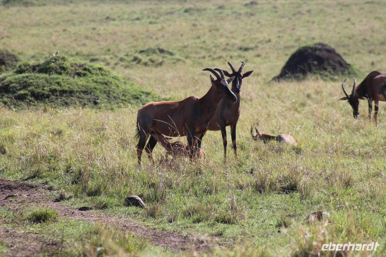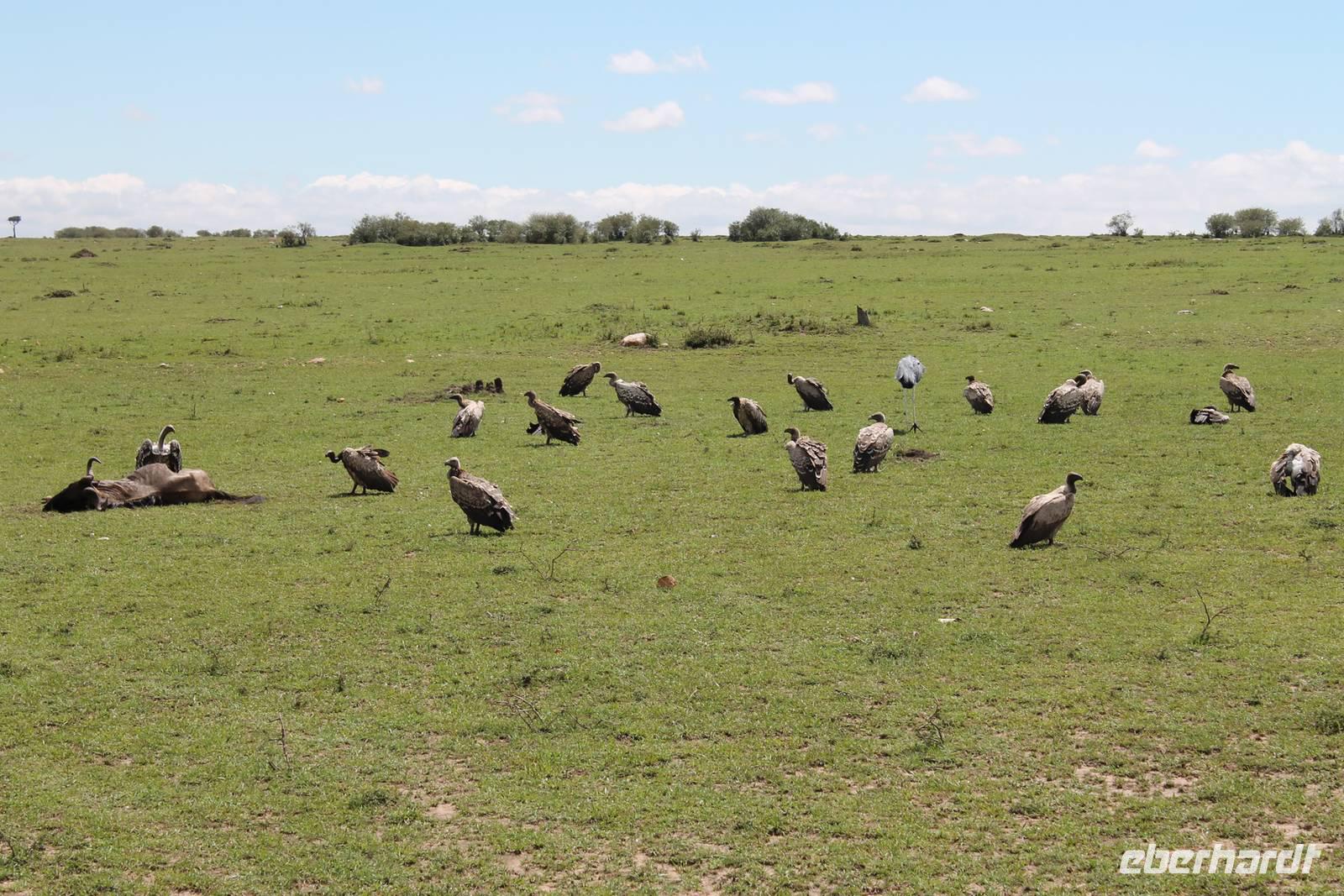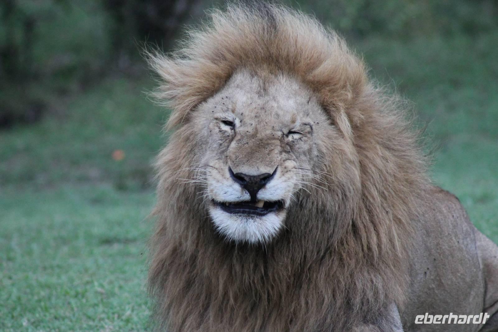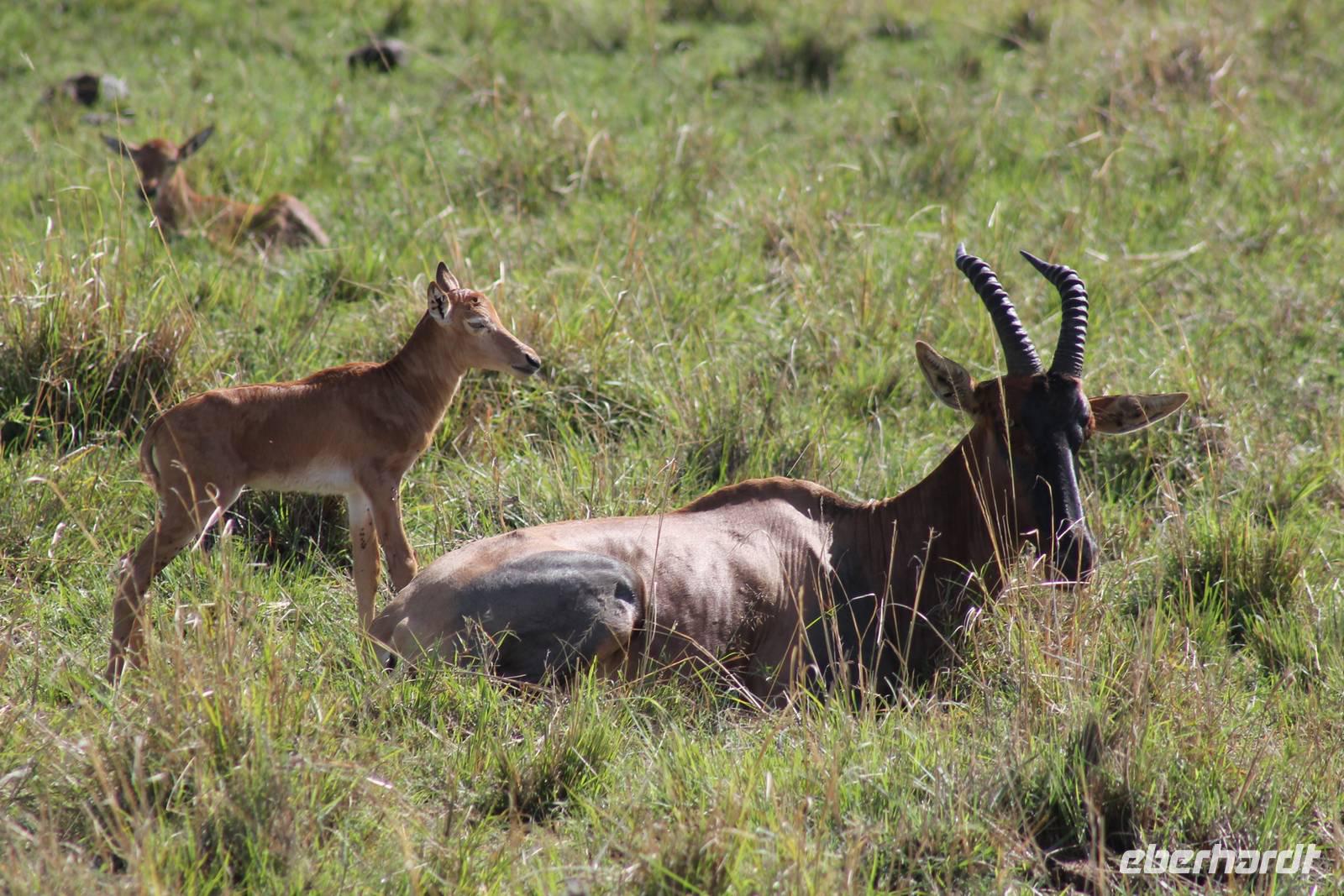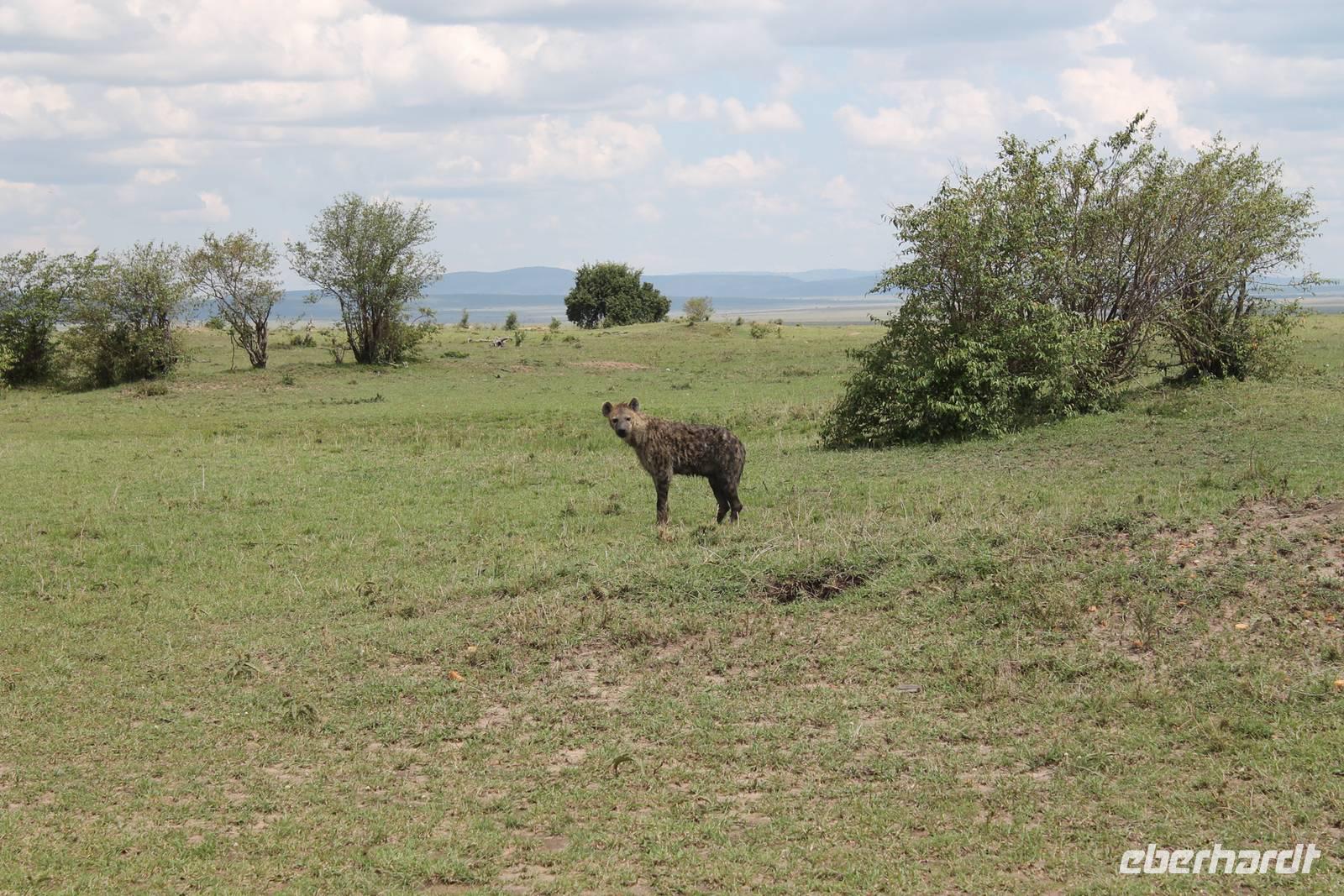Die nächsten beiden Tage stehen ganz im Zeichen der Masai Mara und viele von uns empfanden diese zweifelsohne als einen Höhepunkt der Reise. Wir stehen natürlich wieder zeitig auf um eine frühe Pirsch in der Masai Mara zu unternehmen. Alle haben mehr oder weniger gut in ihren Zelten geschlafen, denn die Angst vor den Hippos bleibt, zumindest bei Vicky :-). Aber Sie fühlt sich schon etwas sicherer, da Sie ja ihren Askari immer dabei hat. Während unseren heutigen Pirschfahrten sehen wir wieder allerhand Tiere: Viele Gnuherden, einige Geier, kleine und große Warzenschweine und ganz viele Topis mit Jungen, die gerade erst geboren sind. Jackson erklärt uns, dass gerade Paarungszeit ist und so viele Jungen zur Welt kommen. Unglaublich das die kleinen Geschöpfe schon direkt nach der Geburt laufen und stehen können. Natürlich werden Sie von der Mutter sehr umsorgt, weil die Raubkatzen natürlich überall lauern um sich auch ein kleines Topi zu schnappen. Später sehen wir auch noch einen Strauss und mehrere Löwen. Später werden unsere Fahrer informiert, dass sich wohl ein totes Impala auf einem Baum befindet, welches von einem Leoparden gerissen wurde. Leider sehen wir nur das tote Impala aber keinen Leoparden. Ob wir ihn doch noch gesehen haben, erfahren Sie nur wenn Sie weiter lesen. Nach einigen vorbeiziehenden Giraffen und vielen weiteren Kibizen fahren wir mit unseren Jeeps zum Fluss, wo sich aus der Erfahrung heraus immer viele Tiere tummeln und wir sollten Recht behalten. Am Fluss angekommen sehen wir ein riesiges Krokodil, wahrscheinlich das größte Krokodil was wir bisher gesehen haben und auch einige Hippos. Wir sehen auch ein Hippo, was sich im Busch versteckt und viele Wunden hat. Wahrscheinlich hat es einen Machtkampf verloren und muss jetzt einsam und allein leben. Noch vor unserem Mittagessen begegnen wir auch einigen Löwen, die sich über eine Beute hermachen. Viele glauben es wäre ein kleines Warzenschwein, aber genau erkennen können wir es nicht, da es fast vollständig verspeist wurde. Bevor wir heute zu unserem Camp zurückkehren sehen wir auch endlich die ersten Elefanten und sogar mit Jungen. Es ist äußerst niedlich anzusehen, wir der Kleine versucht alles seiner Mutter nachzumachen. So versucht auch er sich Wasser über den Körper zu spritzen aber leider gelingt es nicht so richtig. Aber schön anzusehen war es in jedem Fall. An unserem Camp angekommen genießen wir ein leckeres Mittagessen und genießen dann noch ein wenig die Stille, die uns gibt. Es könnte mehr solche Momente geben aber natürlich wollen wir alle auch etwas erleben. So fahren wir auch am späten Nachmittag noch einmal raus, um weitere Tiere auf unsere Fotos zu bekommen und wir werden nicht enttäuscht. So sehen wir wunderschöne Masai Giraffen, Elandantilopen, Glanzgazellen, eine Riesentrappe, einen Marabu und auch den seltenen Kingfisher, den wir nun endlich auch einmal auf die Linse bekommen. Darüber freuen sich die Ornitologen unter uns natürlich auch sehr. Auch die Dämmerung hat heute noch so einiges zu bieten. So sehen wir noch eine Löwenfamilie mit kleinen Jungen, die gerade erst geboren sind. Ewig könnte man den kleinen zuschauen und man glaubt gar nicht, dass diese kleinen Wesen später mal zu Raubkatzen werden. Auf unserem Rückweg sehen wir noch eine Hyäne im Straßengraben, die sich von uns gar nicht stören lässt. Kurz bevor uns heute noch eine Überraschung erwartet, fahren unsere Jeeps noch einmal zu der Stelle, wo wir heute Morgen schon das tote Impala auf dem Baum gesehen haben und siehe da die Leopardenmama ist wieder da und hat auch ihr Junges im Gepäck. Wir können es kaum glauben, so schön sind diese Tiere und auch das Kleine würden wir am liebsten abknutschen.