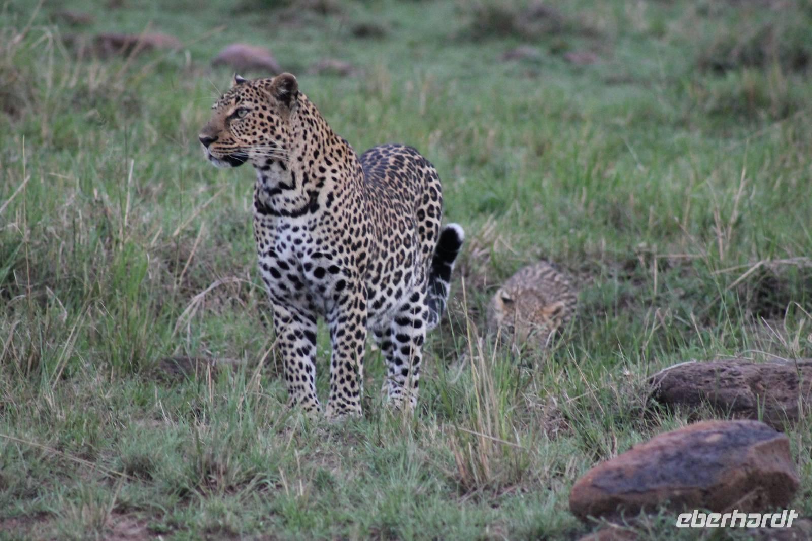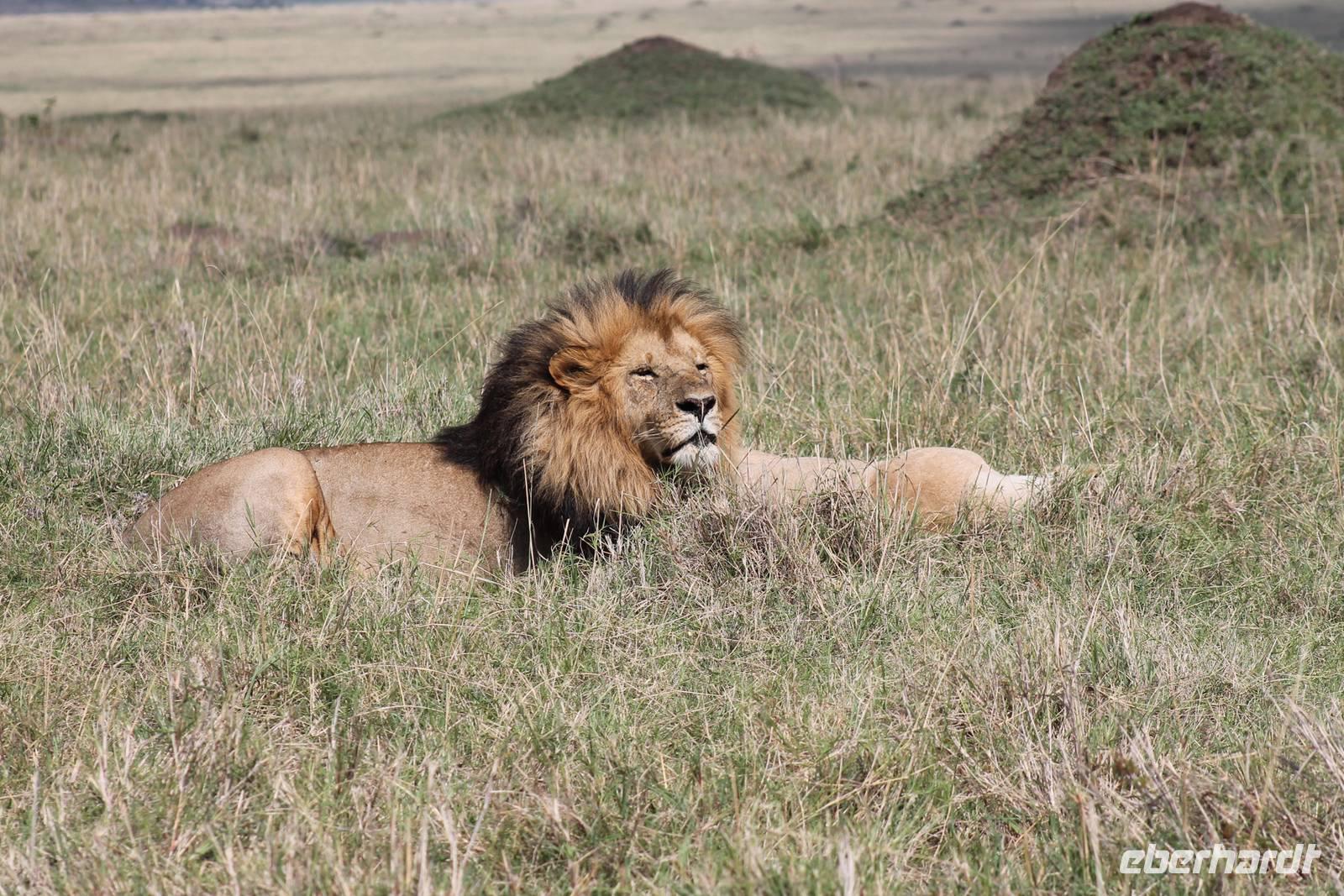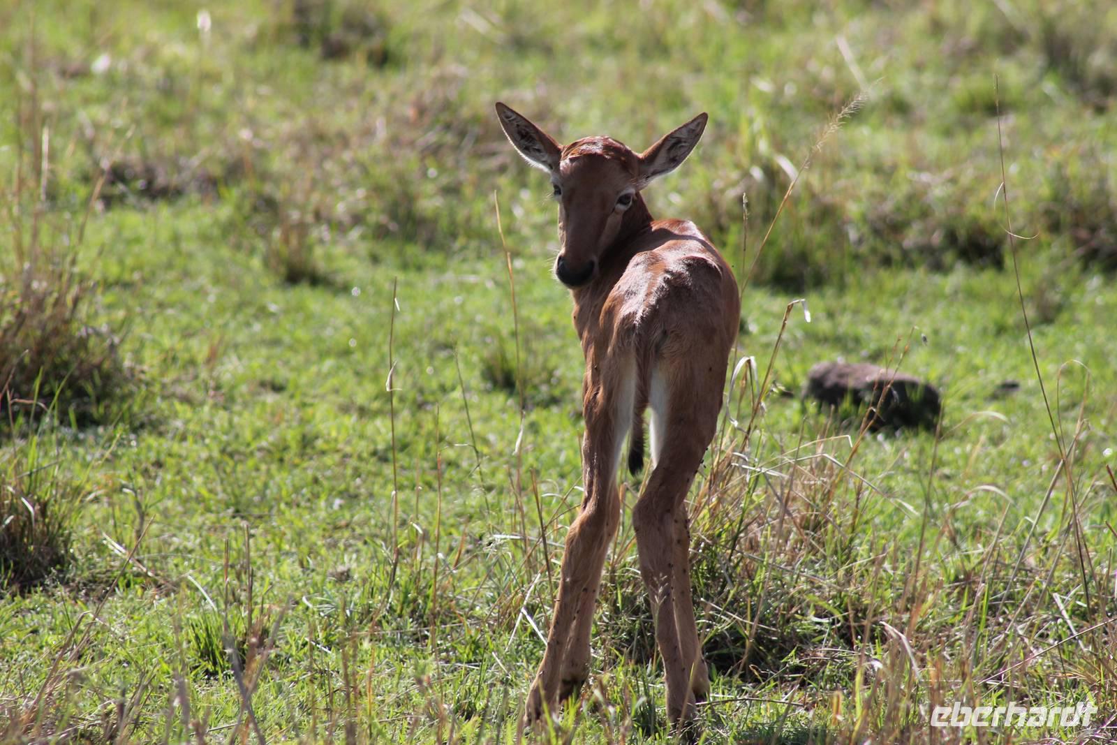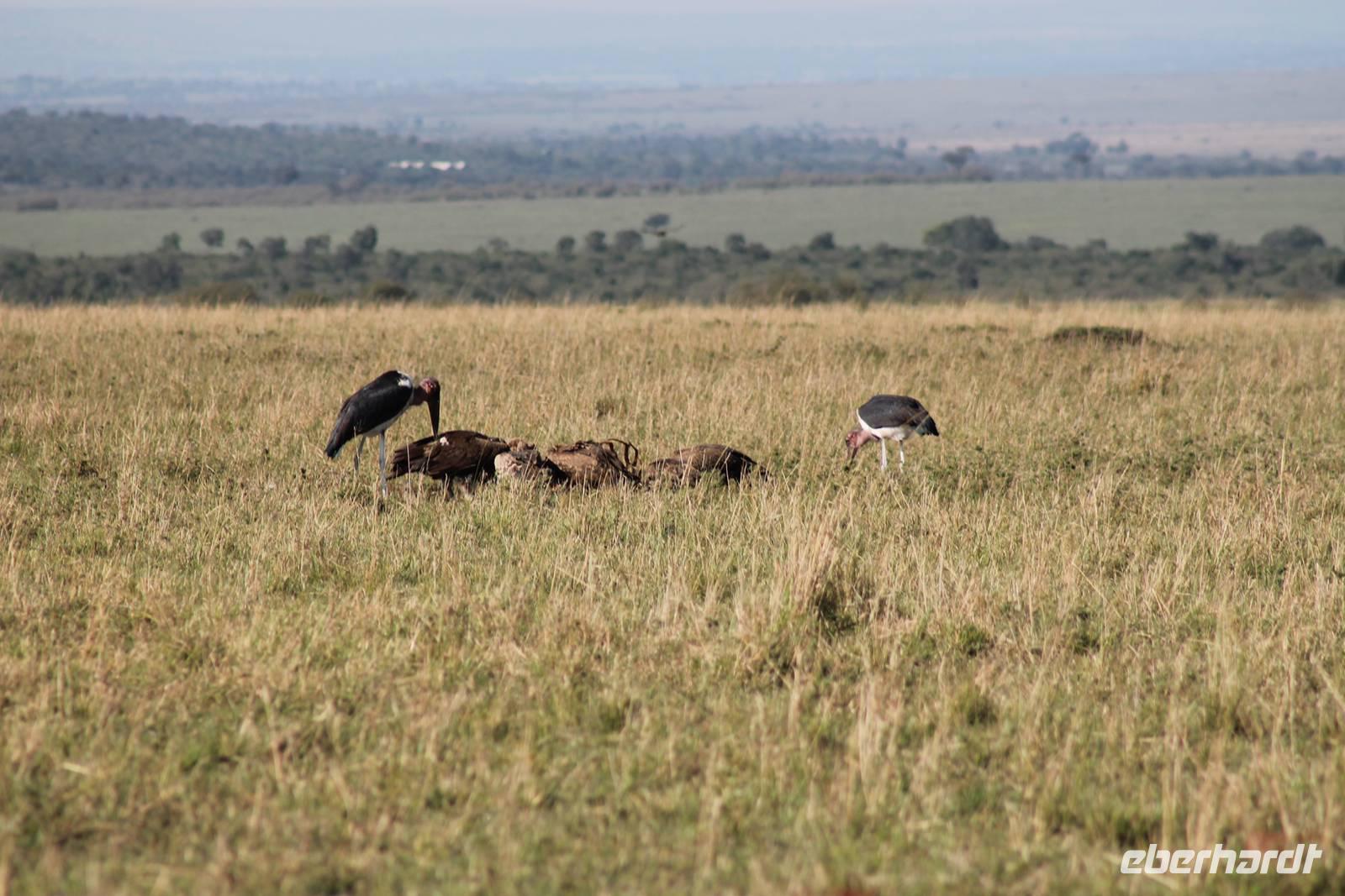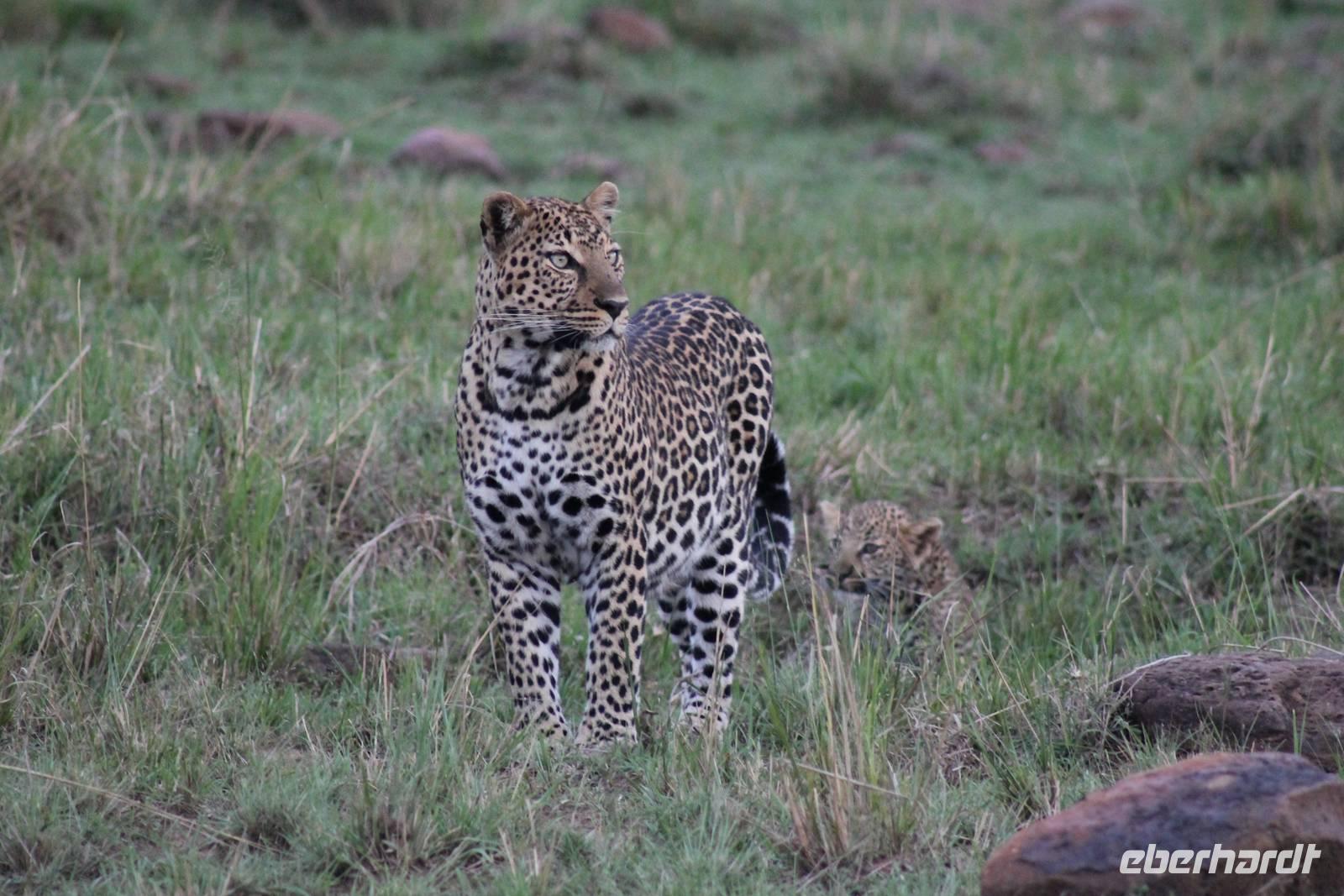 Die nächsten beiden Tage stehen ganz im Zeichen der Masai Mara und viele von uns empfanden diese zweifelsohne als einen Höhepunkt der Reise. Wir stehen natürlich wieder zeitig auf um eine frühe Pirsch in der Masai Mara zu unternehmen. Alle haben mehr oder weniger gut in ihren Zelten geschlafen, denn die Angst vor den Hippos bleibt, zumindest bei Vicky :-). Aber Sie fühlt sich schon etwas sicherer, da Sie ja ihren Askari immer dabei hat. Während unseren heutigen Pirschfahrten sehen wir wieder allerhand Tiere: Viele Gnuherden, einige Geier, kleine und große Warzenschweine und ganz viele Topis mit Jungen, die gerade erst geboren sind. Jackson erklärt uns, dass gerade Paarungszeit ist und so viele Jungen zur Welt kommen. Unglaublich das die kleinen Geschöpfe schon direkt nach der Geburt laufen und stehen können. Natürlich werden Sie von der Mutter sehr umsorgt, weil die Raubkatzen natürlich überall lauern um sich auch ein kleines Topi zu schnappen. Später sehen wir auch noch einen Strauss und mehrere Löwen. Später werden unsere Fahrer informiert, dass sich wohl ein totes Impala auf einem Baum befindet, welches von einem Leoparden gerissen wurde. Leider sehen wir nur das tote Impala aber keinen Leoparden. Ob wir ihn doch noch gesehen haben, erfahren Sie nur wenn Sie weiter lesen. Nach einigen vorbeiziehenden Giraffen und vielen weiteren Kibizen fahren wir mit unseren Jeeps zum Fluss, wo sich aus der Erfahrung heraus immer viele Tiere tummeln und wir sollten Recht behalten. Am Fluss angekommen sehen wir ein riesiges Krokodil, wahrscheinlich das größte Krokodil was wir bisher gesehen haben und auch einige Hippos. Wir sehen auch ein Hippo, was sich im Busch versteckt und viele Wunden hat. Wahrscheinlich hat es einen Machtkampf verloren und muss jetzt einsam und allein leben. Noch vor unserem Mittagessen begegnen wir auch einigen Löwen, die sich über eine Beute hermachen. Viele glauben es wäre ein kleines Warzenschwein, aber genau erkennen können wir es nicht, da es fast vollständig verspeist wurde. Bevor wir heute zu unserem Camp zurückkehren sehen wir auch endlich die ersten Elefanten und sogar mit Jungen. Es ist äußerst niedlich anzusehen, wir der Kleine versucht alles seiner Mutter nachzumachen. So versucht auch er sich Wasser über den Körper zu spritzen aber leider gelingt es nicht so richtig. Aber schön anzusehen war es in jedem Fall. An unserem Camp angekommen genießen wir ein leckeres Mittagessen und genießen dann noch ein wenig die Stille, die uns gibt. Es könnte mehr solche Momente geben aber natürlich wollen wir alle auch etwas erleben. So fahren wir auch am späten Nachmittag noch einmal raus, um weitere Tiere auf unsere Fotos zu bekommen und wir werden nicht enttäuscht. So sehen wir wunderschöne Masai Giraffen, Elandantilopen, Glanzgazellen, eine Riesentrappe, einen Marabu und auch den seltenen Kingfisher, den wir nun endlich auch einmal auf die Linse bekommen. Darüber freuen sich die Ornitologen unter uns natürlich auch sehr. Auch die Dämmerung hat heute noch so einiges zu bieten. So sehen wir noch eine Löwenfamilie mit kleinen Jungen, die gerade erst geboren sind. Ewig könnte man den kleinen zuschauen und man glaubt gar nicht, dass diese kleinen Wesen später mal zu Raubkatzen werden. Auf unserem Rückweg sehen wir noch eine Hyäne im Straßengraben, die sich von uns gar nicht stören lässt. Kurz bevor uns heute noch eine Überraschung erwartet, fahren unsere Jeeps noch einmal zu der Stelle, wo wir heute Morgen schon das tote Impala auf dem Baum gesehen haben und siehe da die Leopardenmama ist wieder da und hat auch ihr Junges im Gepäck. Wir können es kaum glauben, so schön sind diese Tiere und auch das Kleine würden wir am liebsten abknutschen.